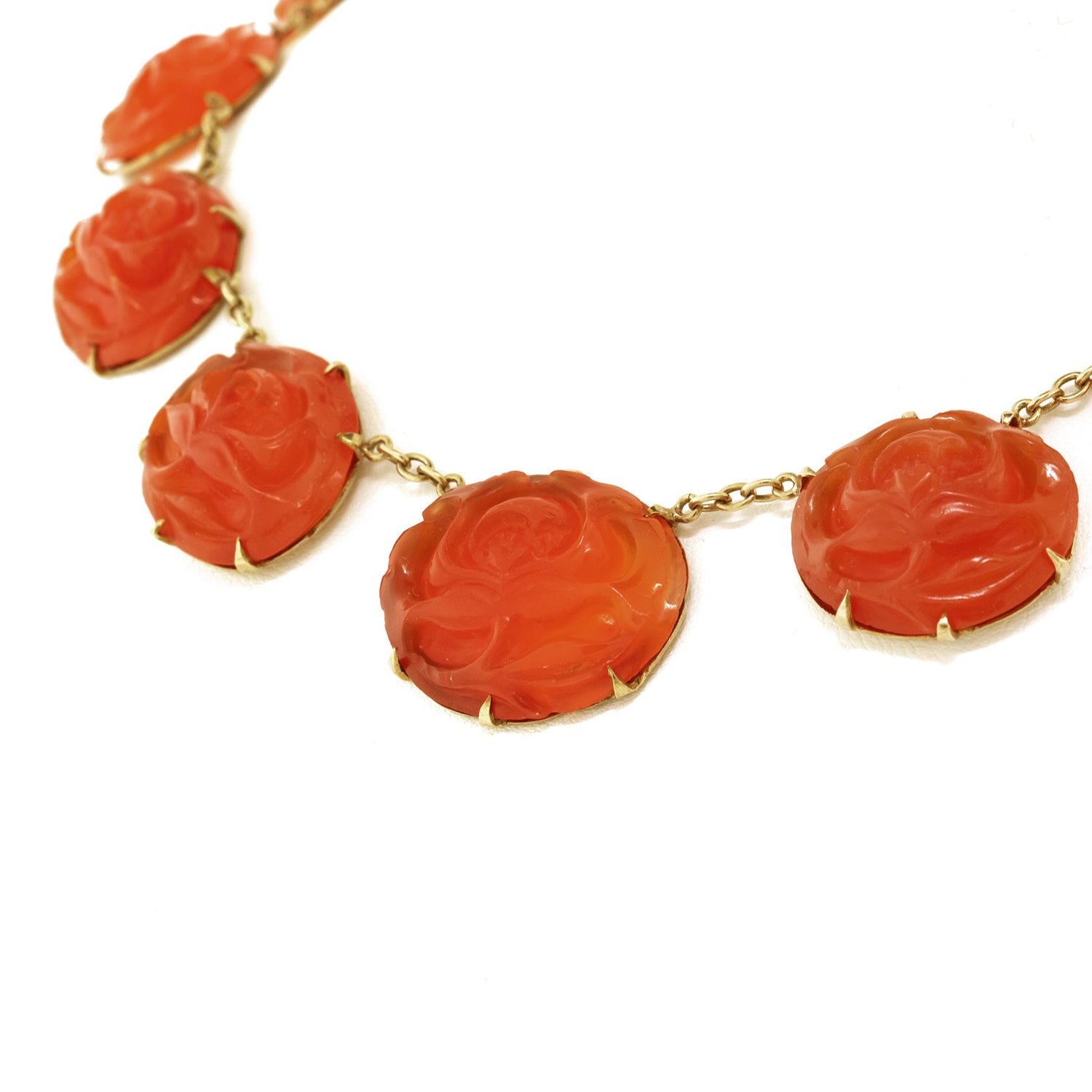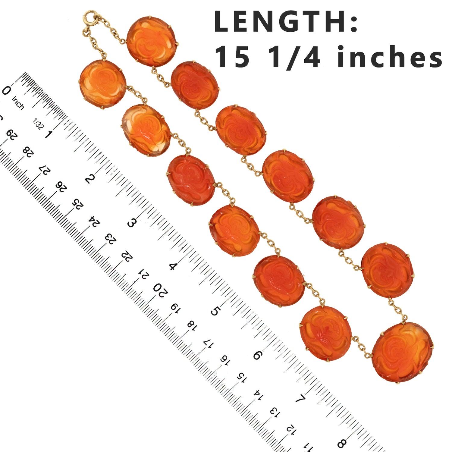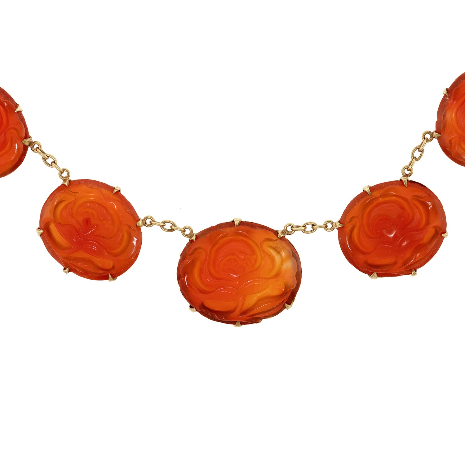 Circa 1920s, 14k, attributed Walter Lampl, American. Styled in the Chinese taste, this fabulous twenties necklace is attributed to Walter Lampl. Featuring carved carnelian stones, this necklace is in excellent condition.