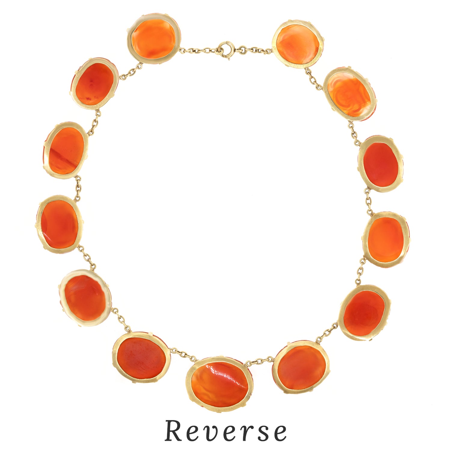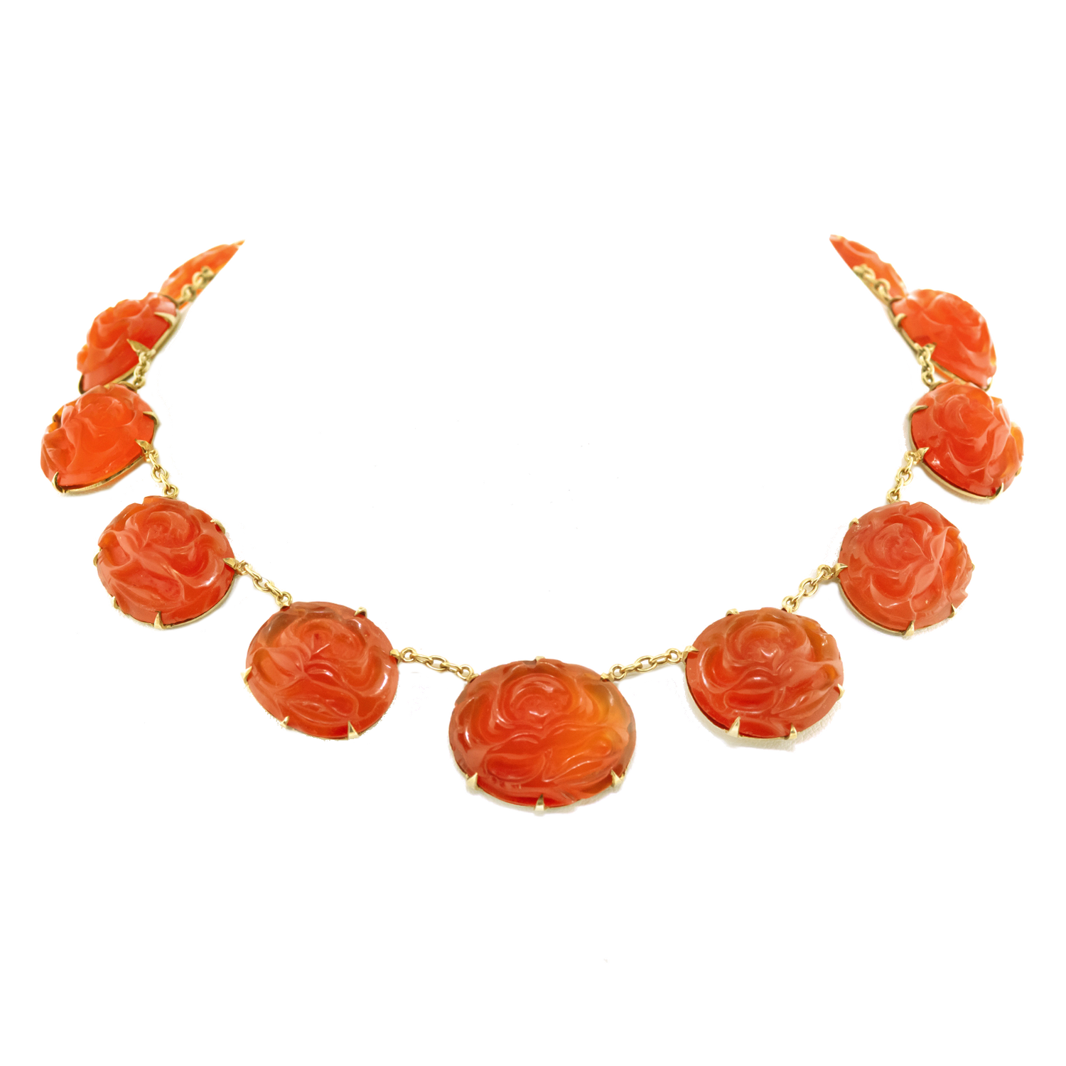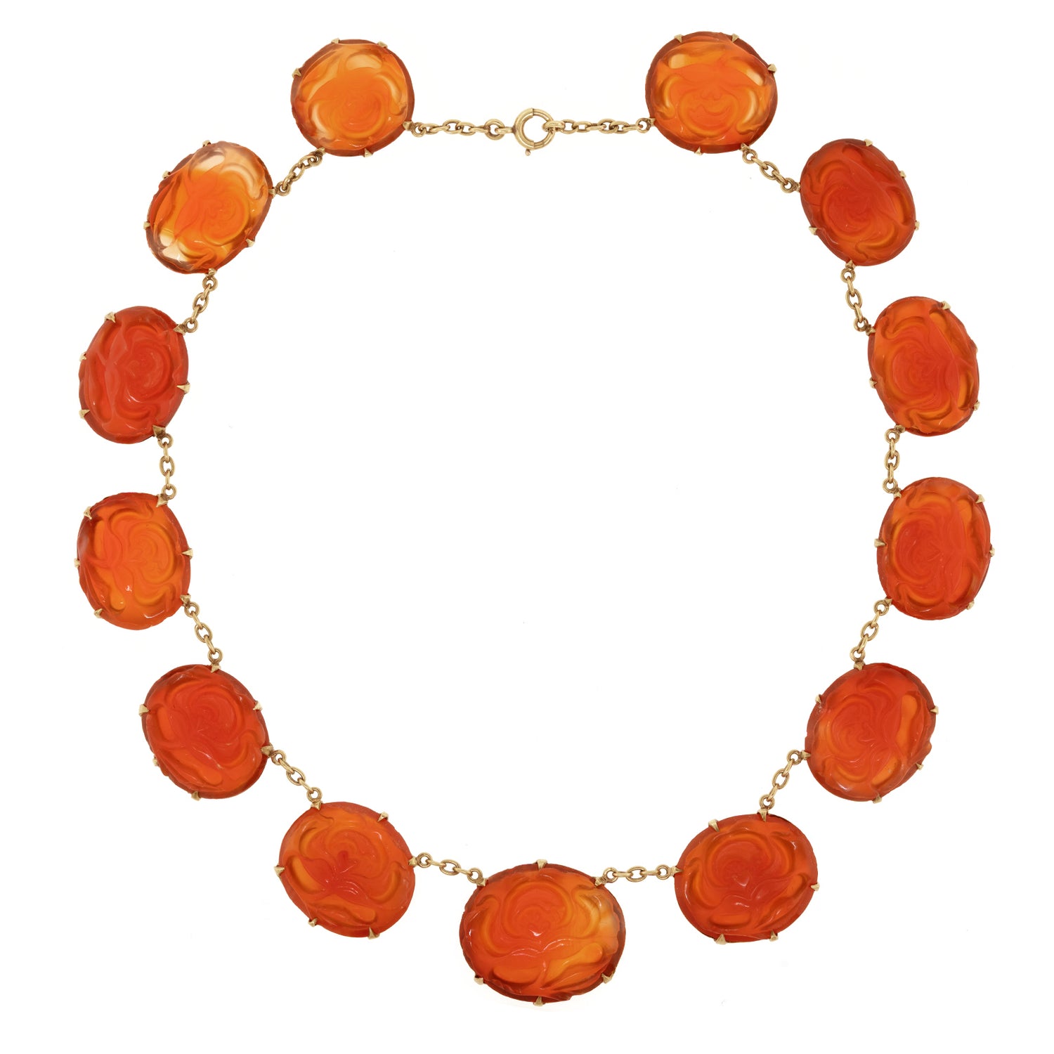 Circa 1920s, 14k, attributed Walter Lampl, American. Styled in the Chinese taste, this fabulous twenties necklace is attributed to Walter Lampl. Featuring carved carnelian stones, this necklace is in excellent condition.