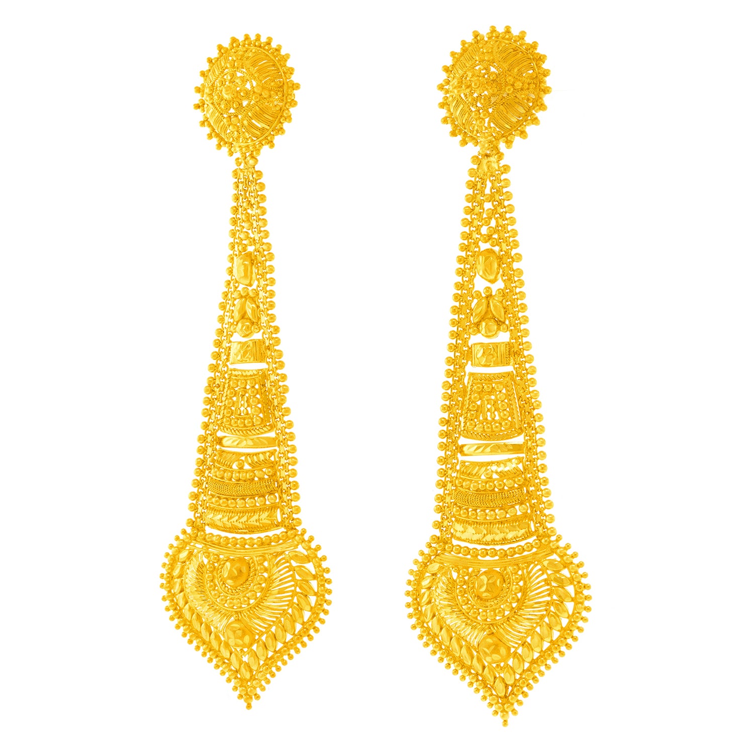 Circa 1950s, 22k, Mumbai, India. These gorgeous fifties Mogul-style earrings are exquisitely detailed, visually dynamic folkloric jewelry. At almost 5 inches long, their look seamlessly mixes old-world charm with modern fashion. Wellmade in 22-karat gold, they are in excellent condition.