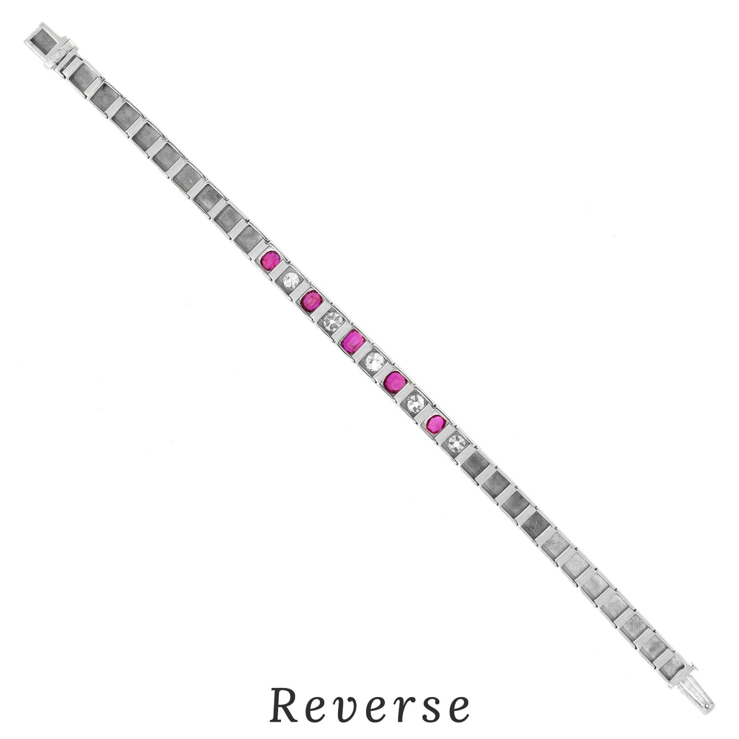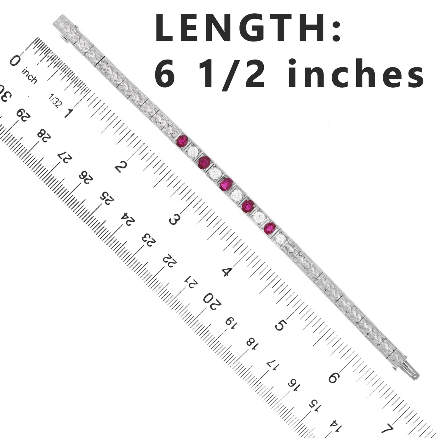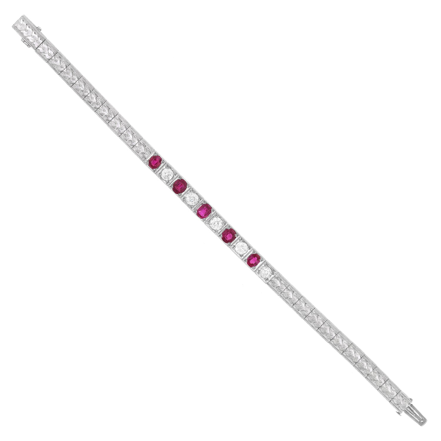 Circa 1920s, Platinum with a 14k white gold catch, American. This fashionable Art Deco platinum bracelet features 1.50 carats of gorgeous raspberry red rubies and 1.0 carats of fine white diamonds (G color, VS clarity). The design is delicate, harmonious, and versatile and the look effortlessly stylish. Excellent condition.