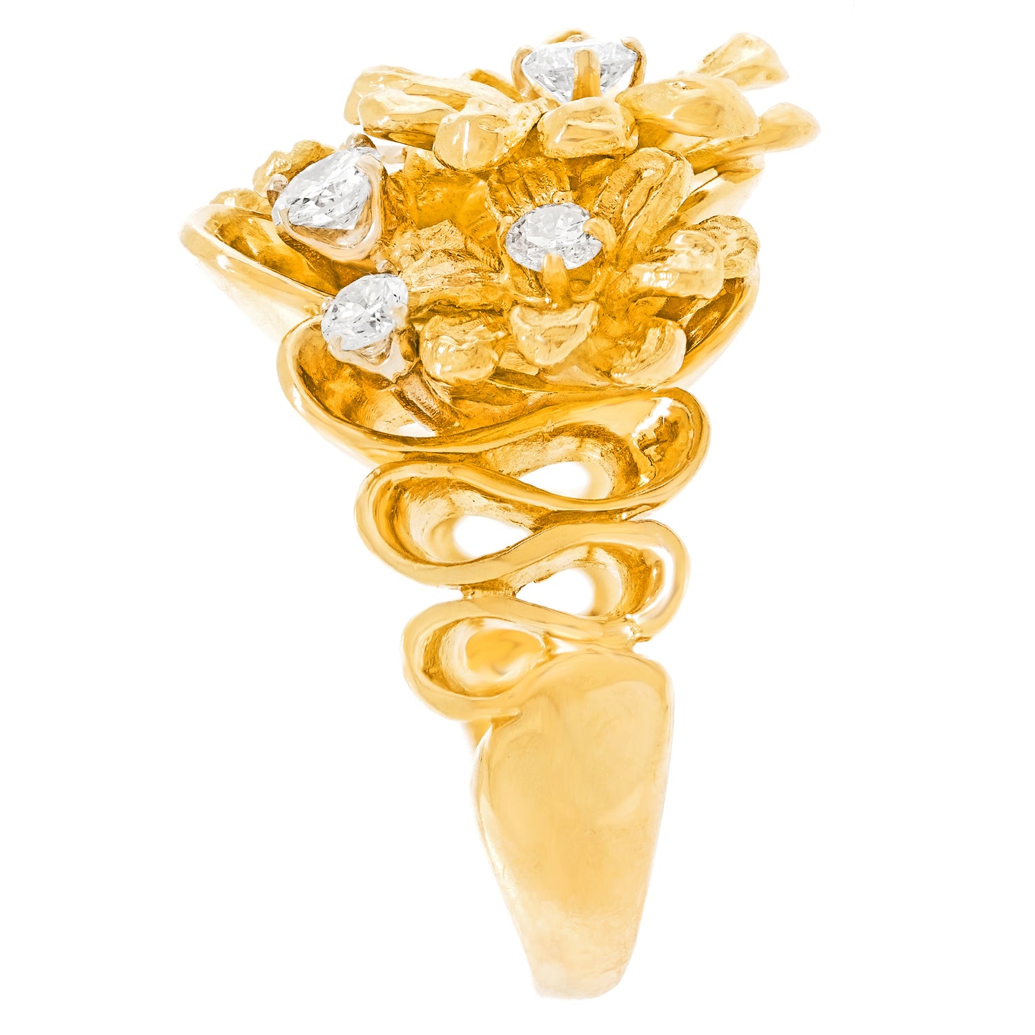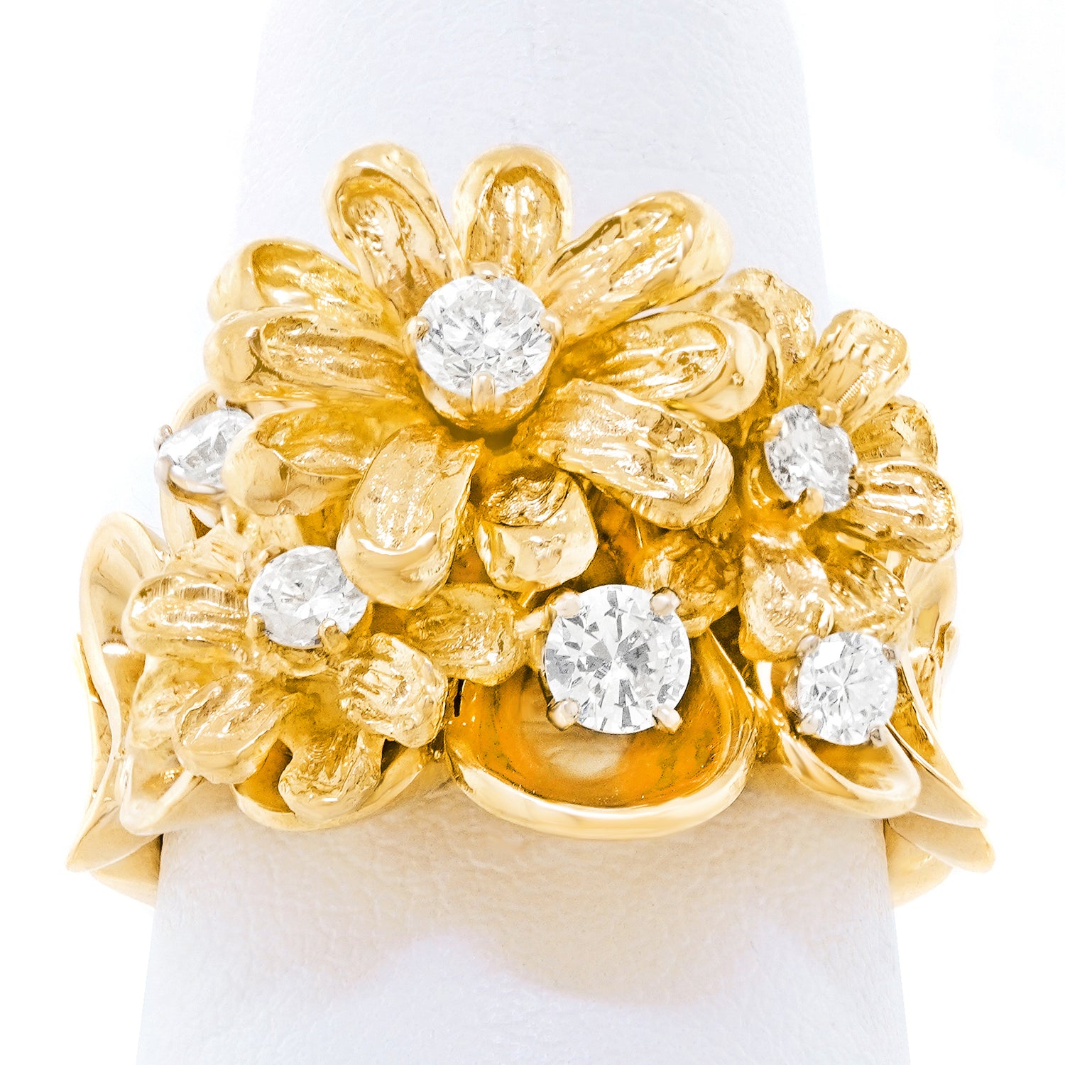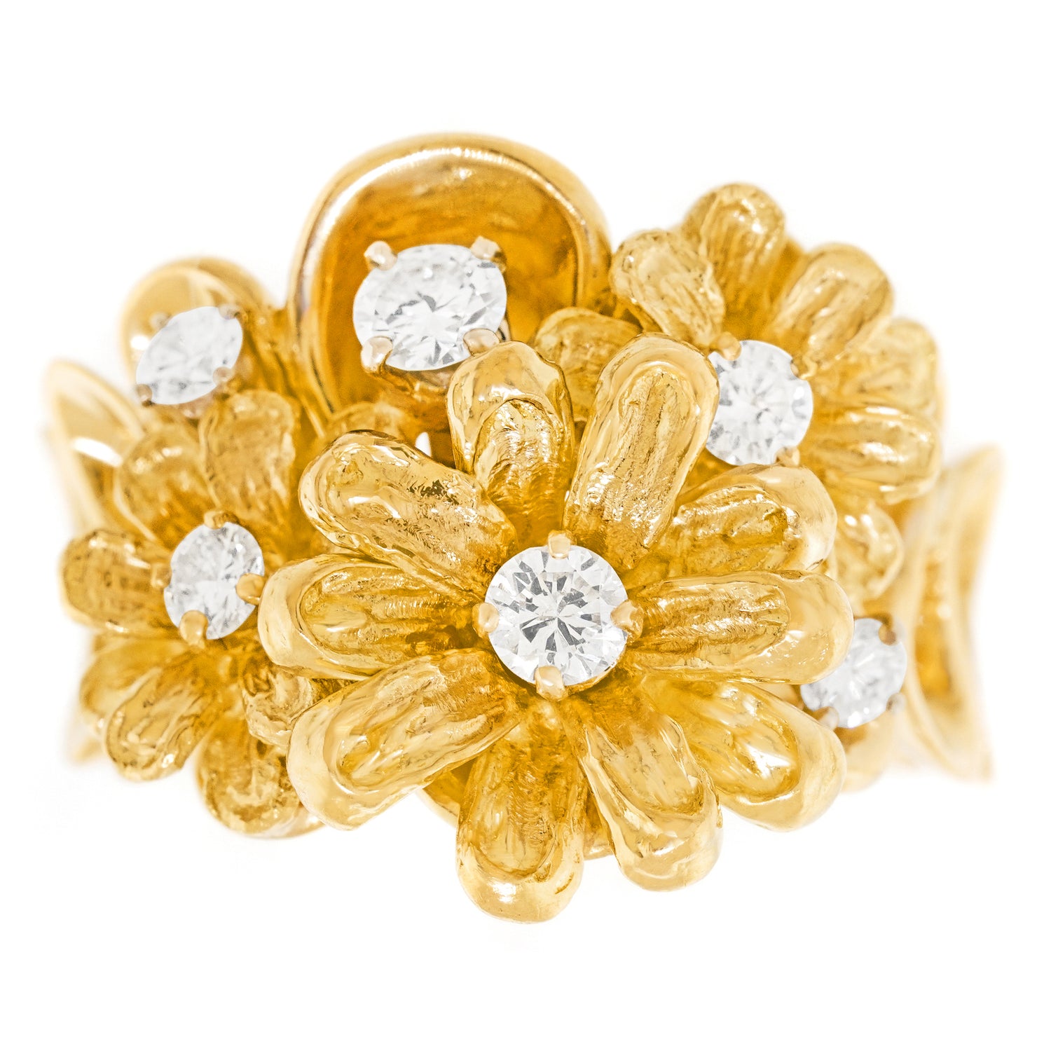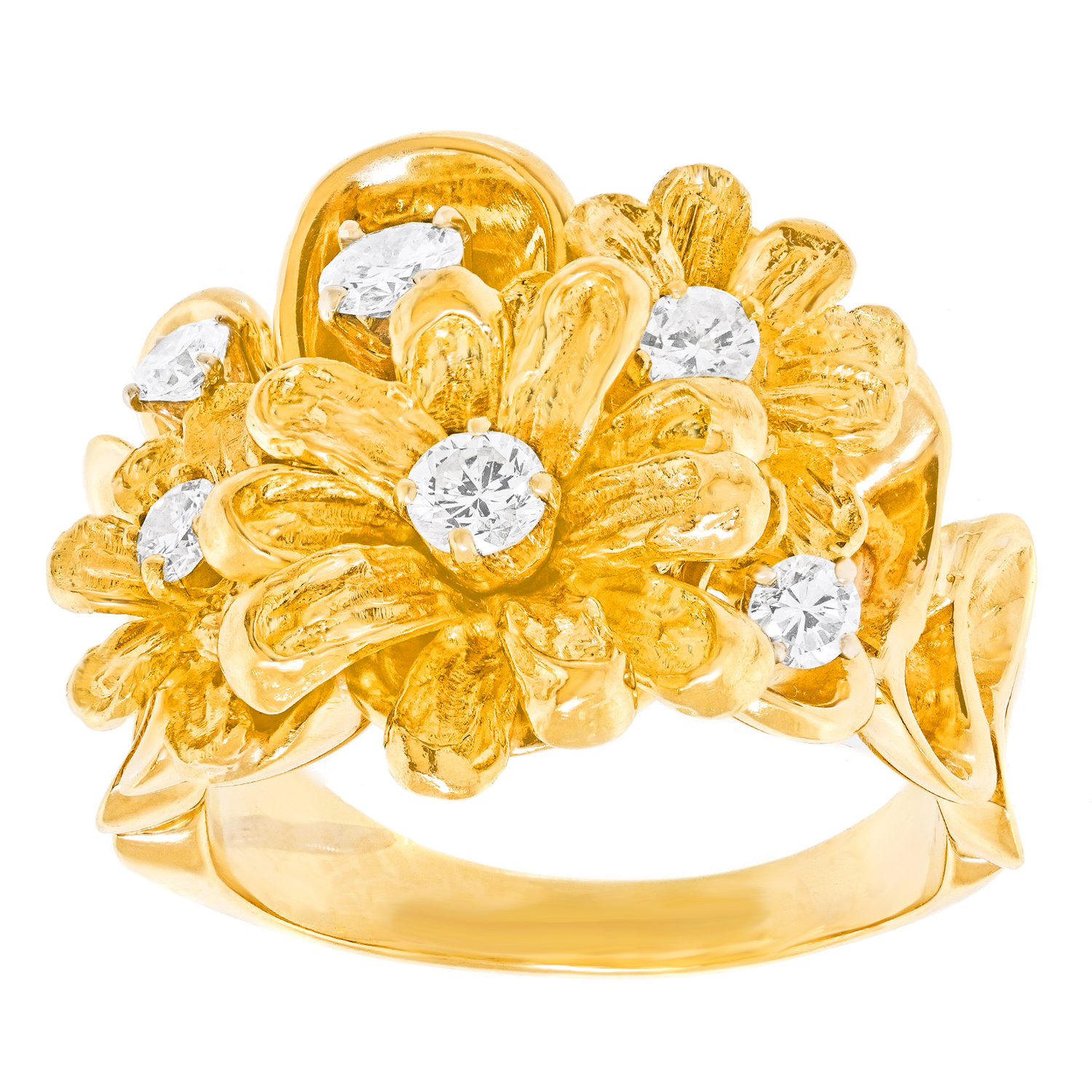 Circa 1960s, 18k, American. Flower power, pop sixties, this diamond-set ring is fabulous fashion! Flowers make me happy and this ring is no exception. Oh!, diamonds make me happy too and this ring features .60 carats of brilliant white diamonds (H color, SI1 clarity)! Well made in eighteen-karat yellow gold, this American jewel is in excellent condition.