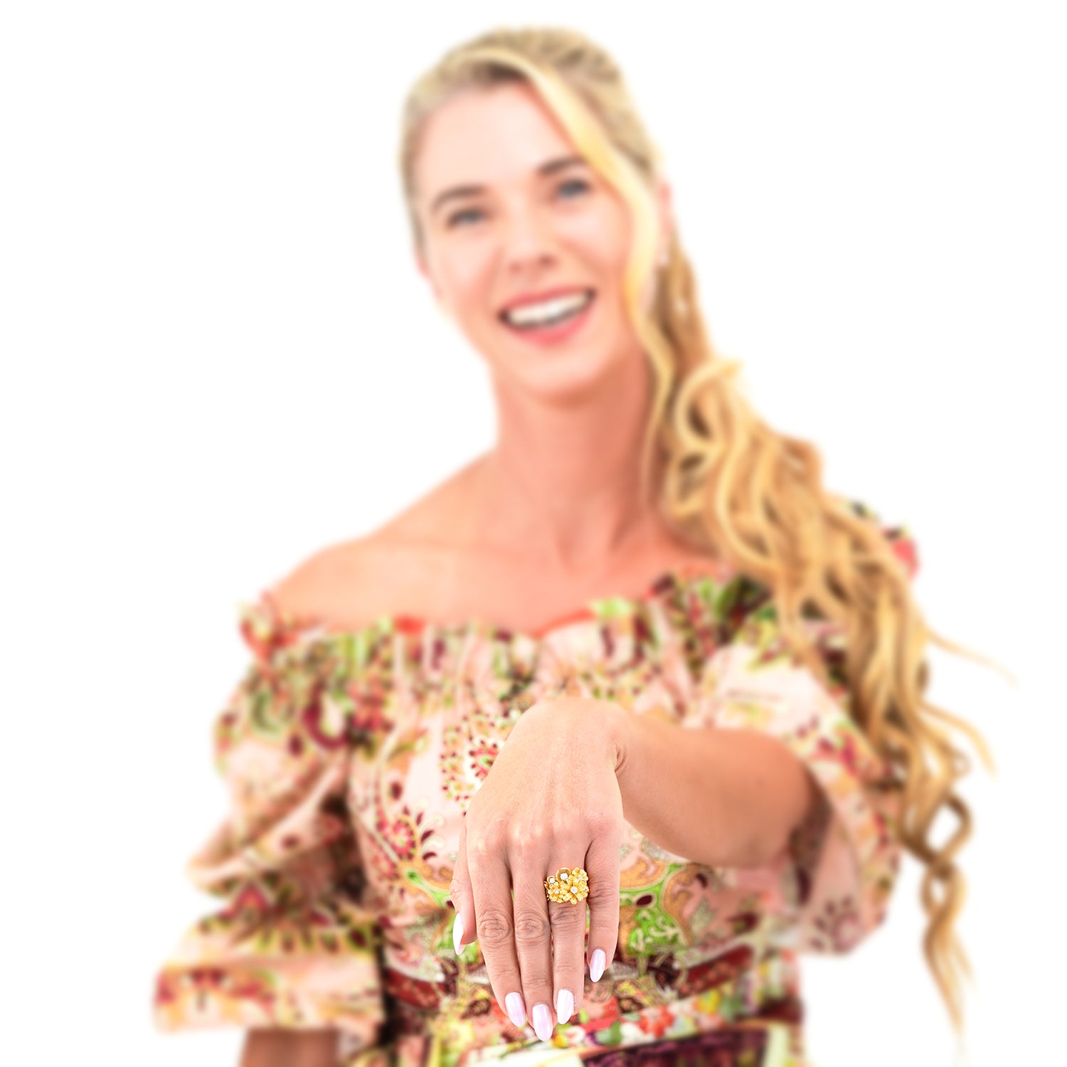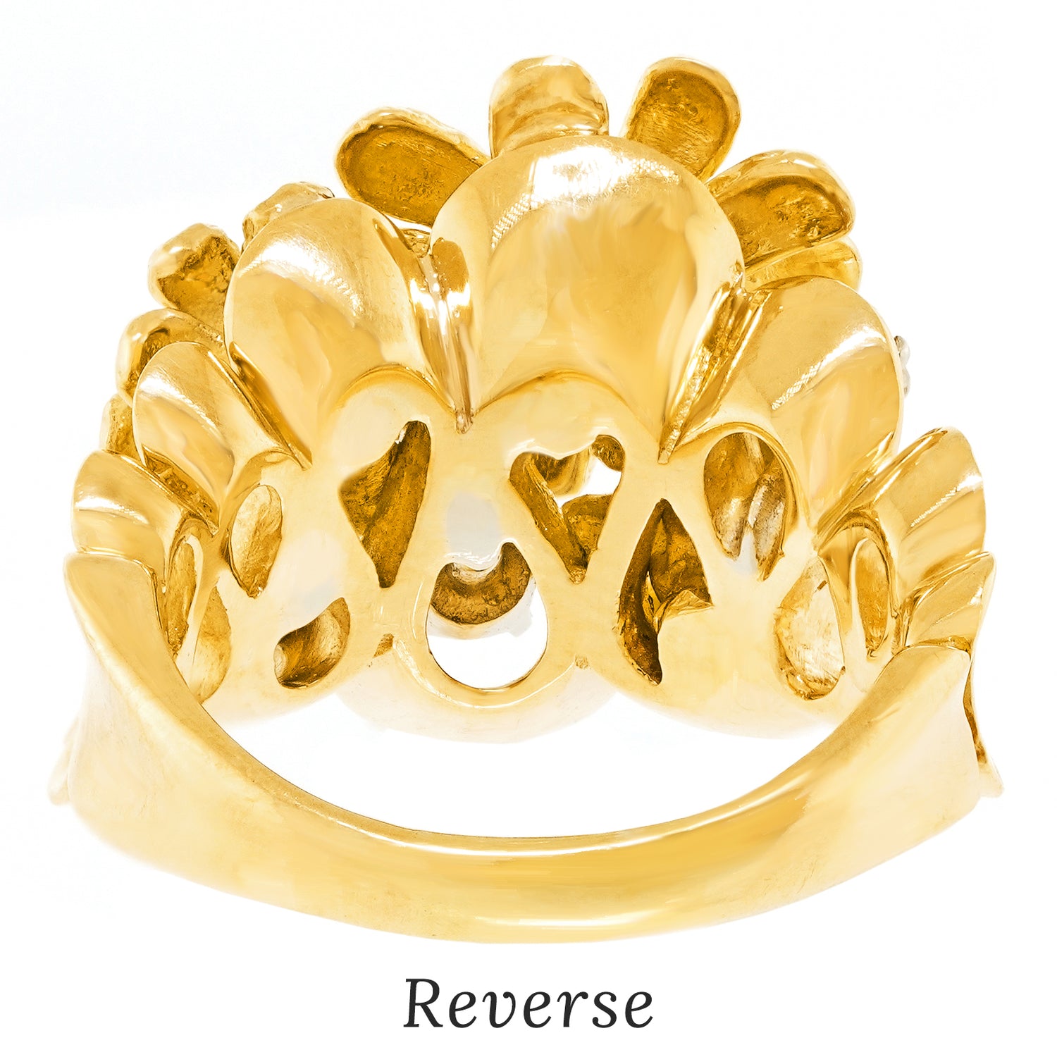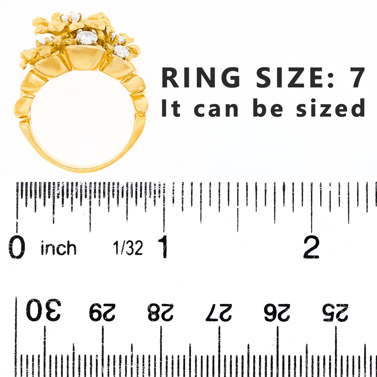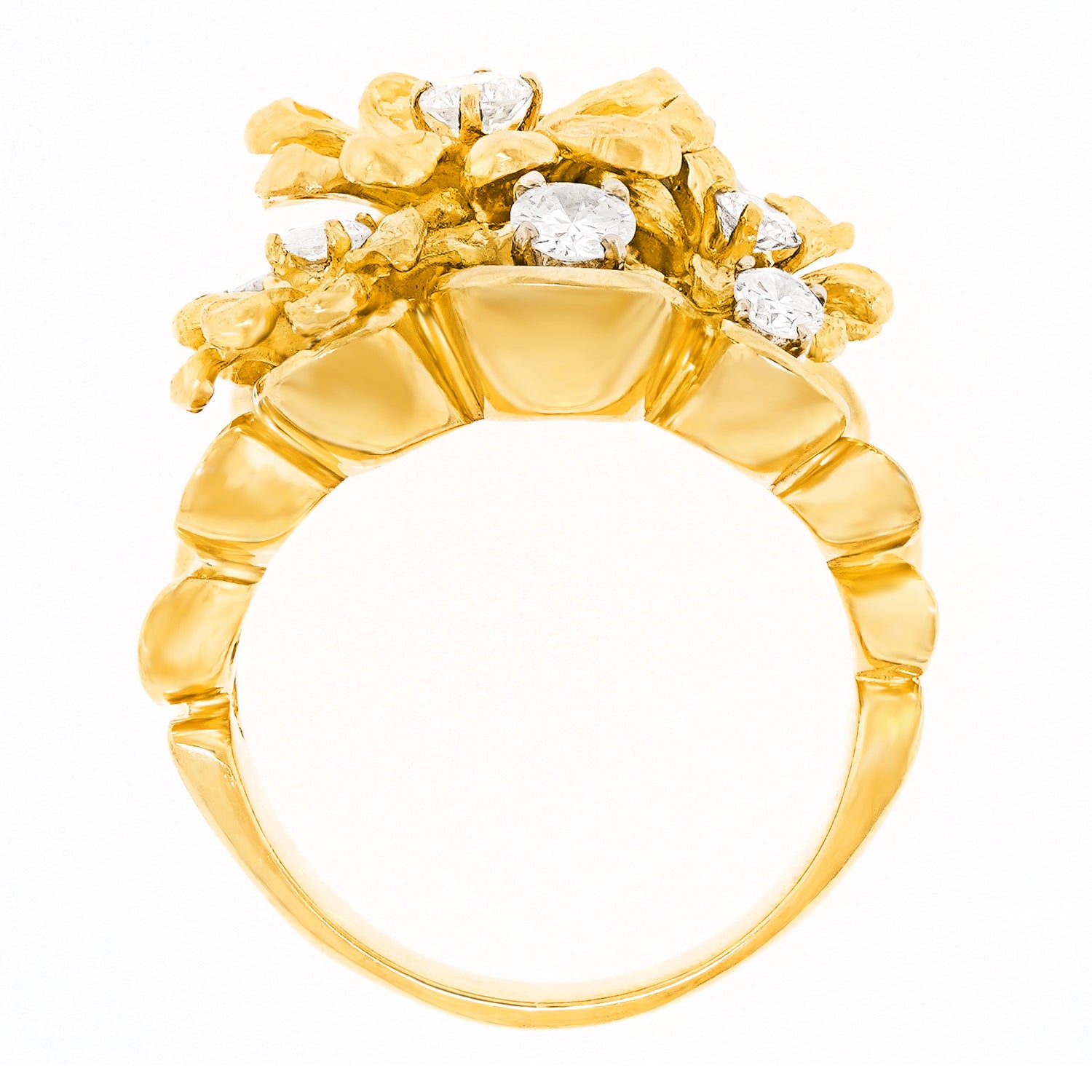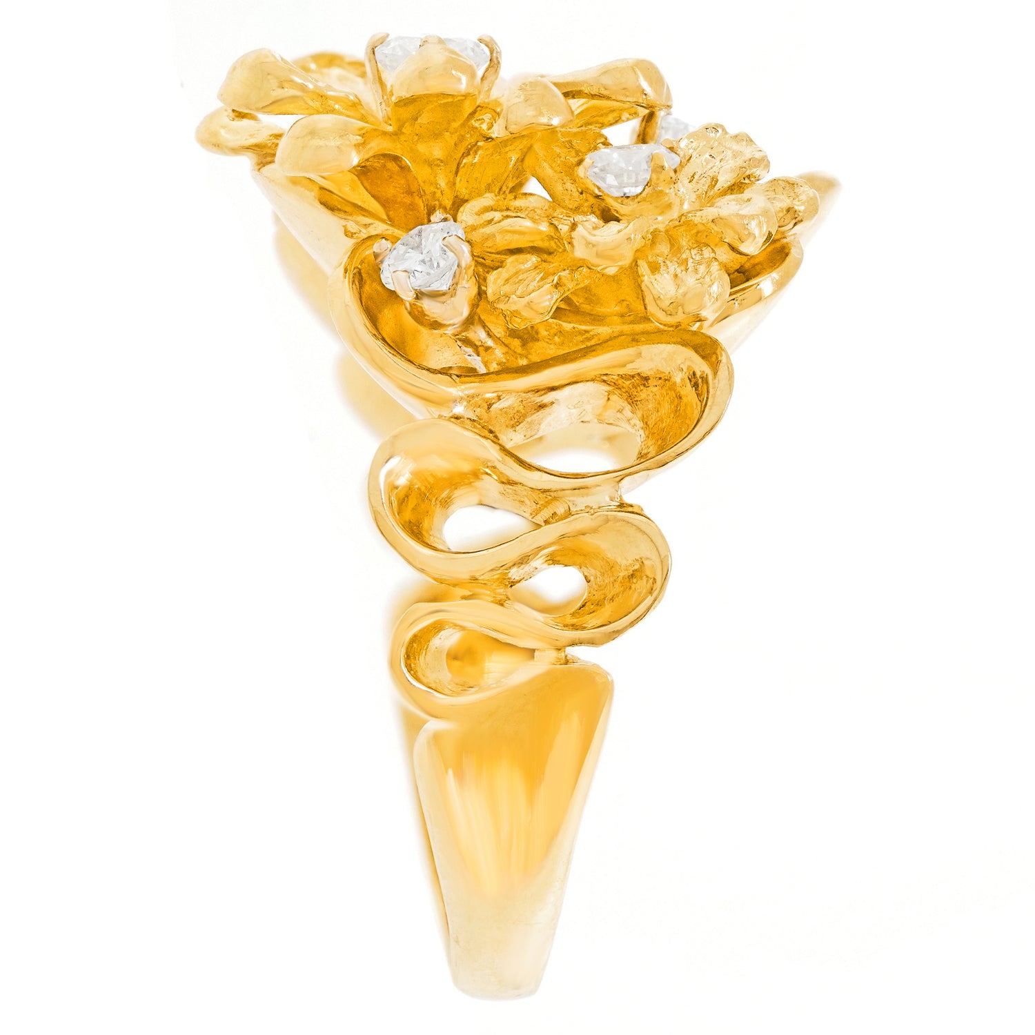 Circa 1960s, 18k, American. Flower power, pop sixties, this diamond-set ring is fabulous fashion! Flowers make me happy and this ring is no exception. Oh!, diamonds make me happy too and this ring features .60 carats of brilliant white diamonds (H color, SI1 clarity)! Well made in eighteen-karat yellow gold, this American jewel is in excellent condition.
