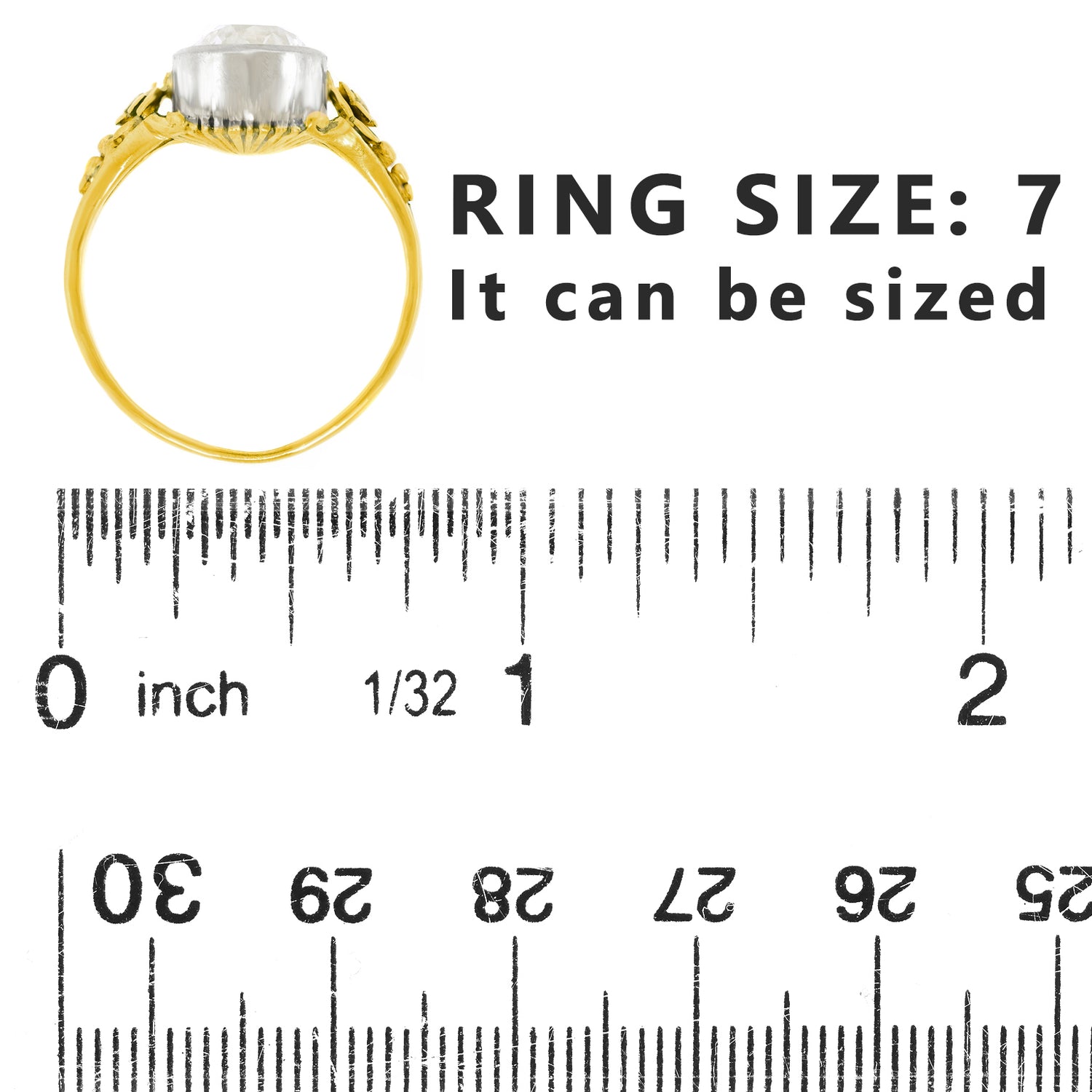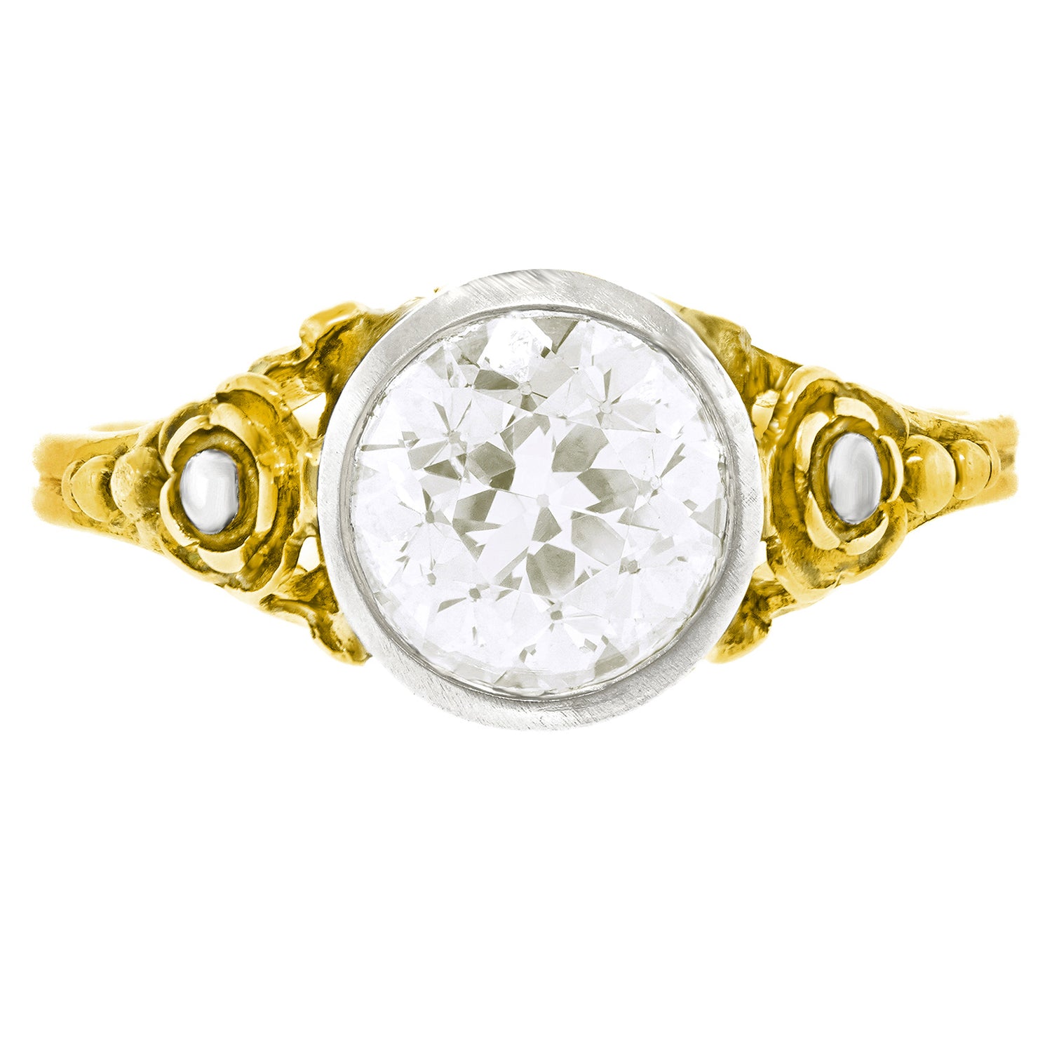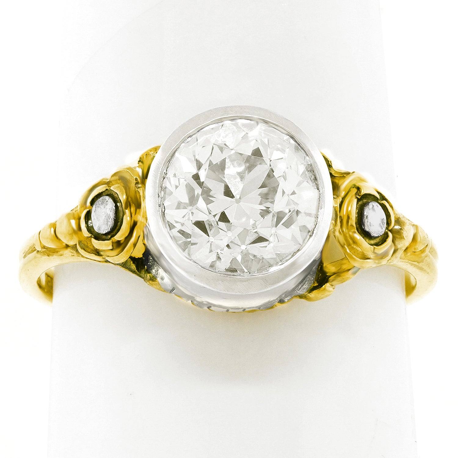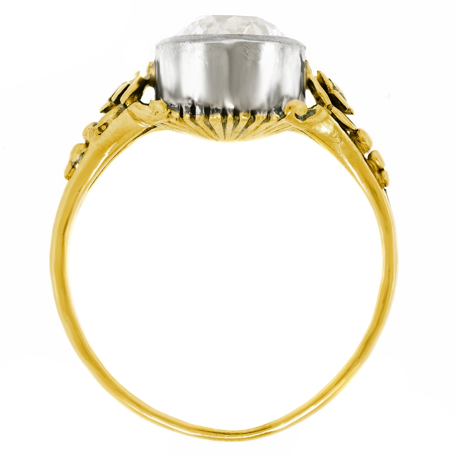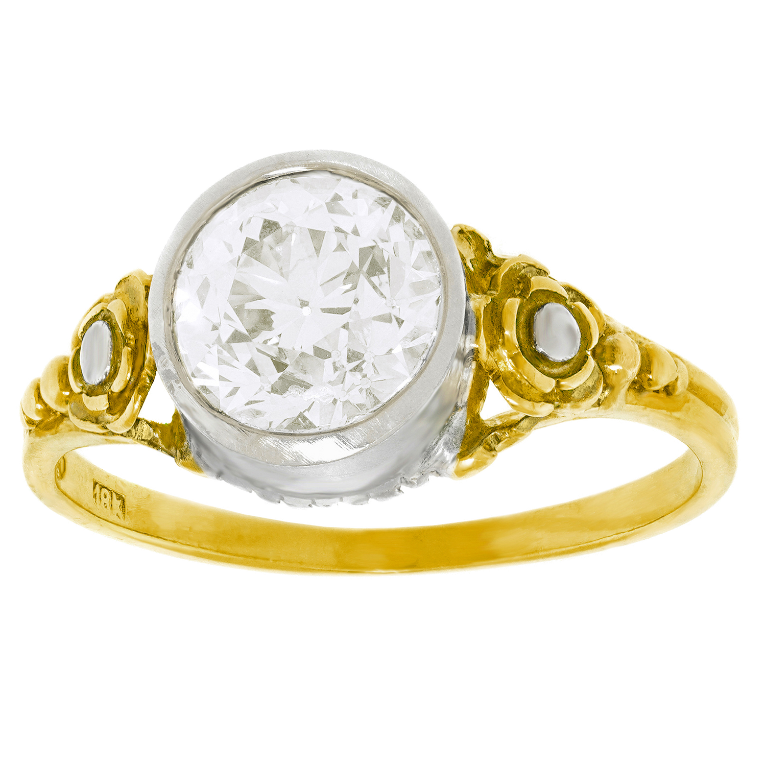 Circa 1920s, Silver & 18k, Sweden. This 1920s Swedish engagement ring features a sparkly 1.80-carat old cut diamond (O-P color, VS1 clarity) in an old world meets modern times 100-year-old setting. The look is antique chic at its vintage best. Finely handcrafted in 18k with a silver bezel for the diamond, it is in excellent condition.