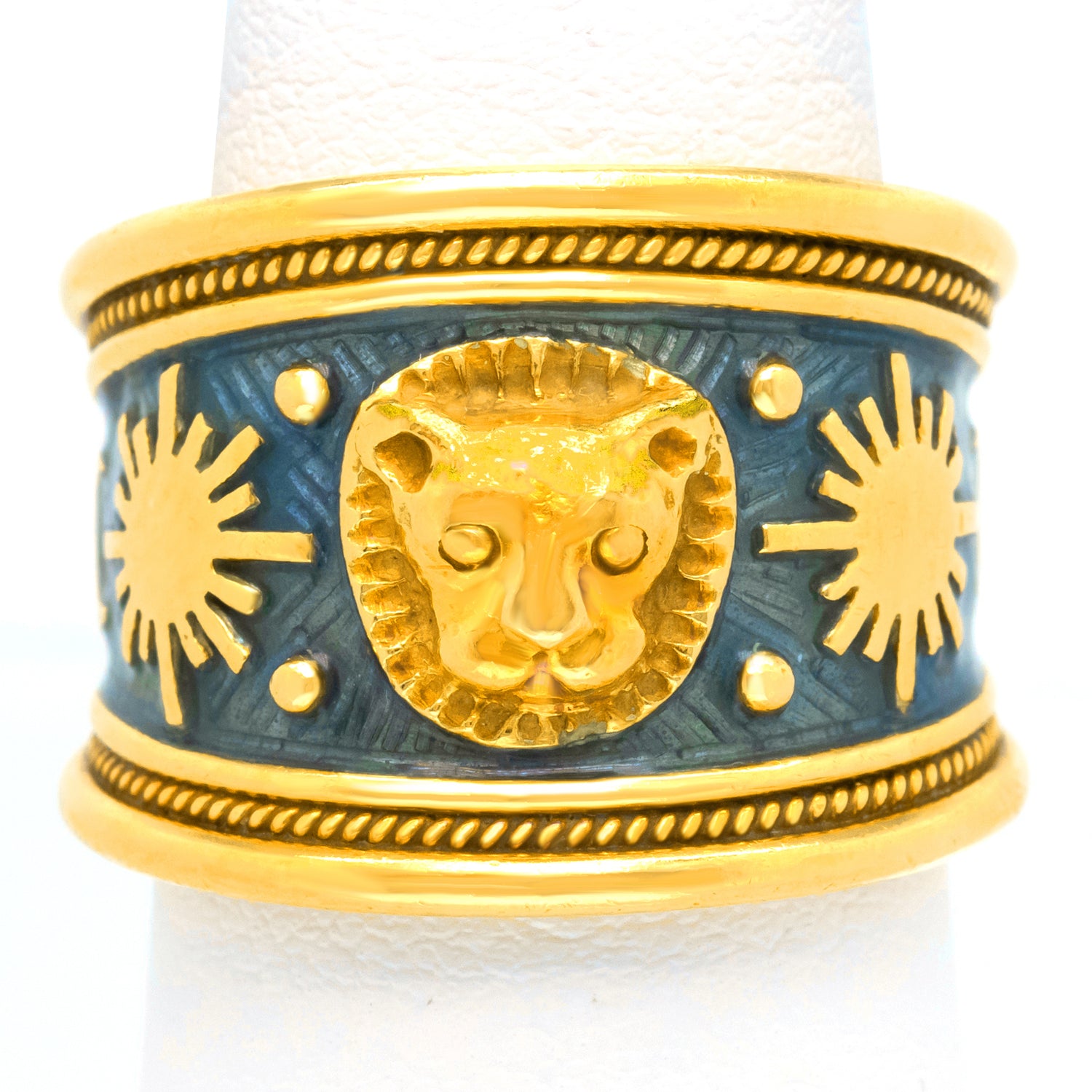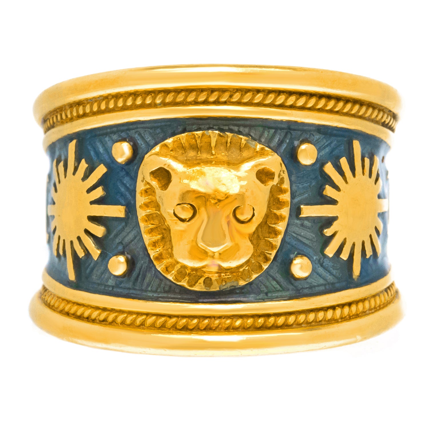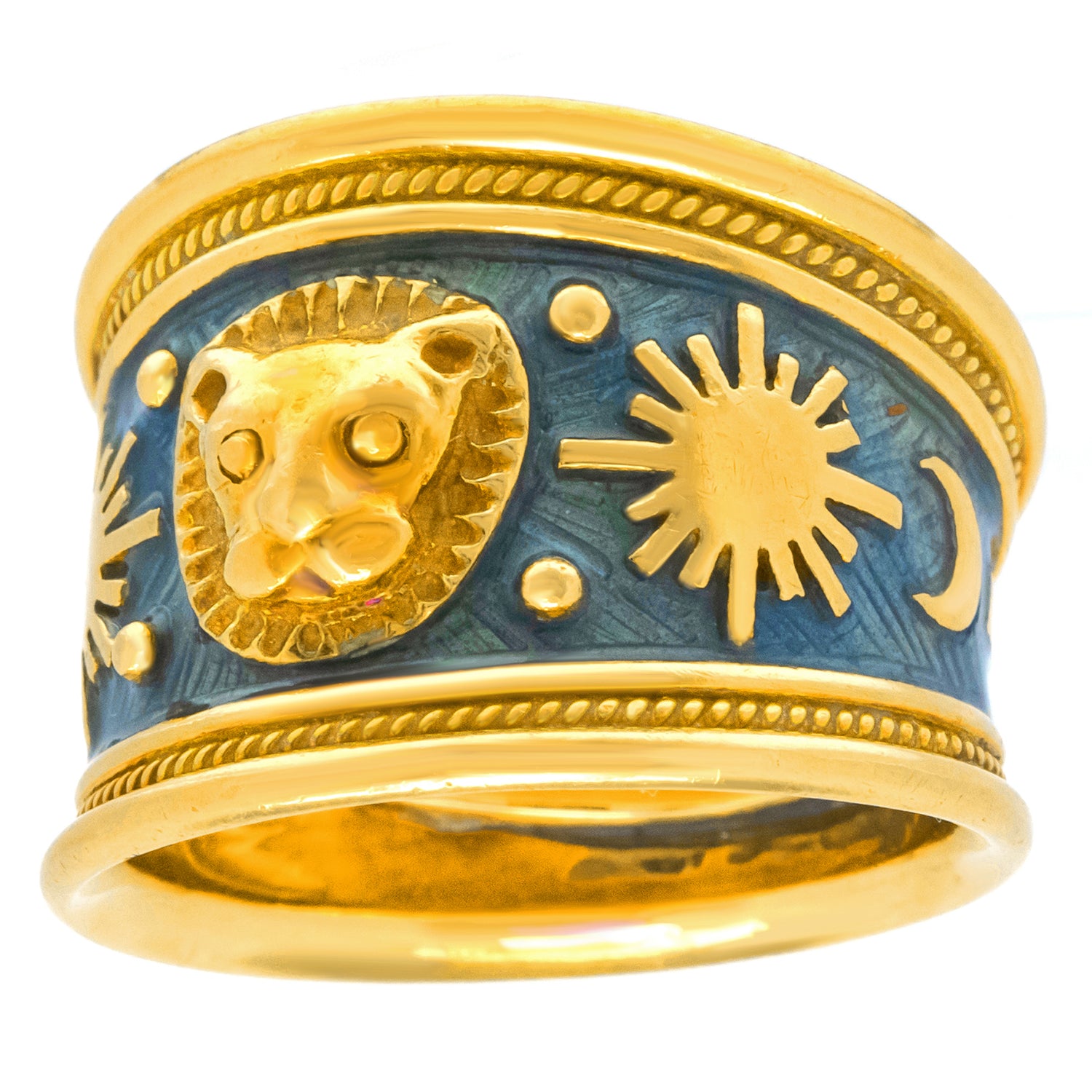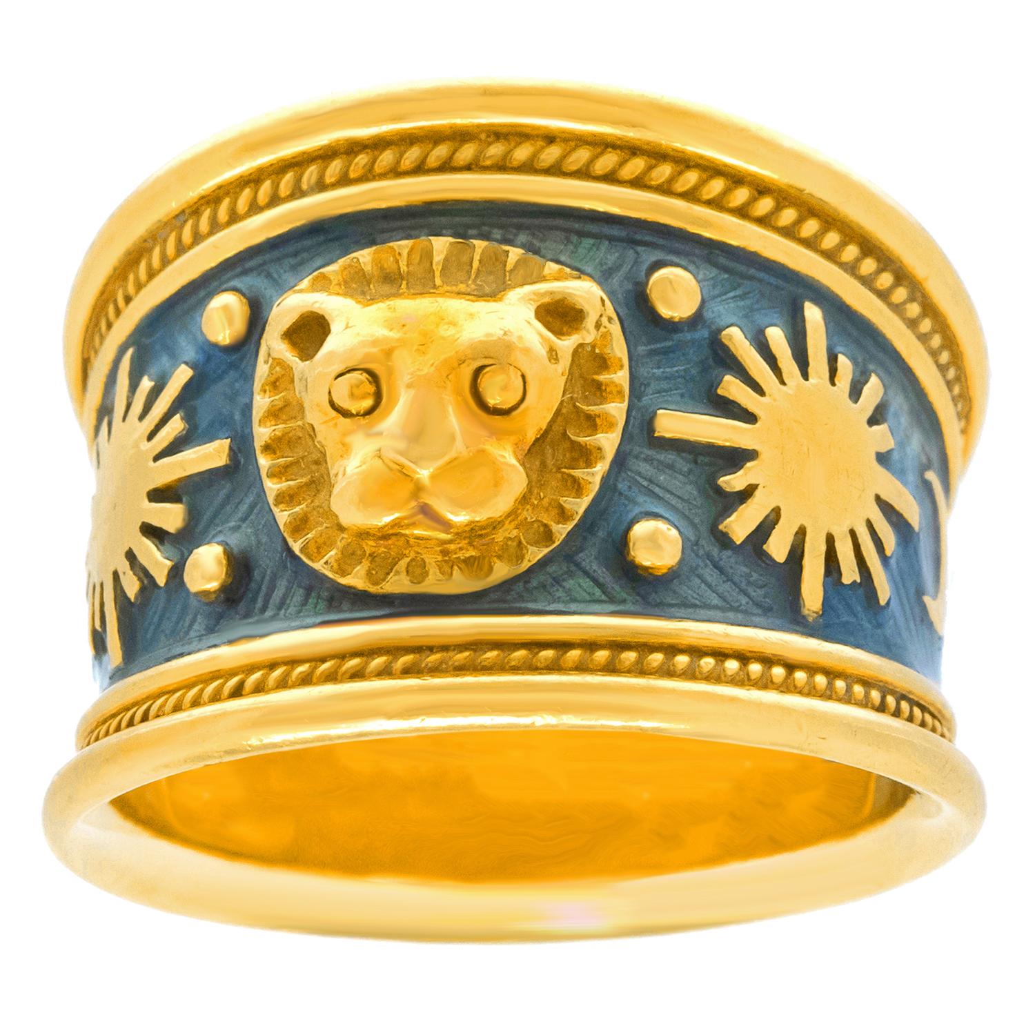 Circa 1990s, 18k, by Elizabeth Gage, London, England. Iconically Elizabeth Gage, this Georgian-meets-Renaissance Revival ring is a fine example of her zodiac motifs (Leo). A perfect go-anywhere, with-anything band, it effortlessly dresses up or down. Finely made in eighteen karat yellow gold with blue enamel, it displays the distinctive quality that Elizabeth Gage is famous for. It is in excellent condition.