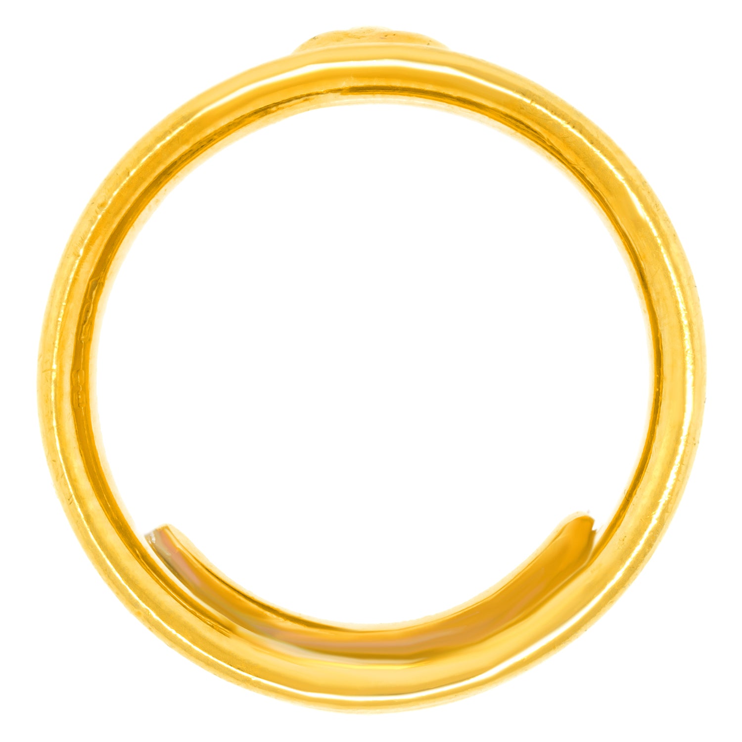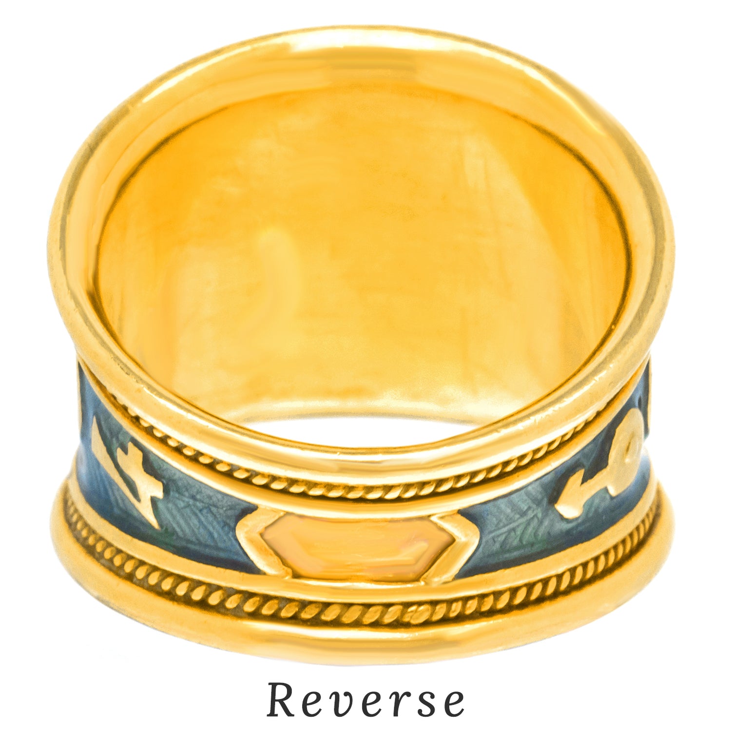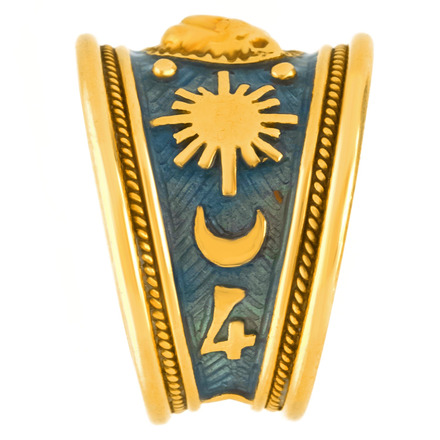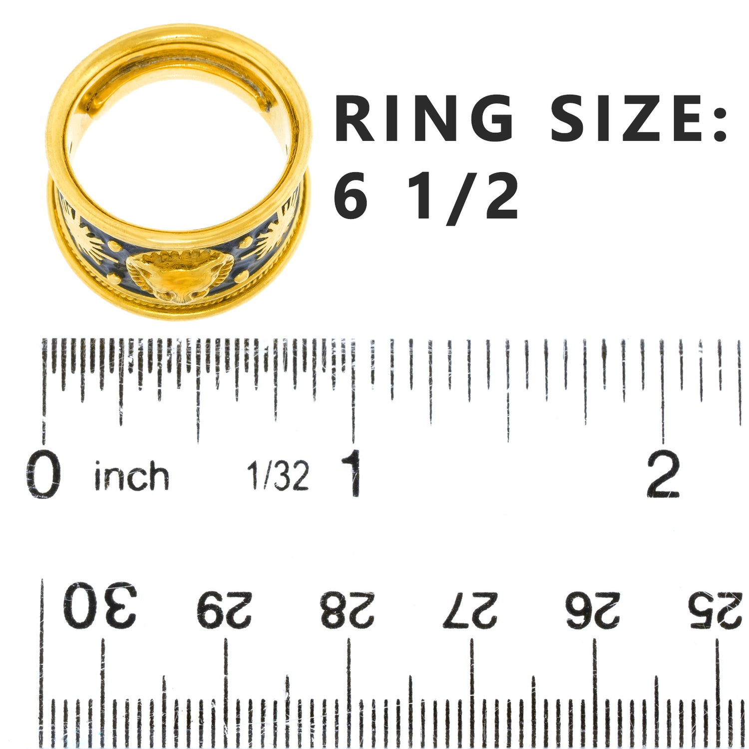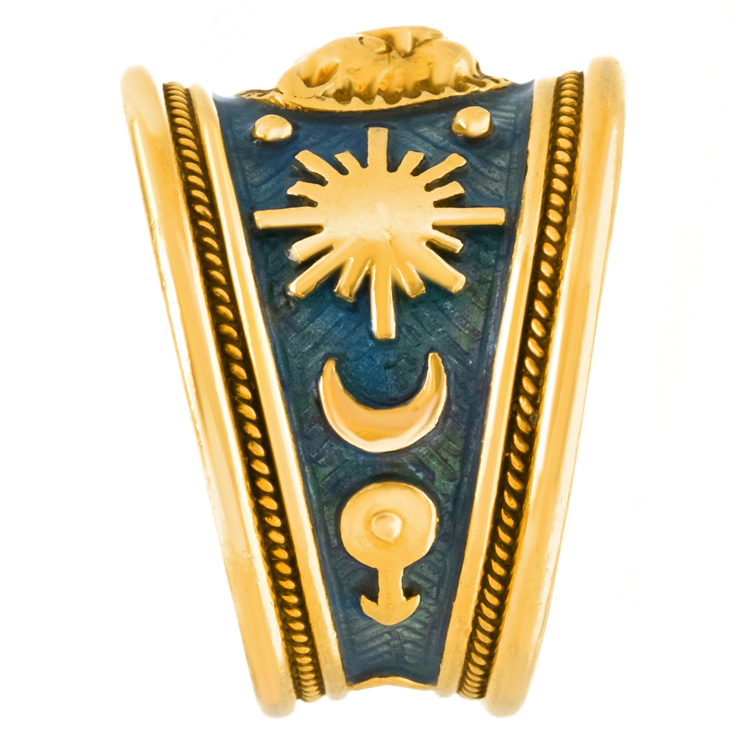 Circa 1990s, 18k, by Elizabeth Gage, London, England. Iconically Elizabeth Gage, this Georgian-meets-Renaissance Revival ring is a fine example of her zodiac motifs (Leo). A perfect go-anywhere, with-anything band, it effortlessly dresses up or down. Finely made in eighteen karat yellow gold with blue enamel, it displays the distinctive quality that Elizabeth Gage is famous for. It is in excellent condition.
