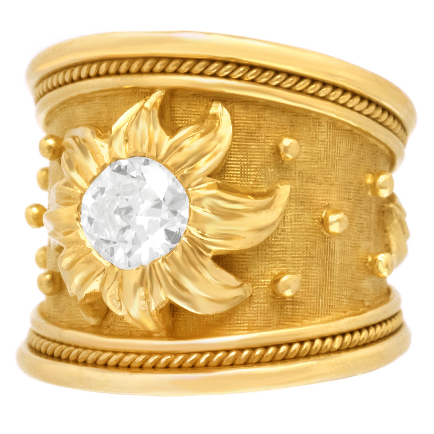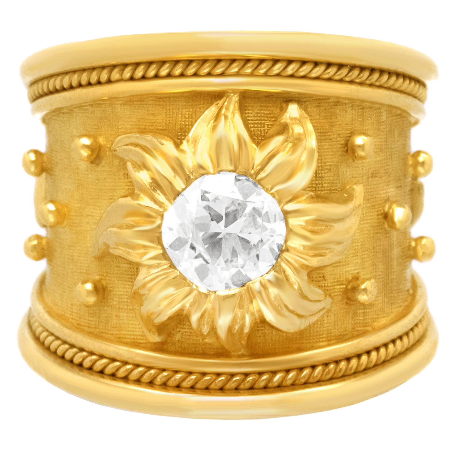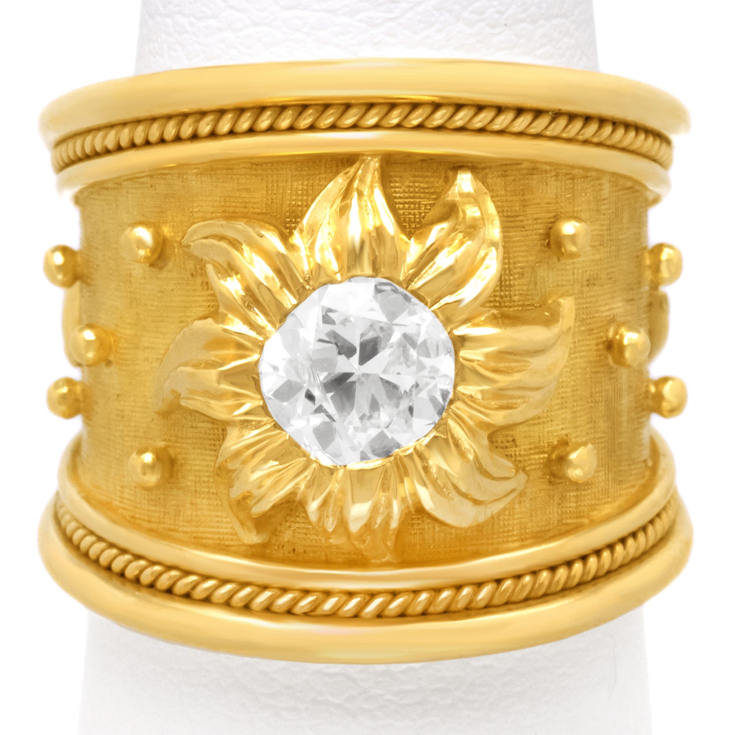 Circa 1991, 18k, by Elizabeth Gage, London, England. Signature Elizabeth Gage style, this diamond sun ring glistens with a 1.04-carat fine white old-cut diamond (G color, SI2 clarity). It features her linen textured gold and wire-twist-wire around the top and bottom of the ring. The look is timeless, London cool, wear it everywhere and with everything! Excellent condition.