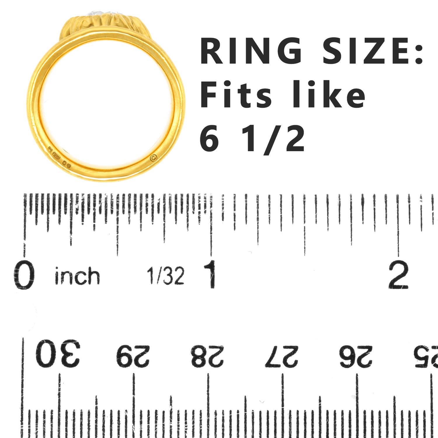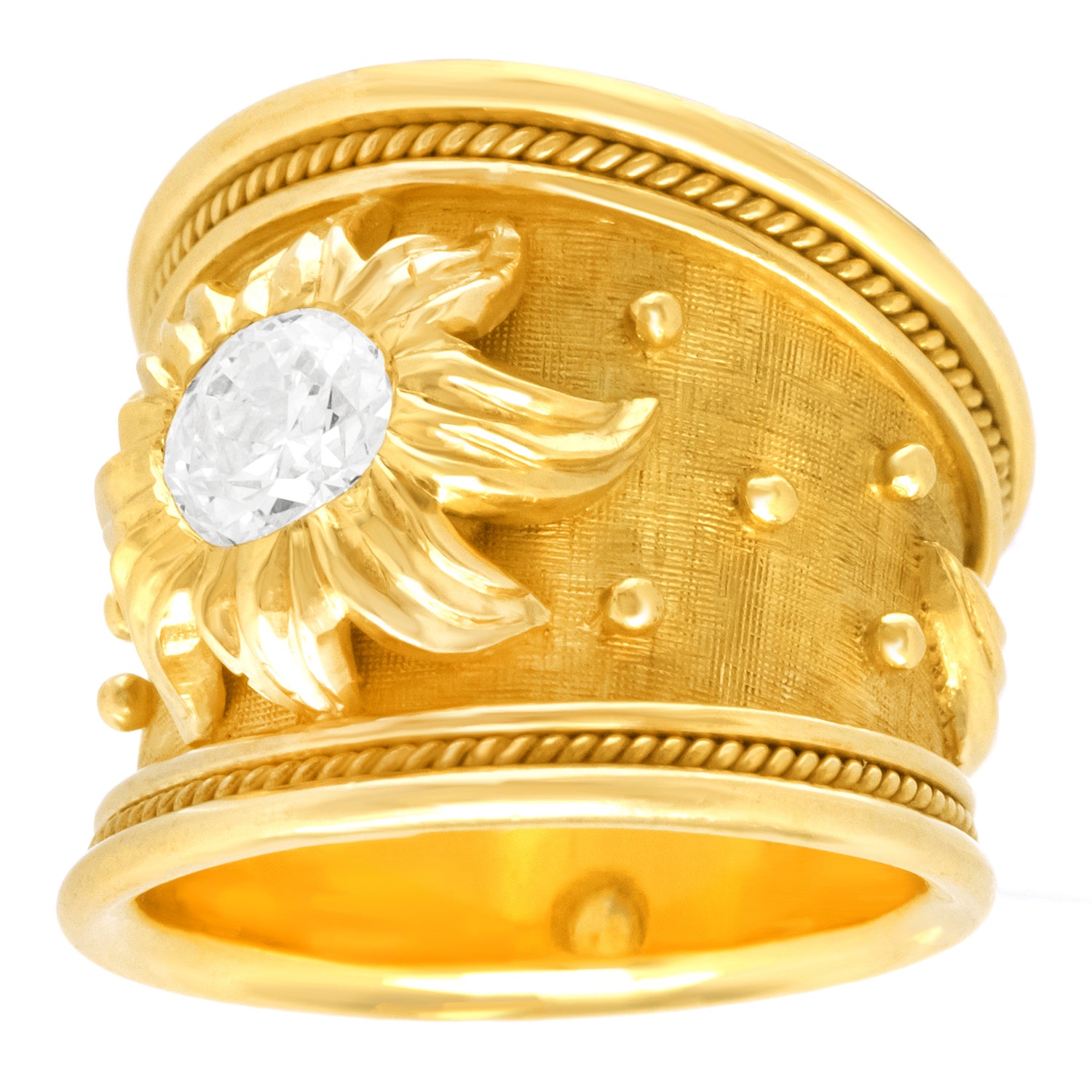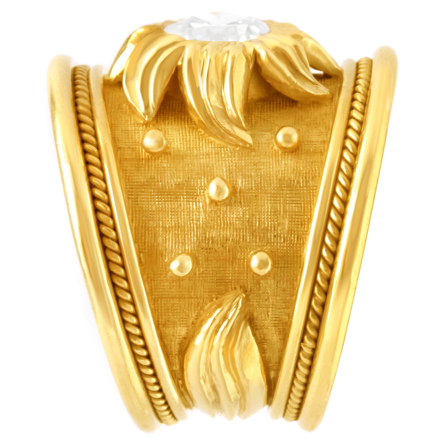 Circa 1991, 18k, by Elizabeth Gage, London, England. Signature Elizabeth Gage style, this diamond sun ring glistens with a 1.04-carat fine white old-cut diamond (G color, SI2 clarity). It features her linen textured gold and wire-twist-wire around the top and bottom of the ring. The look is timeless, London cool, wear it everywhere and with everything! Excellent condition.