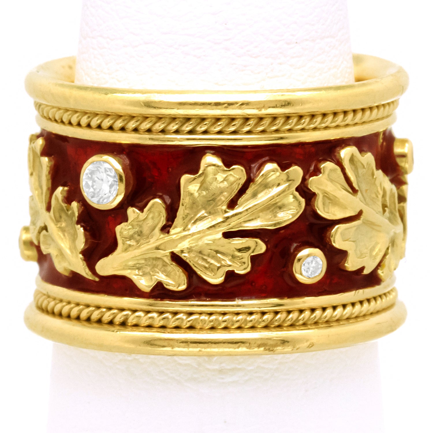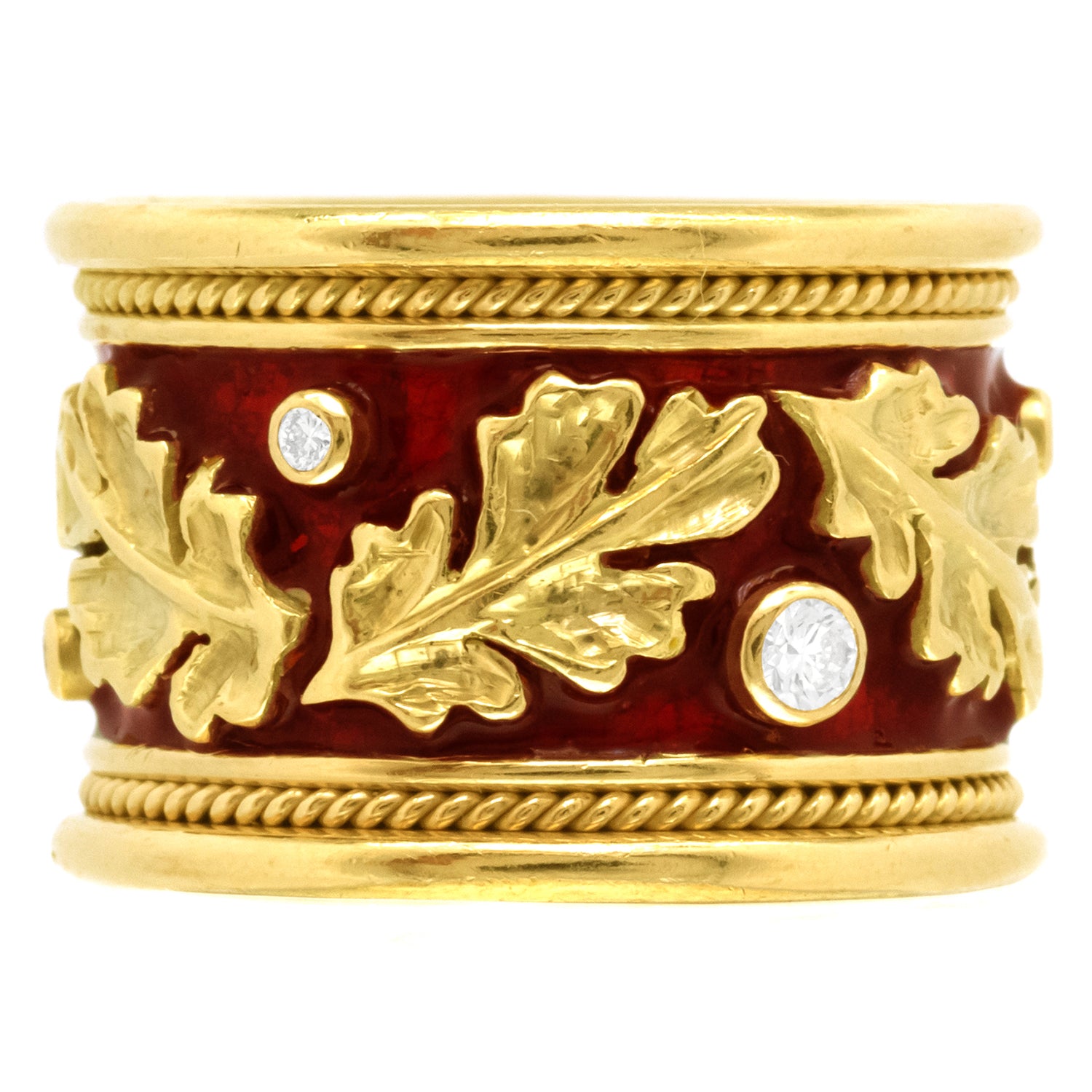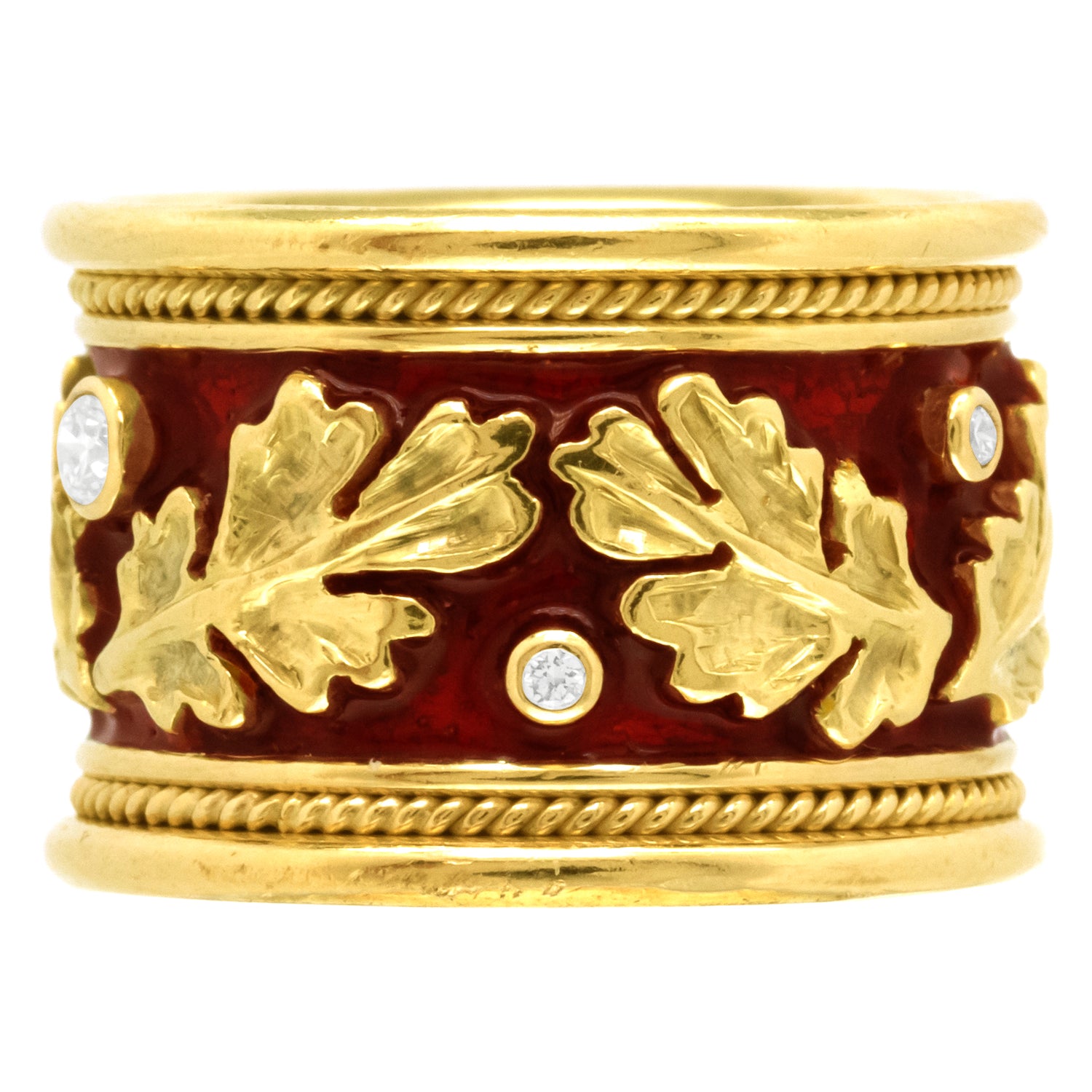 Circa 2013, 18k, by Elizabeth Gage, London, England. Iconically Elizabeth Gage, this Georgian-meets-Renaissance Revival ring is decorated with oak leaves and diamonds. The look is completed by exquisite red enamel. A perfect go-anywhere, with anything band, it effortlessly dresses up or down. Finely made in eighteen-karat yellow gold with the distinctive quality and look that Elizabeth Gage is famous for, it is in excellent condition.