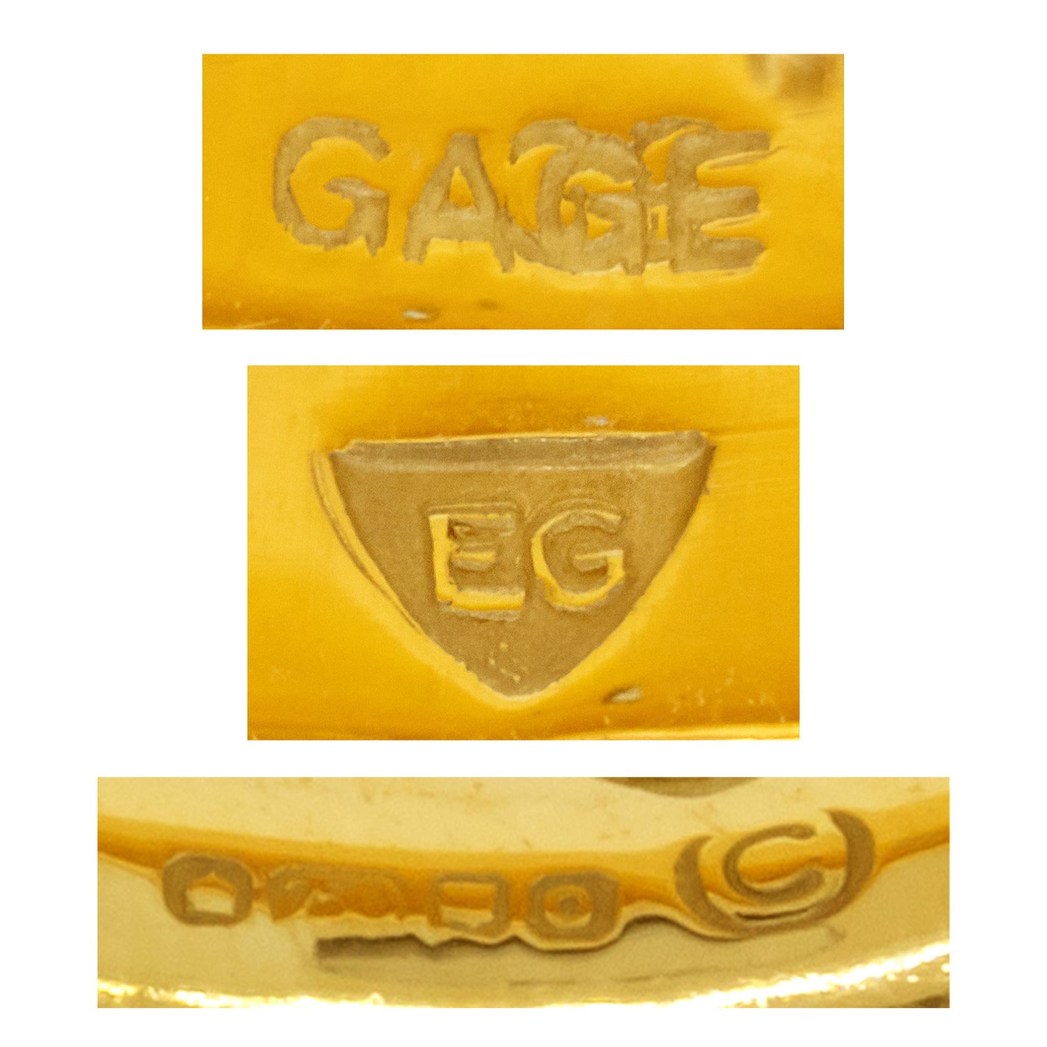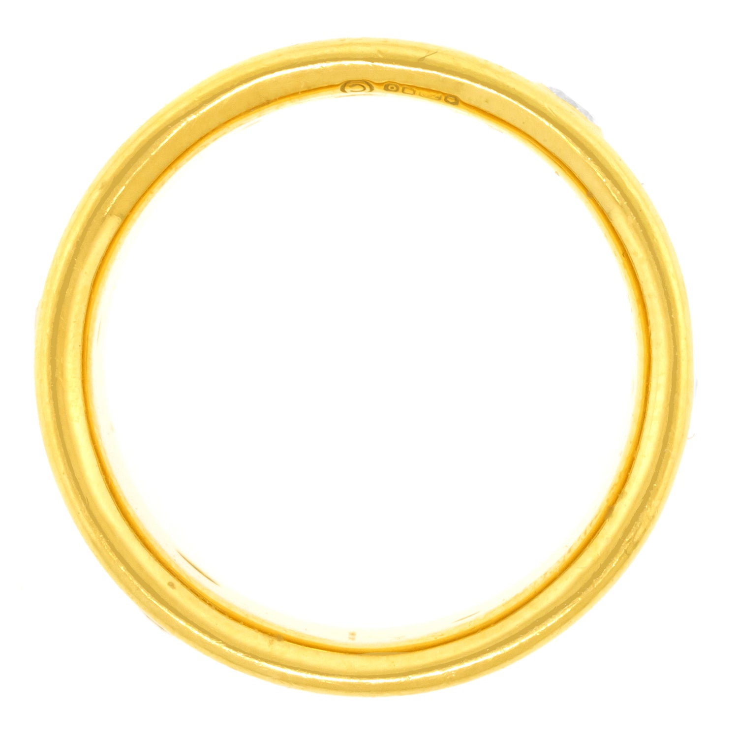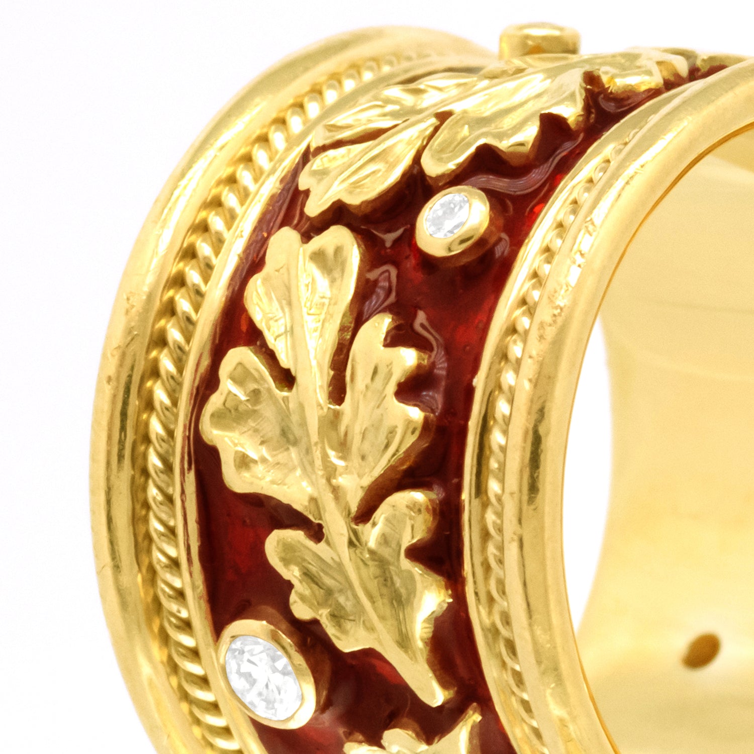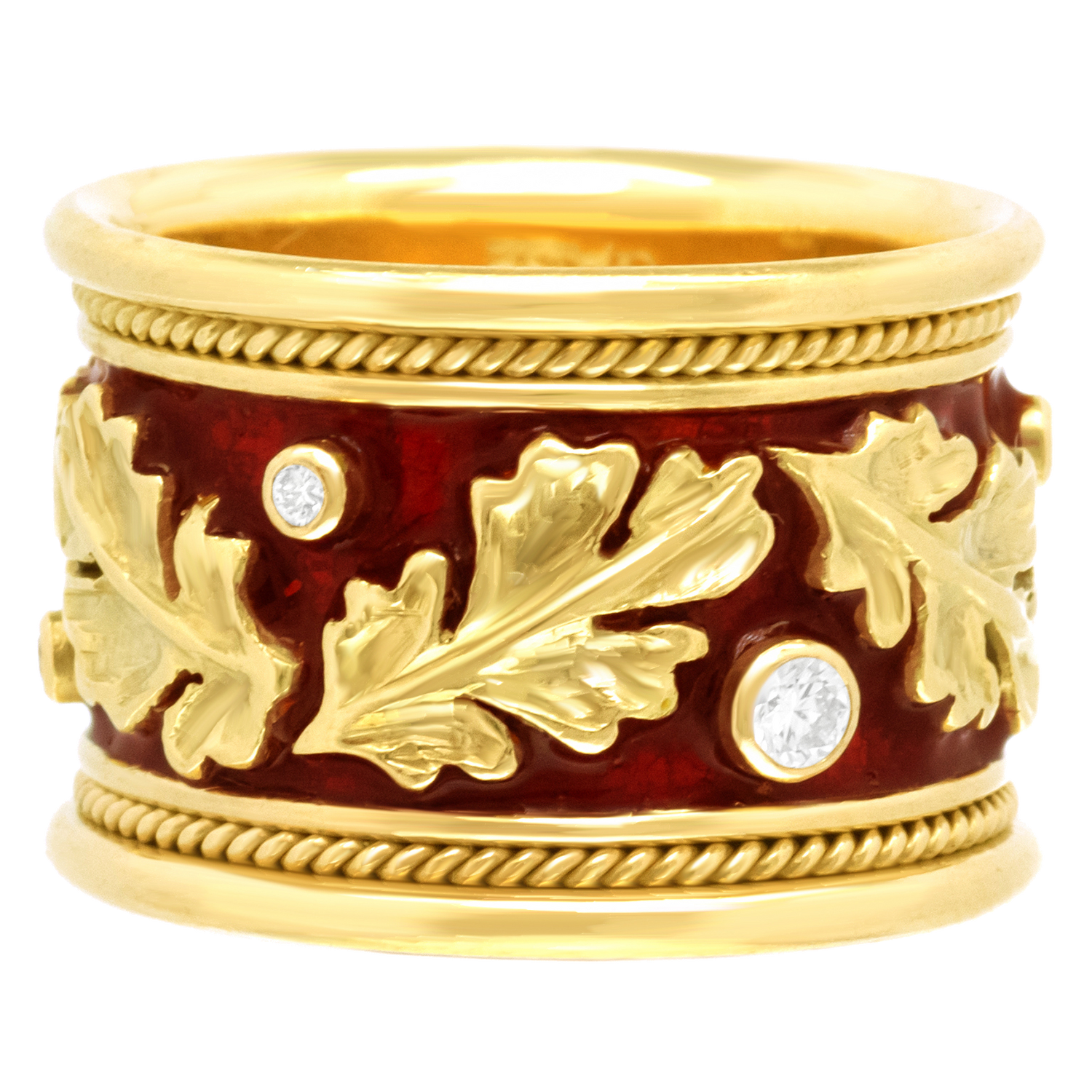 Circa 2013, 18k, by Elizabeth Gage, London, England. Iconically Elizabeth Gage, this Georgian-meets-Renaissance Revival ring is decorated with oak leaves and diamonds. The look is completed by exquisite red enamel. A perfect go-anywhere, with anything band, it effortlessly dresses up or down. Finely made in eighteen-karat yellow gold with the distinctive quality and look that Elizabeth Gage is famous for, it is in excellent condition.