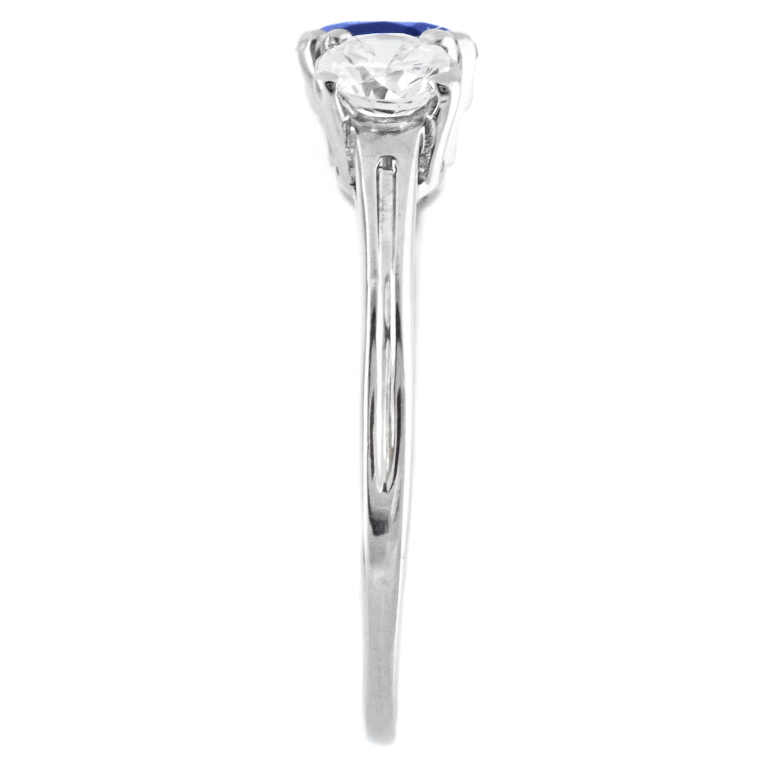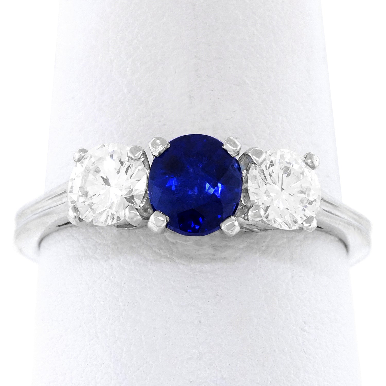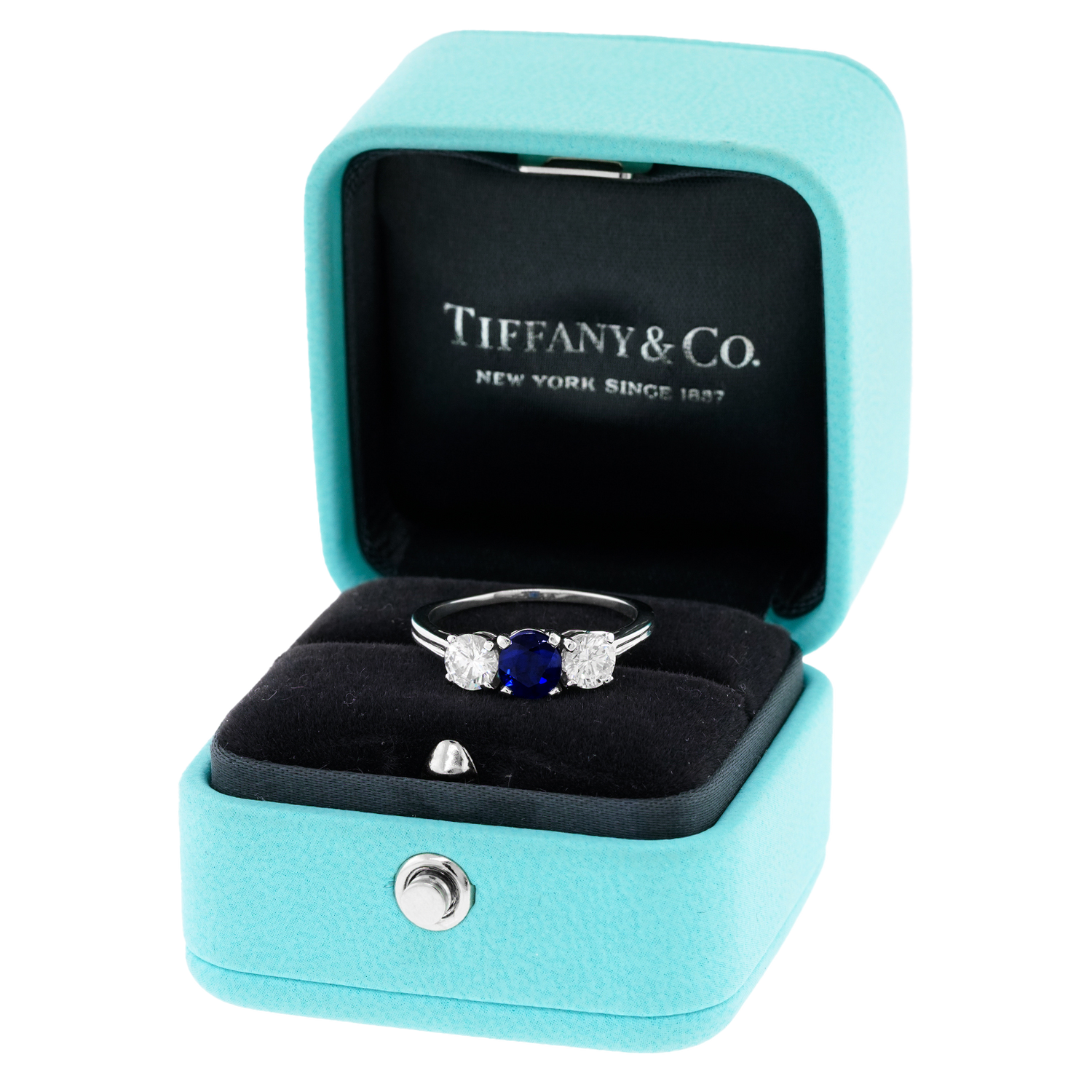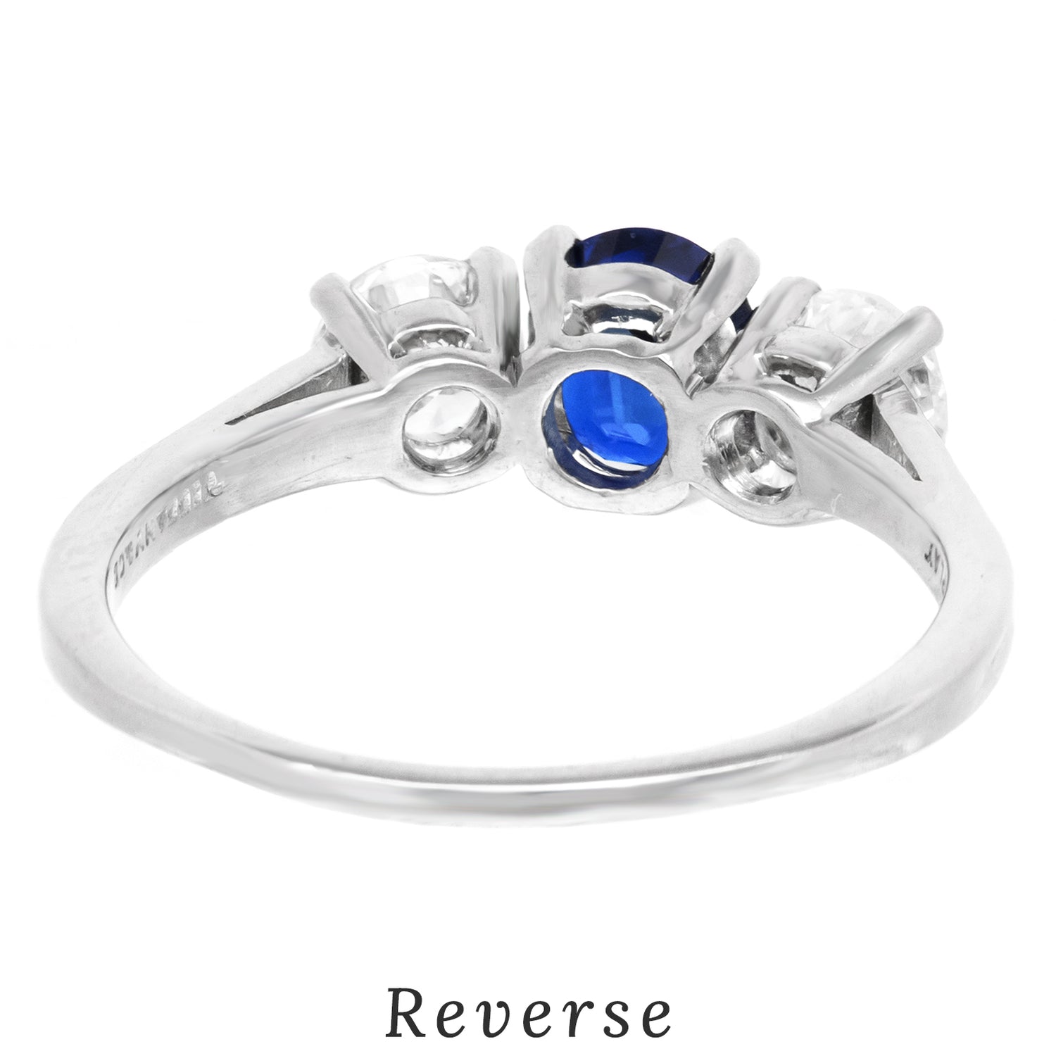 Circa 1965, Platinum, by Tiffany & Co., New York. This stunning three stone ring from Tiffany is all about beautiful stones. Featuring a rich royal blue .94-carat sapphire paired with .72 carats of brilliant white diamonds (G color, VS clarity), this timeless jewel is equally perfect as an engagement ring or right-hand ring. Excellent condition.