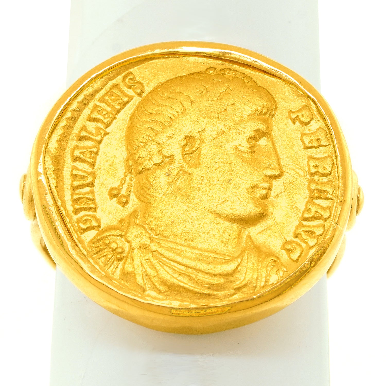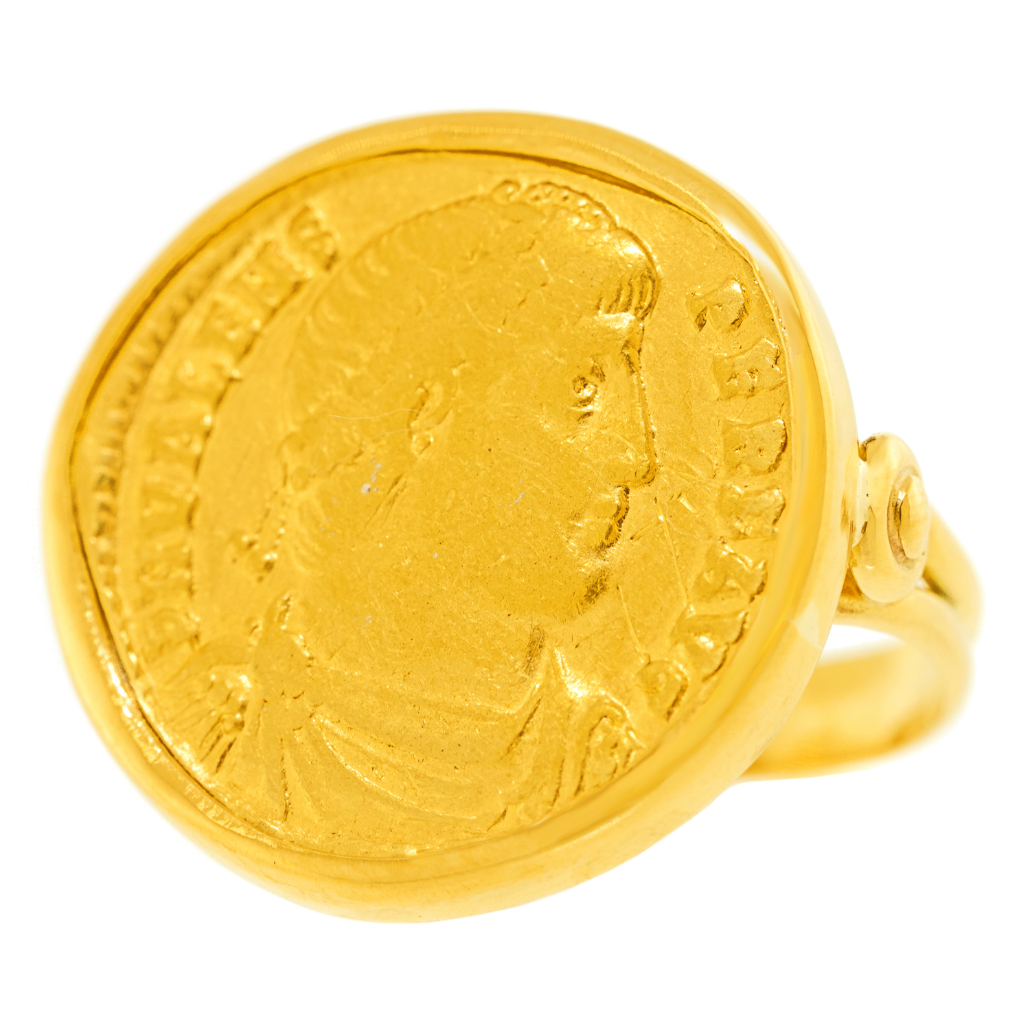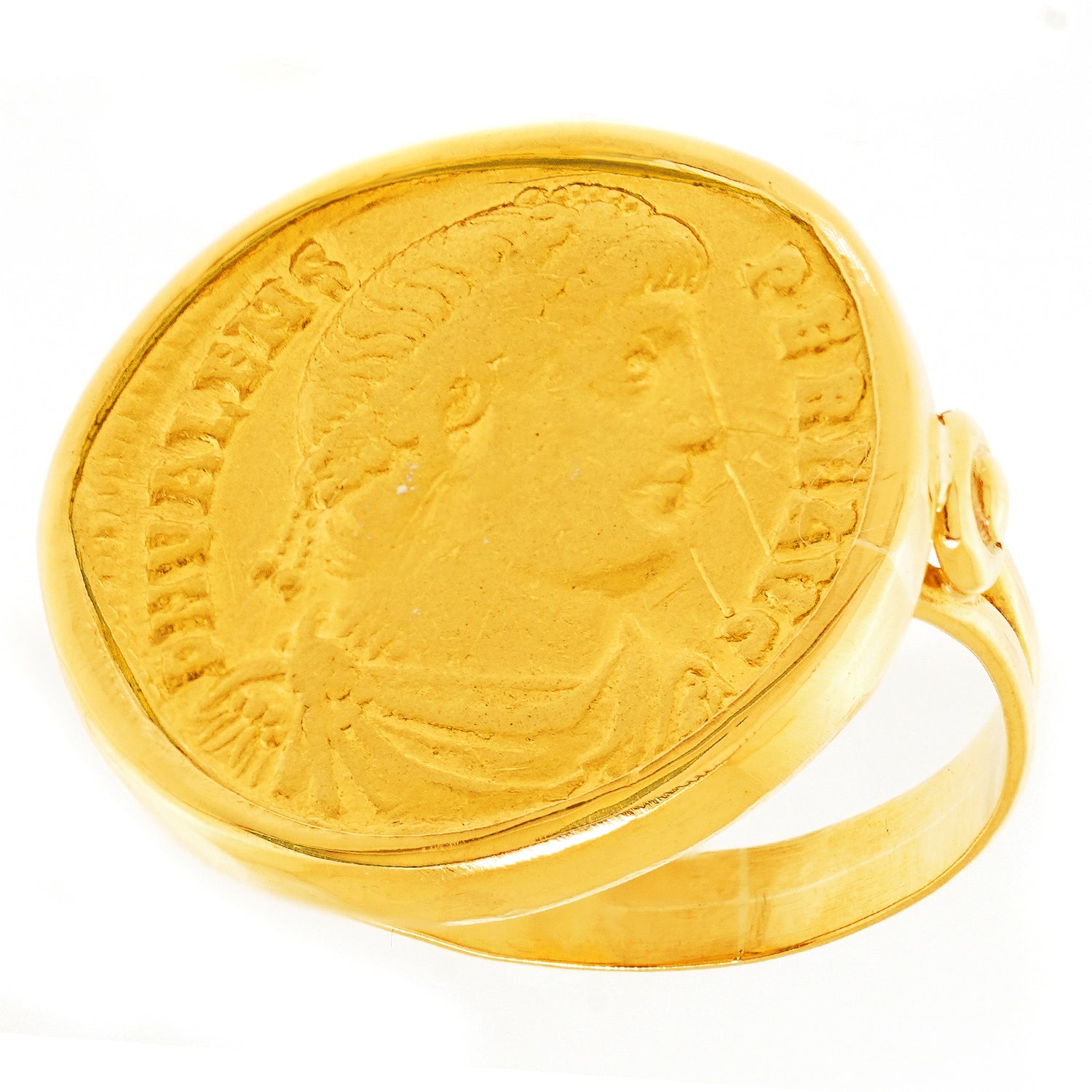 Circa 1960s, 22k ring and circa 364 AD 22k Roman coin. This delightful 4th-century Roman coin ring features Emperor Valens. Set with a gold solidus in a handmade 22k mounting, the look is rich, with a deep color ... unmistakably cover of Vogue. Finely fabricated, it is in excellent condition.