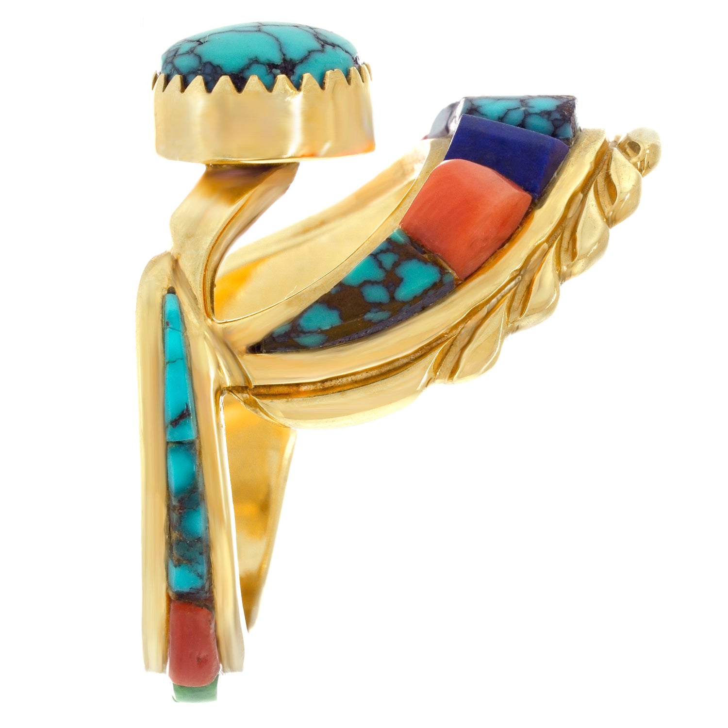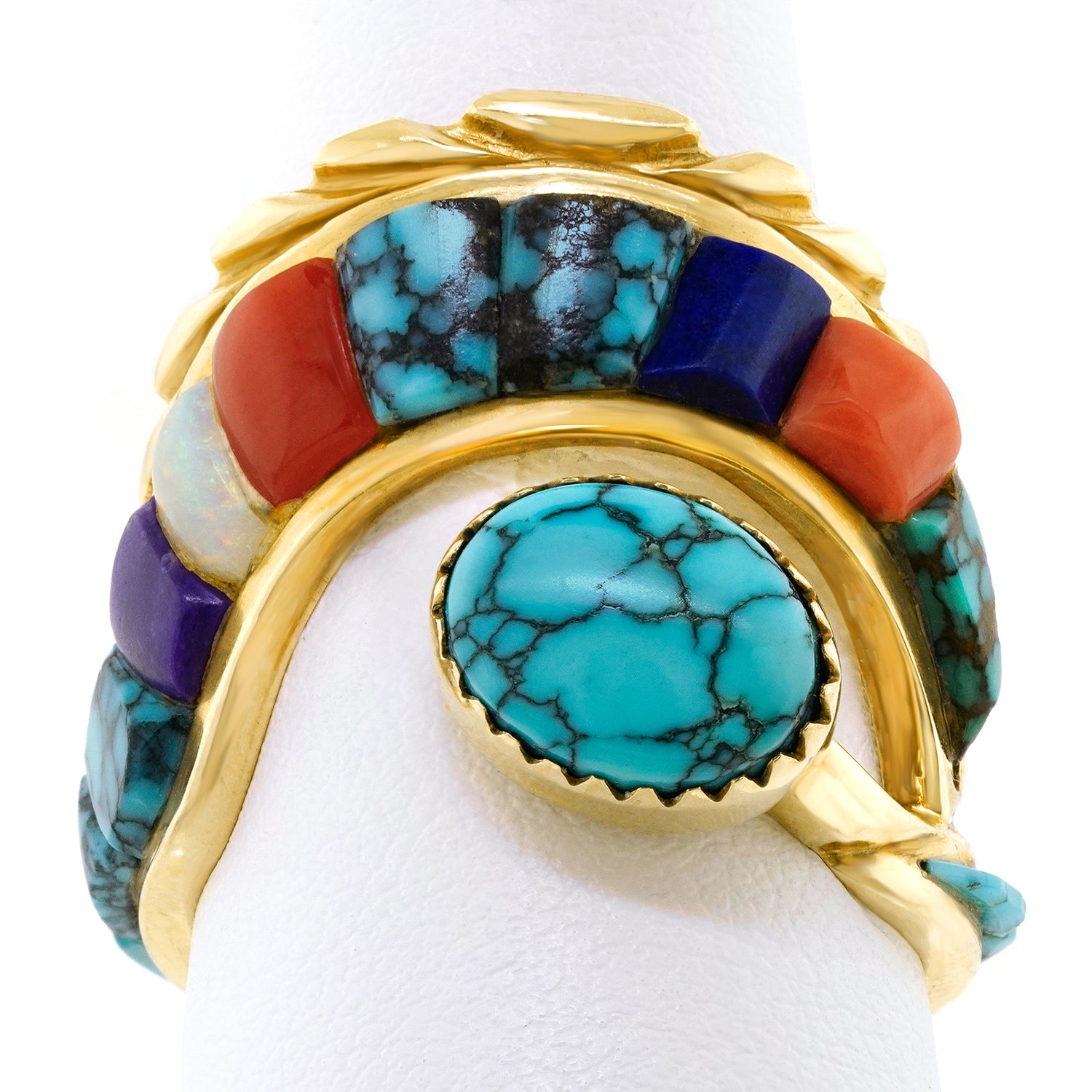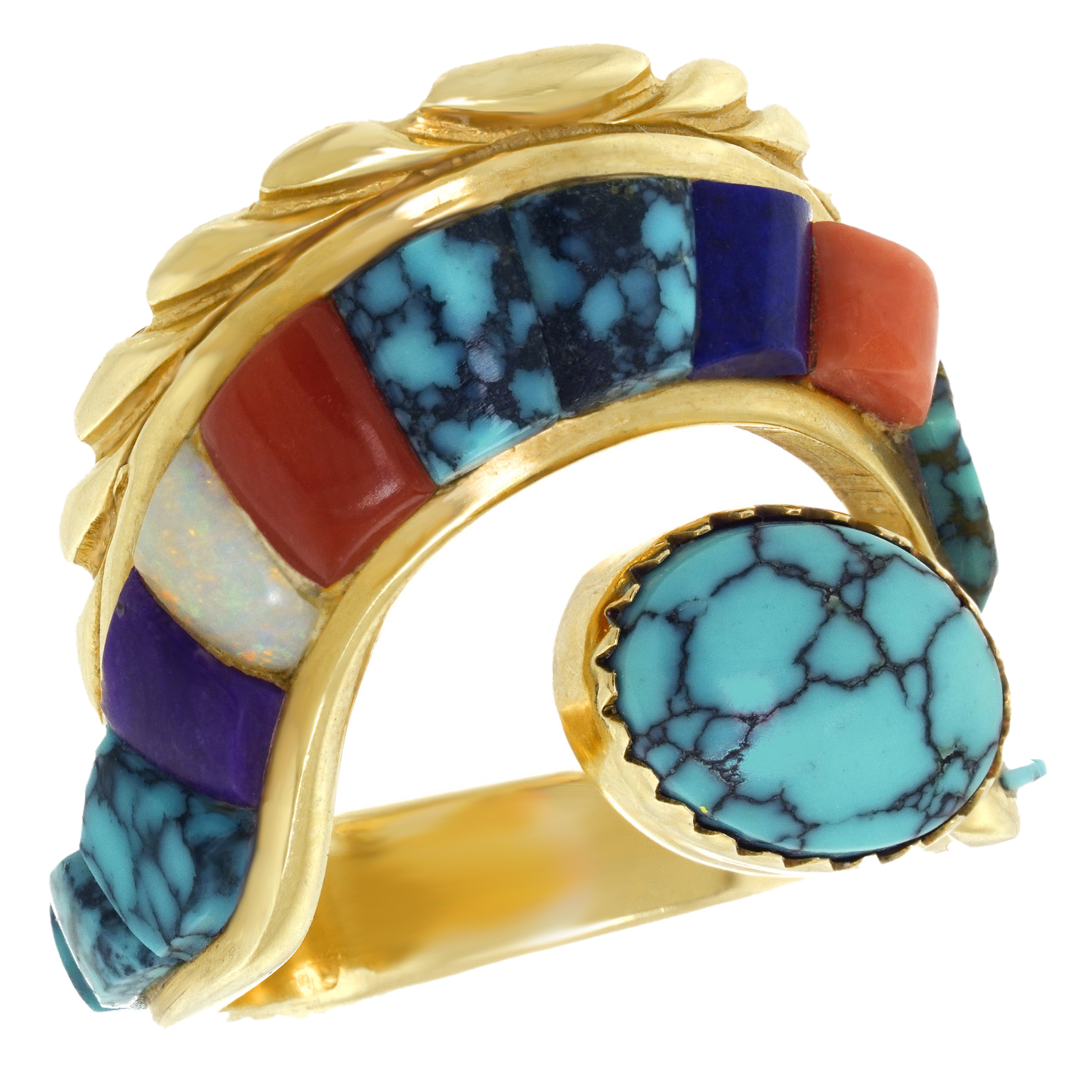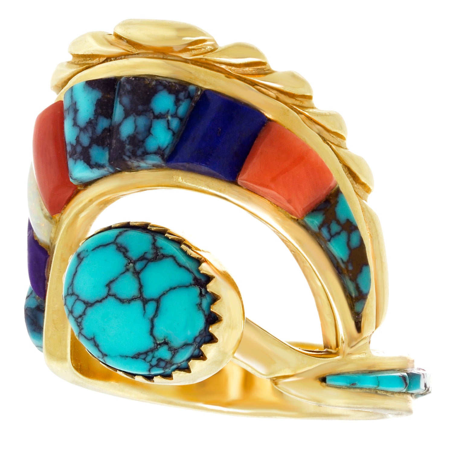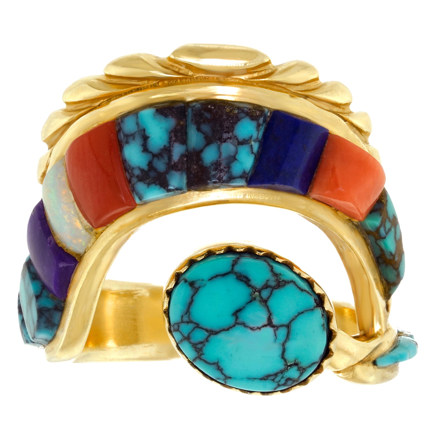 Circa 1970s, 14k, Attributed Cordelia Casuse, Hopi. Featuring the distinctive Hopi cobblestone motif, this fabulous seventies ring is all about color. Suggesting the crown of a hopi crown dancer, this modernist form is visually fluid while remaining delightfully abstract. Set with turquoise, coral, lapis, opal, and jade, the expression is defiantly extra! Excellent condition.