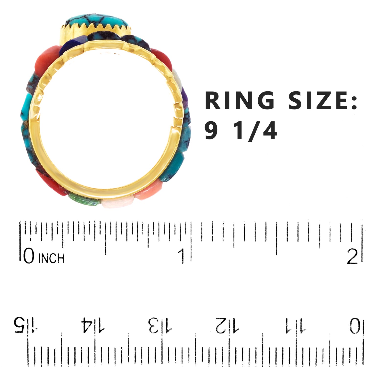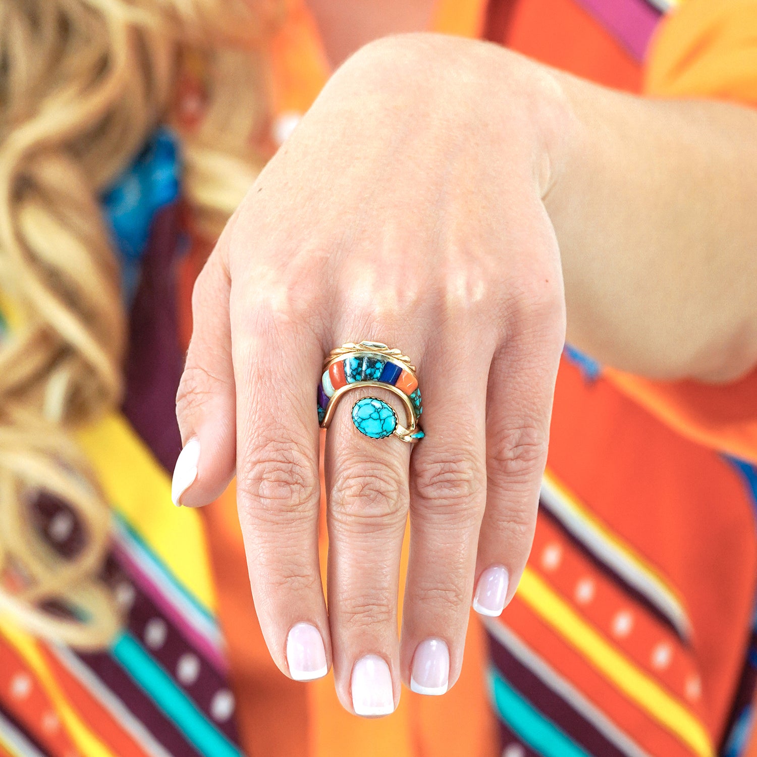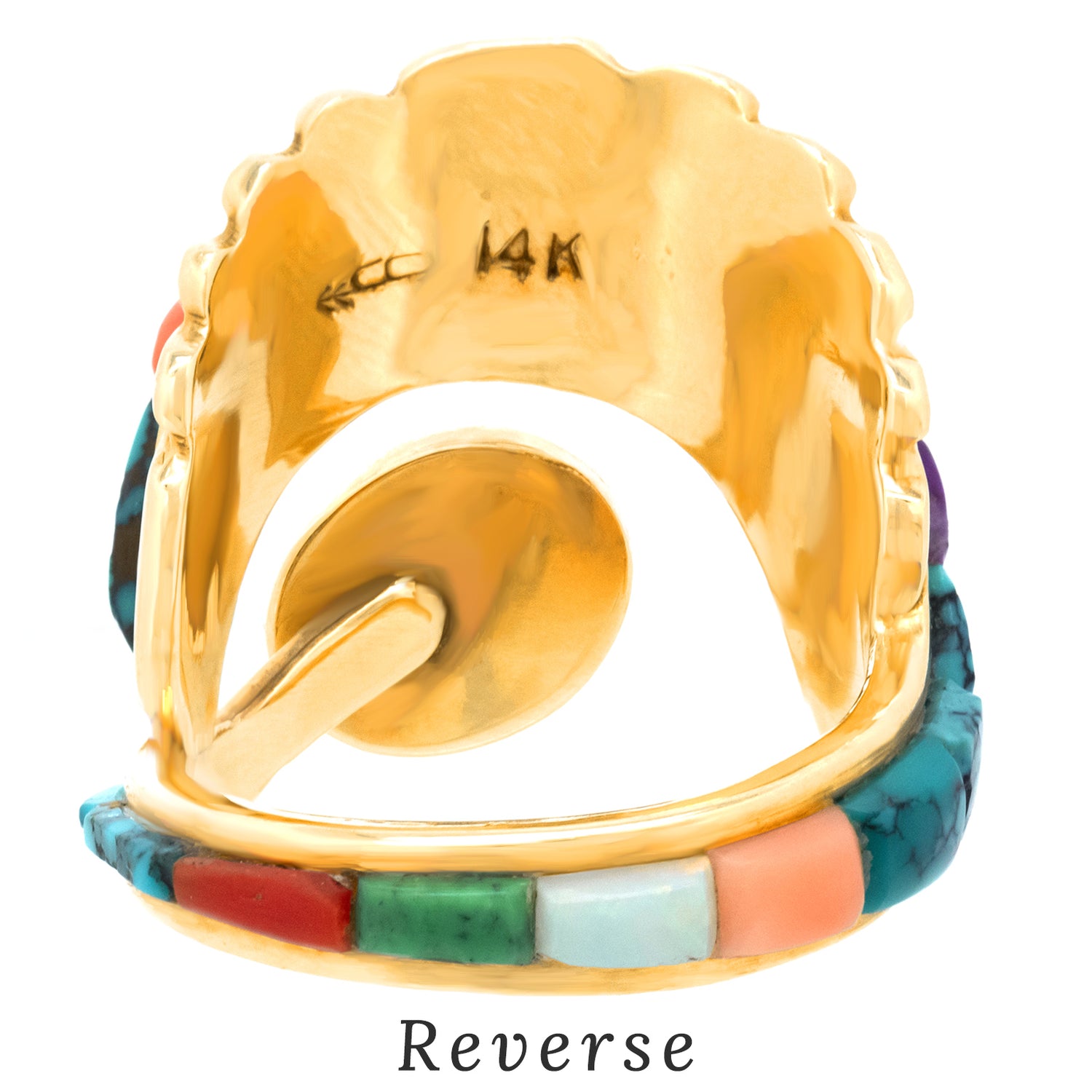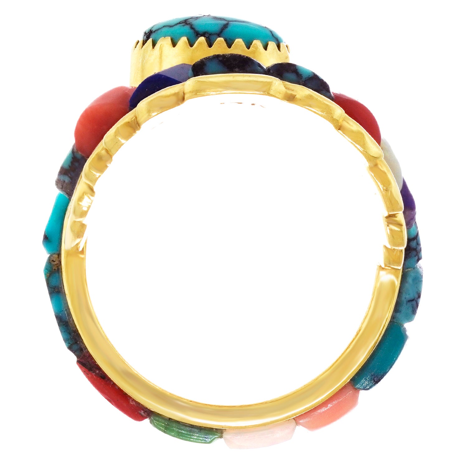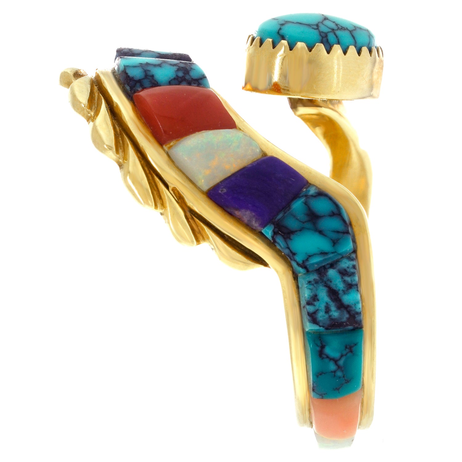 Circa 1970s, 14k, Attributed Cordelia Casuse, Hopi. Featuring the distinctive Hopi cobblestone motif, this fabulous seventies ring is all about color. Suggesting the crown of a hopi crown dancer, this modernist form is visually fluid while remaining delightfully abstract. Set with turquoise, coral, lapis, opal, and jade, the expression is defiantly extra! Excellent condition.