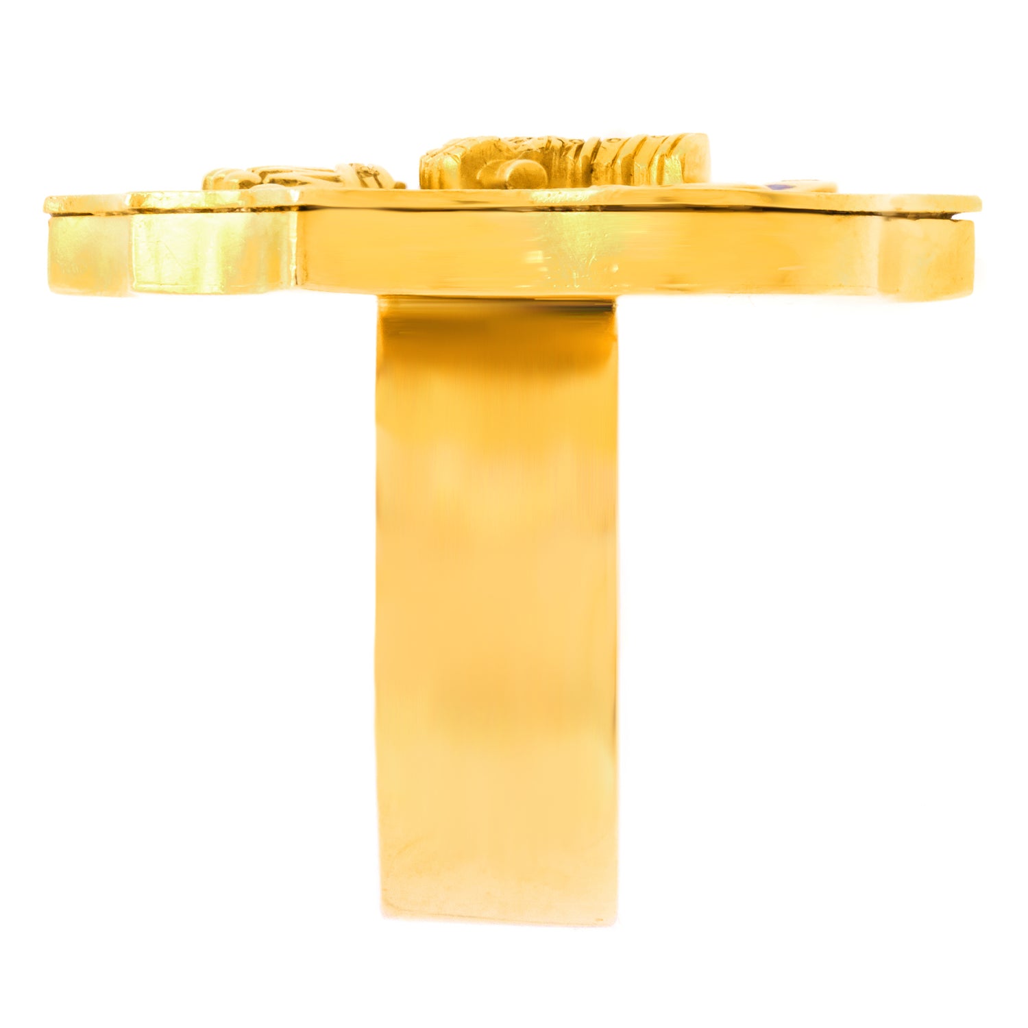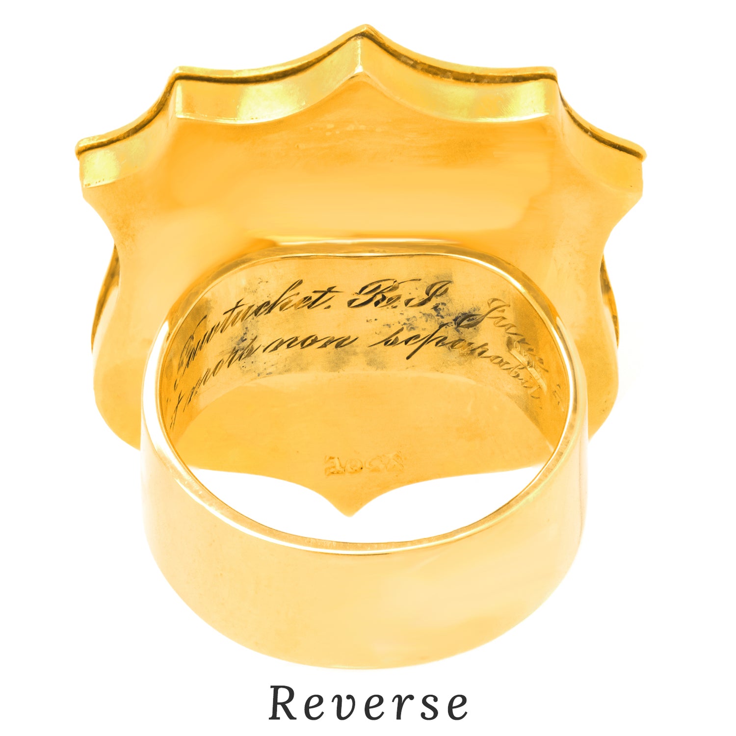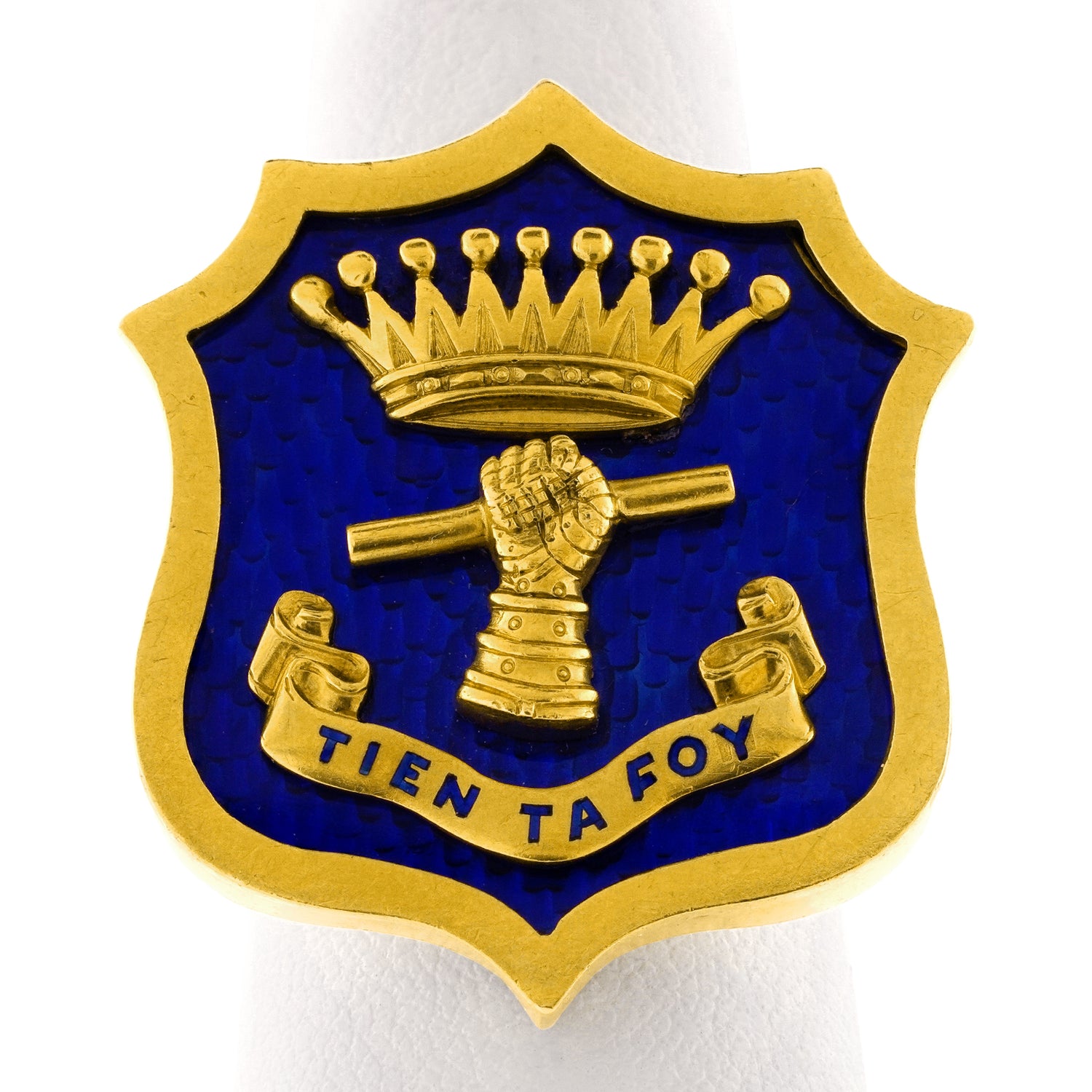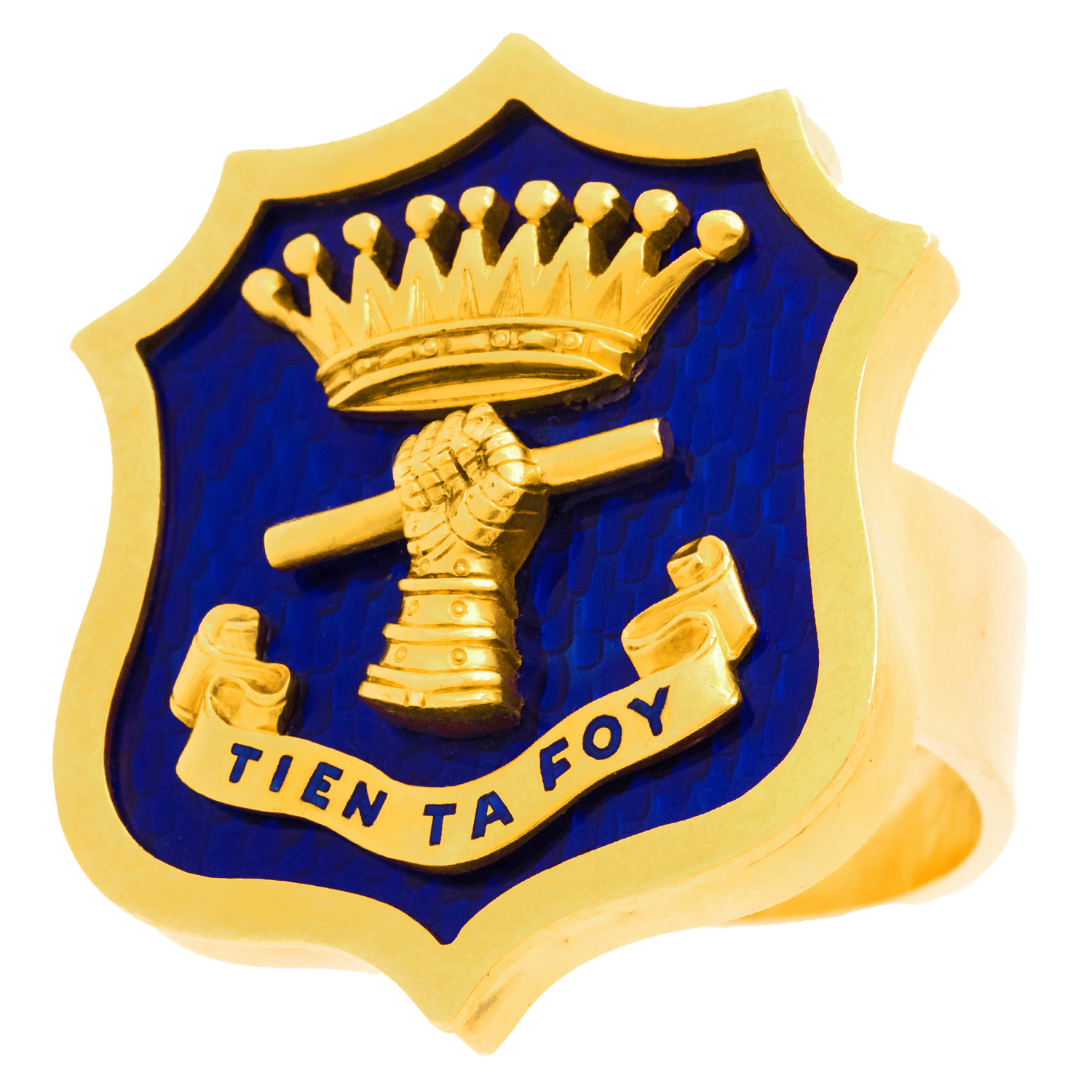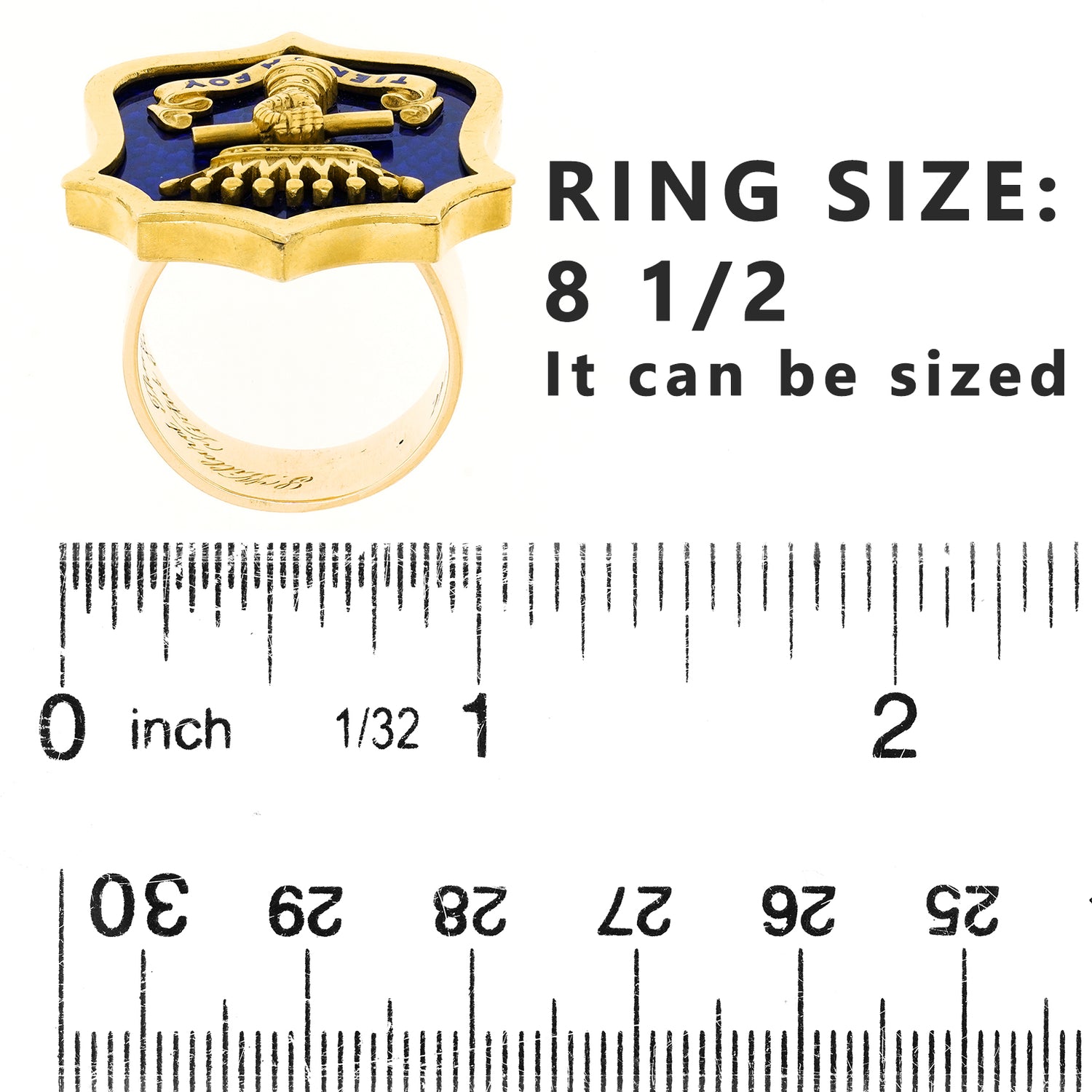 Circa 1911, 18k top, 14k band. This gorgeous 18k yellow gold signet ring features an armorial with the motto Tien Ta Foy… "Steadfast Faith." With generous size, scale, and heft, the bold town and country look is underscored by striking royal blue enamel. The look is vintage chic at its Renaissance Revival best. Finely made, this ring is in excellent condition.