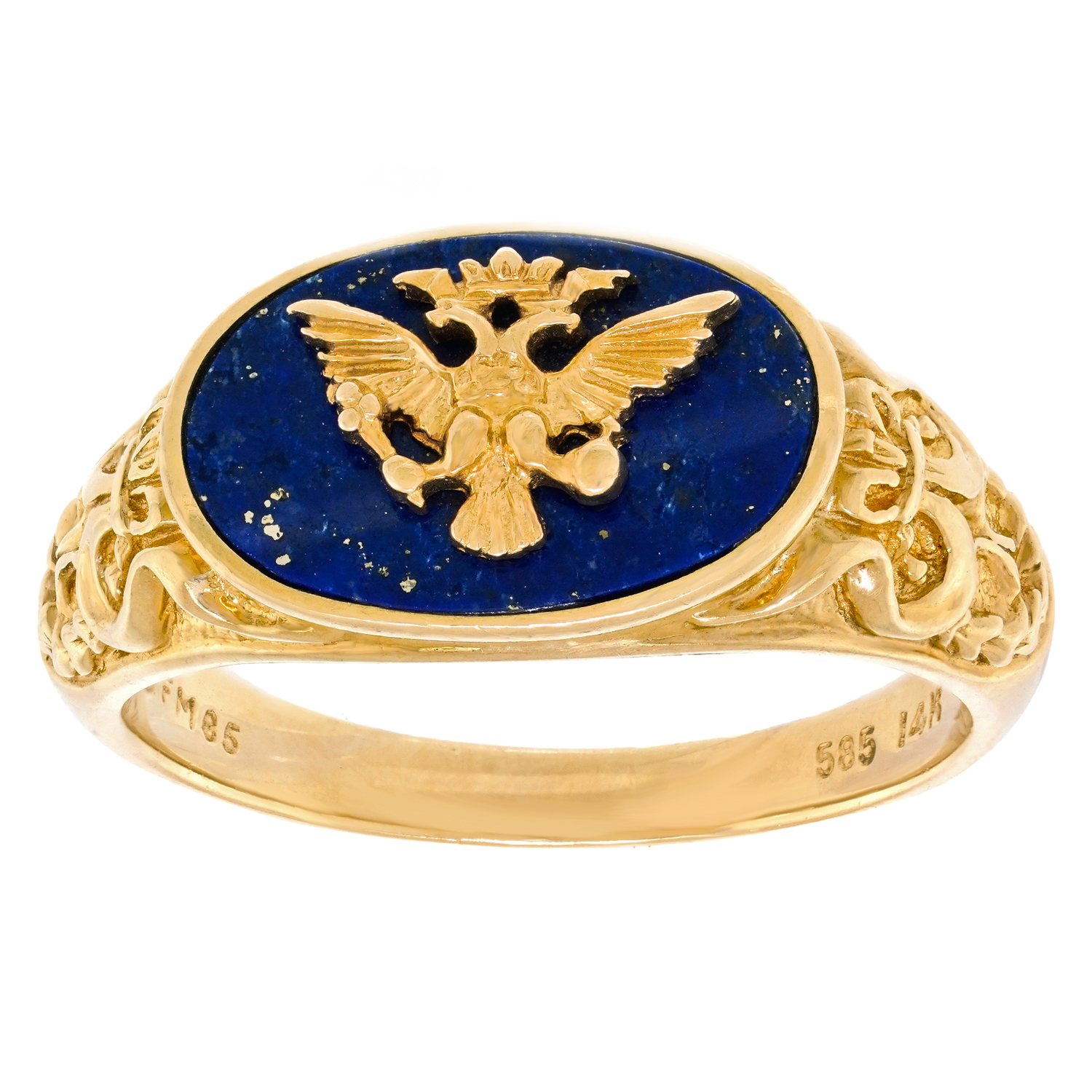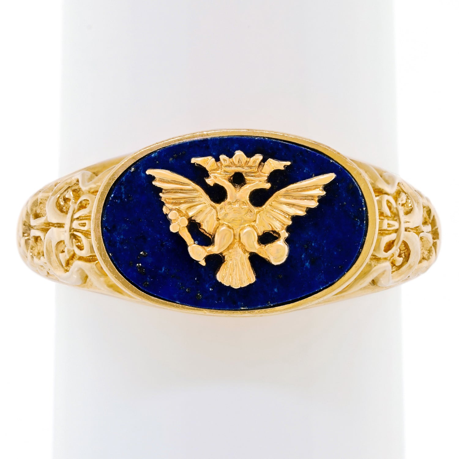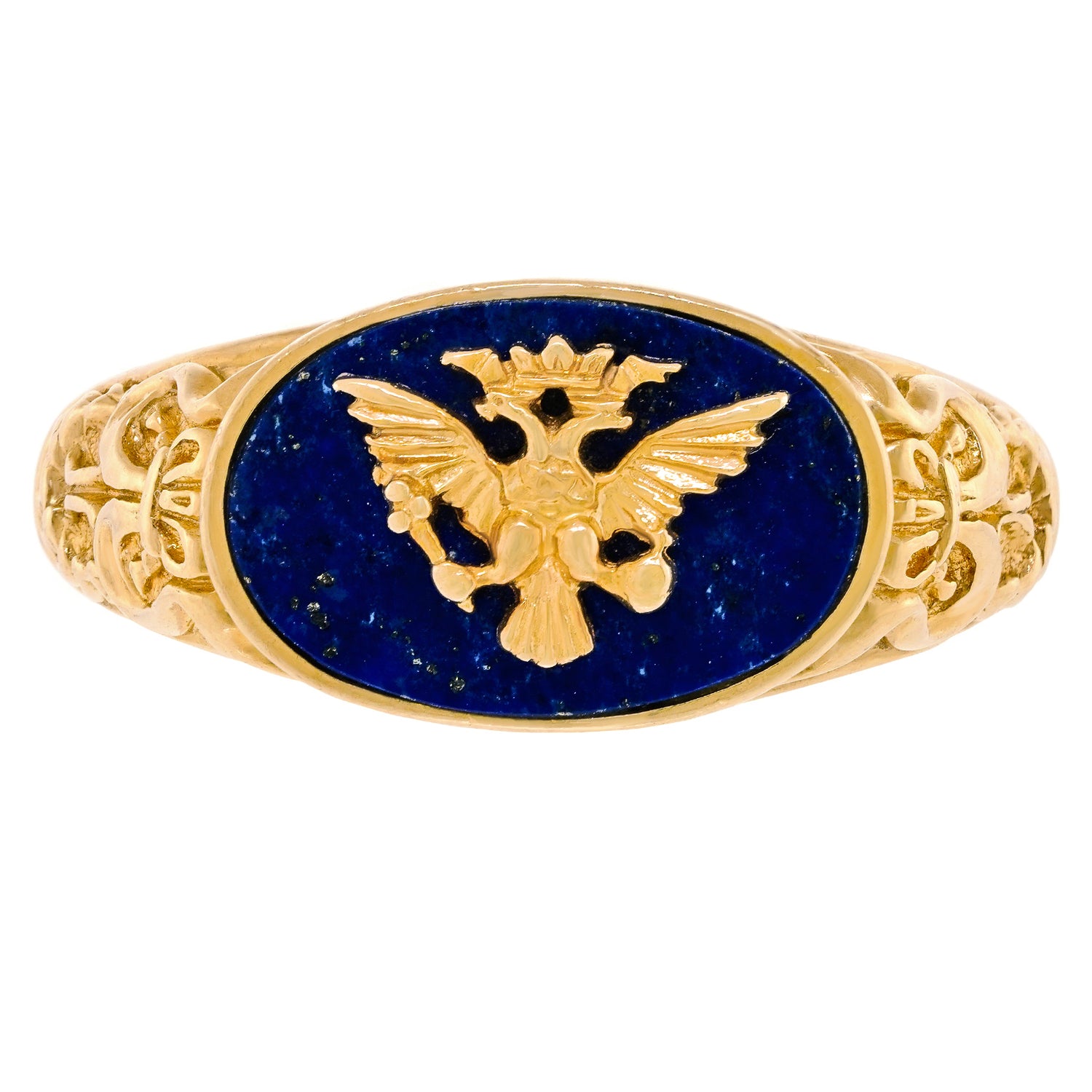 Circa 1960s, 14k. This sixties signet ring features a double-headed eagle armorial set into gorgeous blue lapis, decorated with elegant swaged ribbon and wreath motifs. Currently a size 12, it could be made smaller. Excellent condition.