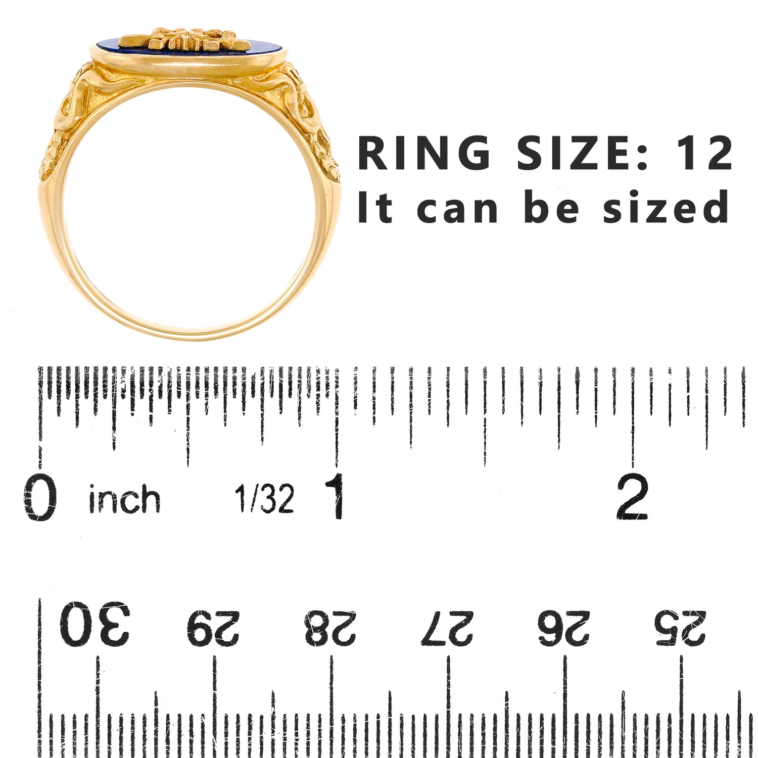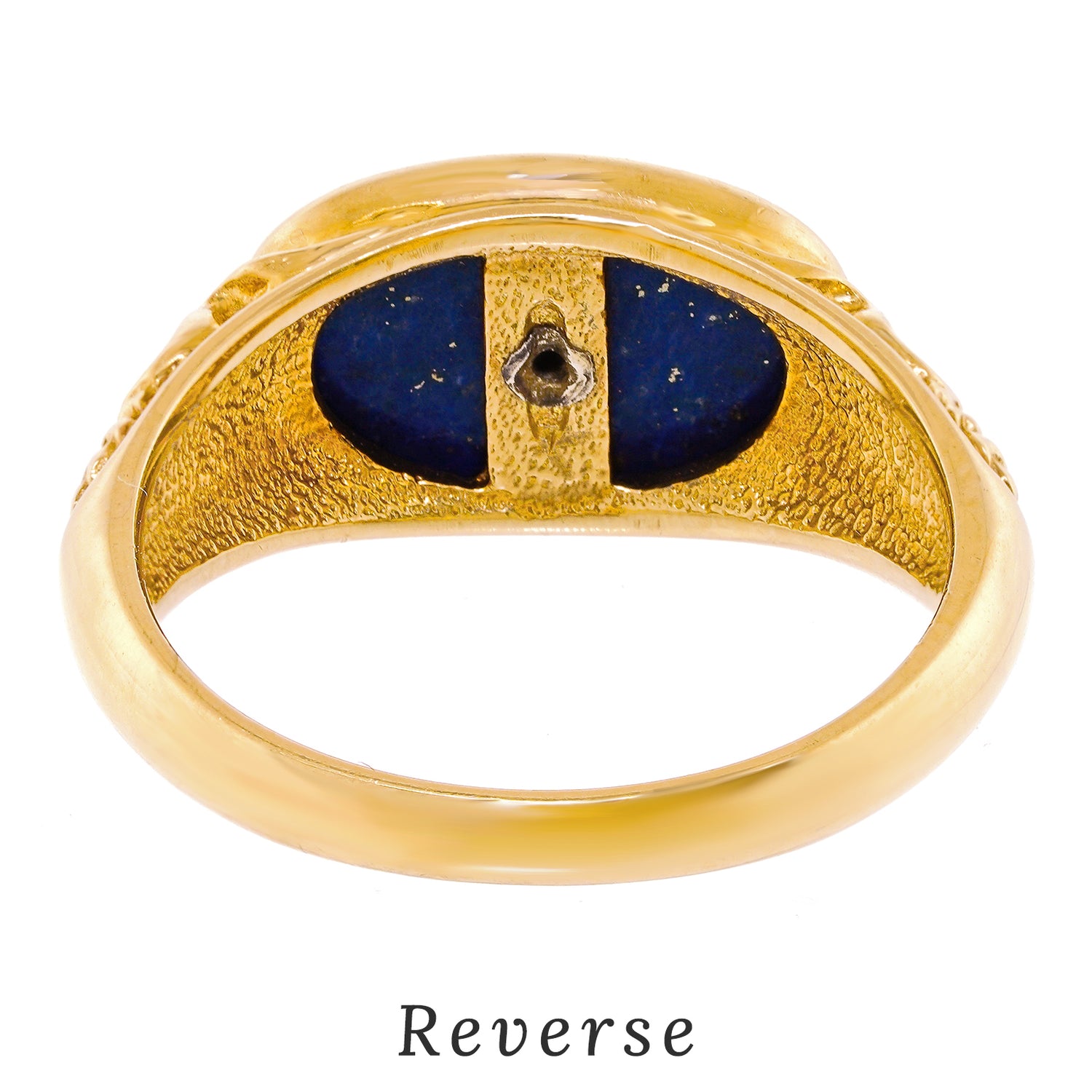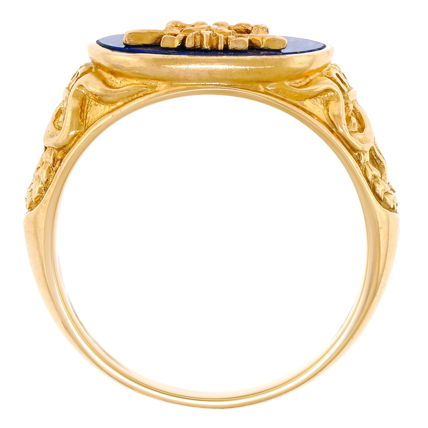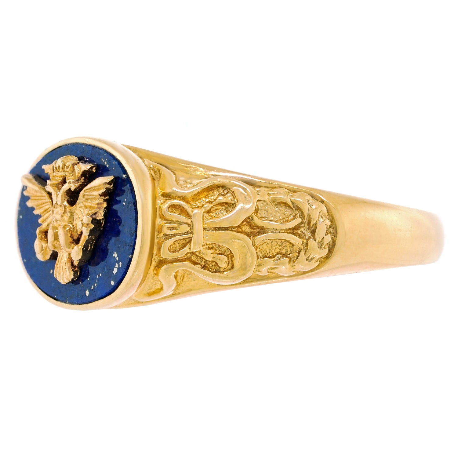 Circa 1960s, 14k. This sixties signet ring features a double-headed eagle armorial set into gorgeous blue lapis, decorated with elegant swaged ribbon and wreath motifs. Currently a size 12, it could be made smaller. Excellent condition.