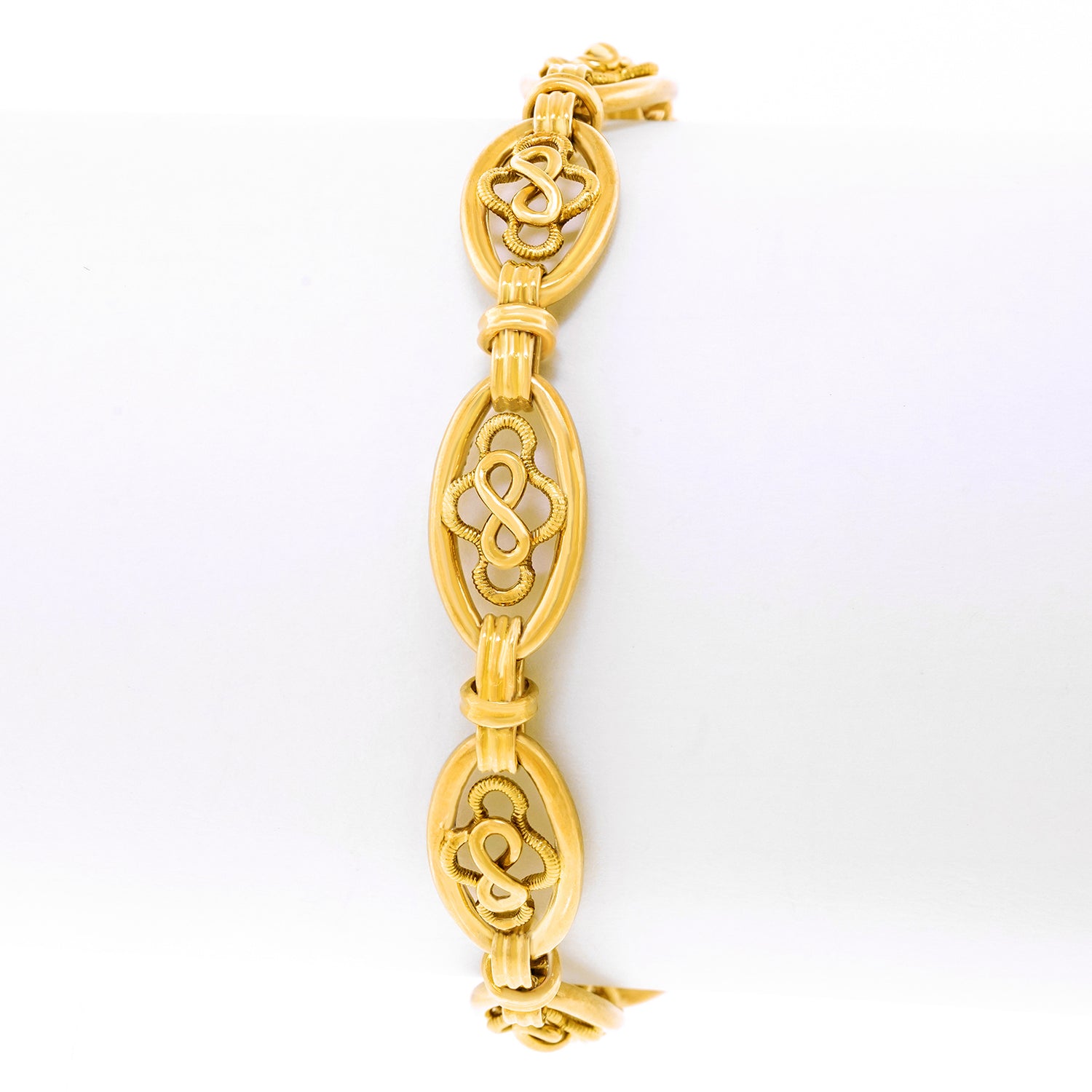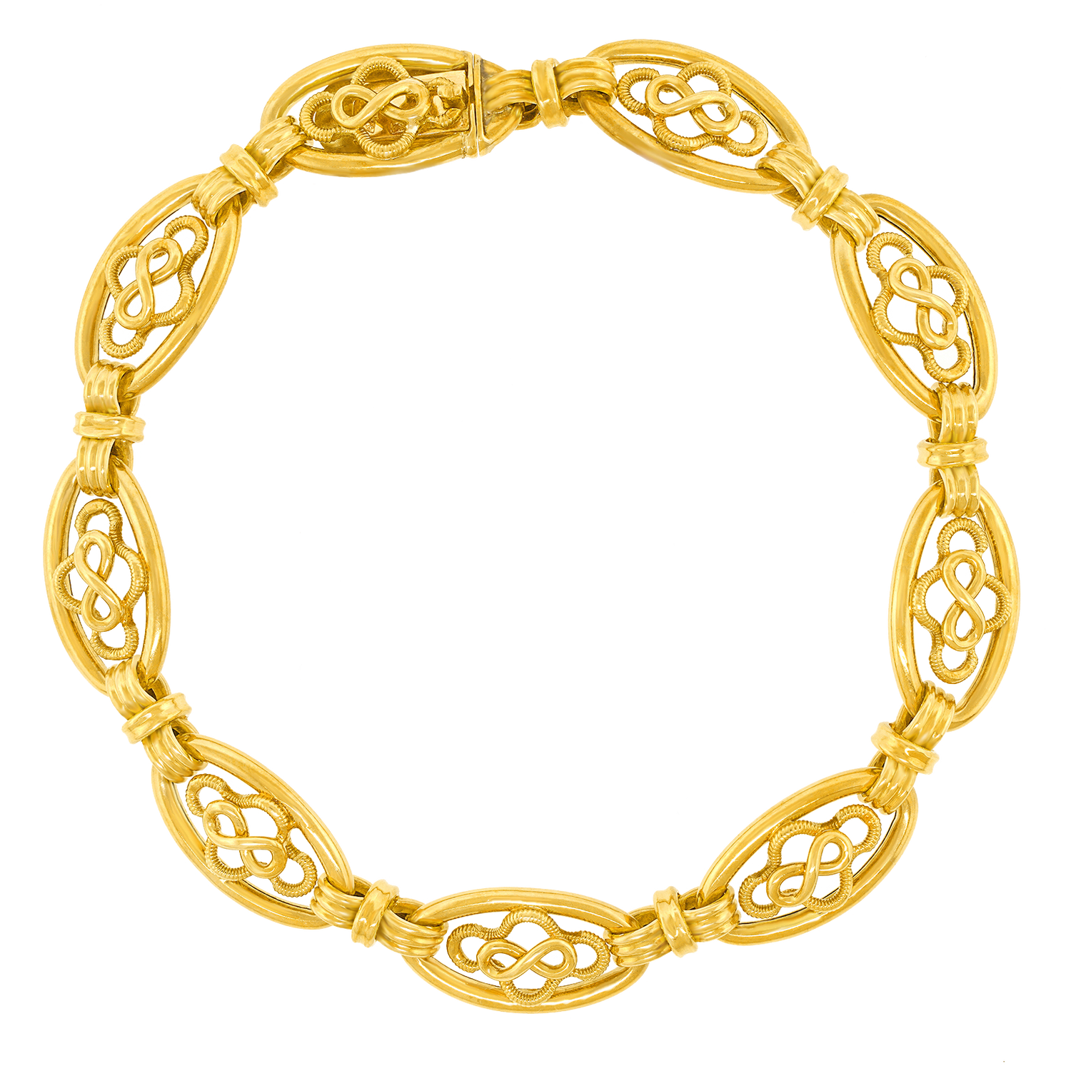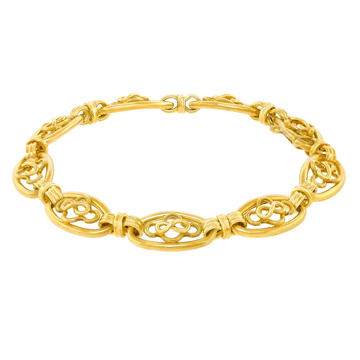 Circa 1880s, 18k, France. This antique French bracelet features stylish handmade 18k yellow gold filigree elements. Dressed up or down, the look is Gallic Town and Country at its most Parisian chic. A versatile accessory that is perfect on its own, with a watch, or with a stack of bracelets. Excellent condition.