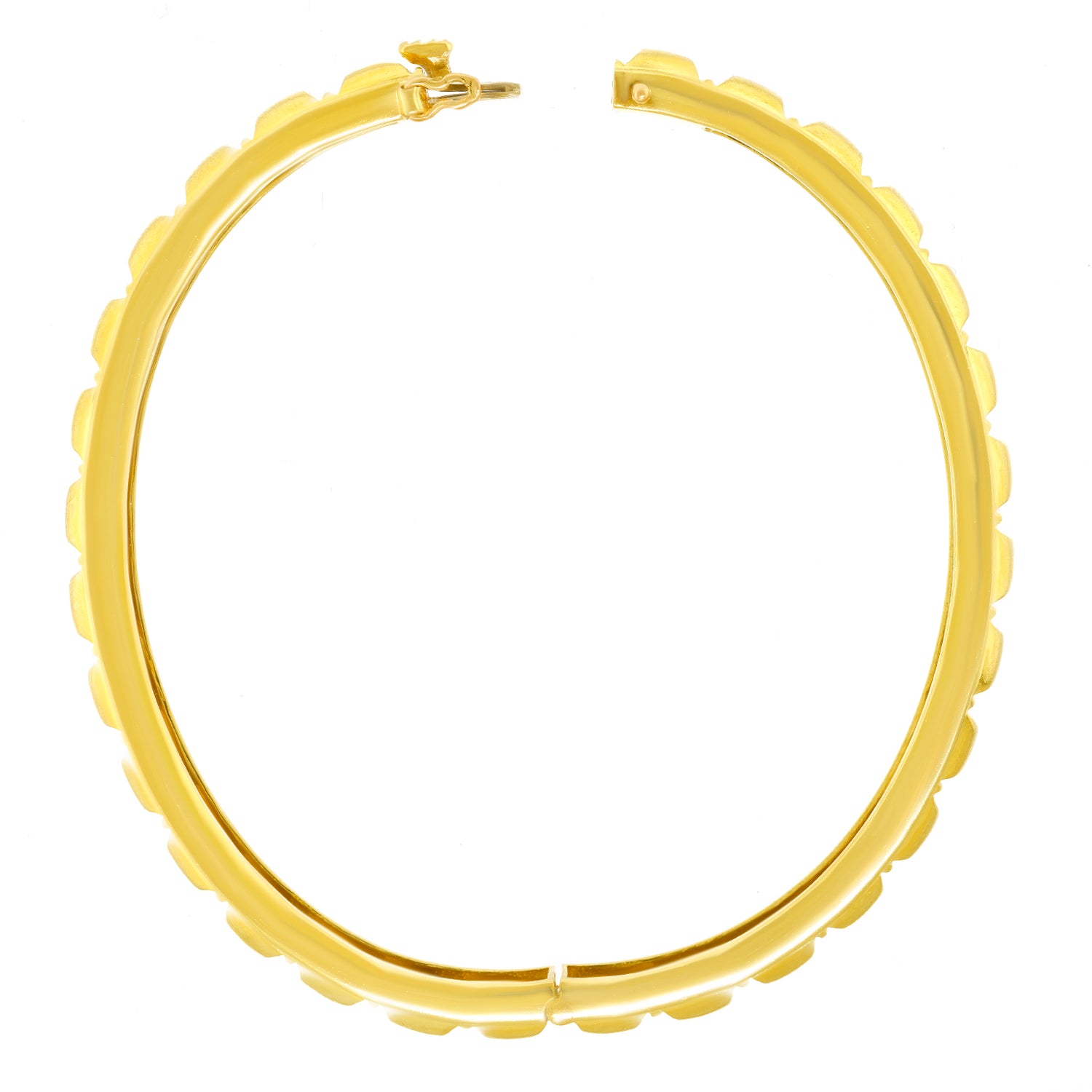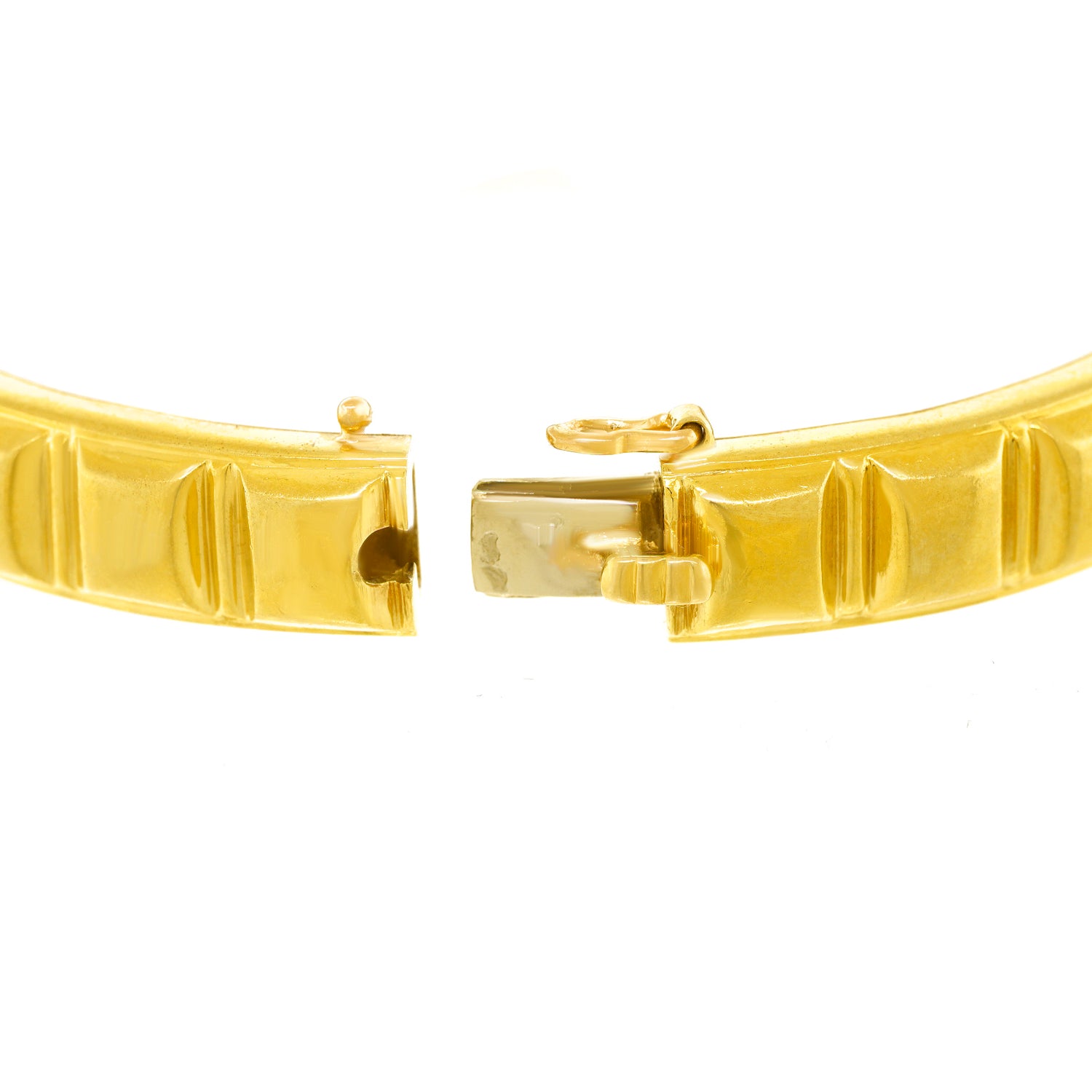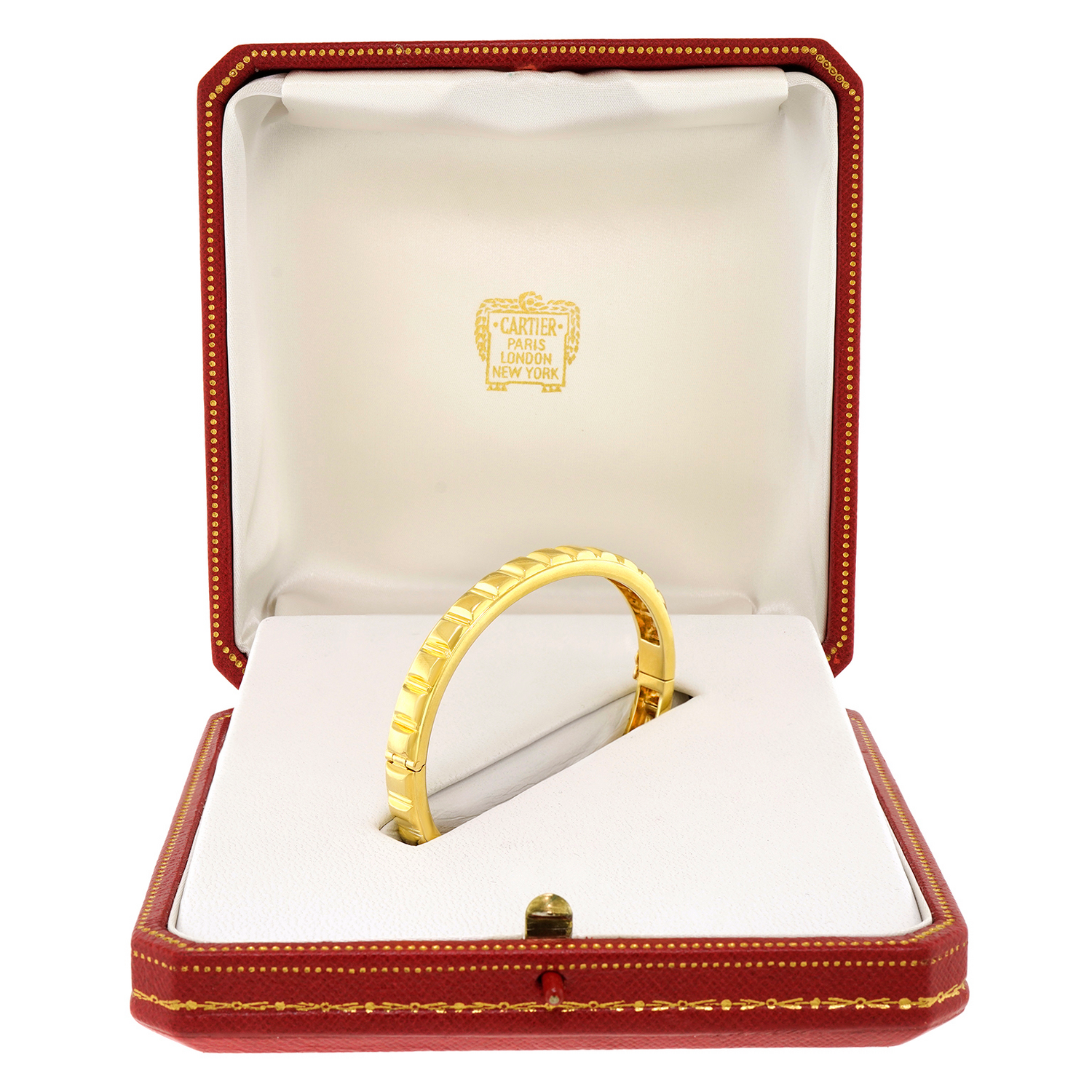 Circa 1970s, 18k, by Cartier, Paris, France. Simply gorgeous, this seventies chic Cartier bracelet easily dresses up for cocktails or is effortlessly casual with jeans and oversized sunglasses. Exquisitely made with the edgy design and superb quality that Cartier Paris is famous, it is in excellent condition. Noted; This bangle has a catch and is hinged for ease of wear.