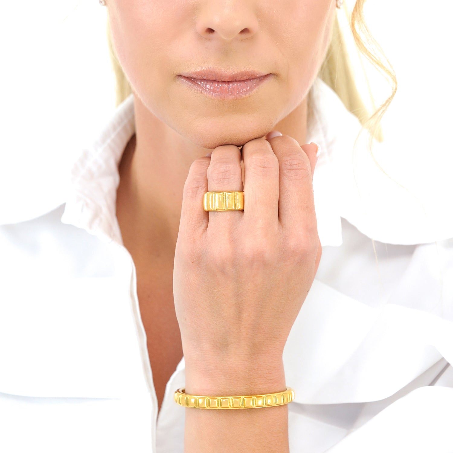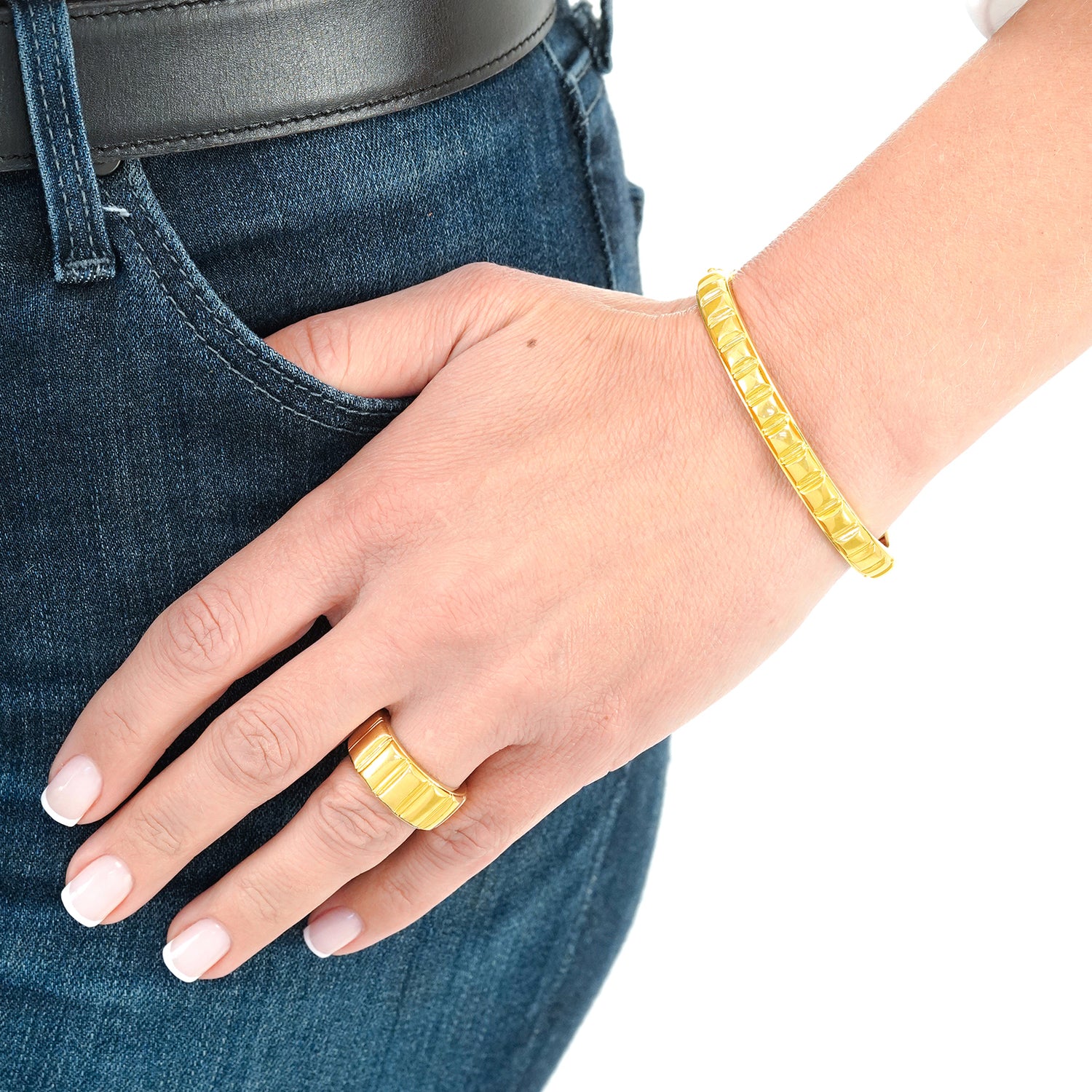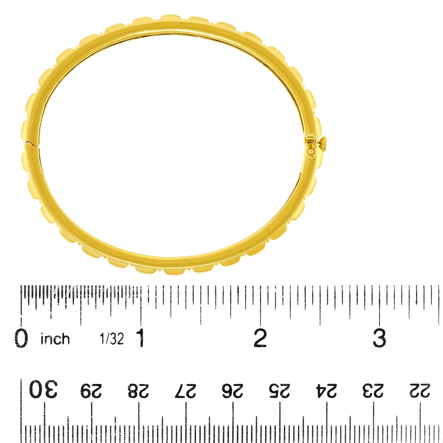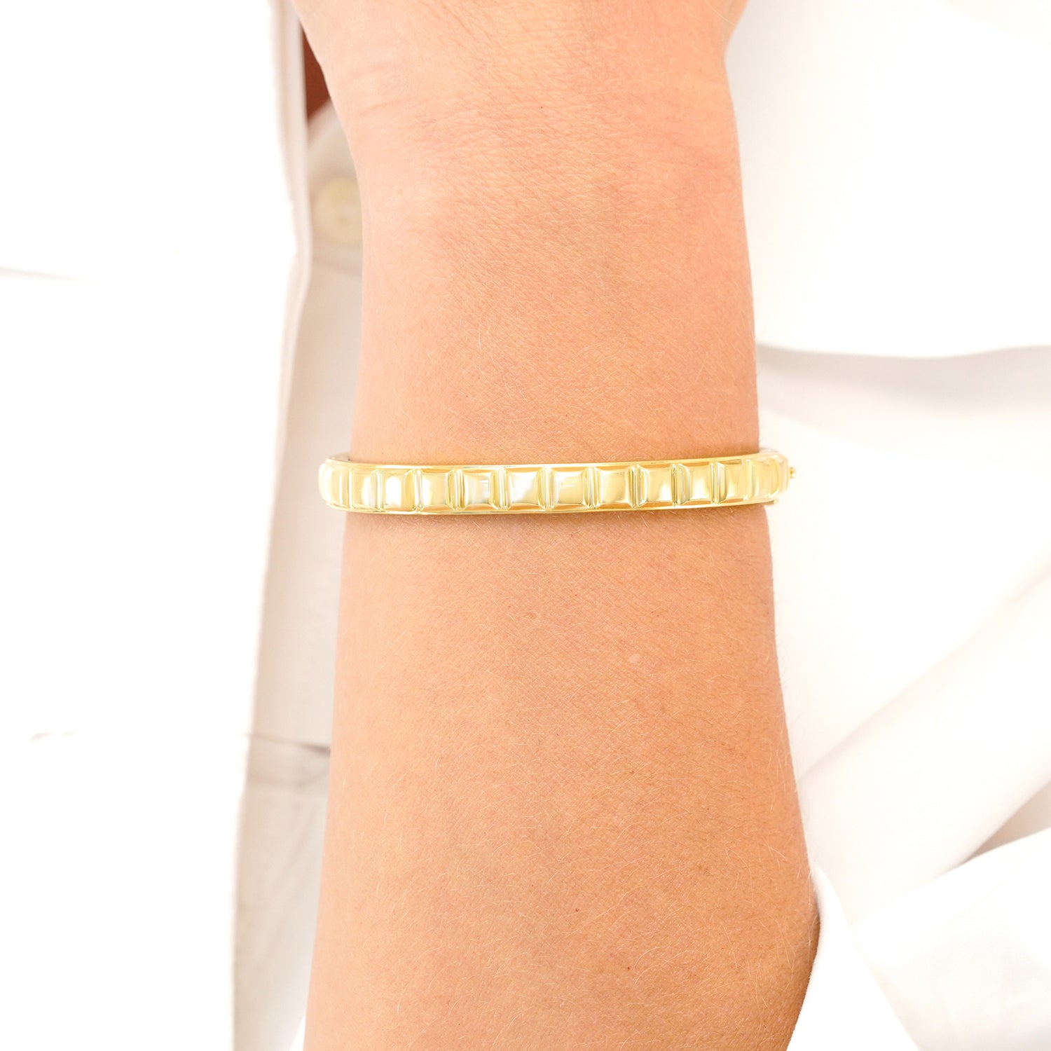 Circa 1970s, 18k, by Cartier, Paris, France. Simply gorgeous, this seventies chic Cartier bracelet easily dresses up for cocktails or is effortlessly casual with jeans and oversized sunglasses. Exquisitely made with the edgy design and superb quality that Cartier Paris is famous, it is in excellent condition. Noted; This bangle has a catch and is hinged for ease of wear.