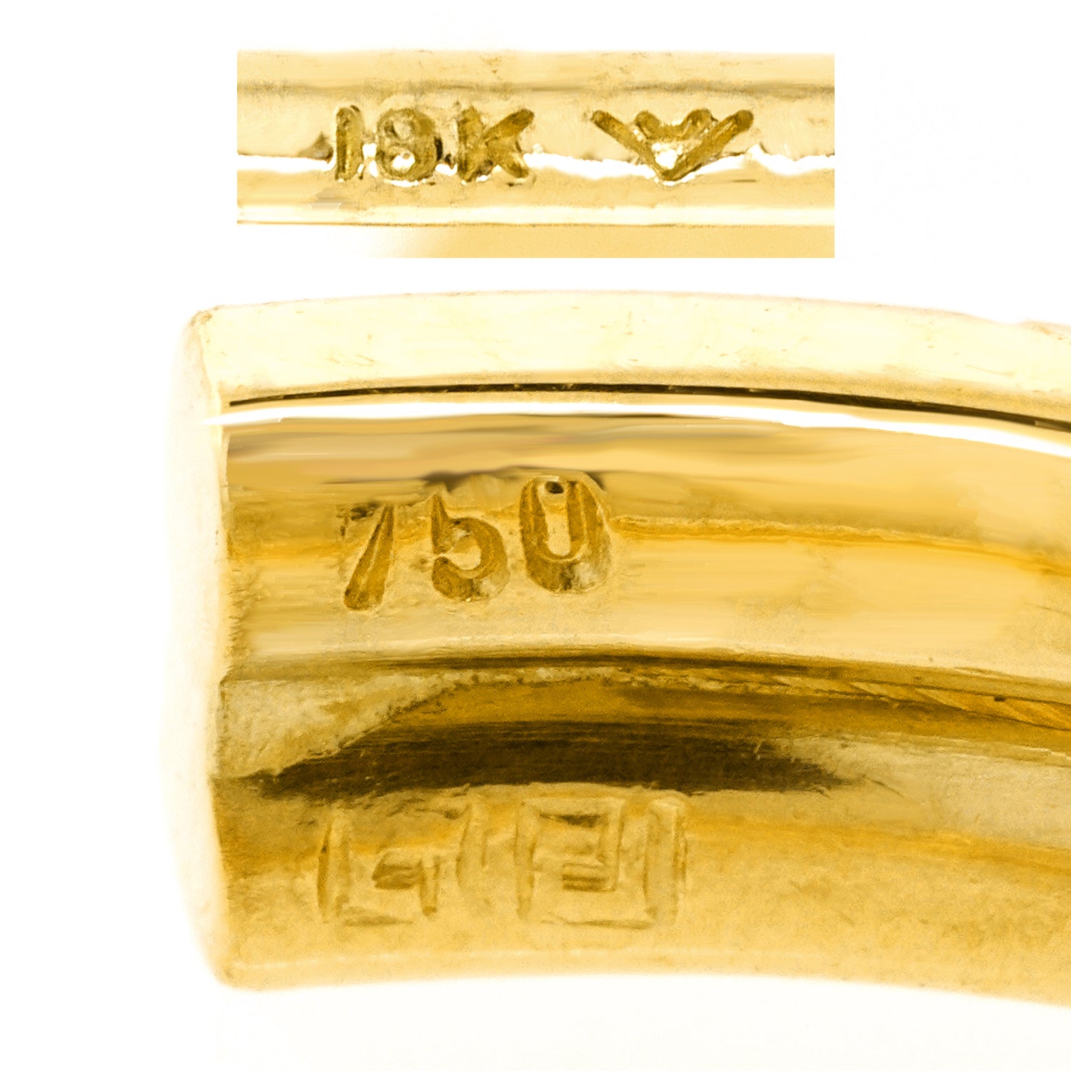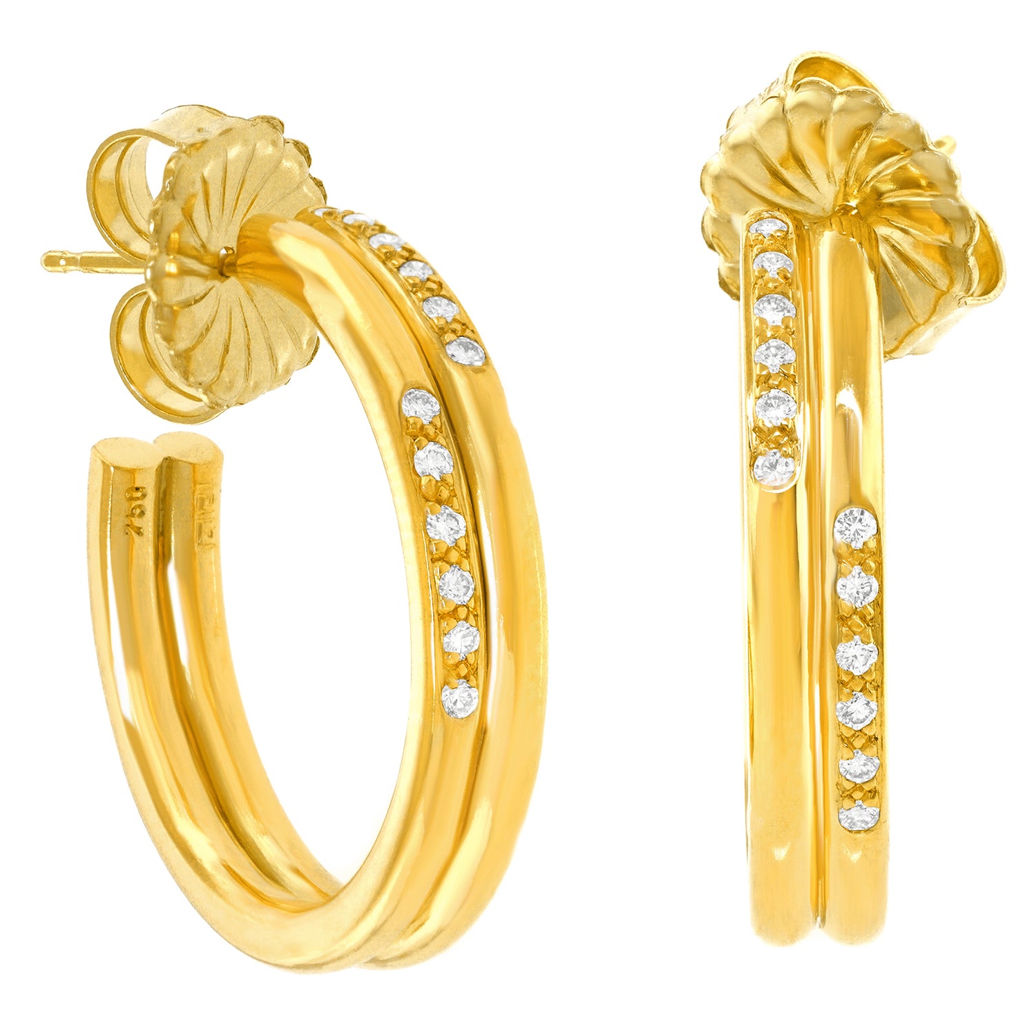 Circa 1970s, 18k, by Paul Binder, Zurich, Switzerland. The perfect modernist hoops by Zurich's master of the modern idiom. Set with .24 carats of brilliant white diamonds (G color, VS clarity), these earrings have it all, sleek design, sparkle, and élan. Not too big and not too small, they go easily from casual to cocktails. Binder quality and Zurich sophistication make their provocative visual narrative effortless. Excellent condition.