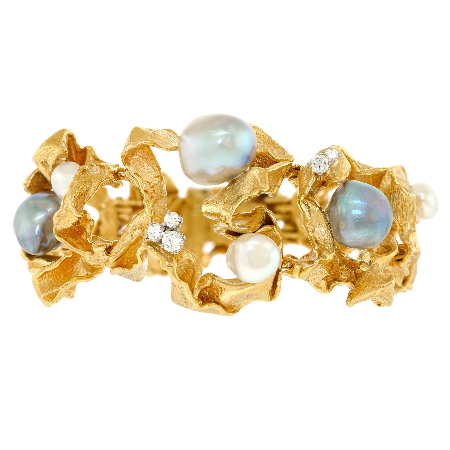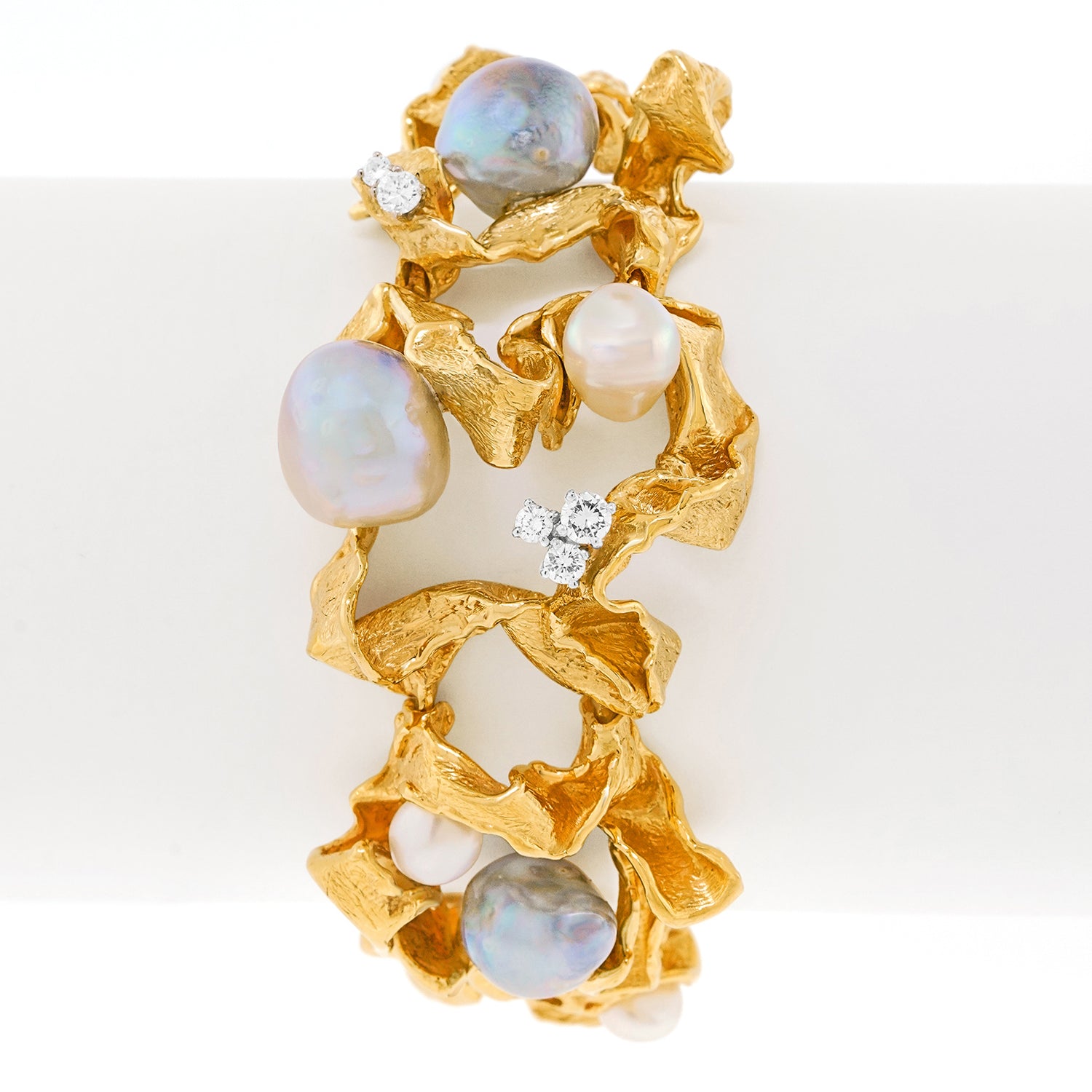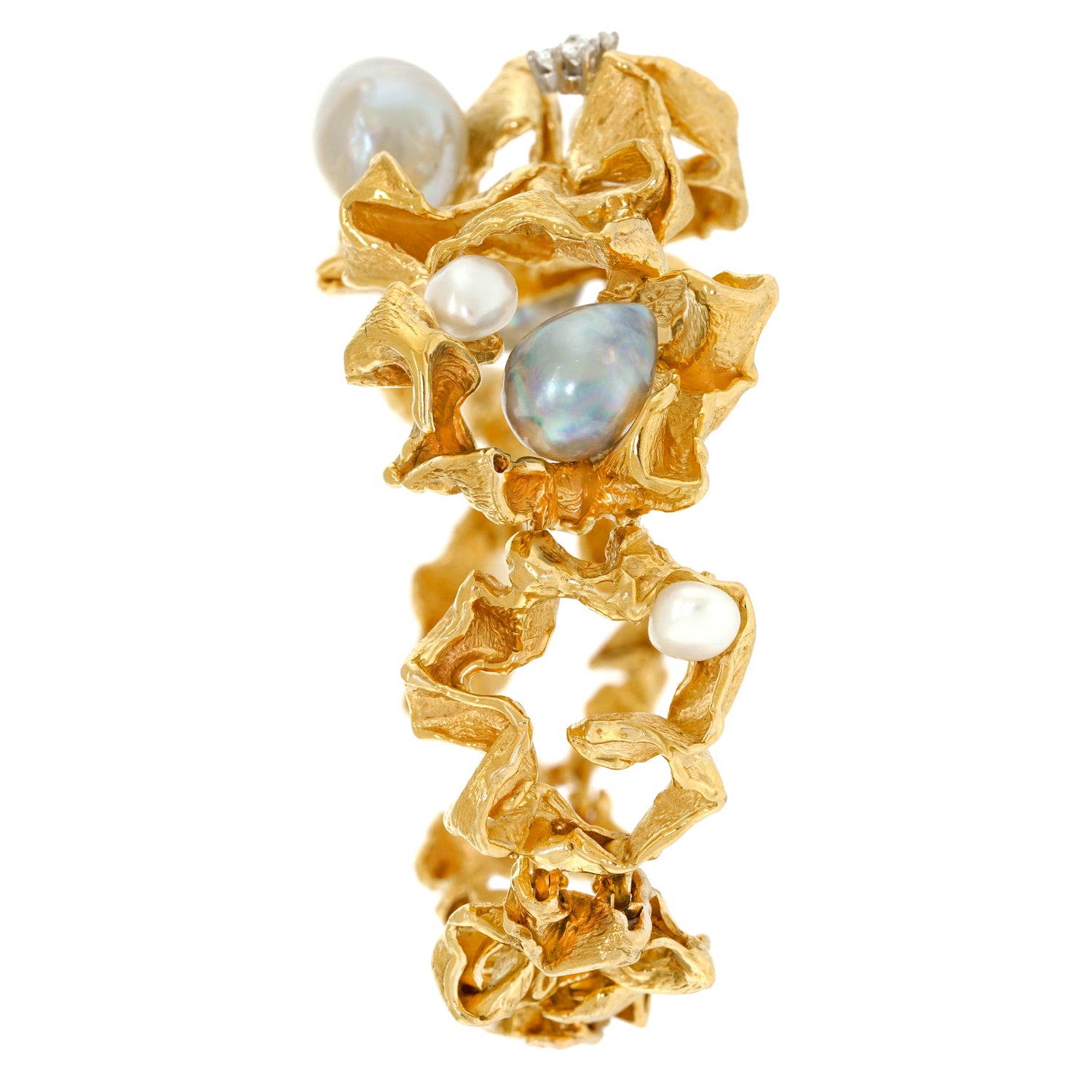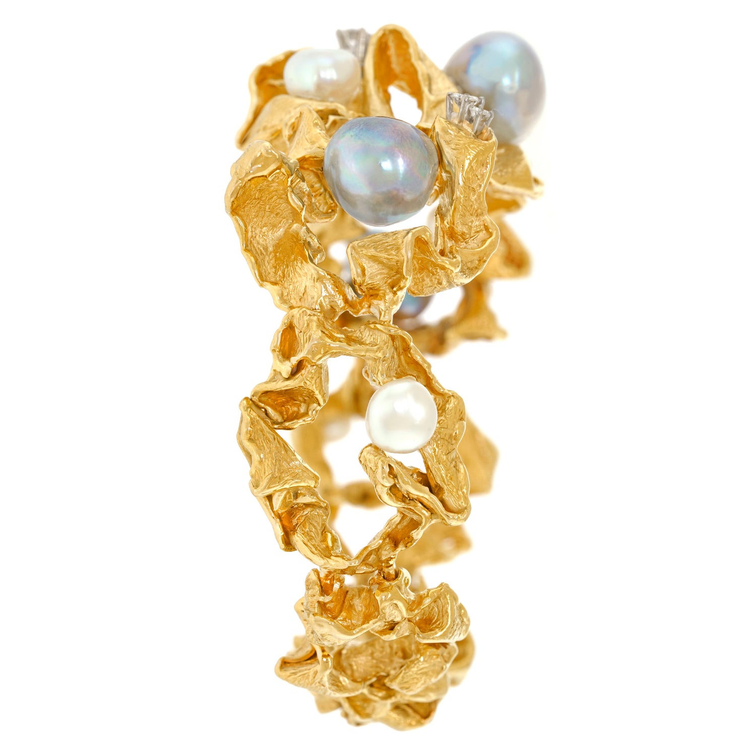 Circa 1980s, 18k, by Gilbert Albert, Genève, Switzerland. Sublime in abstraction, Gilbert Albert's pieces are miniature postmodern sculptures. Meticulously fabricated, every fold, texture, and color of this bracelet is part of an elegantly nuanced visual narrative. Set with lustrous South Sea pearls and .55 carats of fine white diamonds (G color, VS clarity), the look is wearable art to-go. Gilbert Albert's pieces are collected by connoisseurs and museums alike.