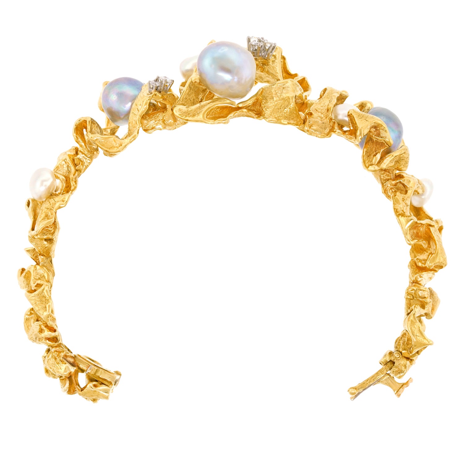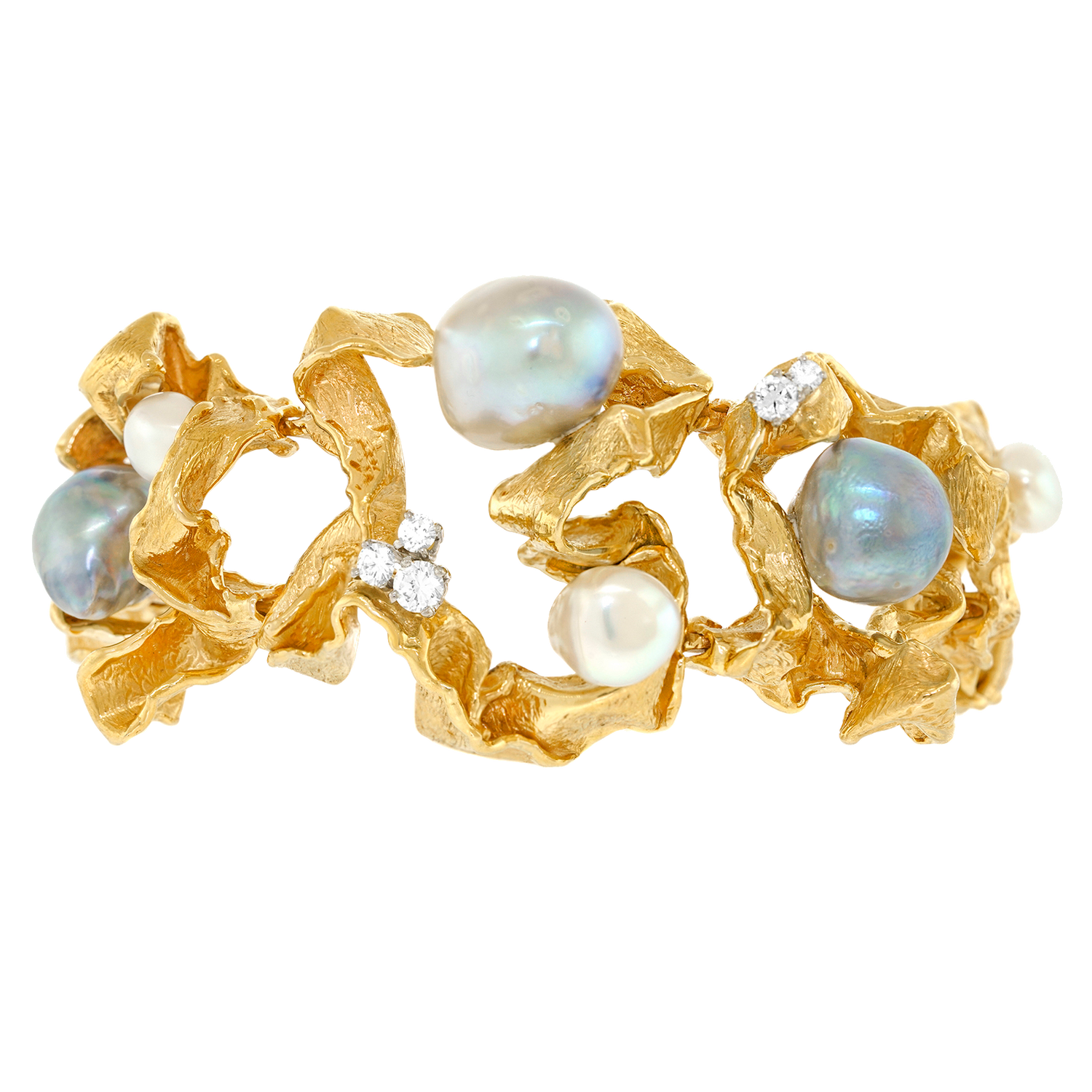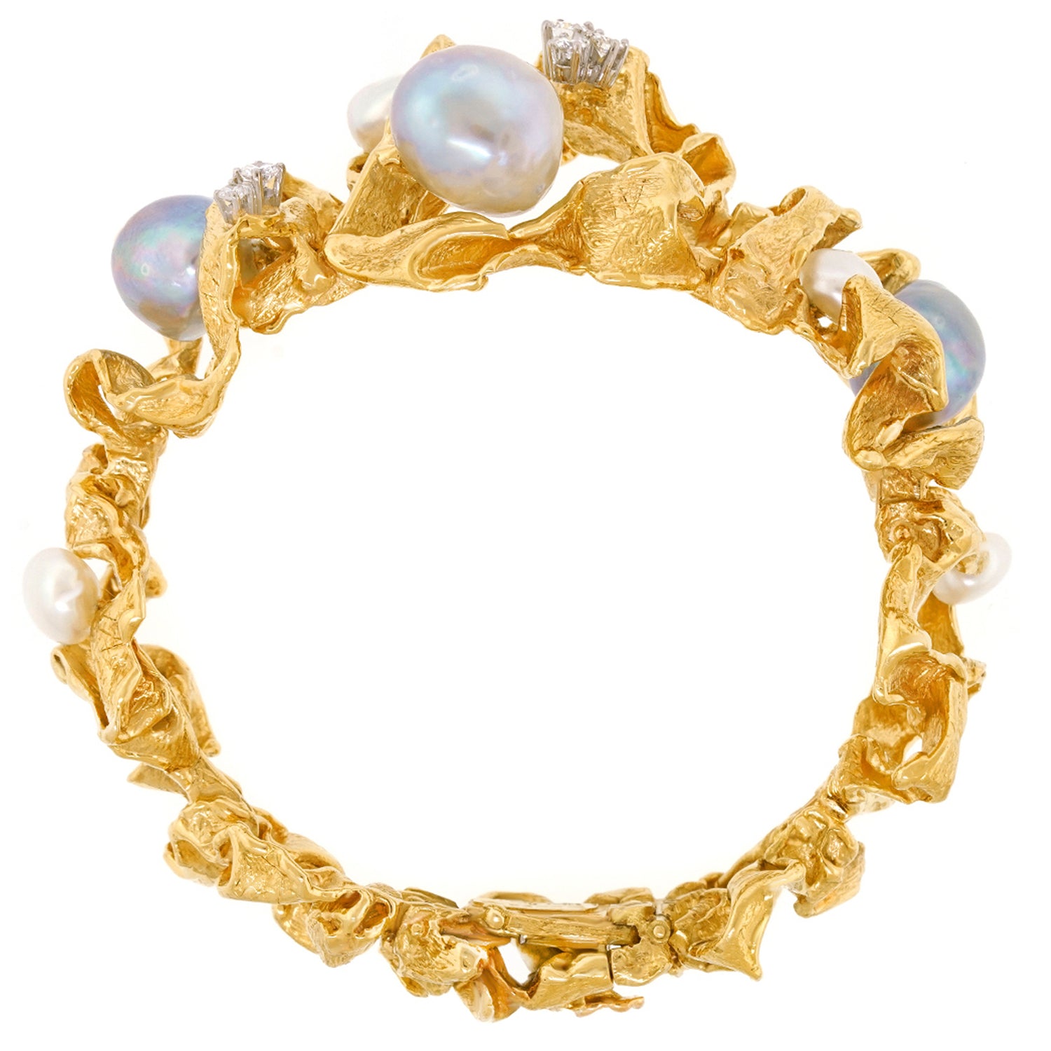 Circa 1980s, 18k, by Gilbert Albert, Genève, Switzerland. Sublime in abstraction, Gilbert Albert's pieces are miniature postmodern sculptures. Meticulously fabricated, every fold, texture, and color of this bracelet is part of an elegantly nuanced visual narrative. Set with lustrous South Sea pearls and .55 carats of fine white diamonds (G color, VS clarity), the look is wearable art to-go. Gilbert Albert's pieces are collected by connoisseurs and museums alike.