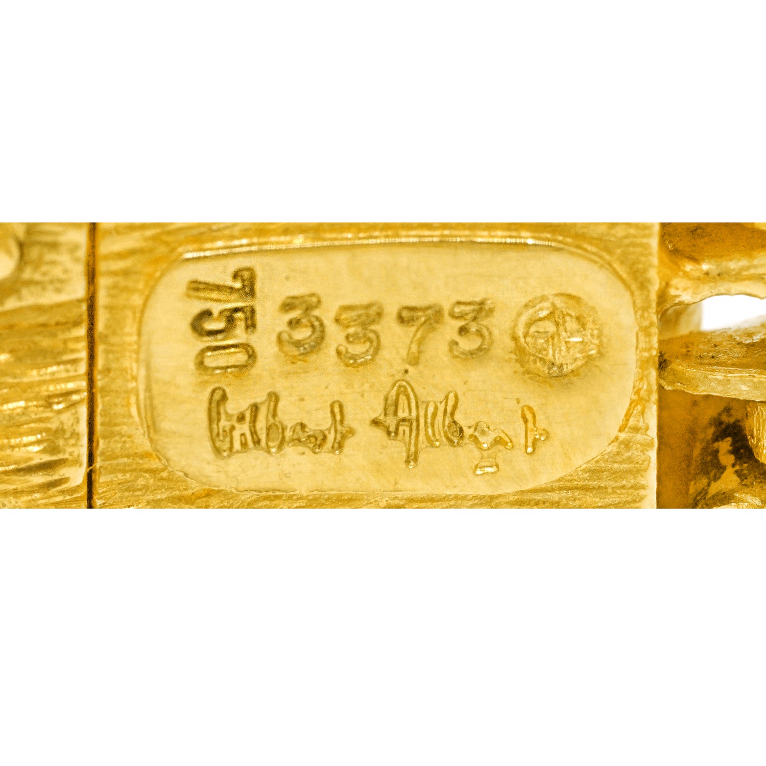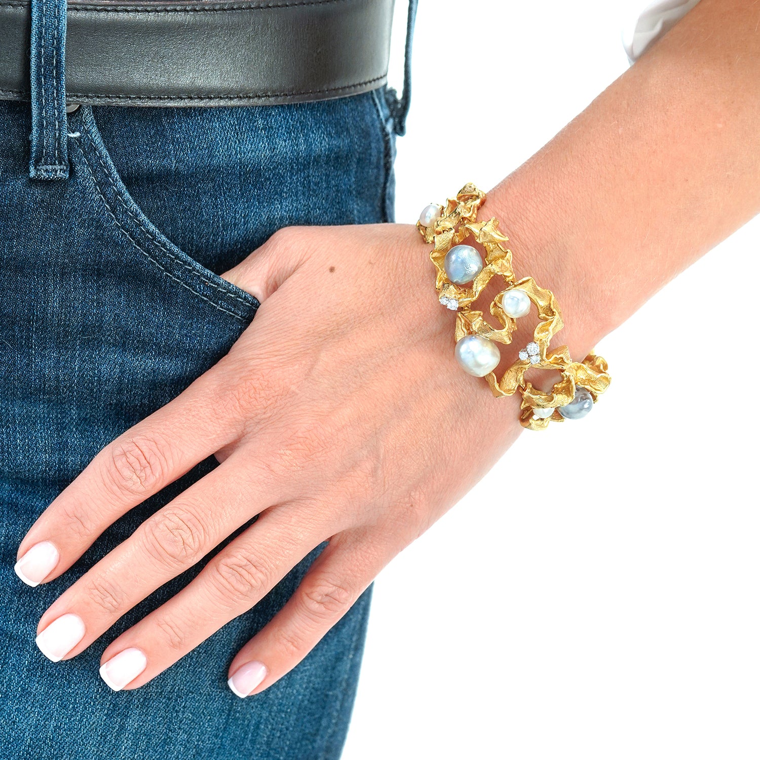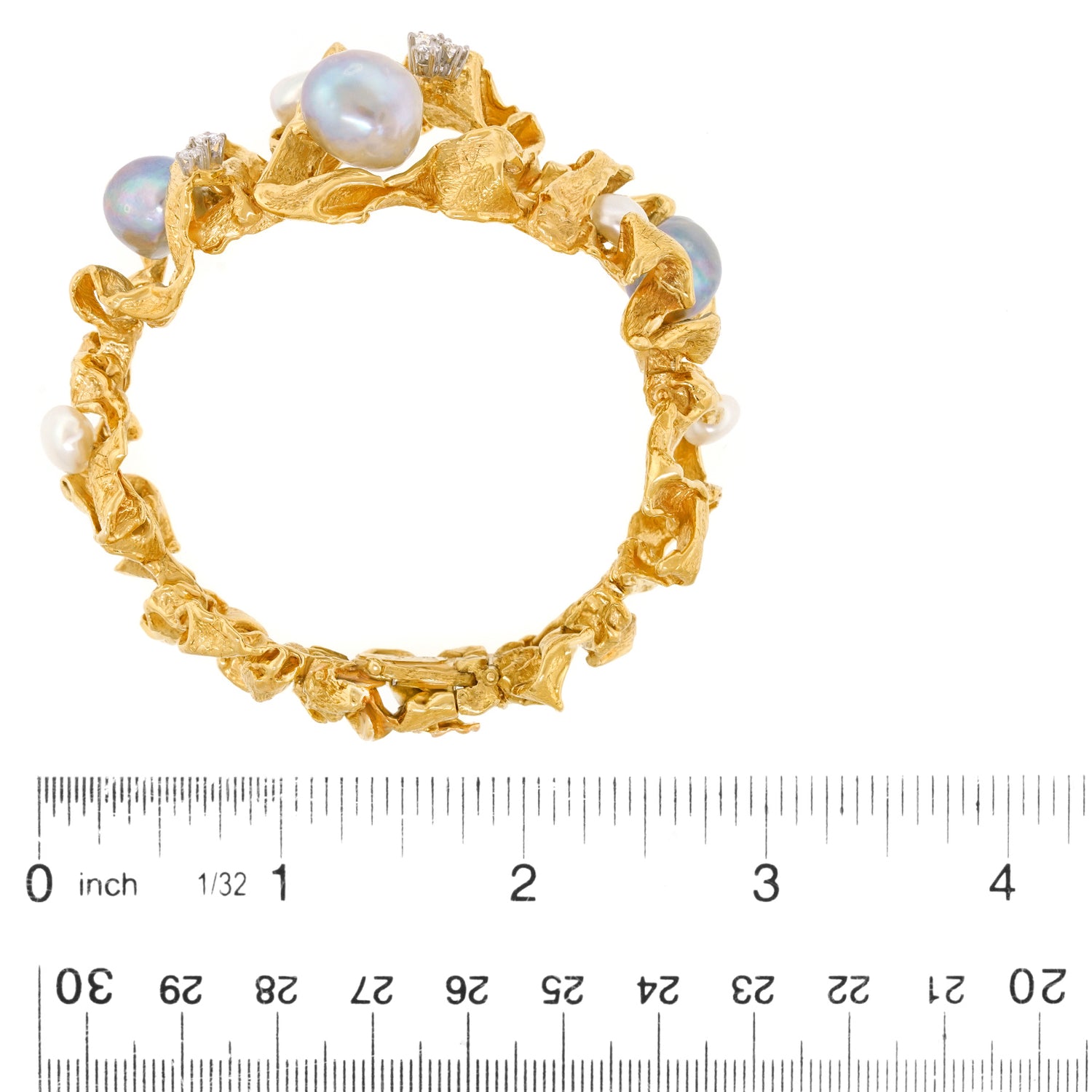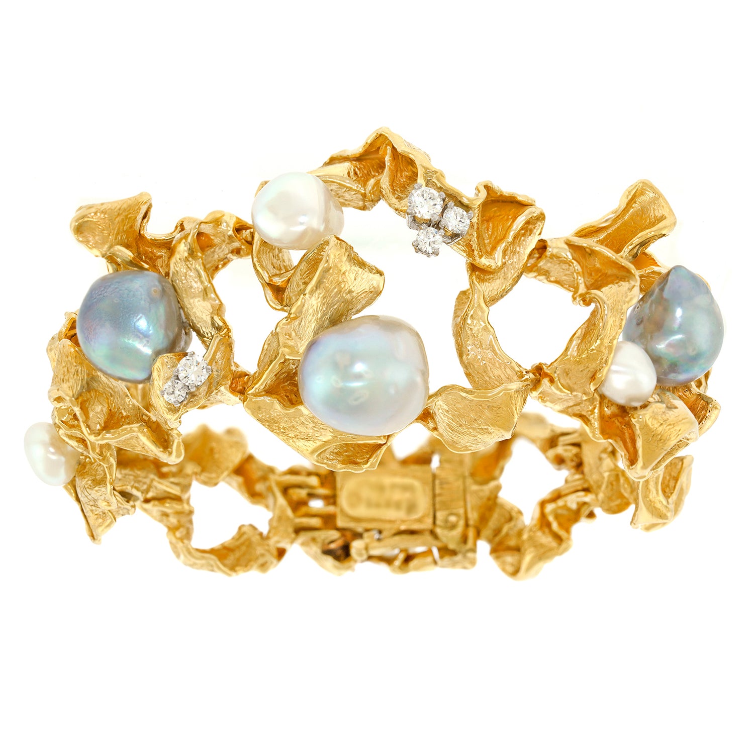 Circa 1980s, 18k, by Gilbert Albert, Genève, Switzerland. Sublime in abstraction, Gilbert Albert's pieces are miniature postmodern sculptures. Meticulously fabricated, every fold, texture, and color of this bracelet is part of an elegantly nuanced visual narrative. Set with lustrous South Sea pearls and .55 carats of fine white diamonds (G color, VS clarity), the look is wearable art to-go. Gilbert Albert's pieces are collected by connoisseurs and museums alike.
