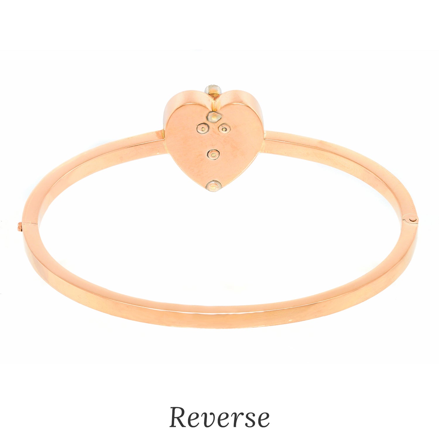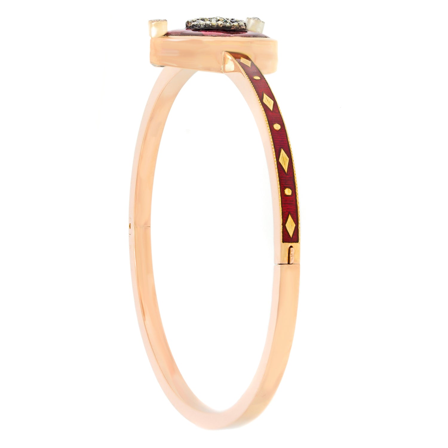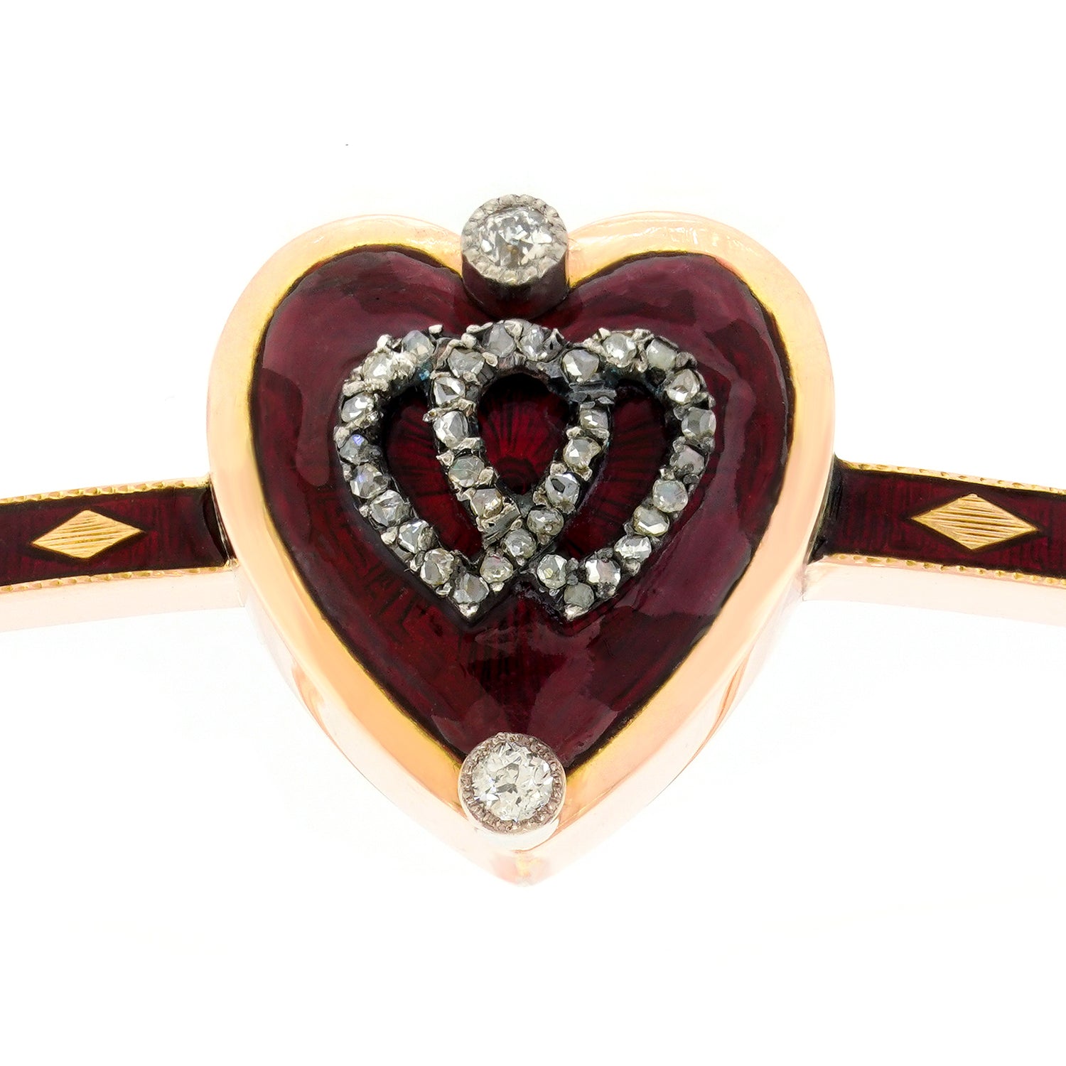 Circa 1860s, 14k. This gorgeous antique bangle bracelet is set with a delightful double heart. Featuring red enamel and set with diamonds, the look is Pow, wow...Now!!!... Victorian style. "I love your carriage, it looks so Gucci!" Timelessly charming, the look is forever romantic. Excellent condition.