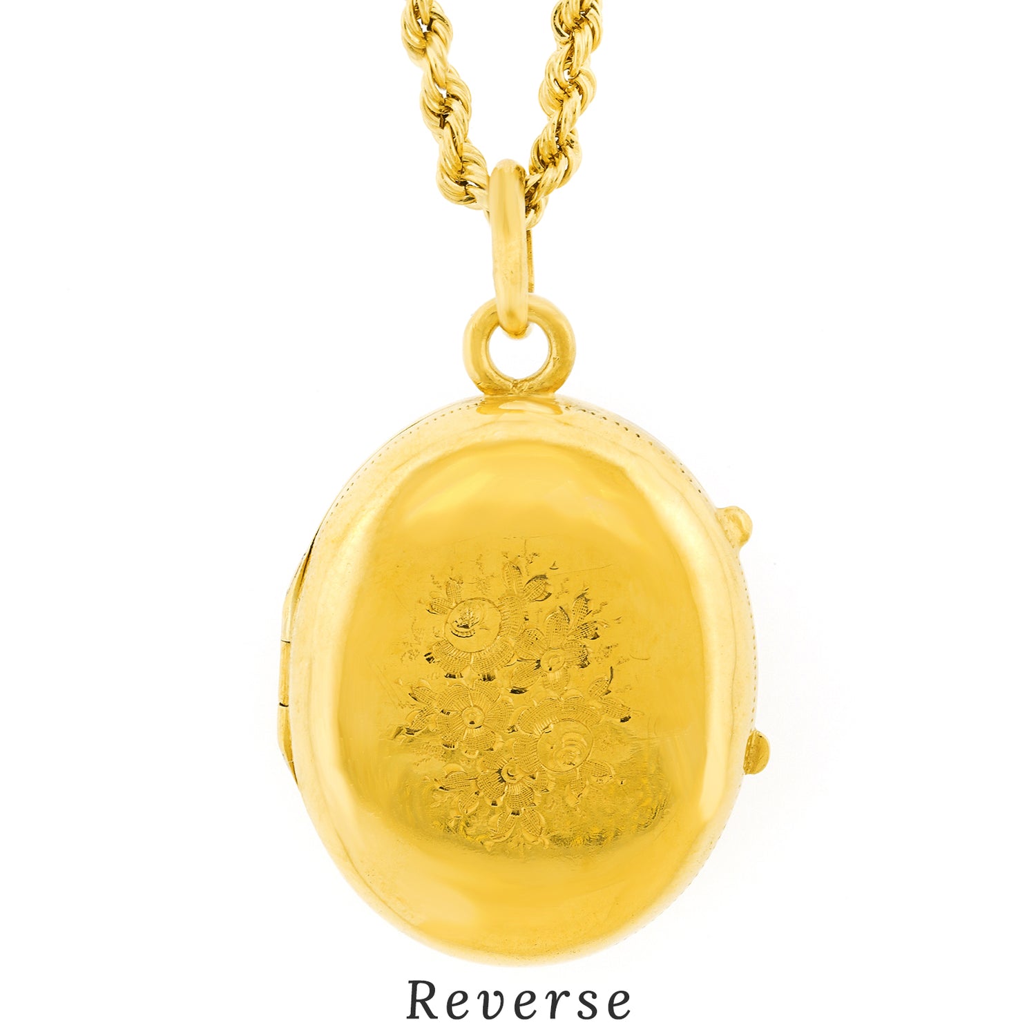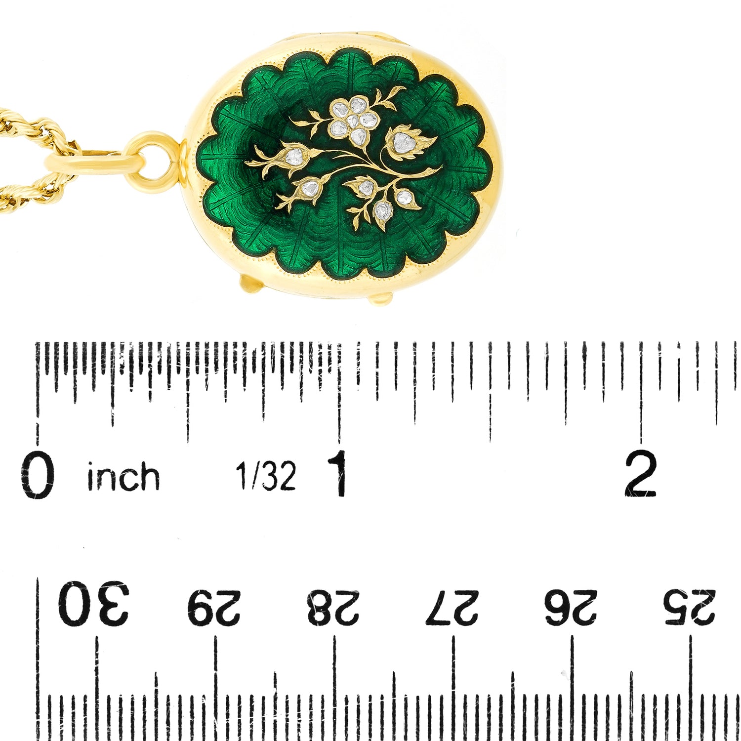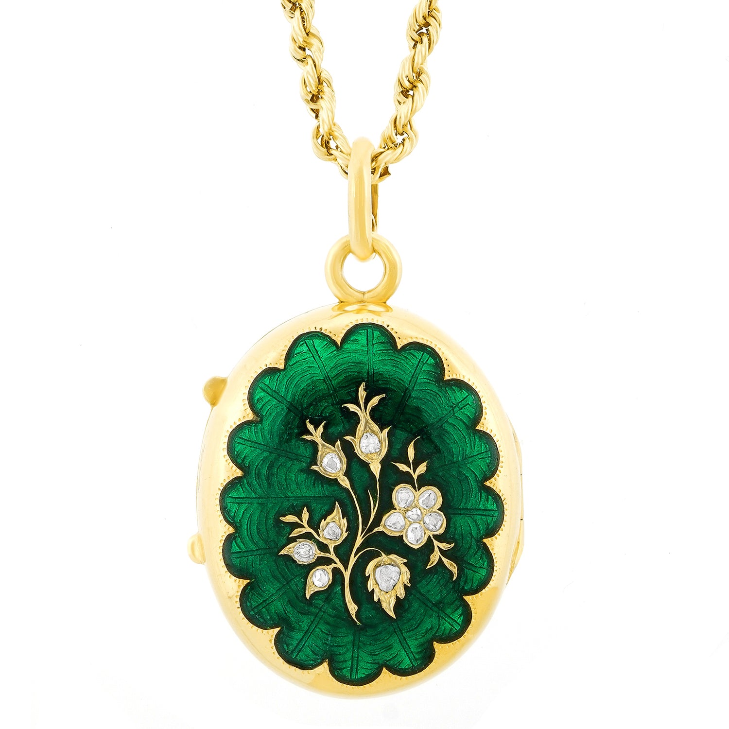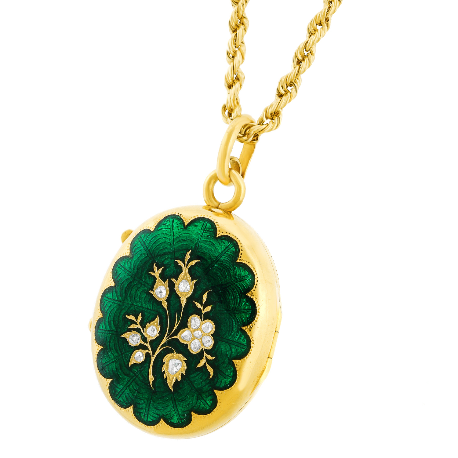 Circa 1870s, 14k. This gorgeous nineteenth-century locket is redolent with Victorian charm. Enameled in lush forest green and decorated with diamond-set and engraved flowers, the look is vintage chic at its antique best. The inside is as enchanting as the exterior; the two original hand-painted portraits are intact (your photographs can be easily added). Excellent condition.