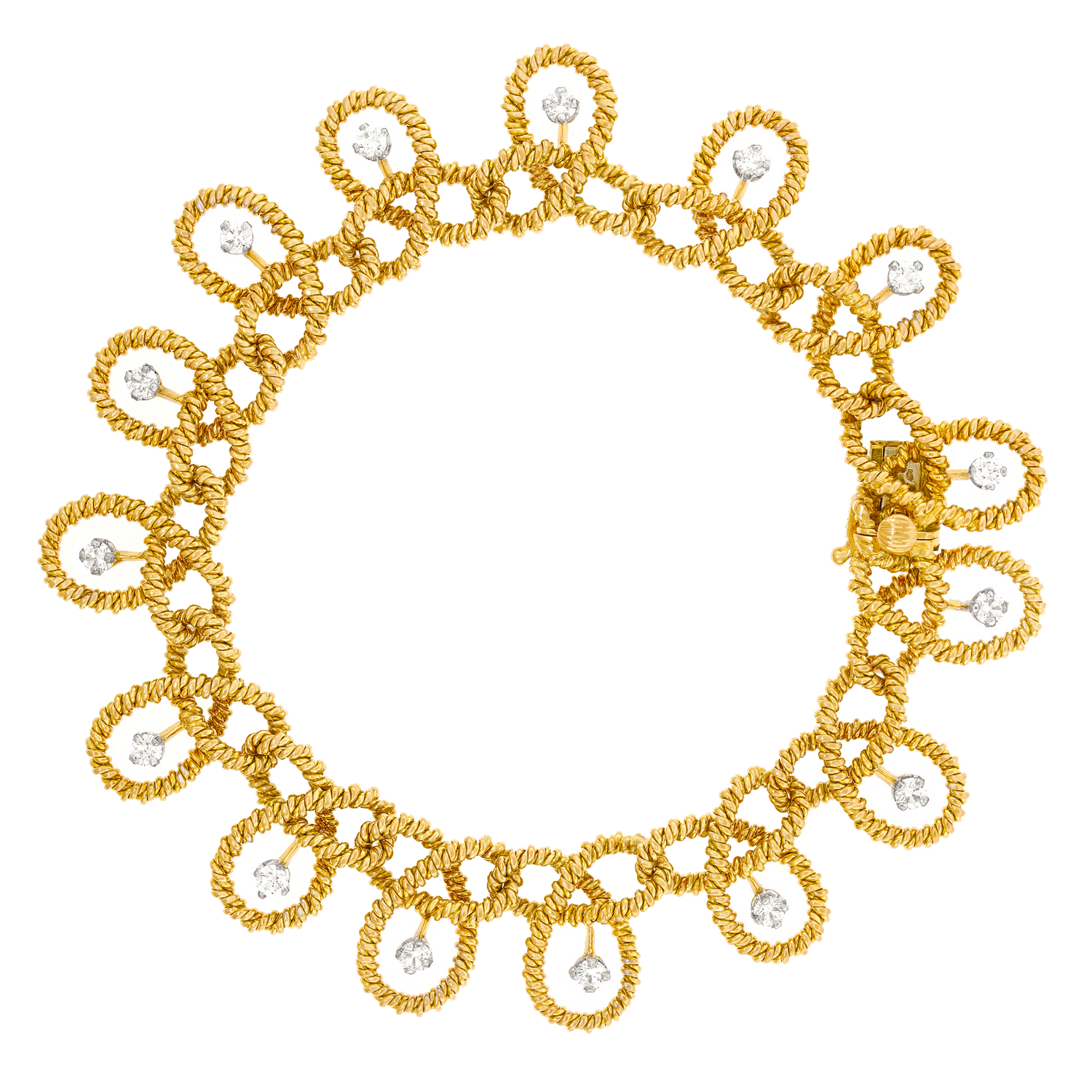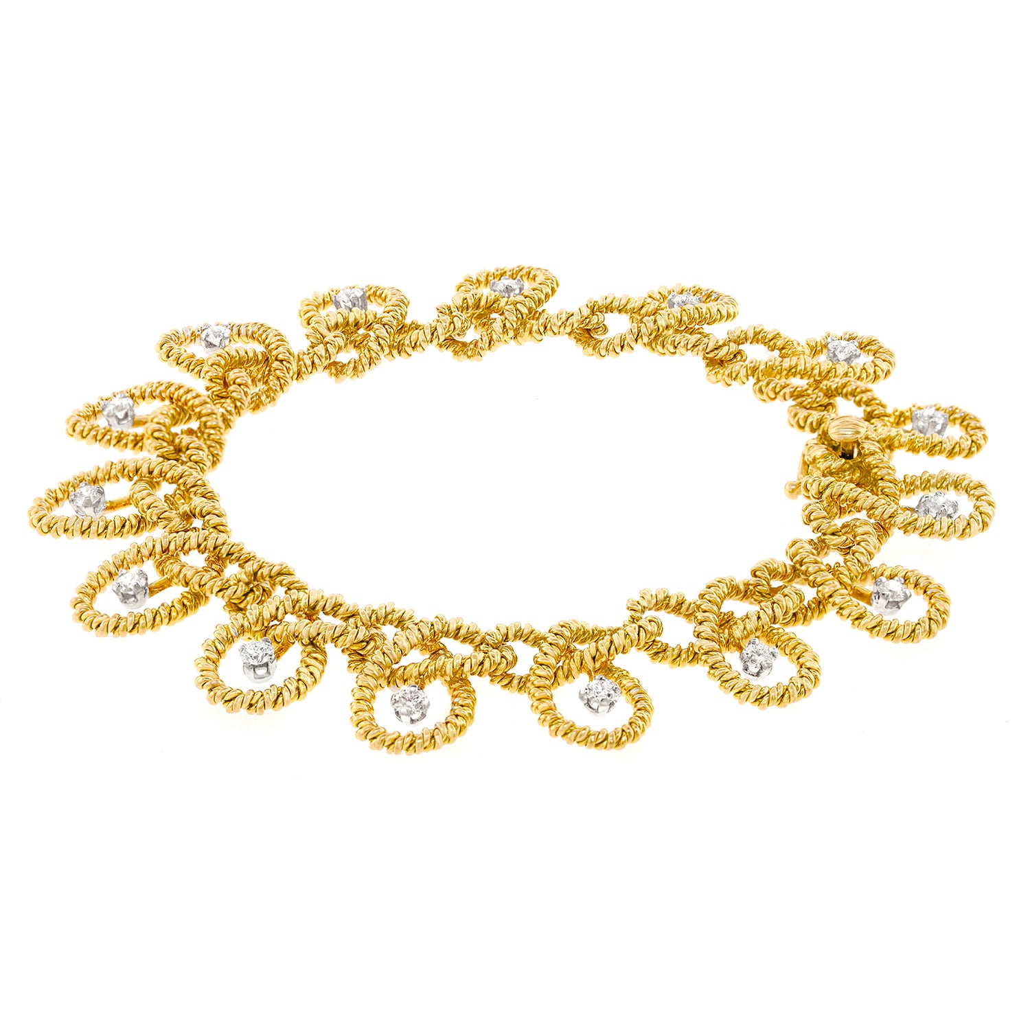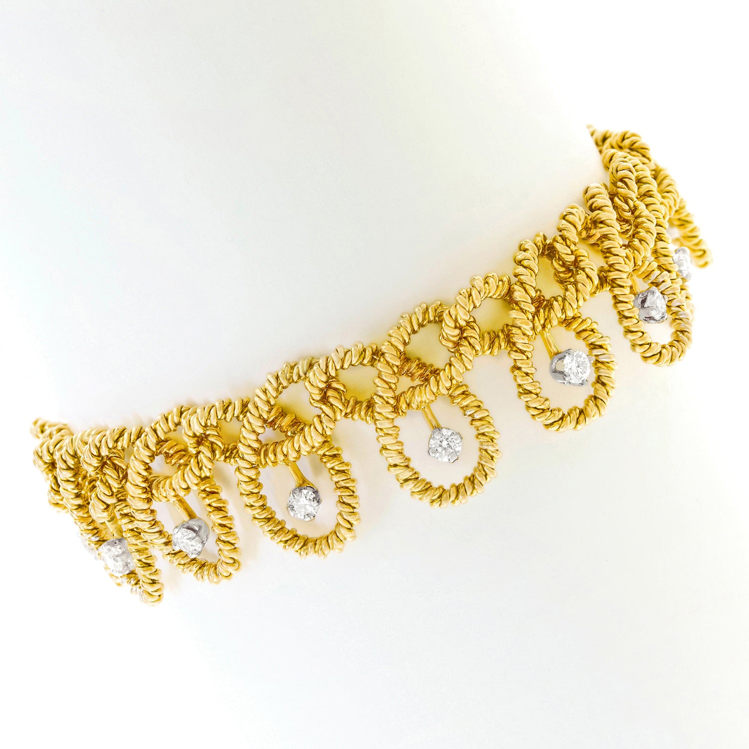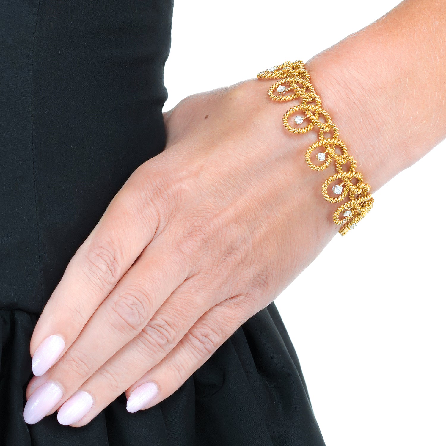 Circa 1960s, 18k, by Van Cleef & Arpels, France. This Van Cleef & Arpels bracelet is exquisite. Its compelling visual authority is the result of sublime design work underscored by meticulous fabrication. The articulate 18k yellow gold cable twist form is set with 1.50 carats of brilliant white diamonds (F color, VS clarity). Excellent condition.