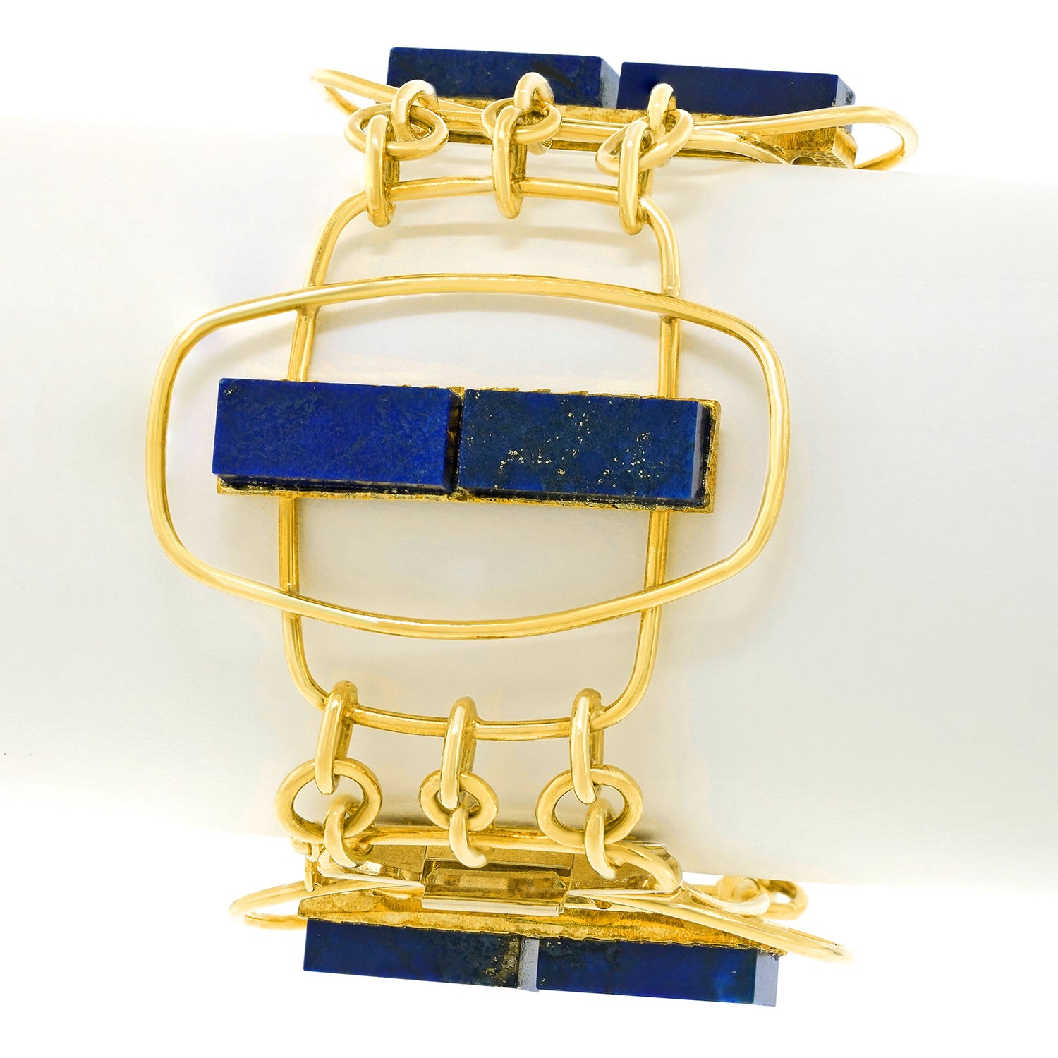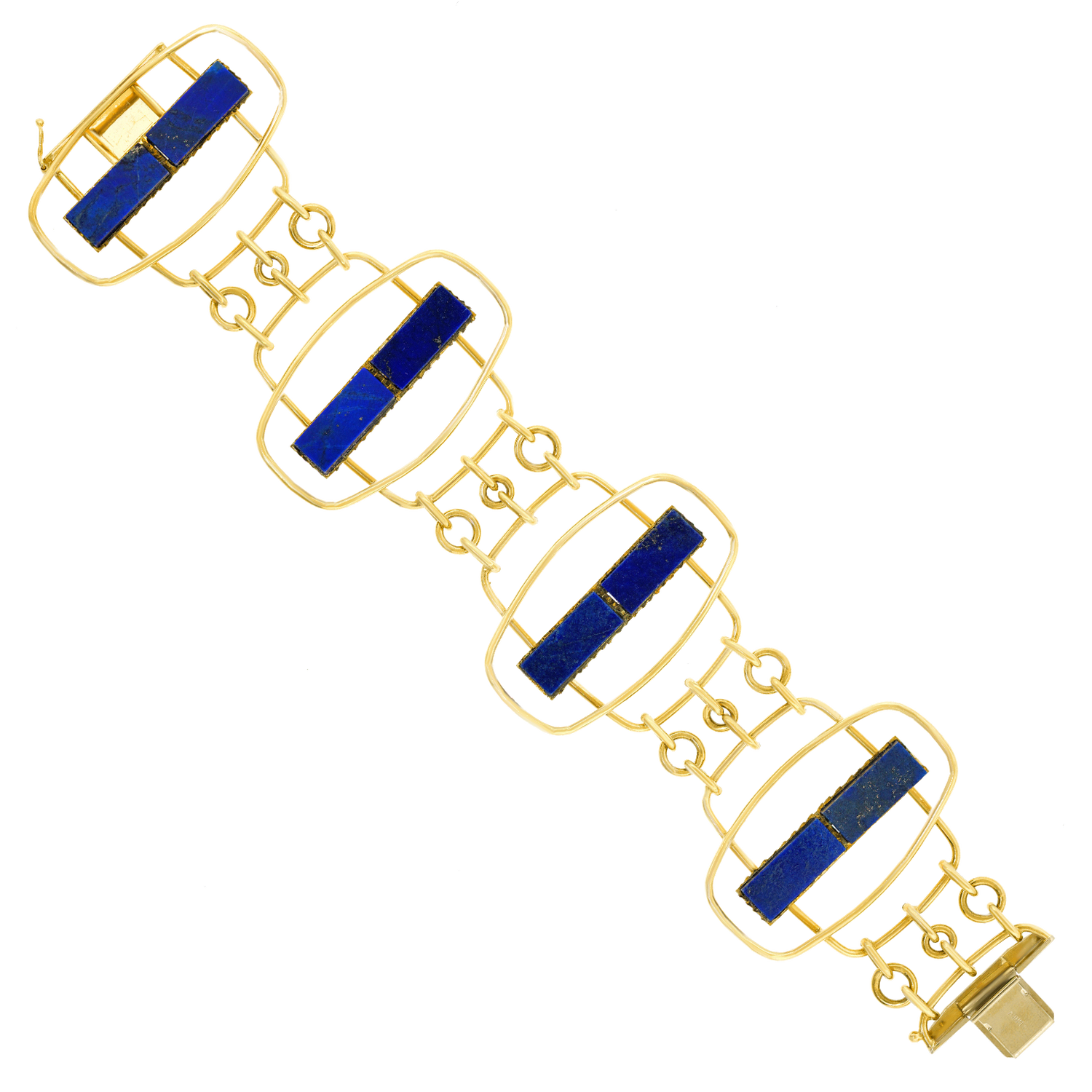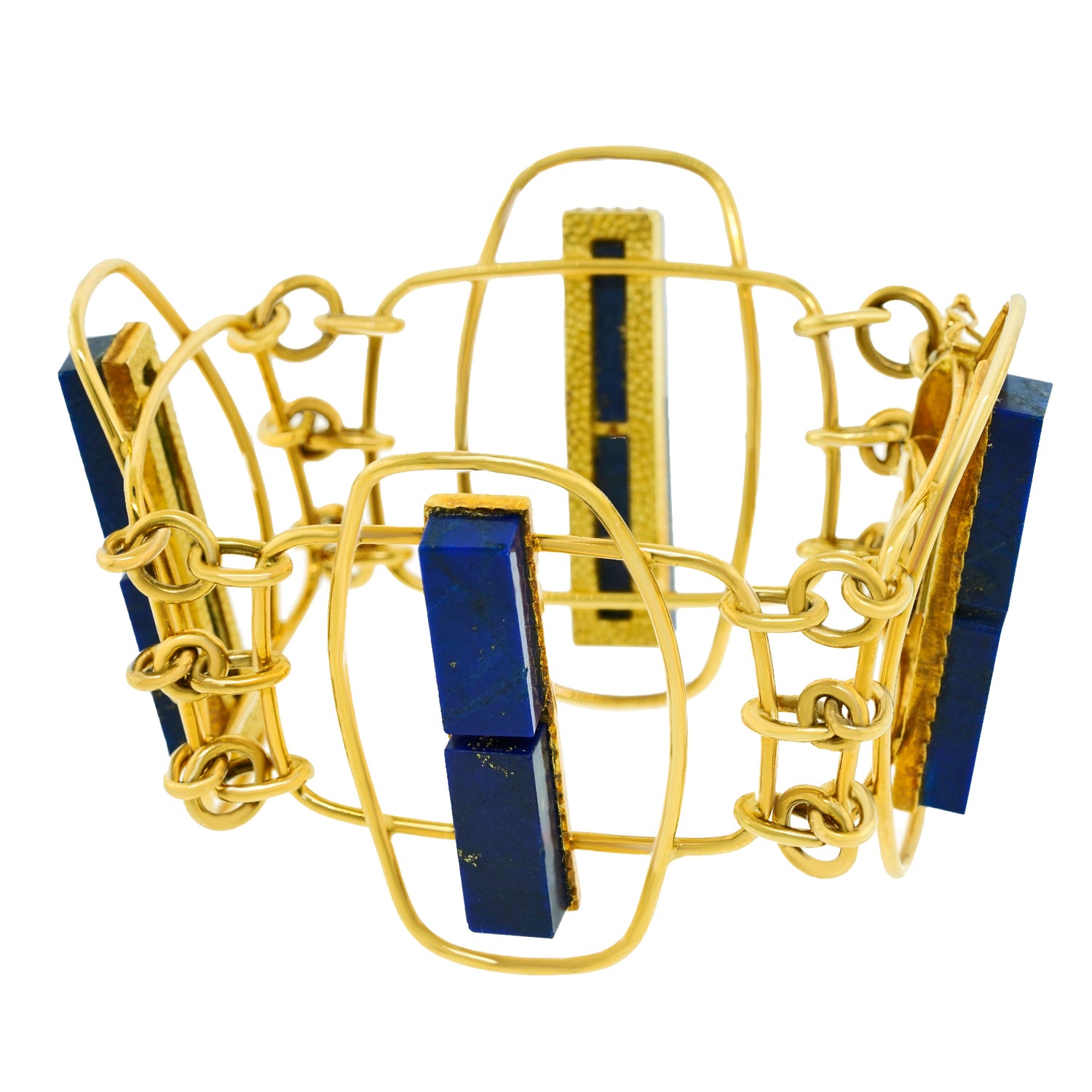 Circa 1960s, 18k, by UnoAerre, Italy. Hyper-modern, mod, sixties, spectacular … Set with lush blue lapis, this distinctively detailed Italian design masterpiece from UnoAerre effortlessly goes from the board walk to the boardroom. Superb quality in 18k yellow gold accented by lush blue lapis underscores the look. Excellent condition.