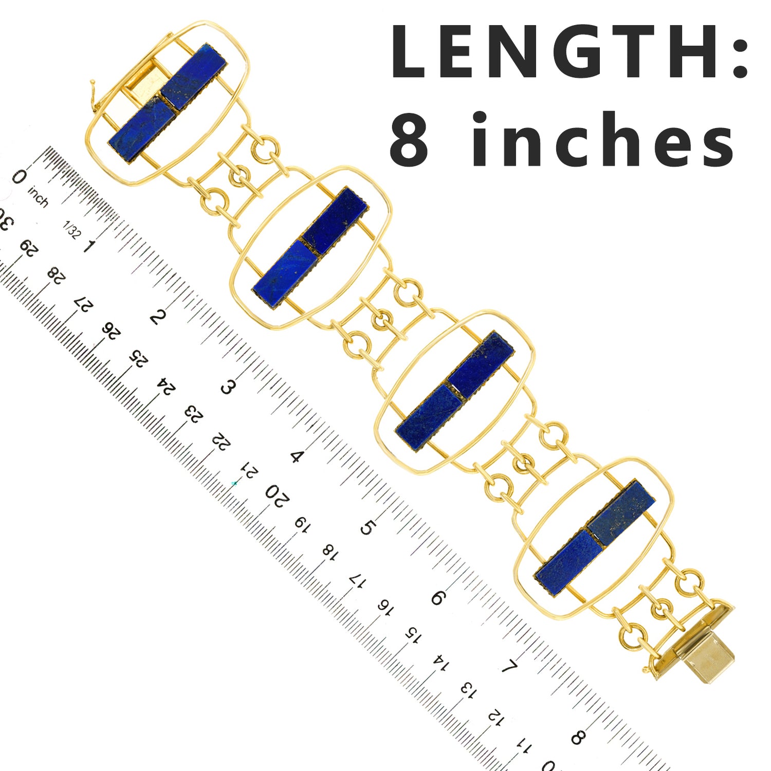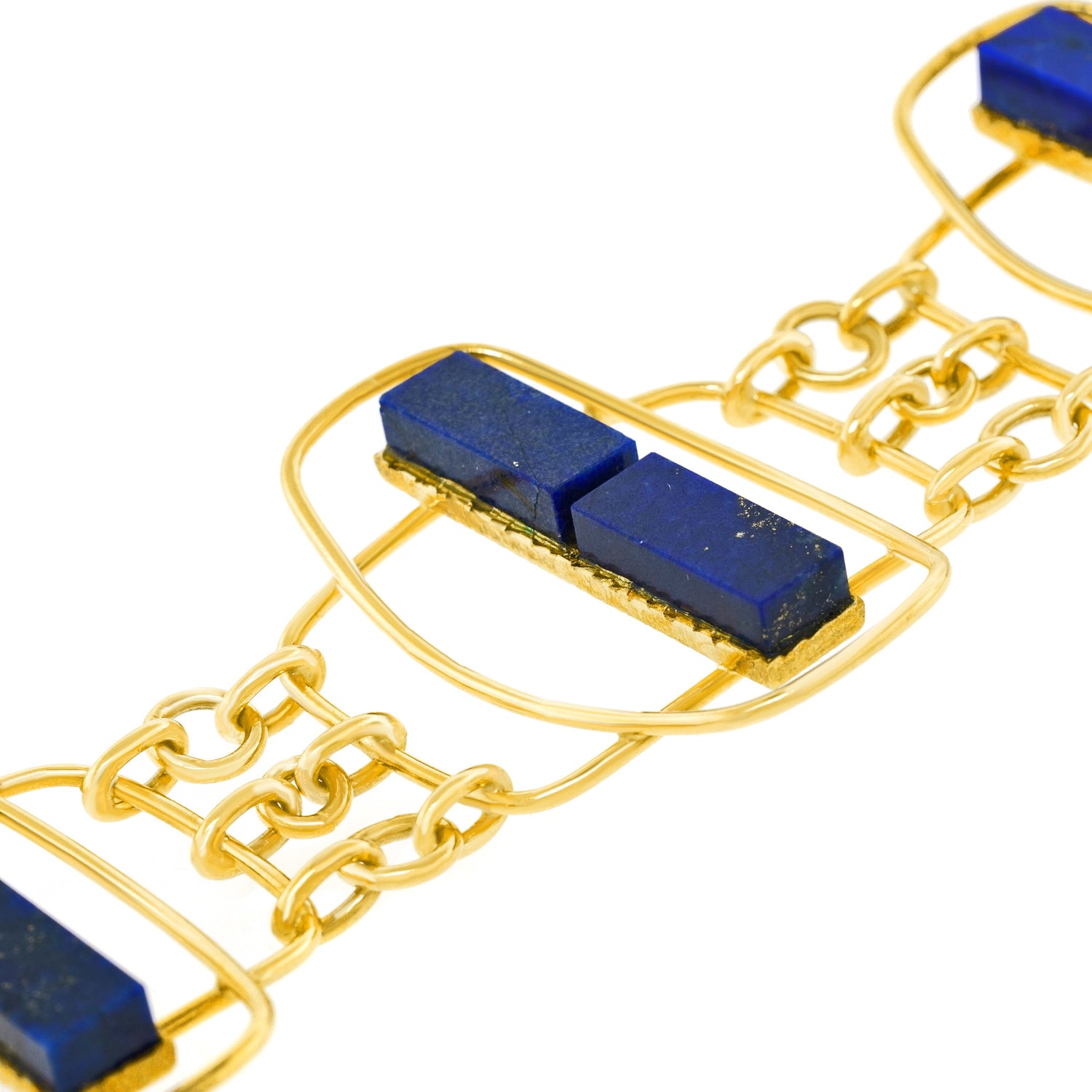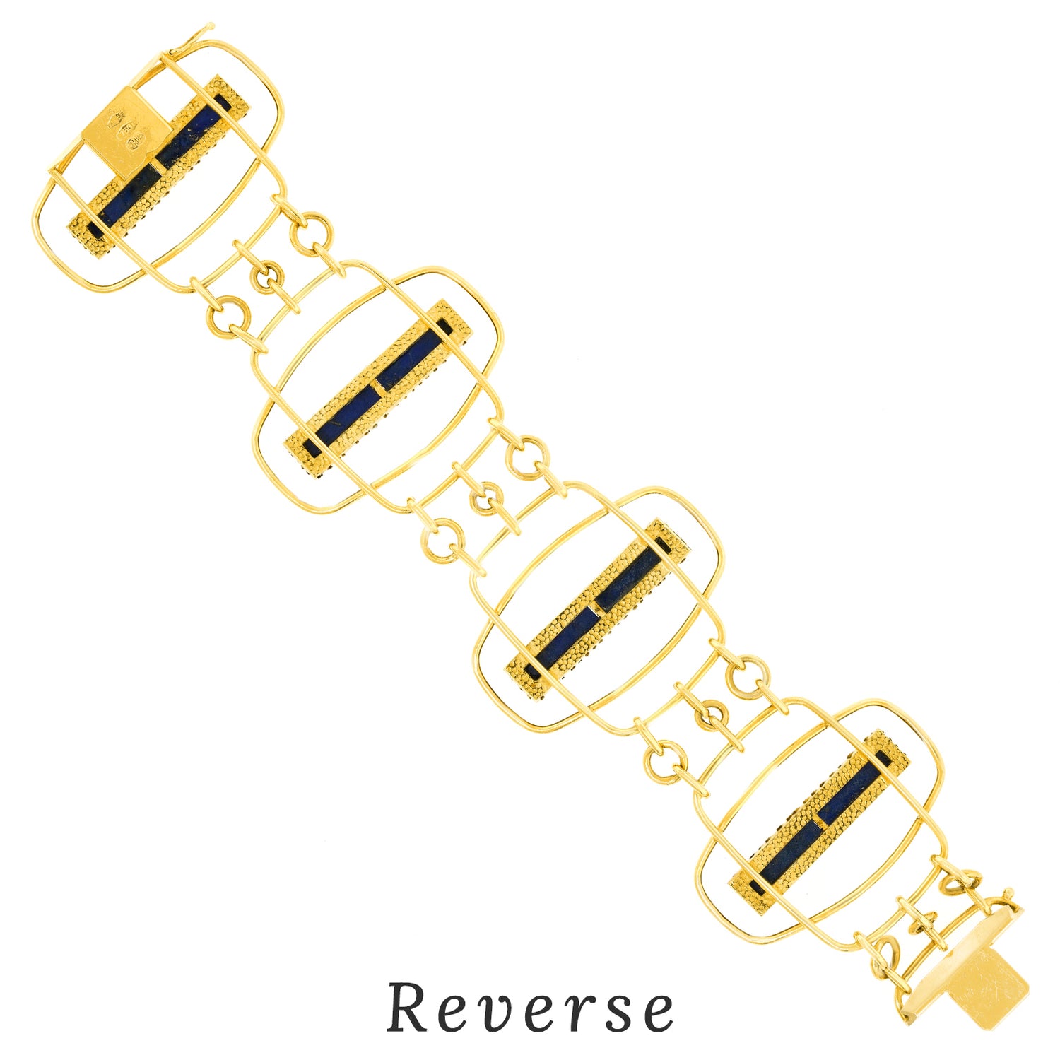 Circa 1960s, 18k, by UnoAerre, Italy. Hyper-modern, mod, sixties, spectacular … Set with lush blue lapis, this distinctively detailed Italian design masterpiece from UnoAerre effortlessly goes from the board walk to the boardroom. Superb quality in 18k yellow gold accented by lush blue lapis underscores the look. Excellent condition.