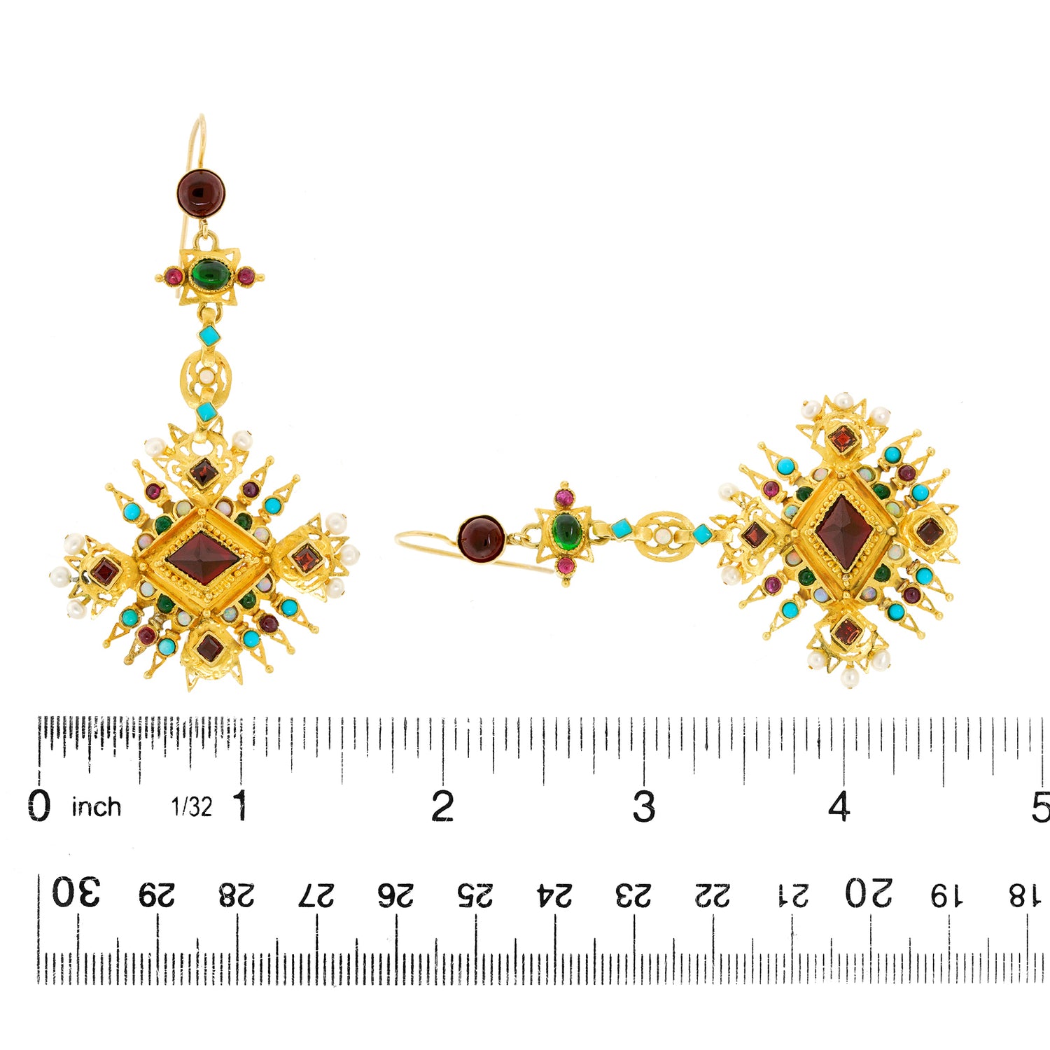 Circa 2000s, 18k, by Neil Lane, American. At almost 3 inches long, these colorful Neil Lane earrings stylishly redefine the term "Chandelier". Fantastically Renaissance-inspired, they are a colorful fashion carnival of chic, with notes of Chanel's Medieval Revival style. Made in 18k yellow gold, they are in excellent condition.