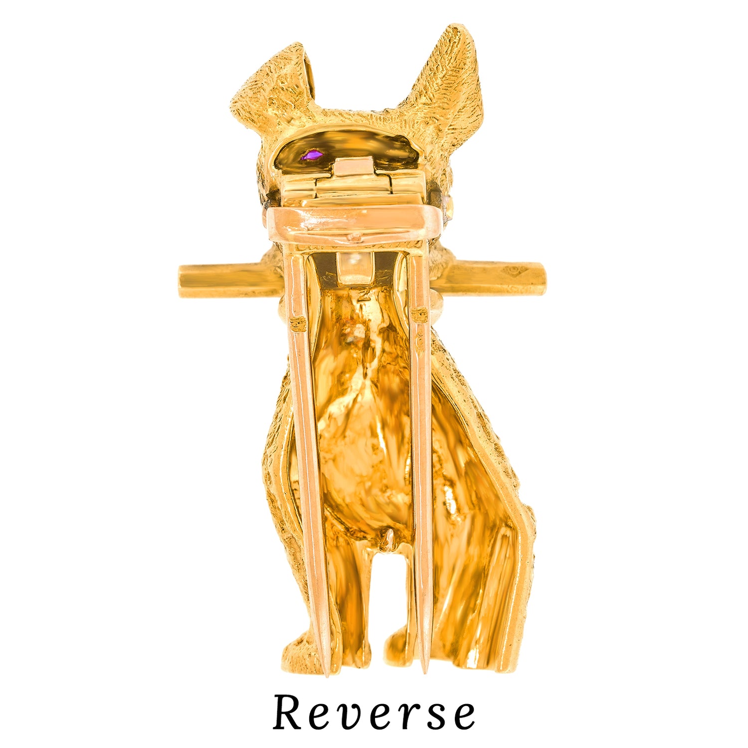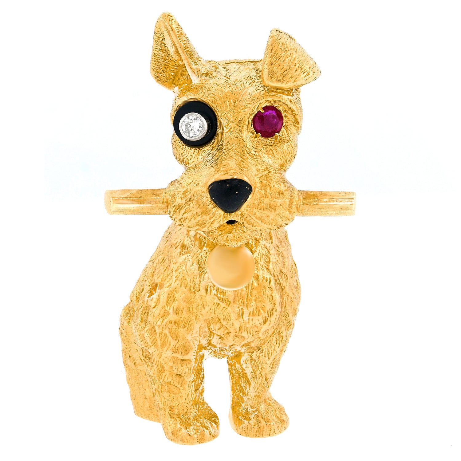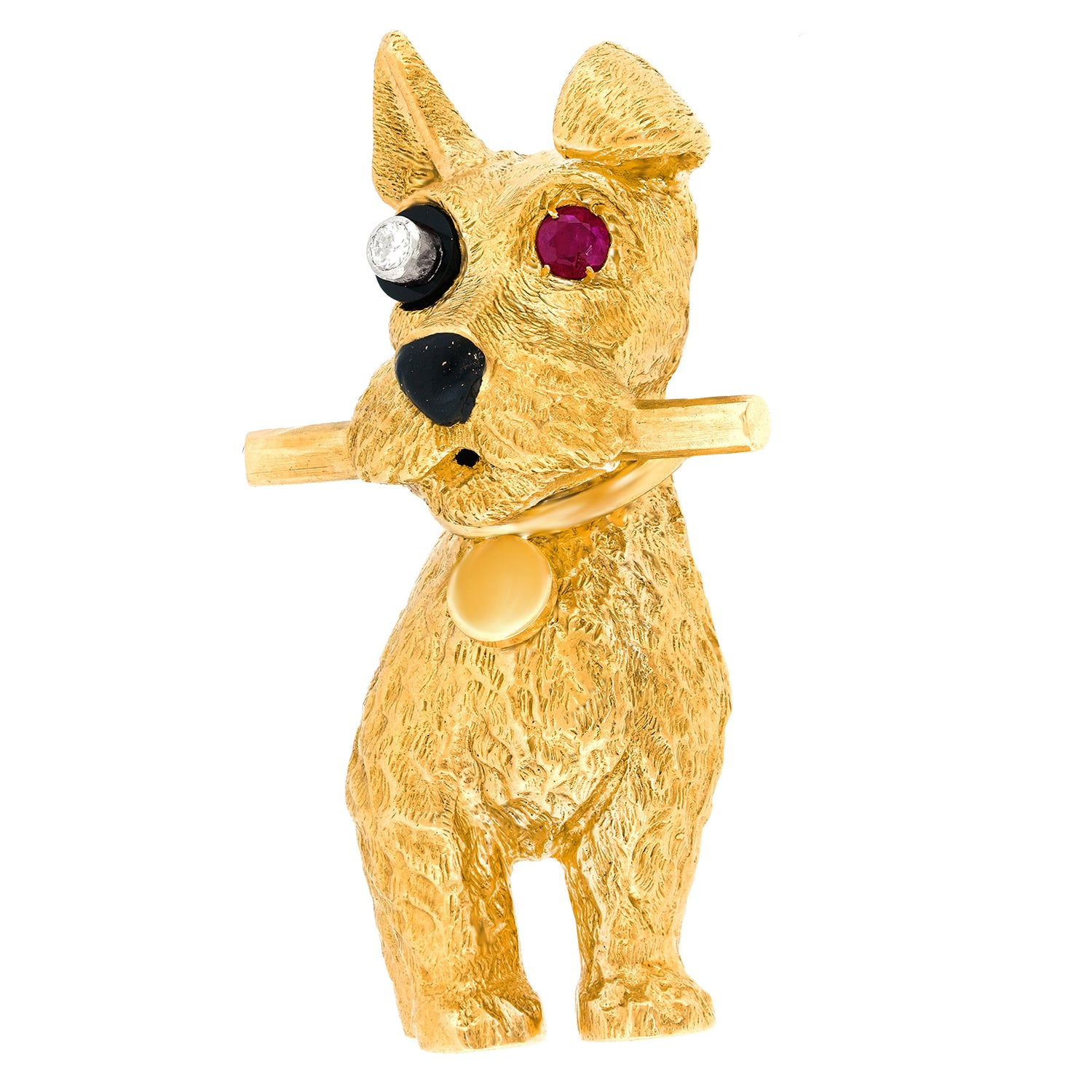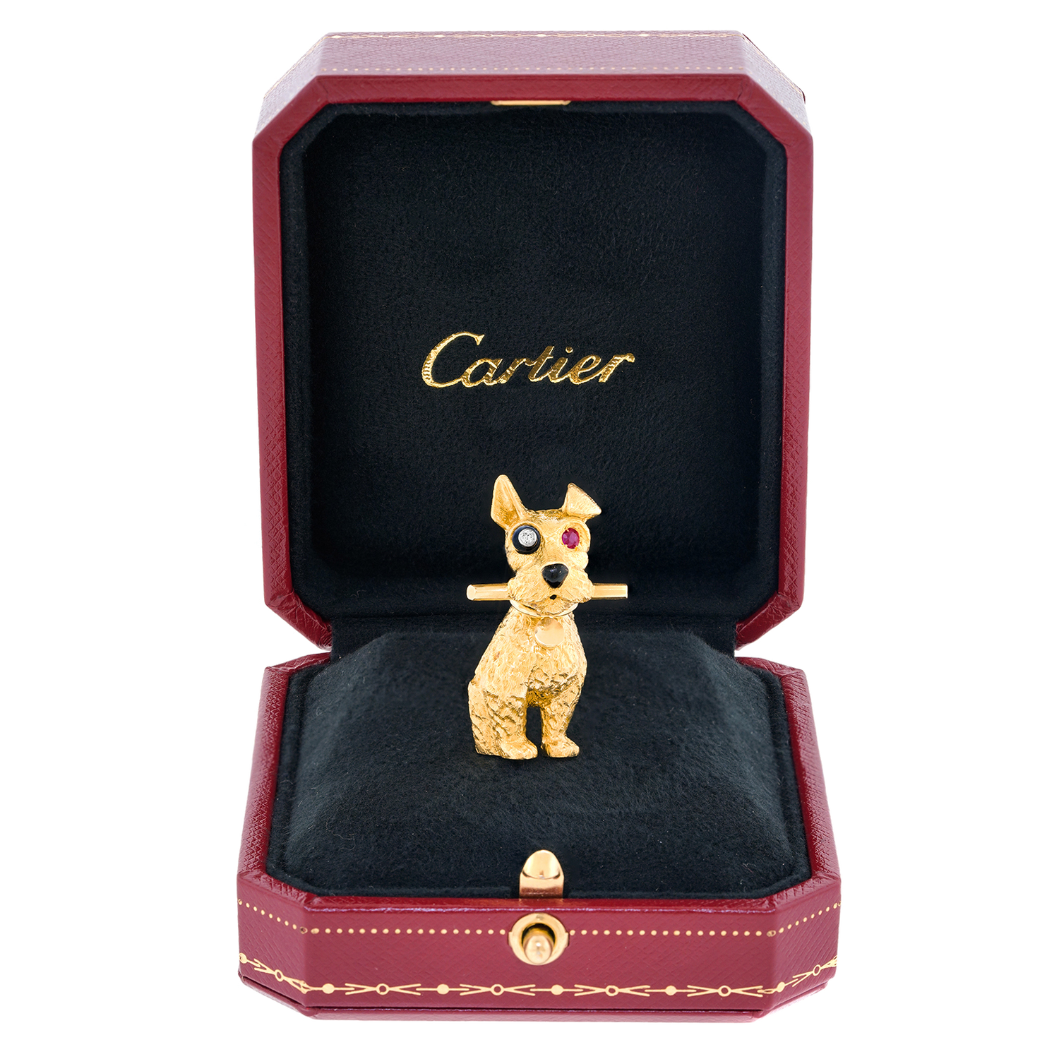 Circa 1950s, 18k, by Cartier, Paris, France. This delightful Terrier pin by Cartier is the perfect whimsical accessory. Charming animal brooches were all the rage in the fifties, sixties, and seventies. This one has fabulous ruby and diamond eyes, an enamel monocle, and an enamel nose! A superb example, this Cartier jewel is in excellent condition and comes in an original Cartier box.