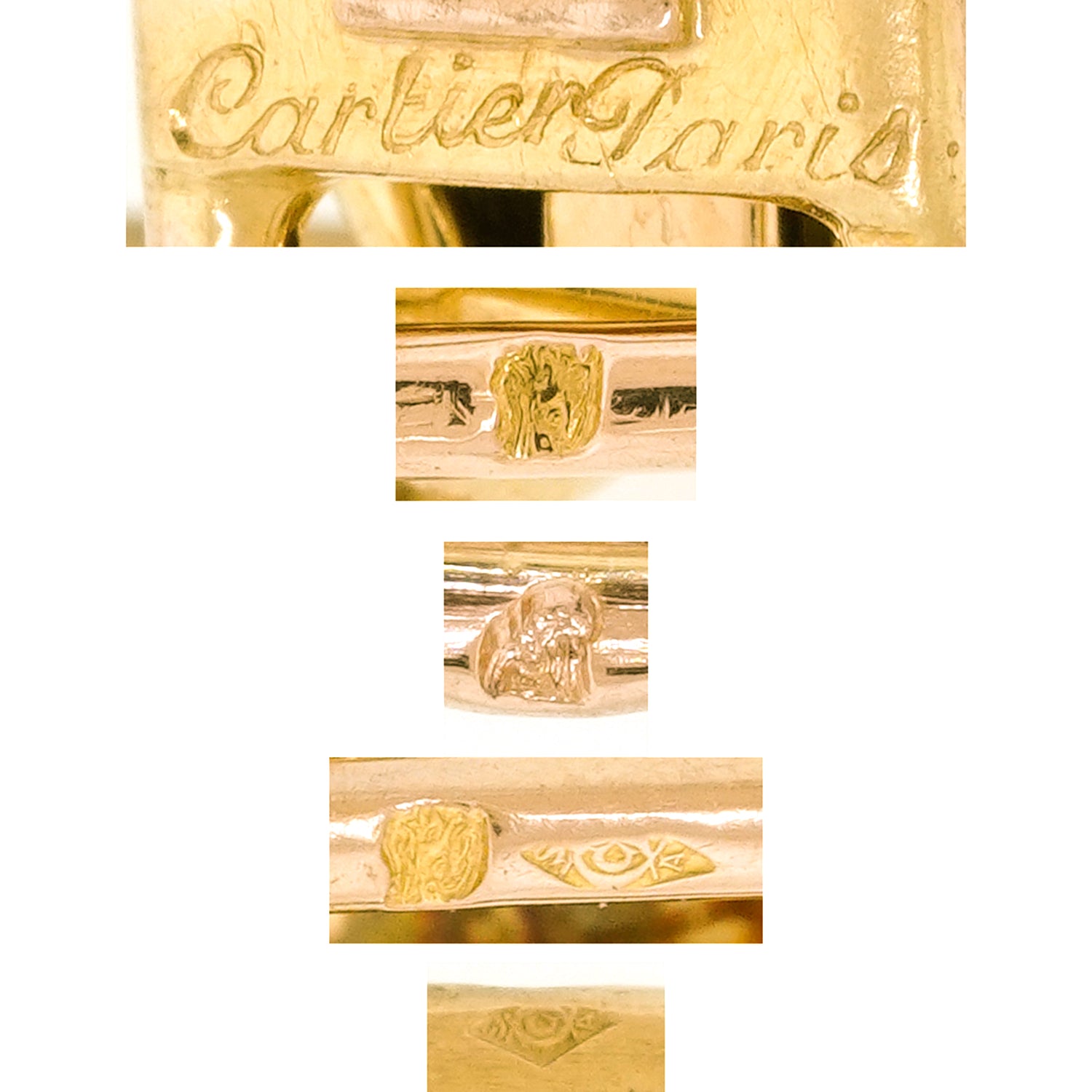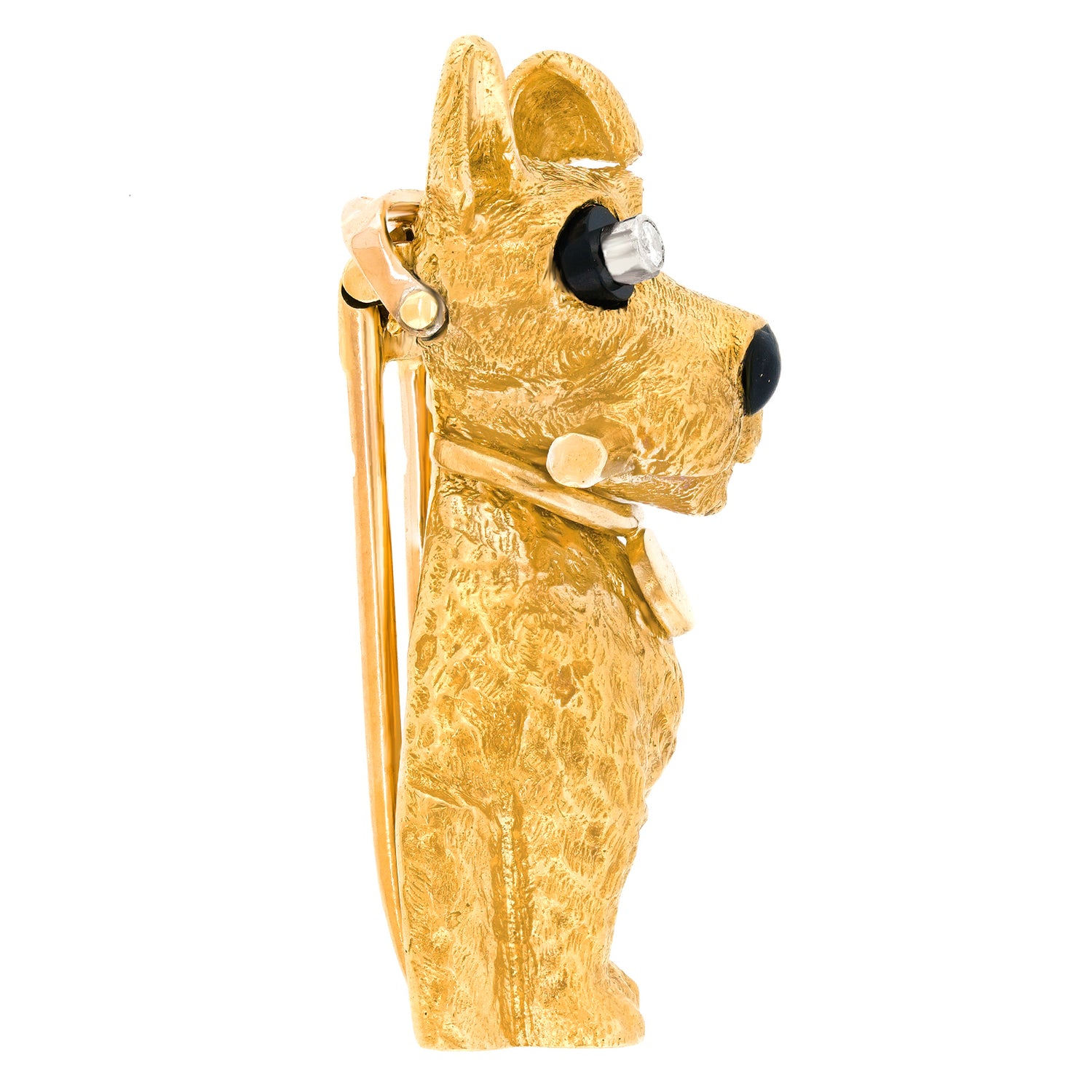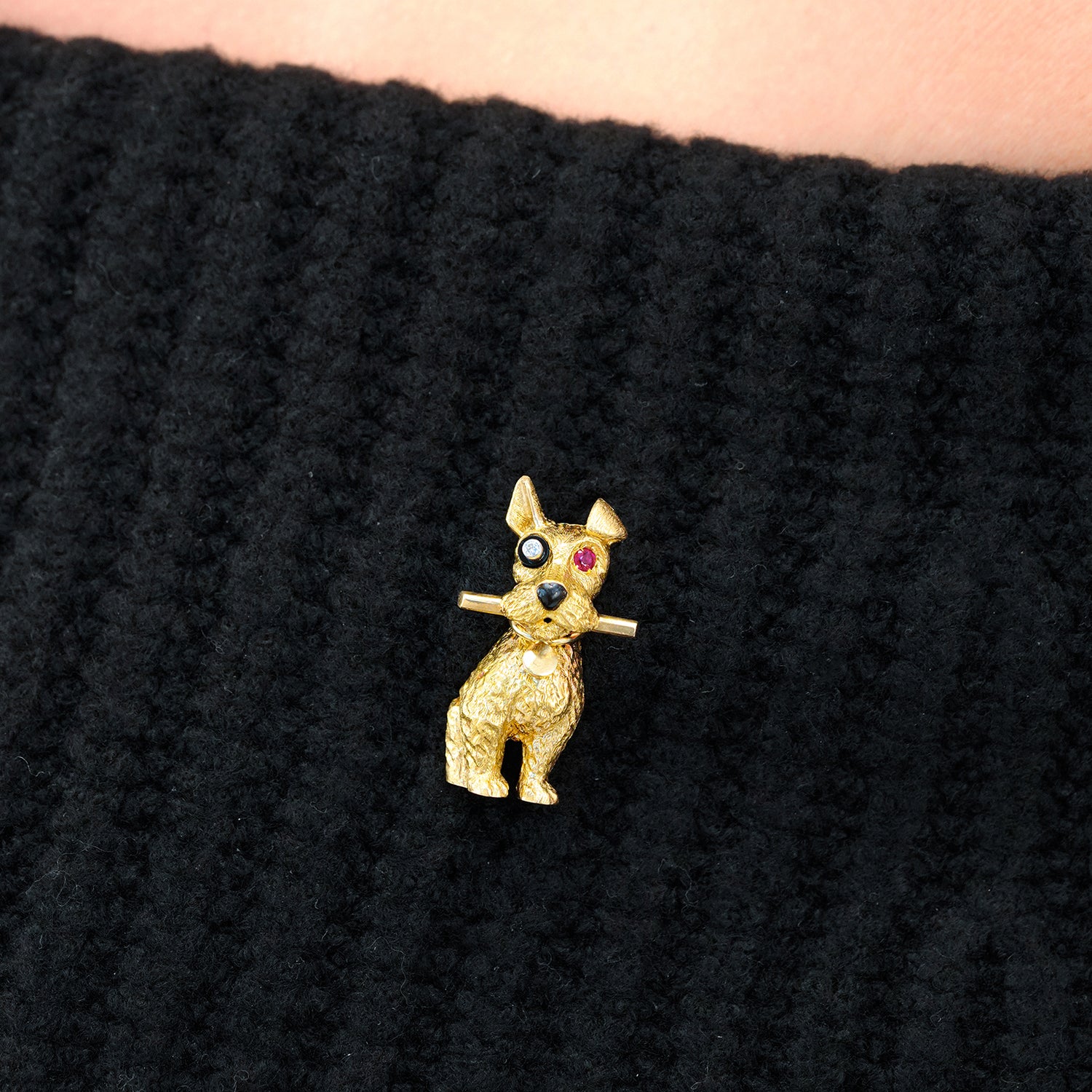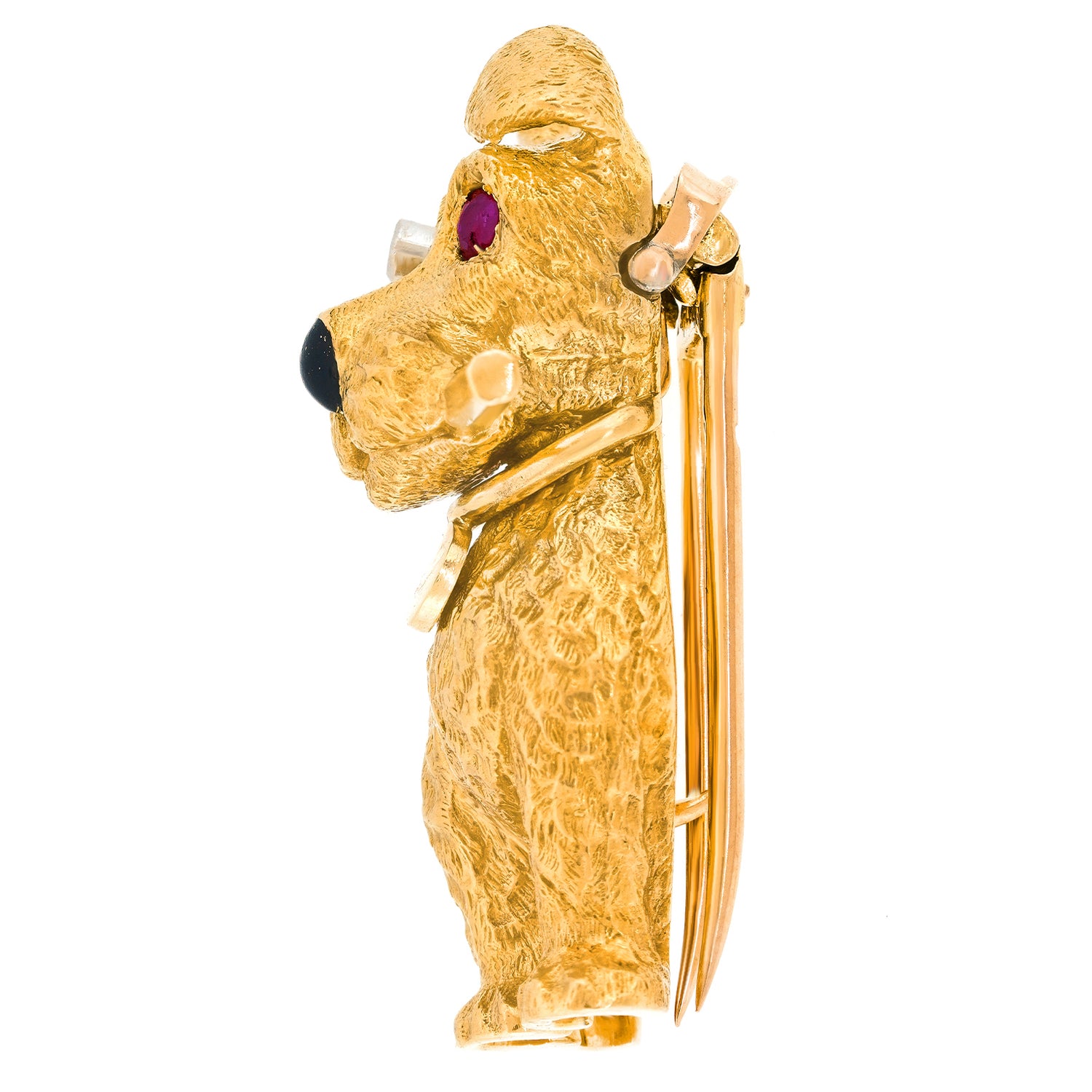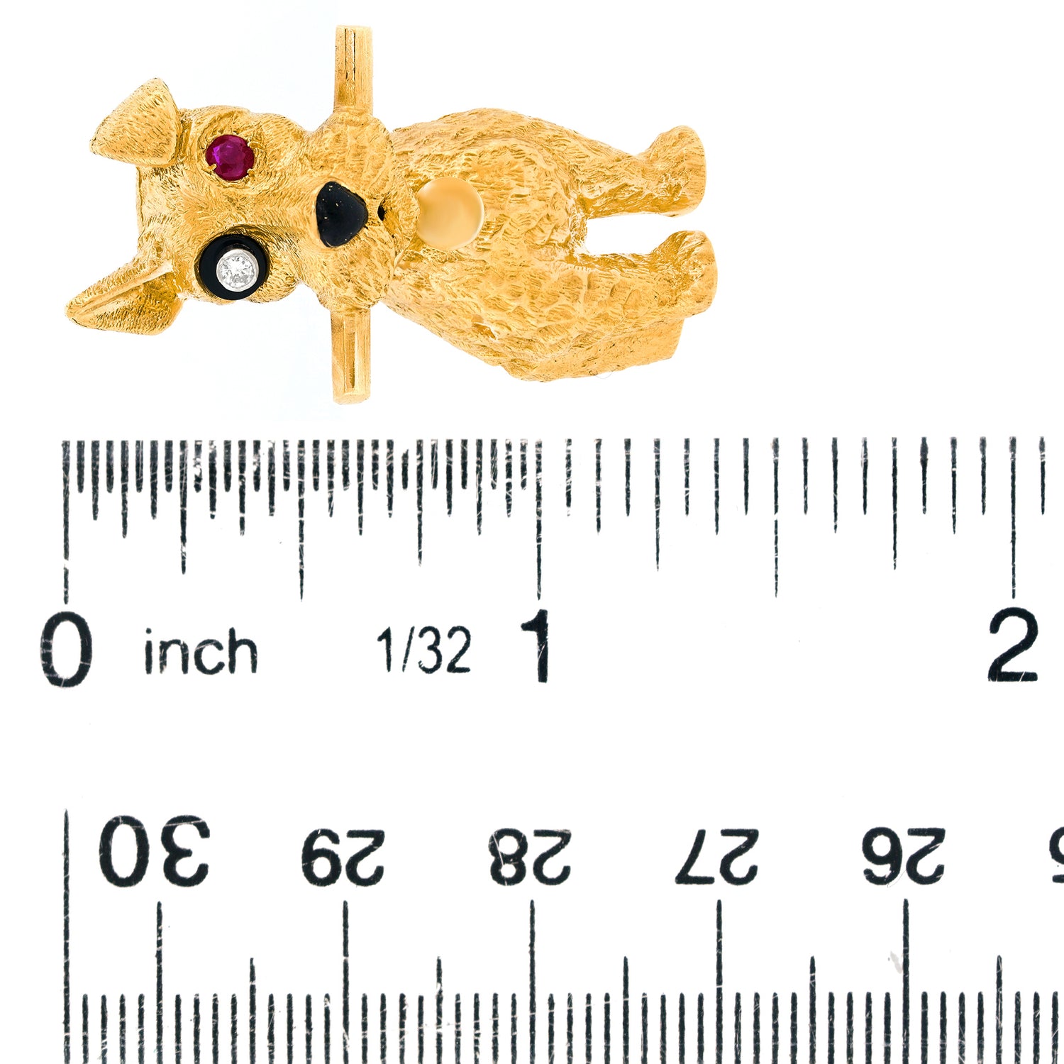 Circa 1950s, 18k, by Cartier, Paris, France. This delightful Terrier pin by Cartier is the perfect whimsical accessory. Charming animal brooches were all the rage in the fifties, sixties, and seventies. This one has fabulous ruby and diamond eyes, an enamel monocle, and an enamel nose! A superb example, this Cartier jewel is in excellent condition and comes in an original Cartier box.