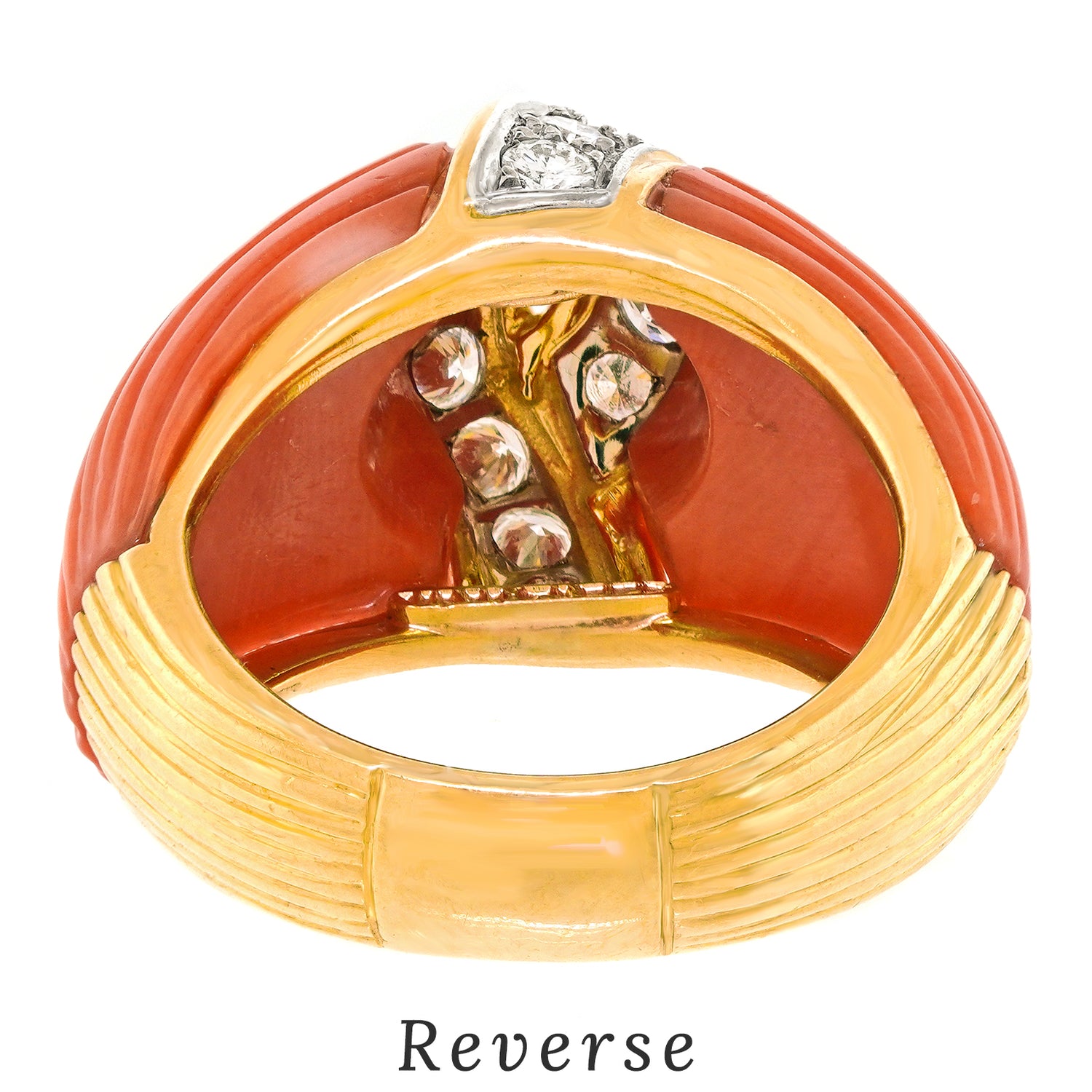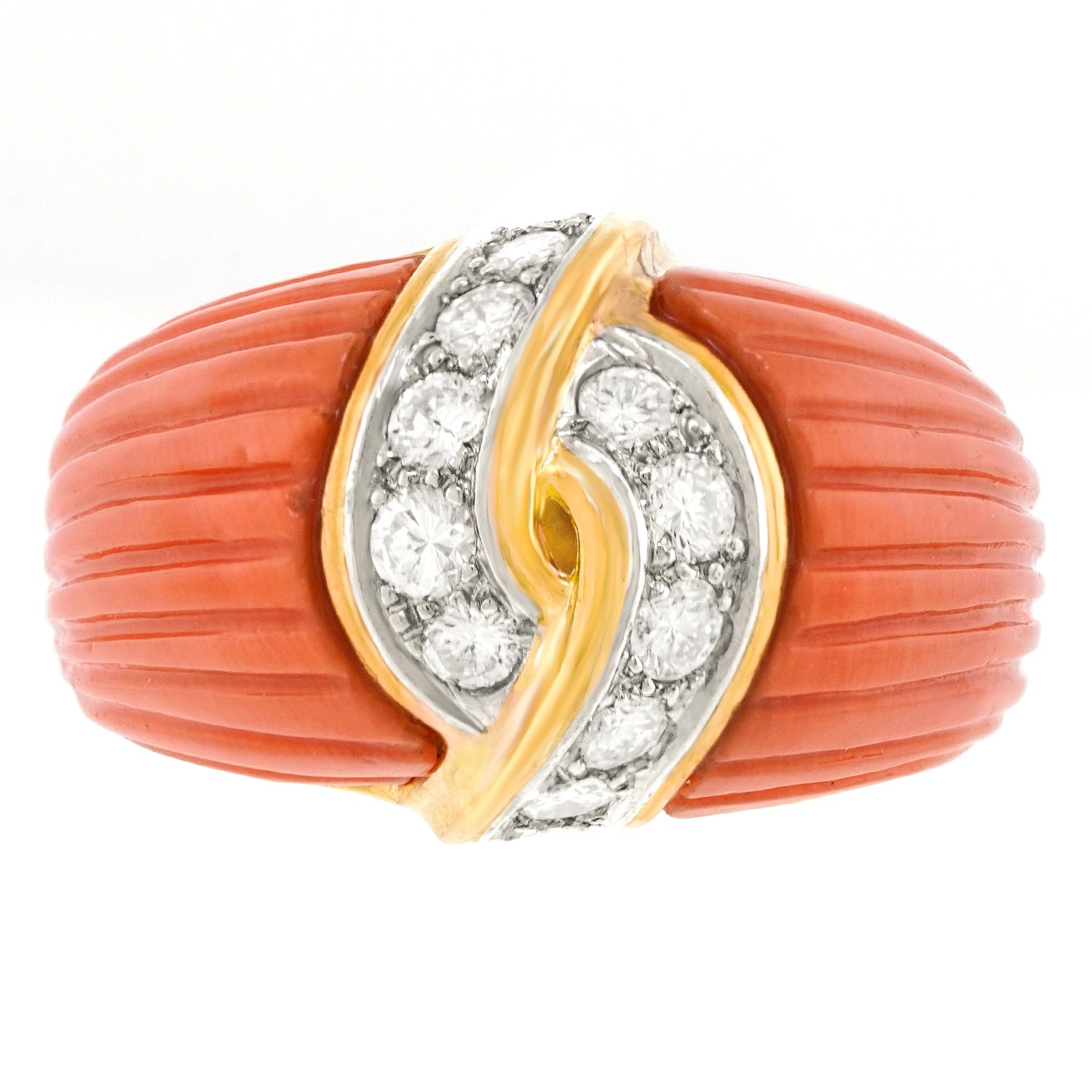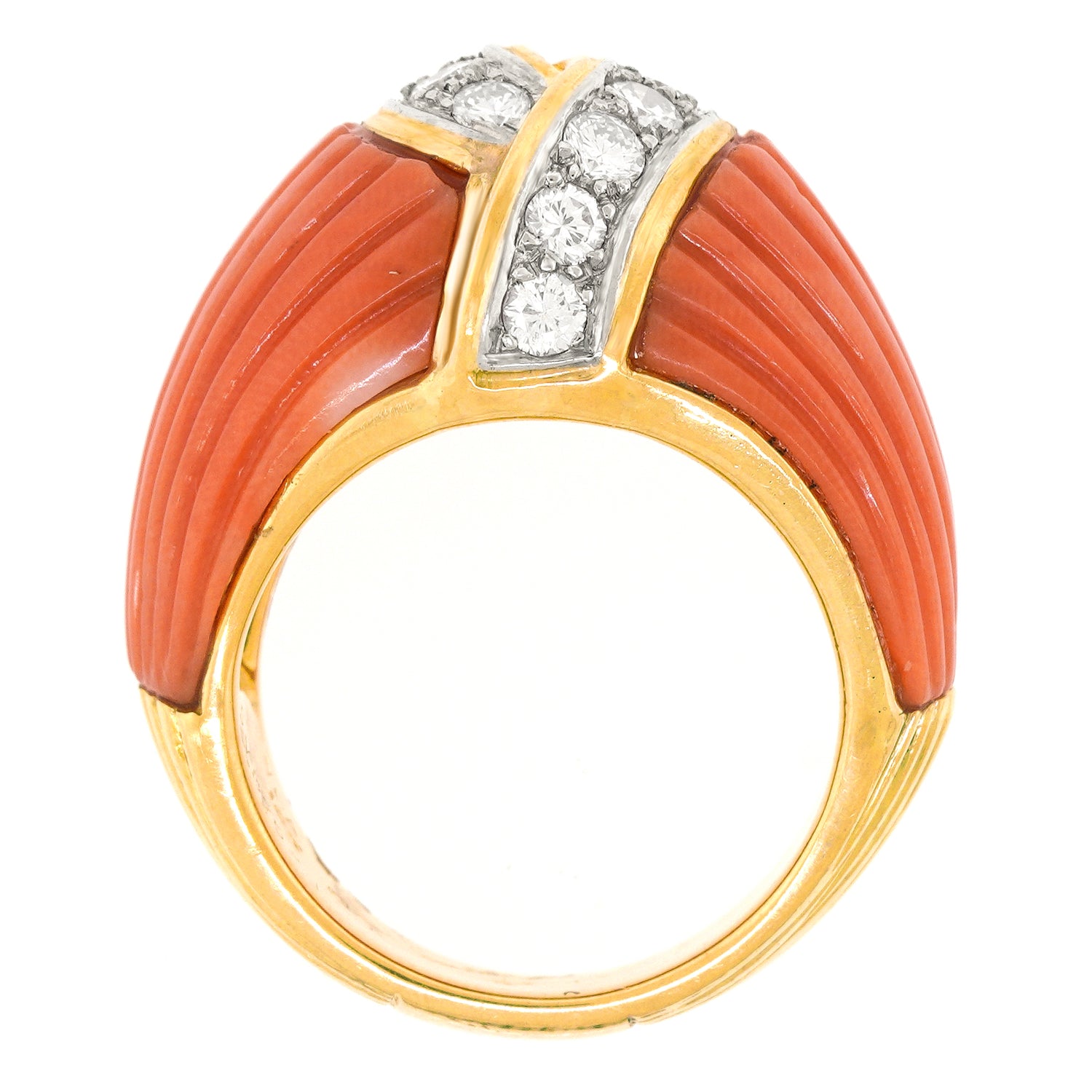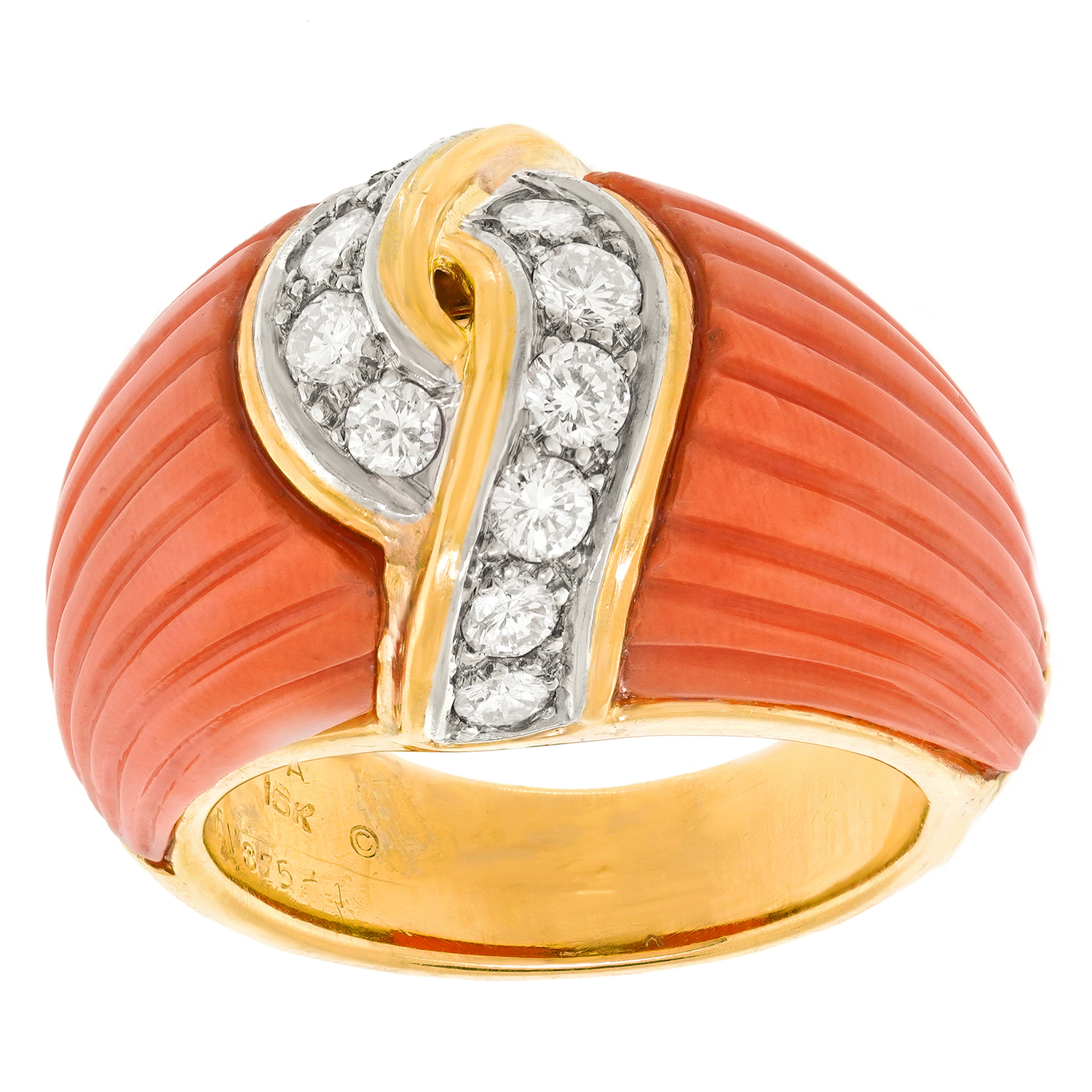 Circa 1960s, 18k, by Van Cleef & Arpels, France. Part of an iconic design set, this ring's striking design work, is underscored by .75 carats of brilliant white diamonds (G color and VS clarity), and gorgeous natural carved coral. Effortlessly going from day to night, the look is timeless. Hand-made to Van Cleef and Arpels' exacting standards, this ring is in excellent condition.
