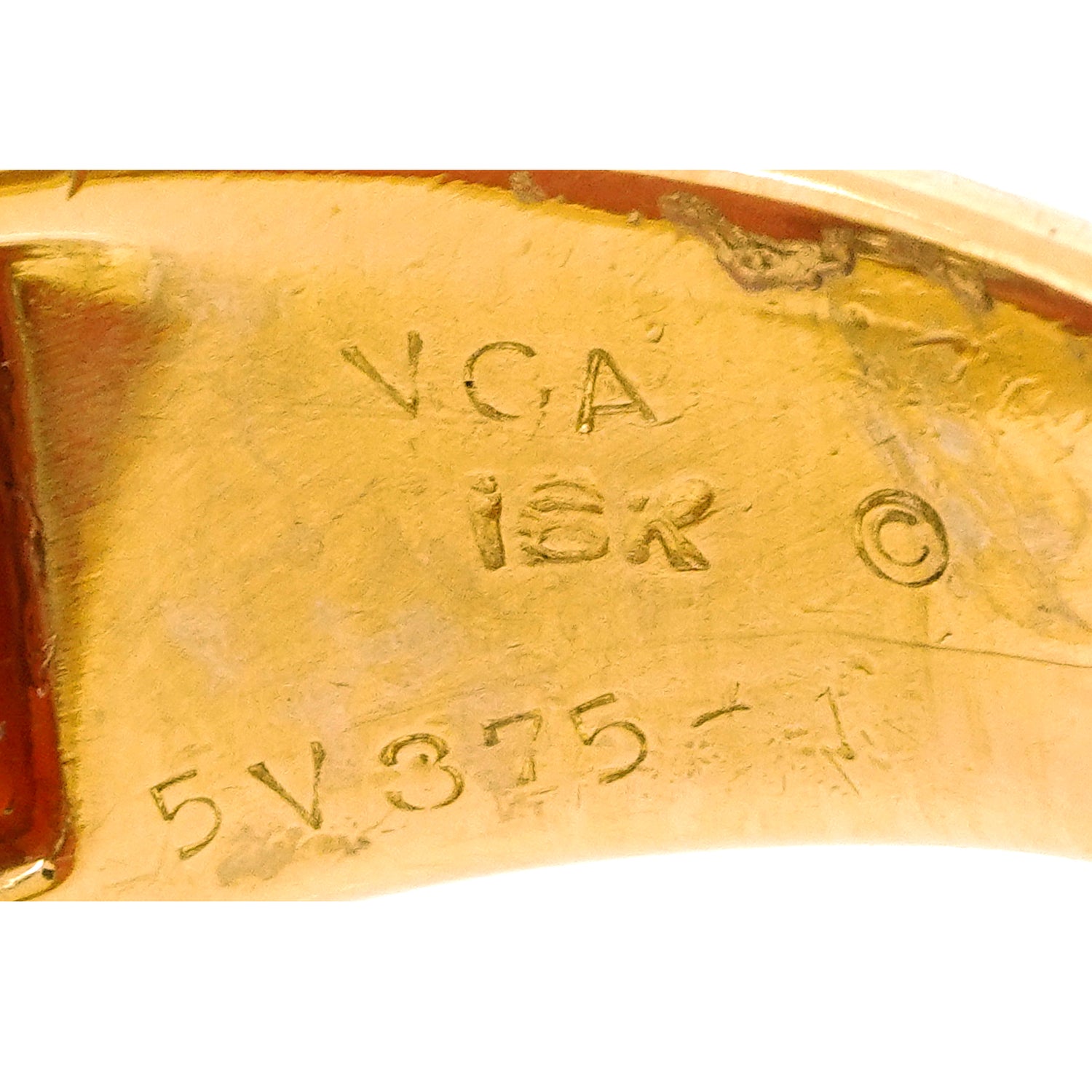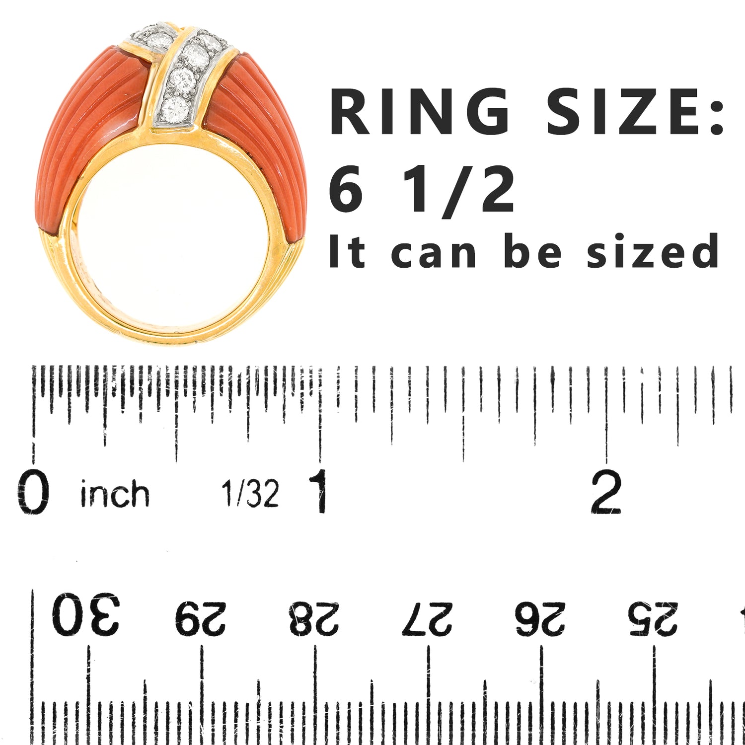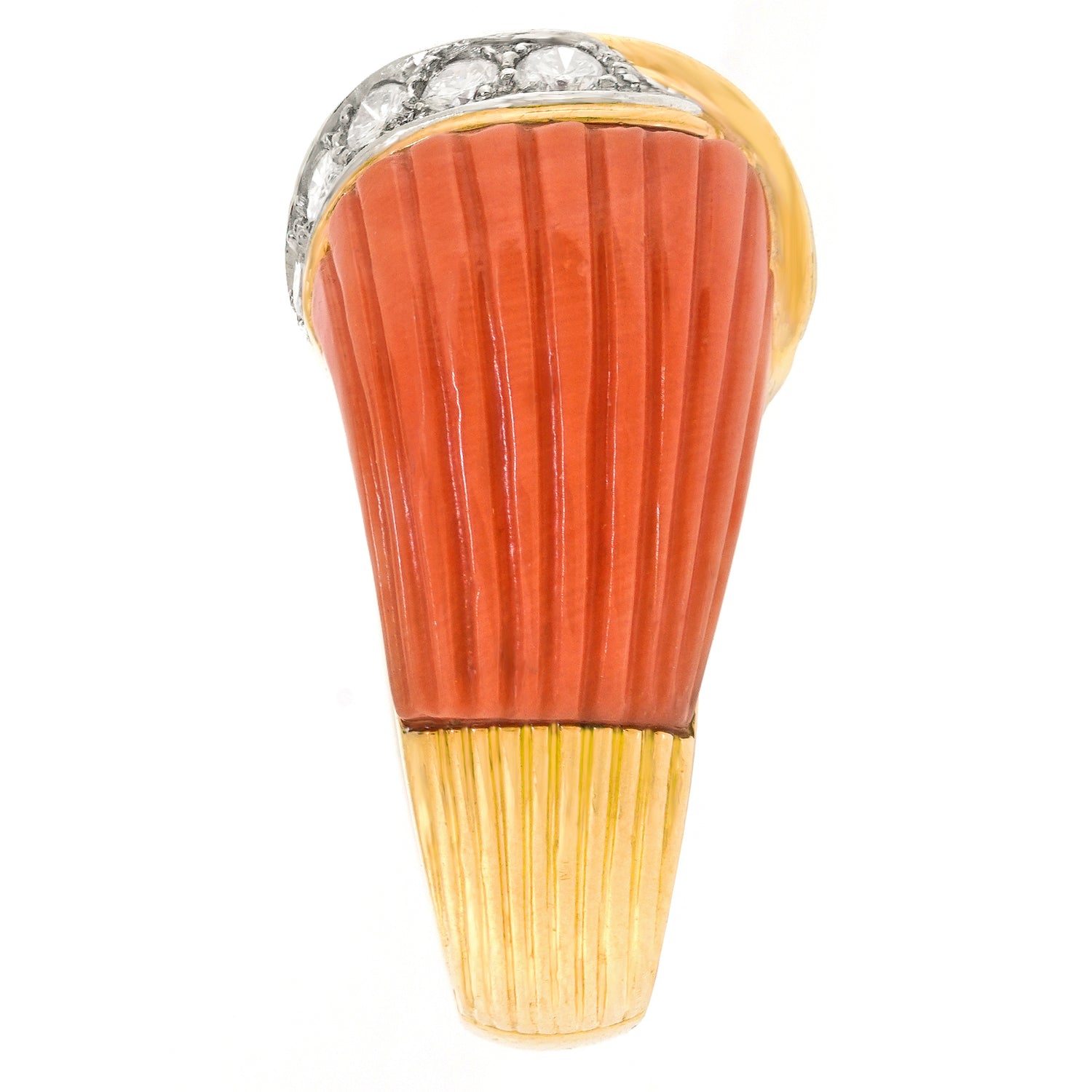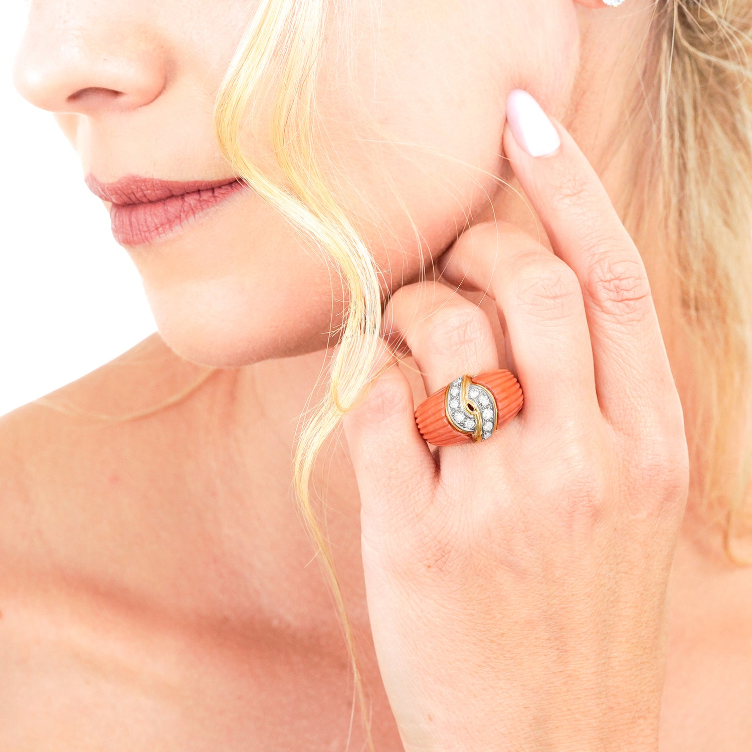 Circa 1960s, 18k, by Van Cleef & Arpels, France. Part of an iconic design set, this ring's striking design work, is underscored by .75 carats of brilliant white diamonds (G color and VS clarity), and gorgeous natural carved coral. Effortlessly going from day to night, the look is timeless. Hand-made to Van Cleef and Arpels' exacting standards, this ring is in excellent condition.