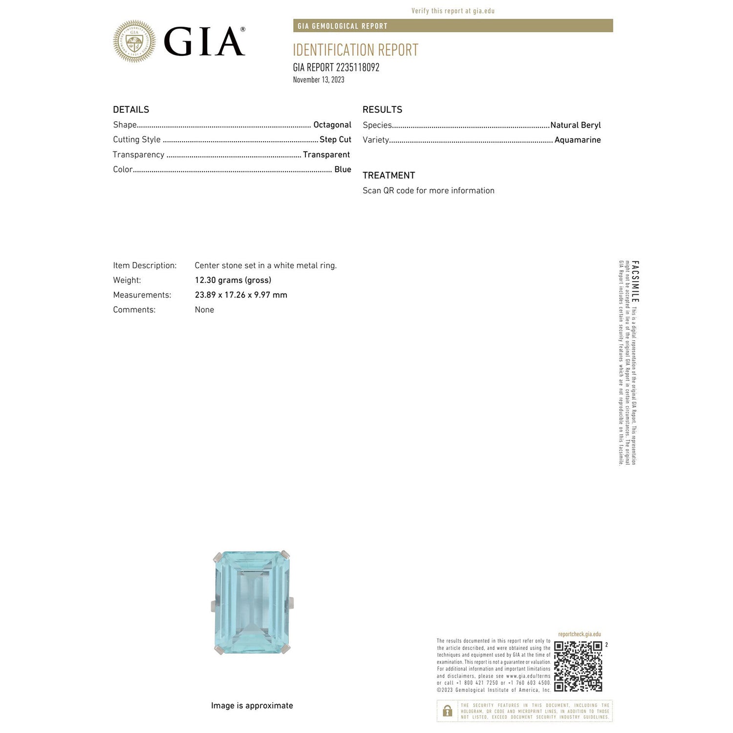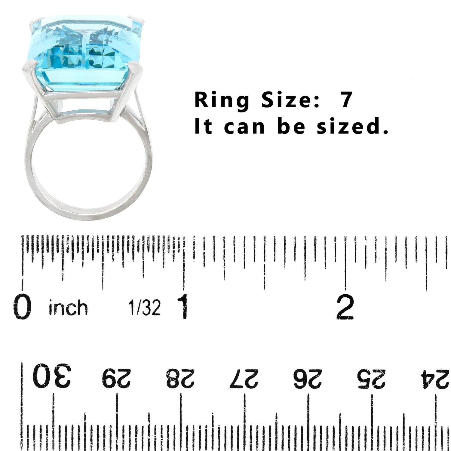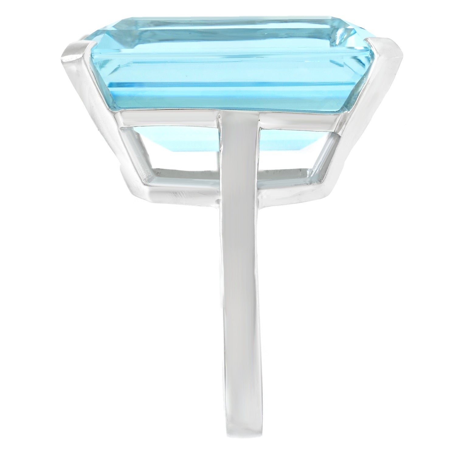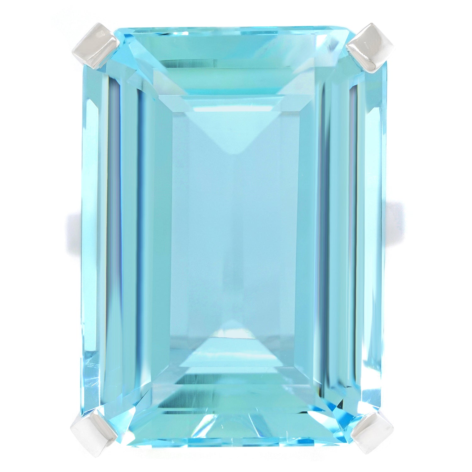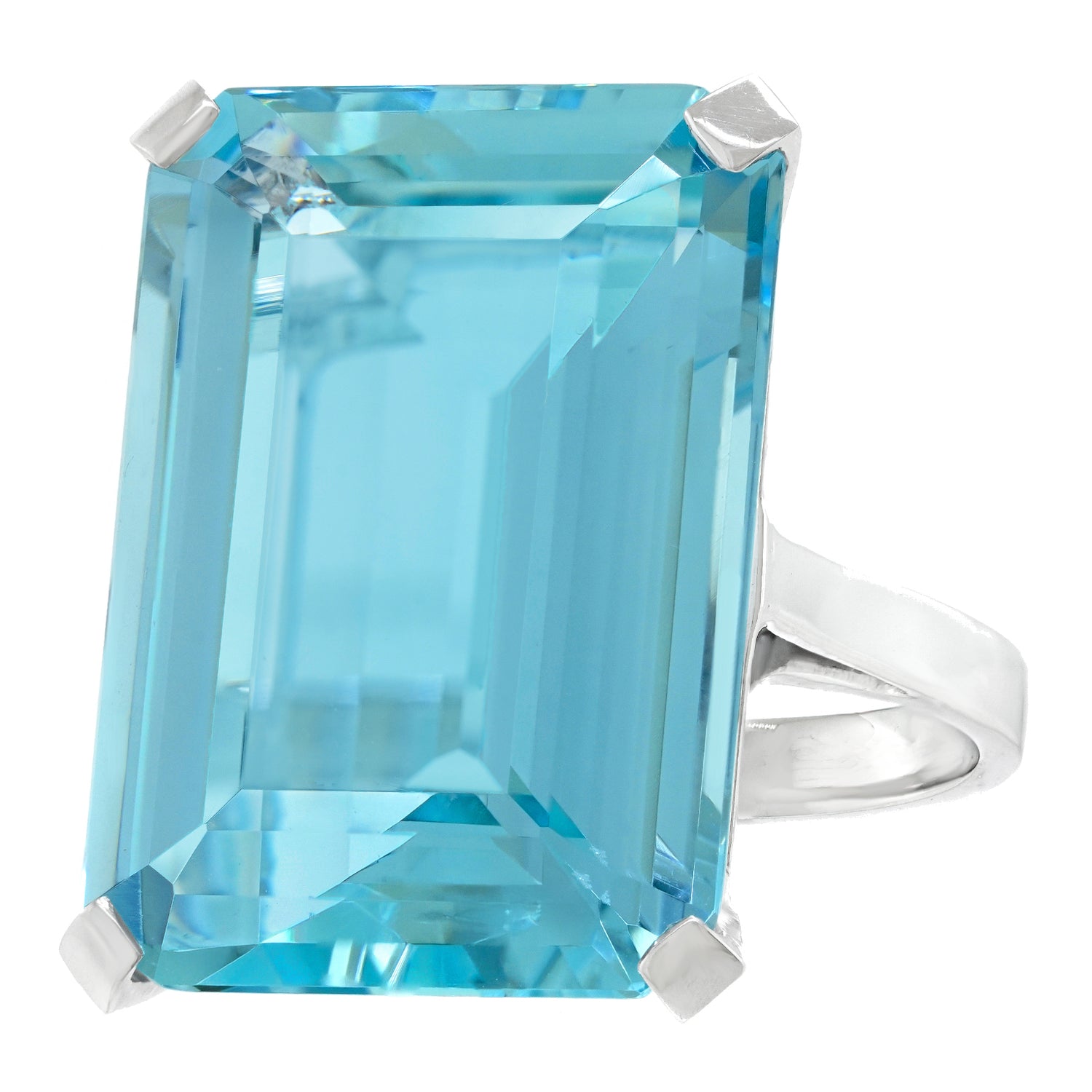 Circa 1960s, 14k. Brilliantly vintage and timelessly au-courant, this jewel features a 30.0-carat luminous blue aquamarine. The look is colorfully bold American glamour, sixties style. Well-made in 14k white gold, this ring is in excellent condition.