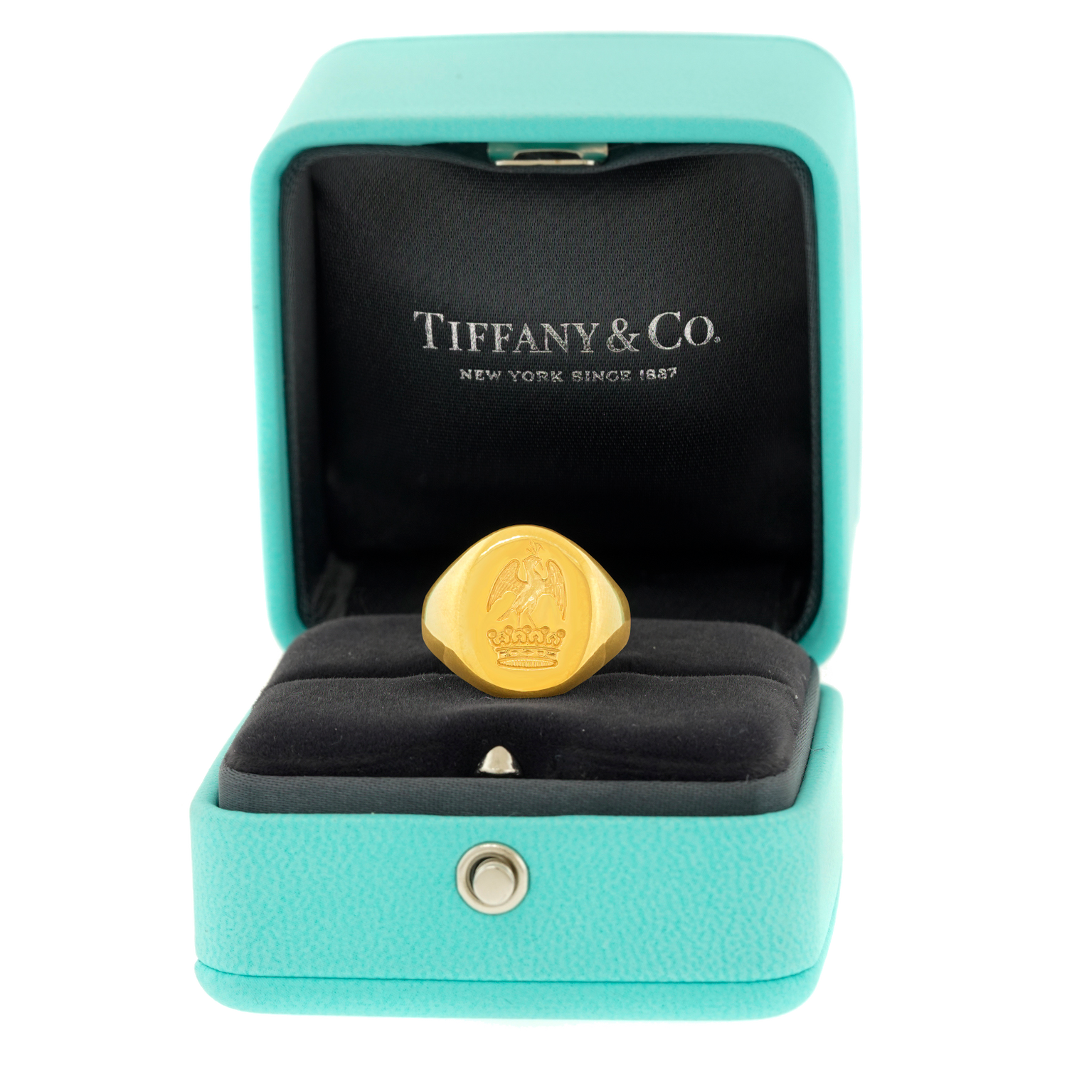Circa 1960s, 14k, by Tiffany & Co. Decorated with a fabulous eagle and crown, this 1960s signet ring by Tiffany & Co. has that classic town and country style. Heavy gold for a great look and feel completes the narrative. Finely made with the distinctive quality Tiffany is renowned for, this fashionable ring is in excellent condition.