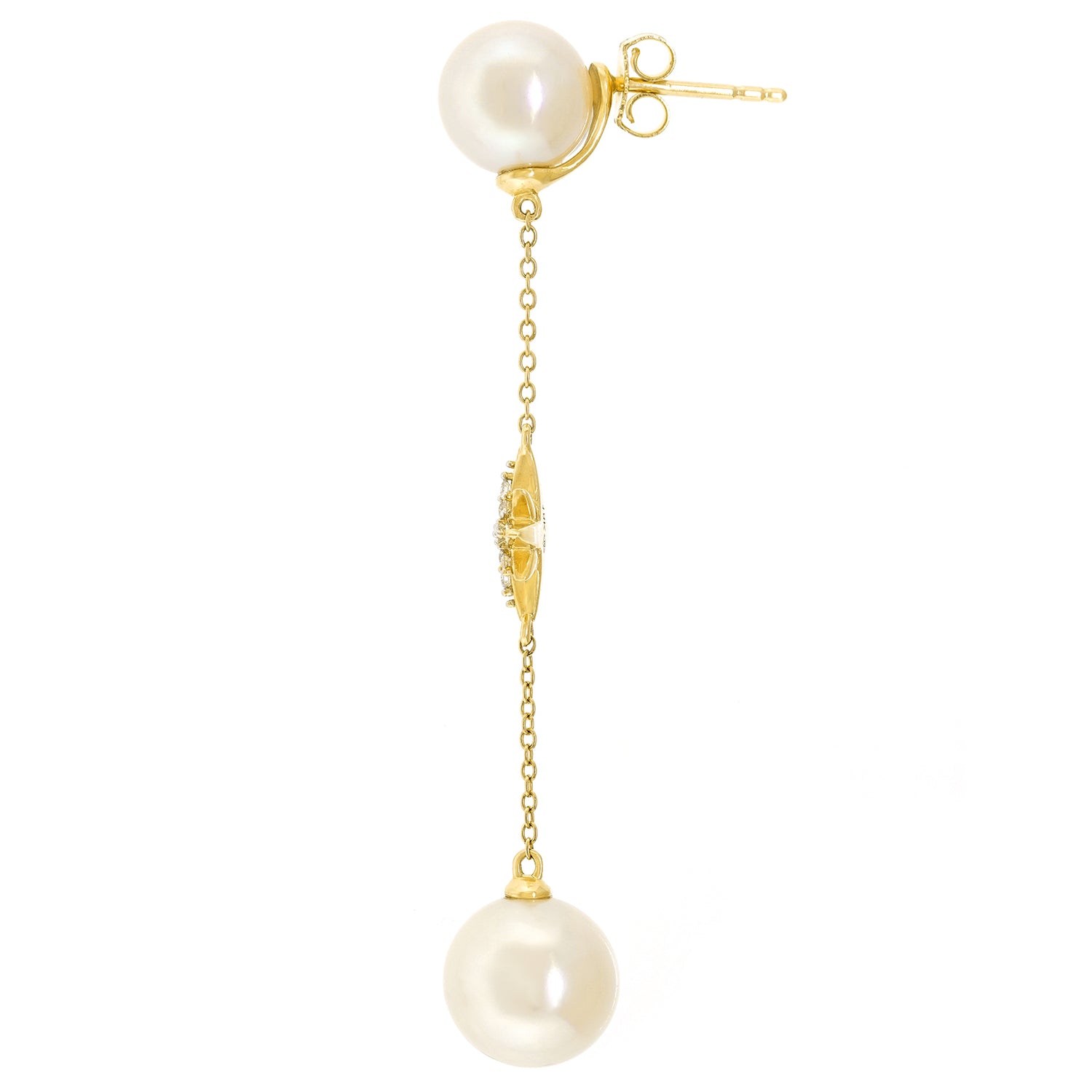 Circa 2000s, 18k, by Mastoloni, American. Mastoloni ingeniously combines radiant pearls with sparkly diamond star-on-star. The look is elegant, stunning, and timeless. Beautifully designed and finely fashioned, these contemporary earrings are in excellent condition.