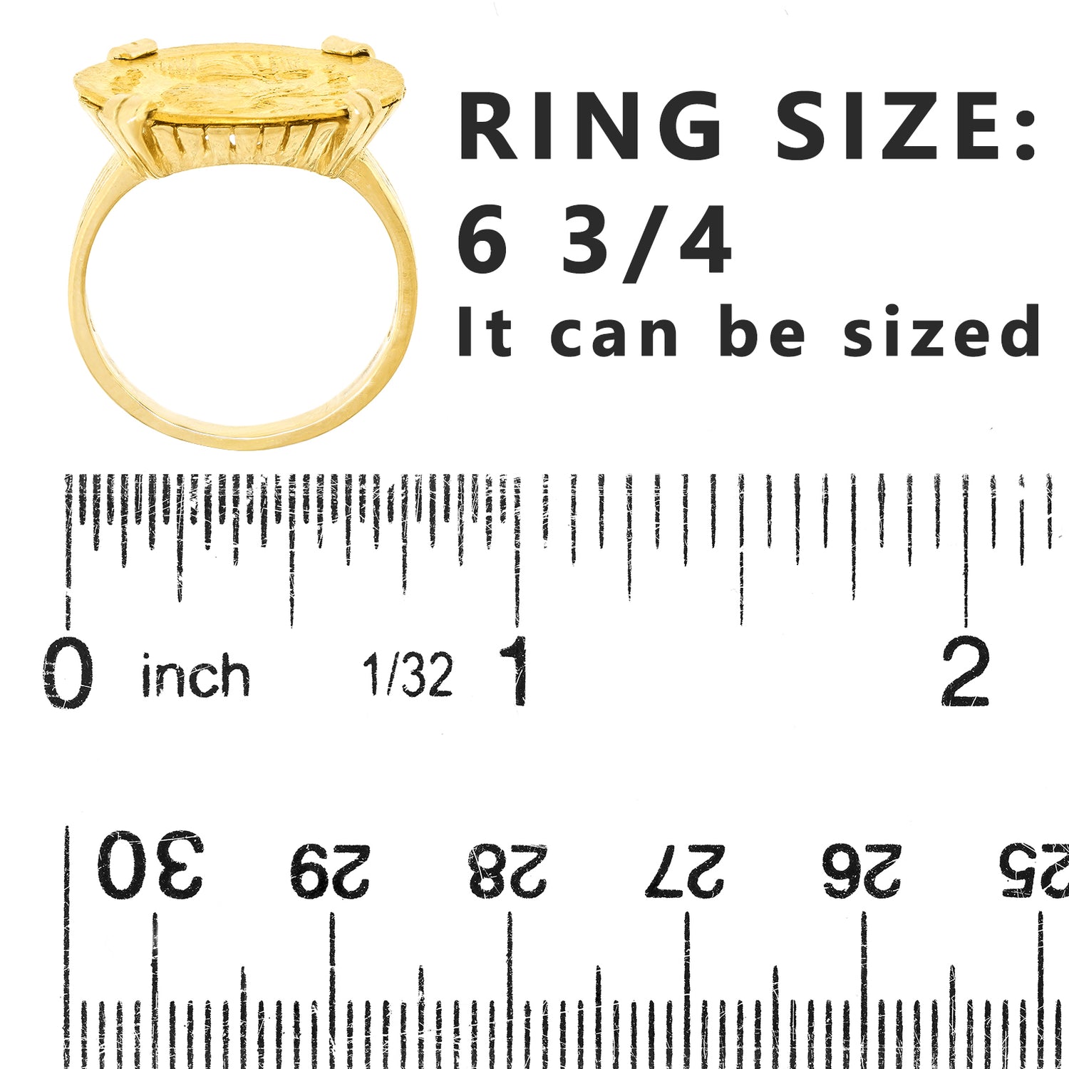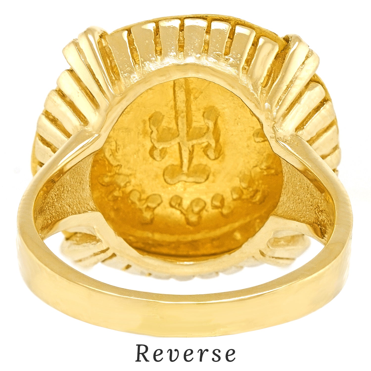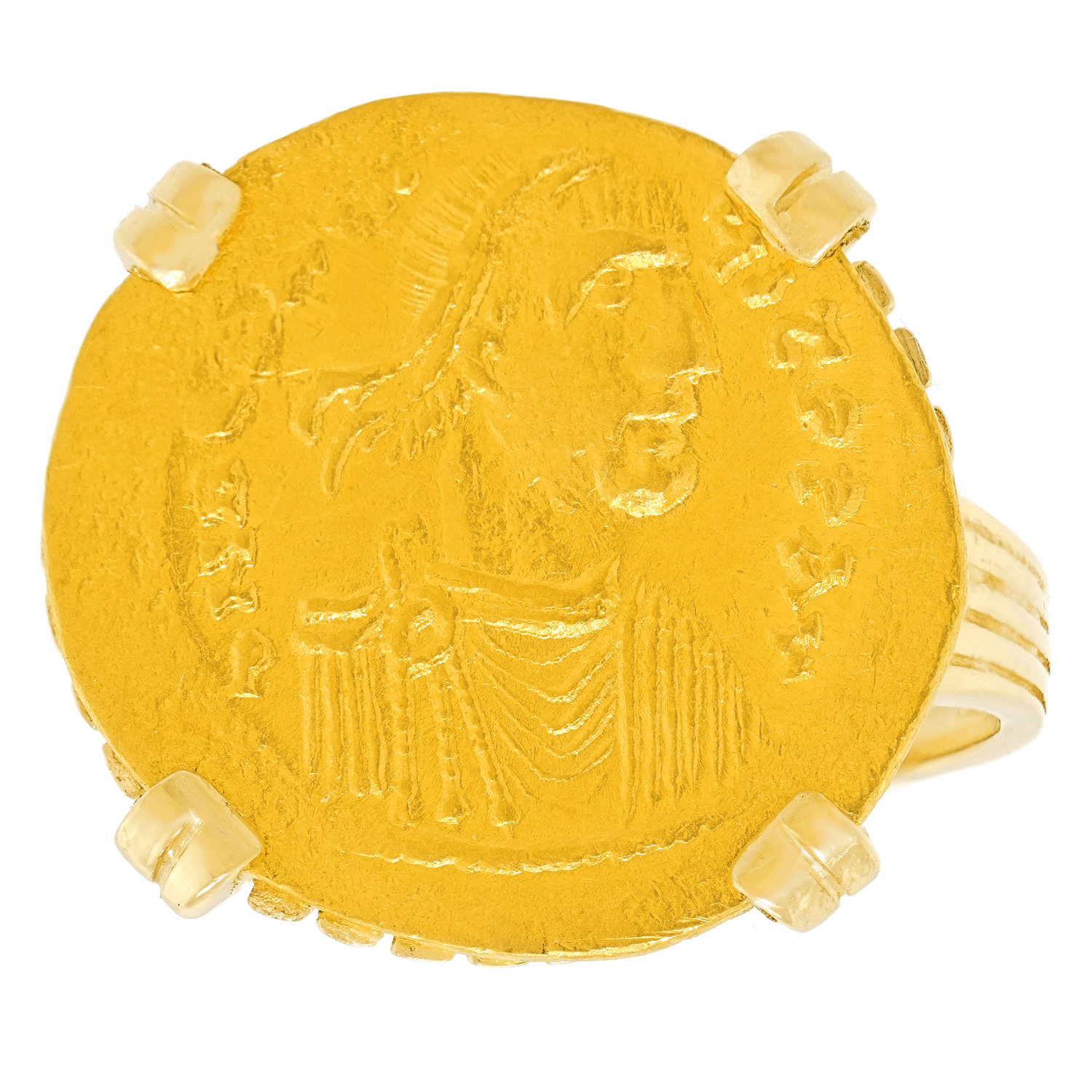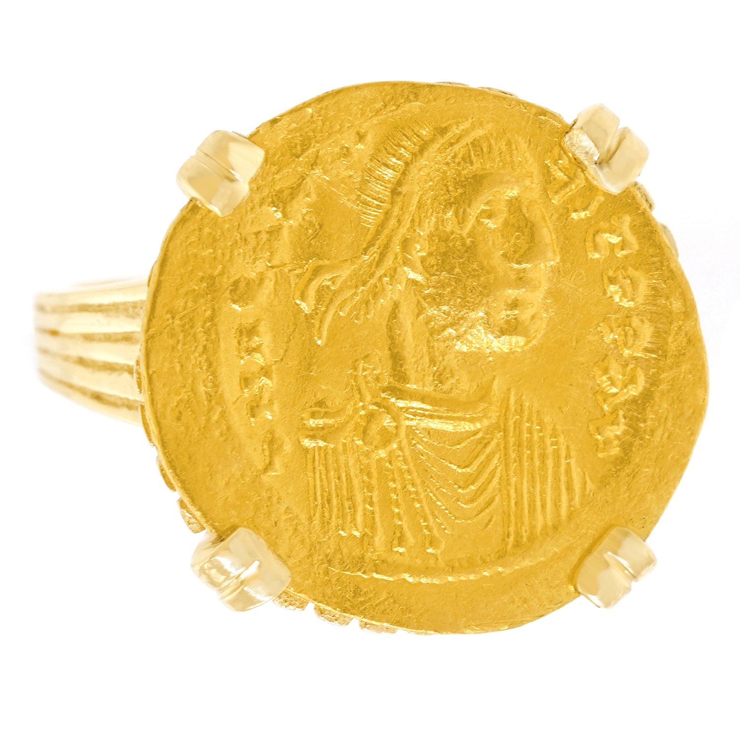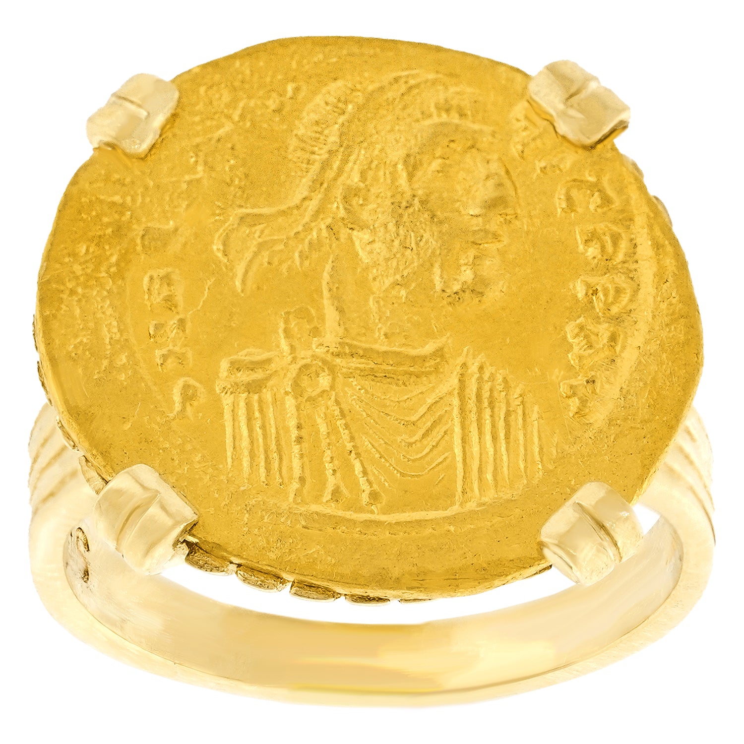 Circa 668-685AD 22k coin, Roman, circa 1960s, 14k ring, American. Set in the sixties with a delightful 4th-century Roman coin, this ring features Emperor Constantine IV. Unmistakably cover of Vogue, the 14k yellow mounting is finely detailed and the coin, a rich, deep color. Excellent condition.
