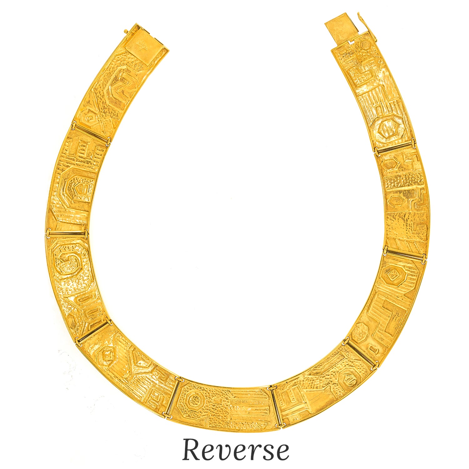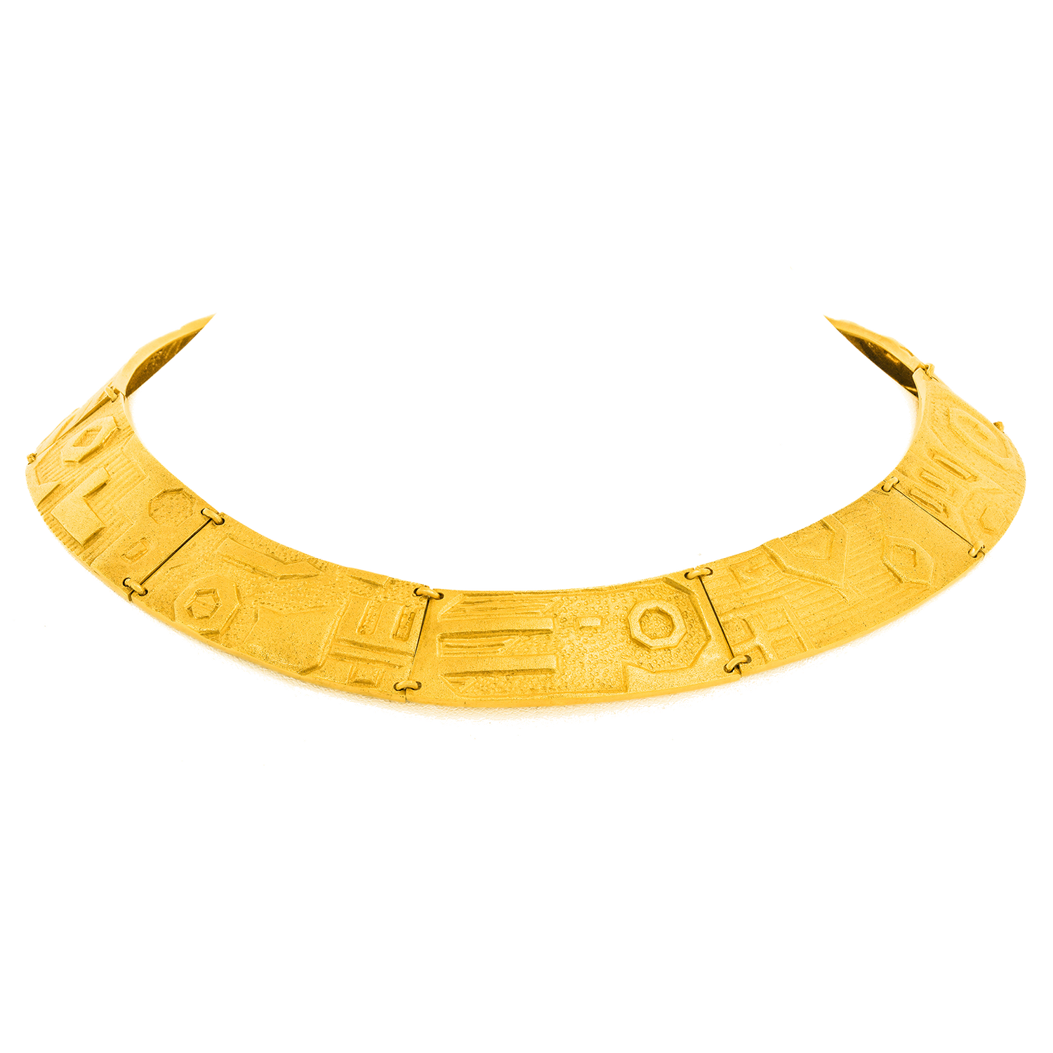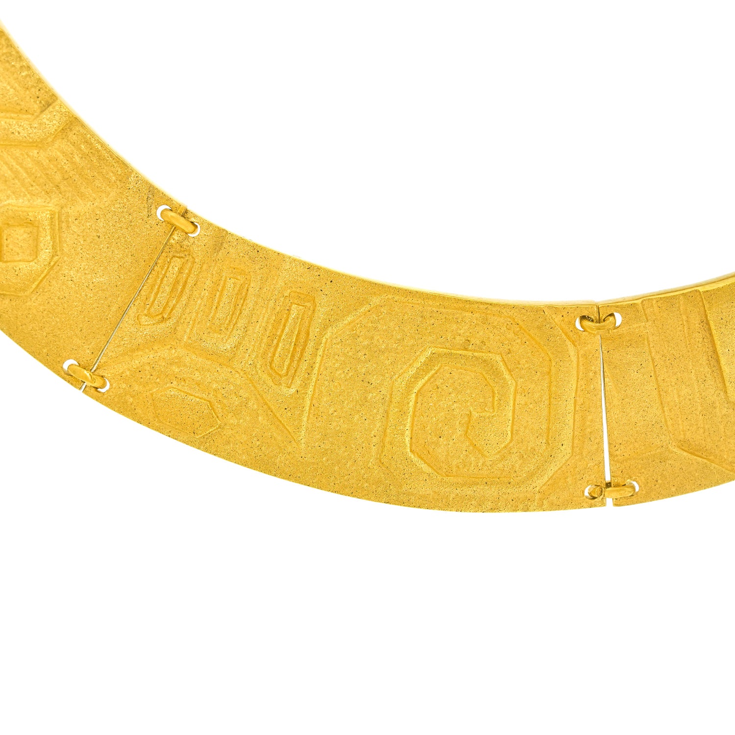 Circa 1960s, 18k, by Olga Finzi for Arrigo Finzi, Milan, Italy. This unique necklace by Milan goldsmith, Olga Finzi, is stylish sculpture to go. A tour-de-force of mid-century Italian design, this piece is completely hand-raised. Trained by her father, Arrigo Finzi, Olga joined his firm adding spectacular one-of-a-kind jewelry to his atelier's masterworks in silver hollowware. Informed by Art and tempered by the Milan design scene of the sixties, the visual narrative of her work is insightfully fashionable. Excellent condition.