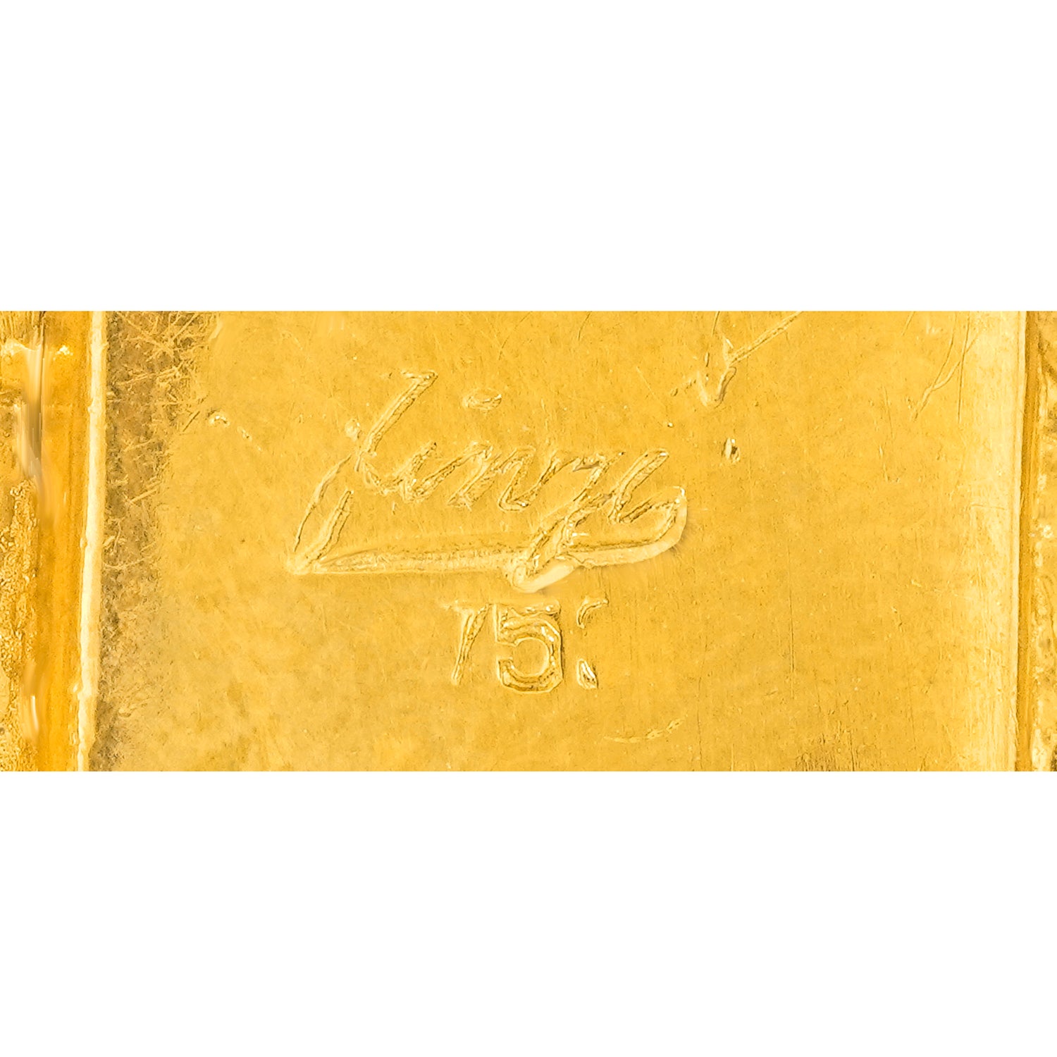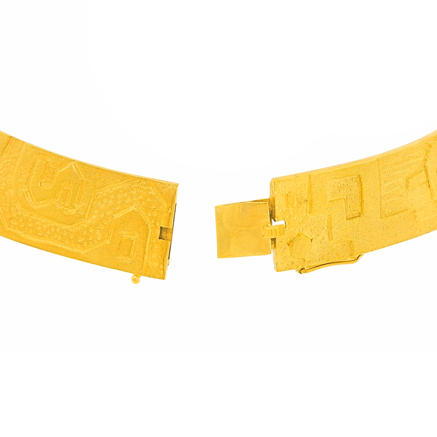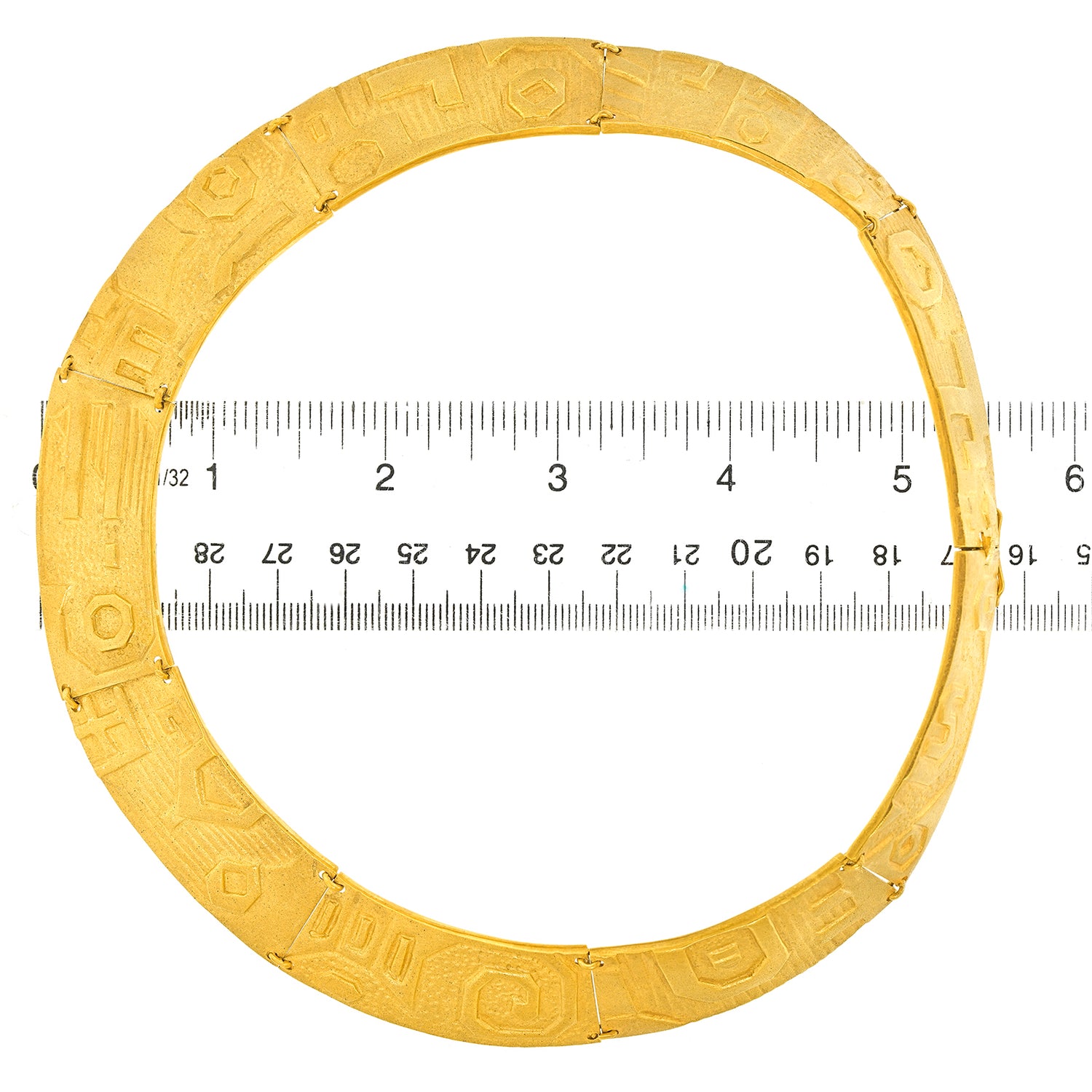 Circa 1960s, 18k, by Olga Finzi for Arrigo Finzi, Milan, Italy. This unique necklace by Milan goldsmith, Olga Finzi, is stylish sculpture to go. A tour-de-force of mid-century Italian design, this piece is completely hand-raised. Trained by her father, Arrigo Finzi, Olga joined his firm adding spectacular one-of-a-kind jewelry to his atelier's masterworks in silver hollowware. Informed by Art and tempered by the Milan design scene of the sixties, the visual narrative of her work is insightfully fashionable. Excellent condition.