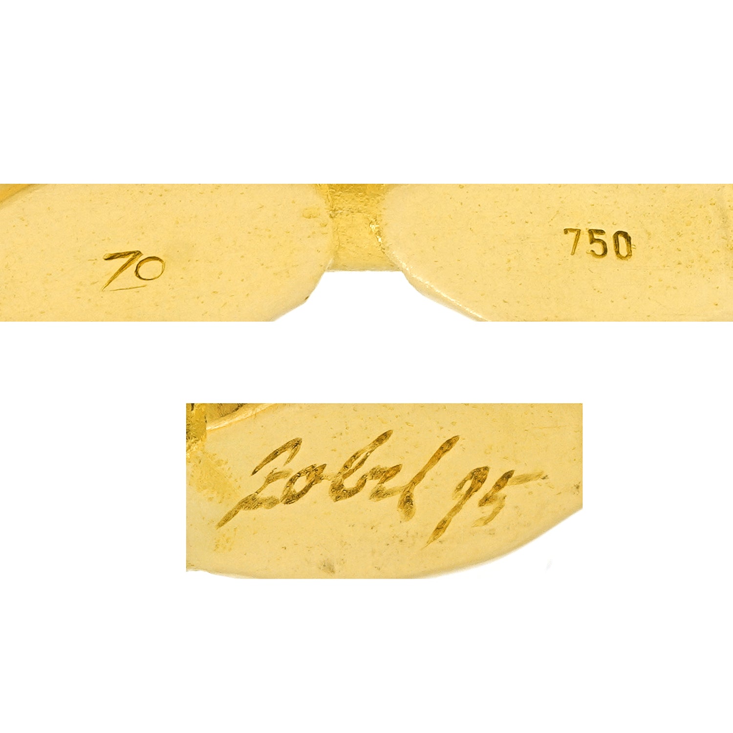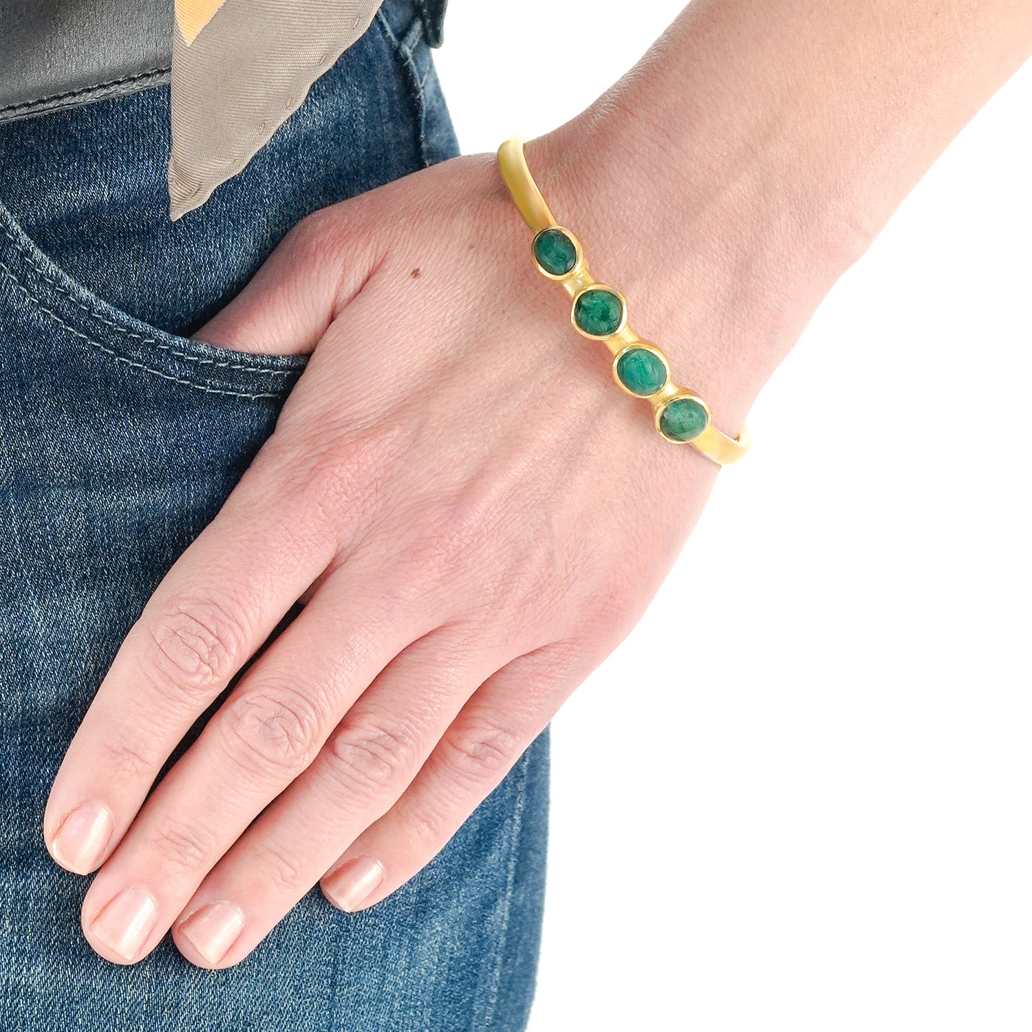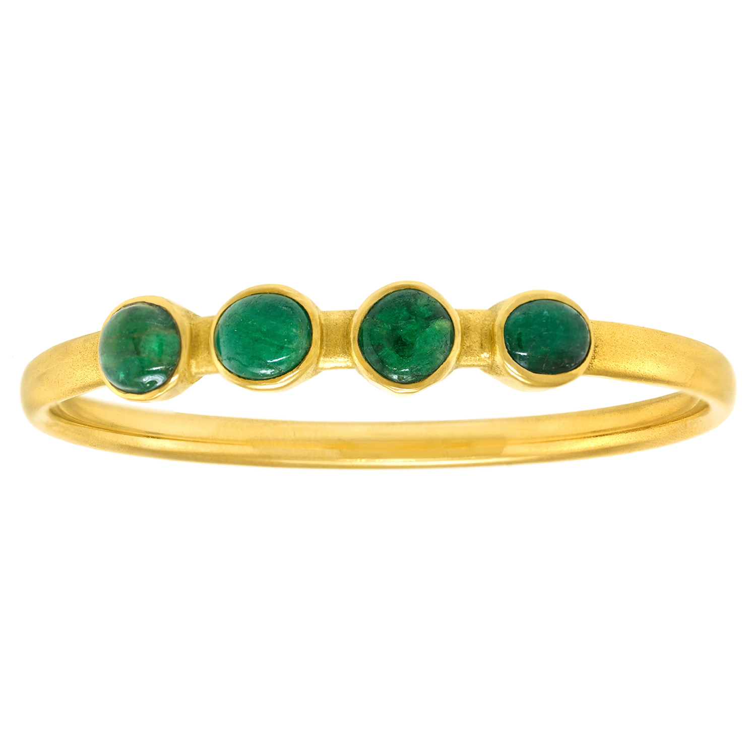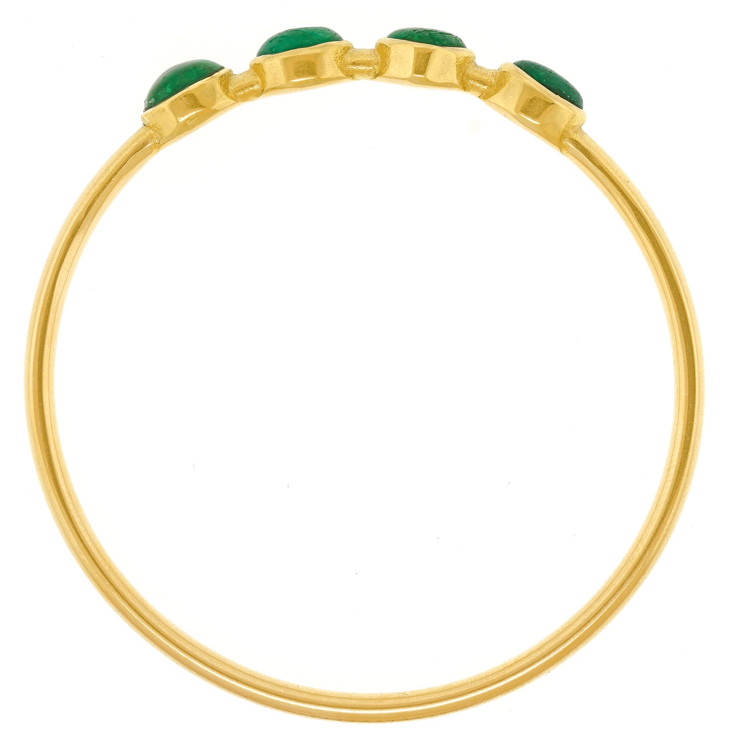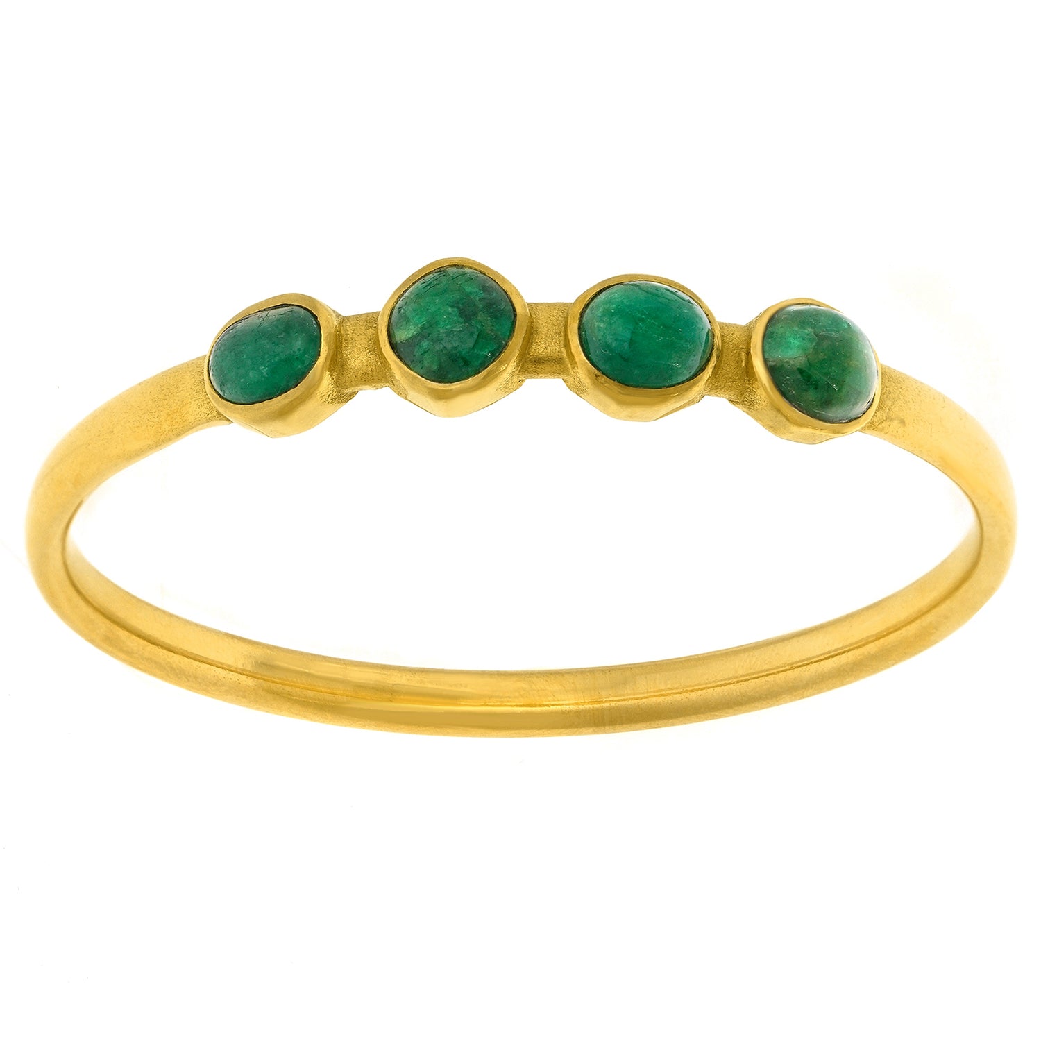 Circa 1995, 18k, by Michael Zobel, Konstanz, Germany. This gorgeous modernist gold bracelet, by the renowned German goldsmith, Michael Zobel, is set with four 1.20-carat cabochon emeralds for a total of 5.0 carats. The look is subtle glamour, the ultimate chic. The style and construction in eighteen-karat yellow gold is superb. It is a pleasure to wear on its own or stacked with other bangles. Excellent condition.
