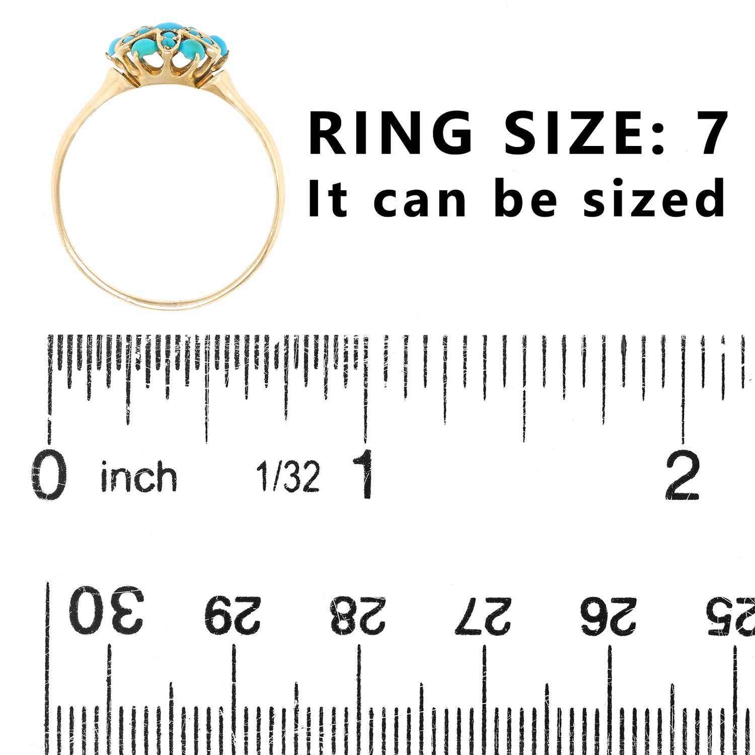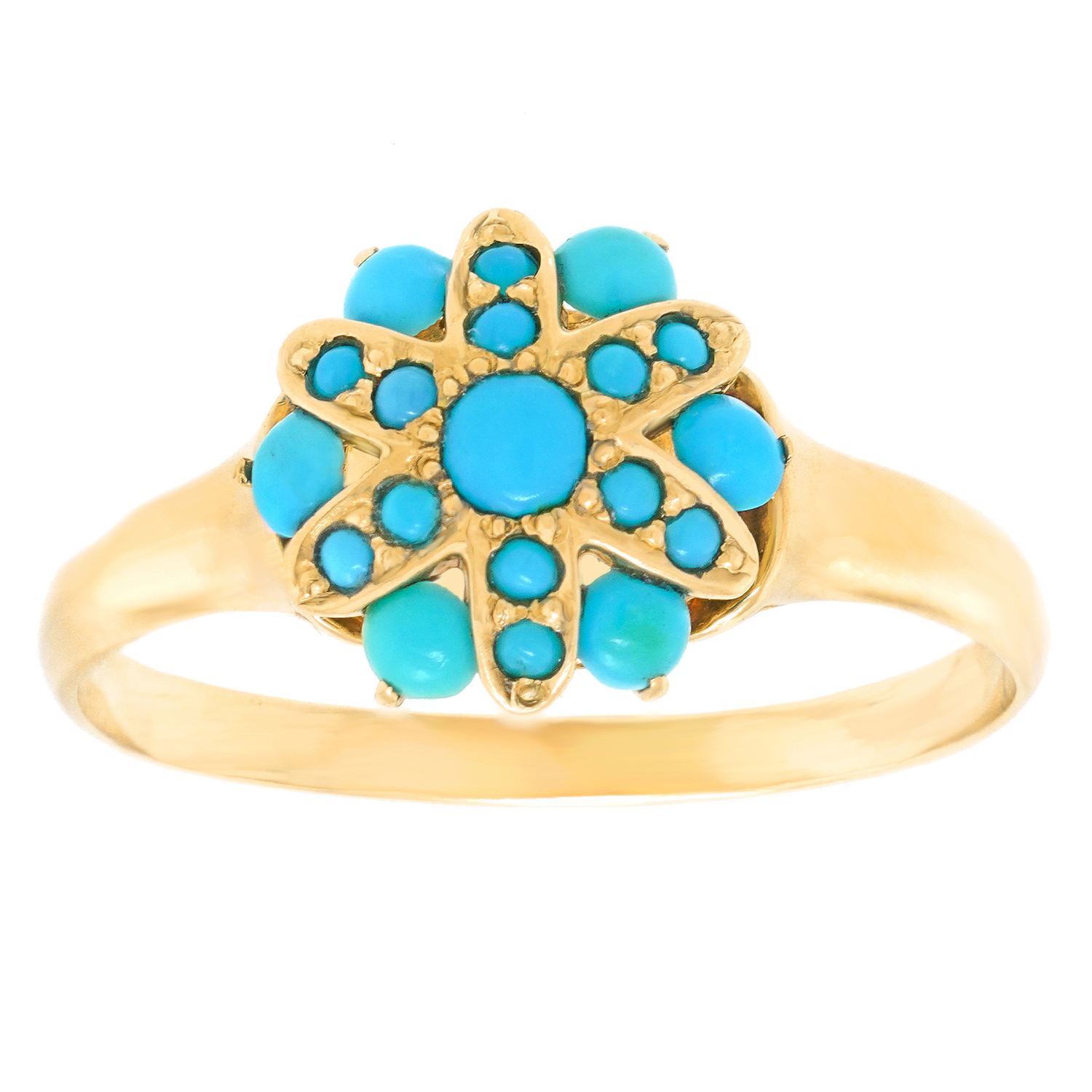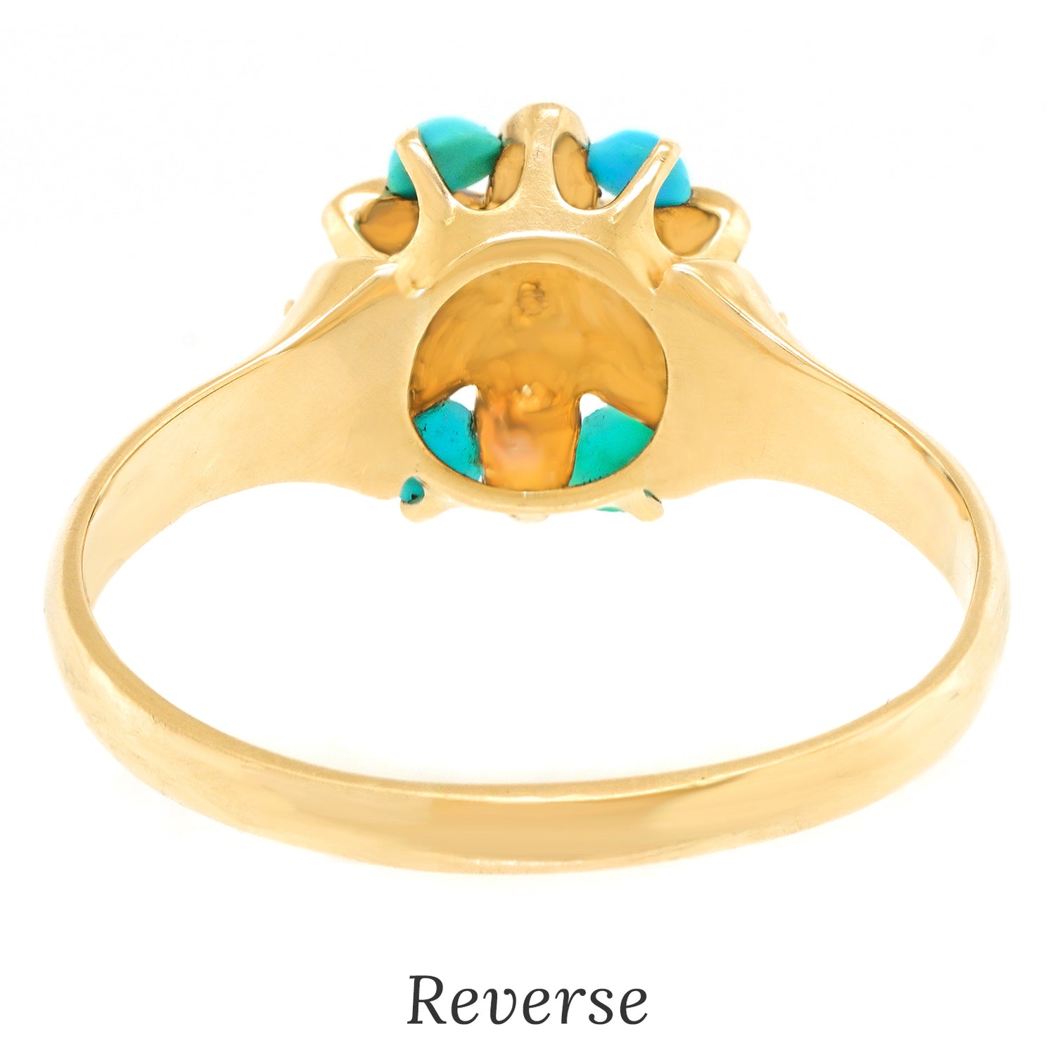 Circa 1890s, 14k. This Antique ring is a charming one-of-a-kind. The look and feel is colorful antique chic at its vintage best. Featuring Persian turquoise, it is handmade and in very good condition.