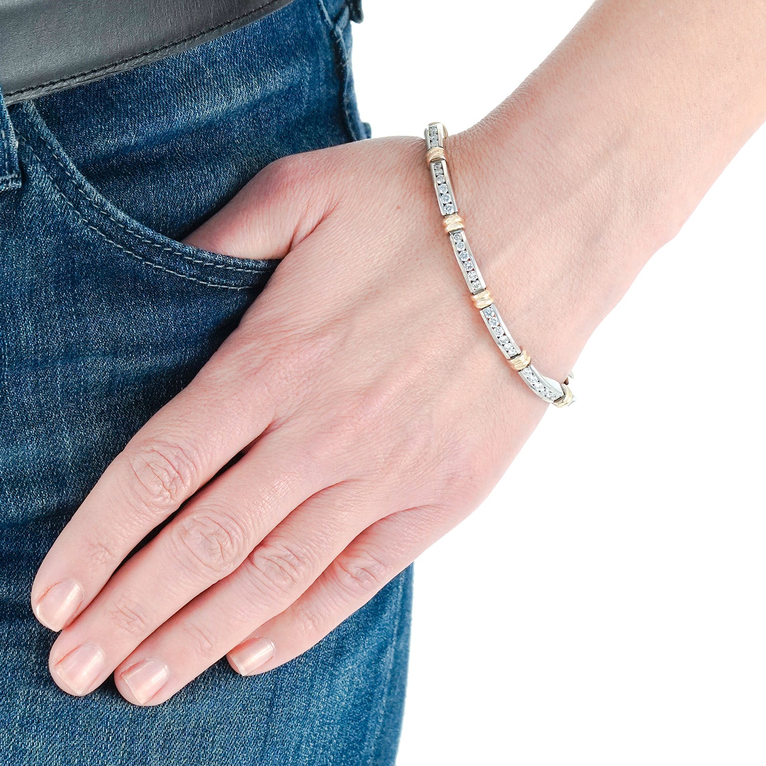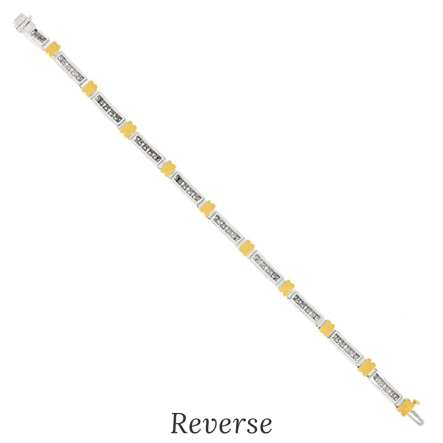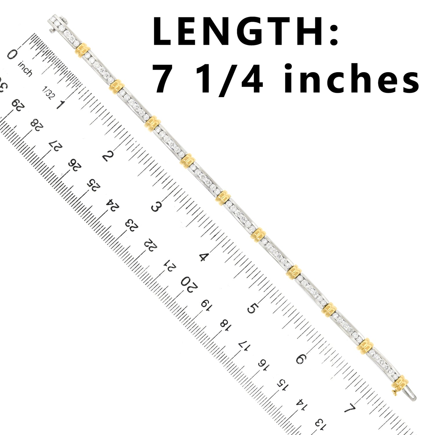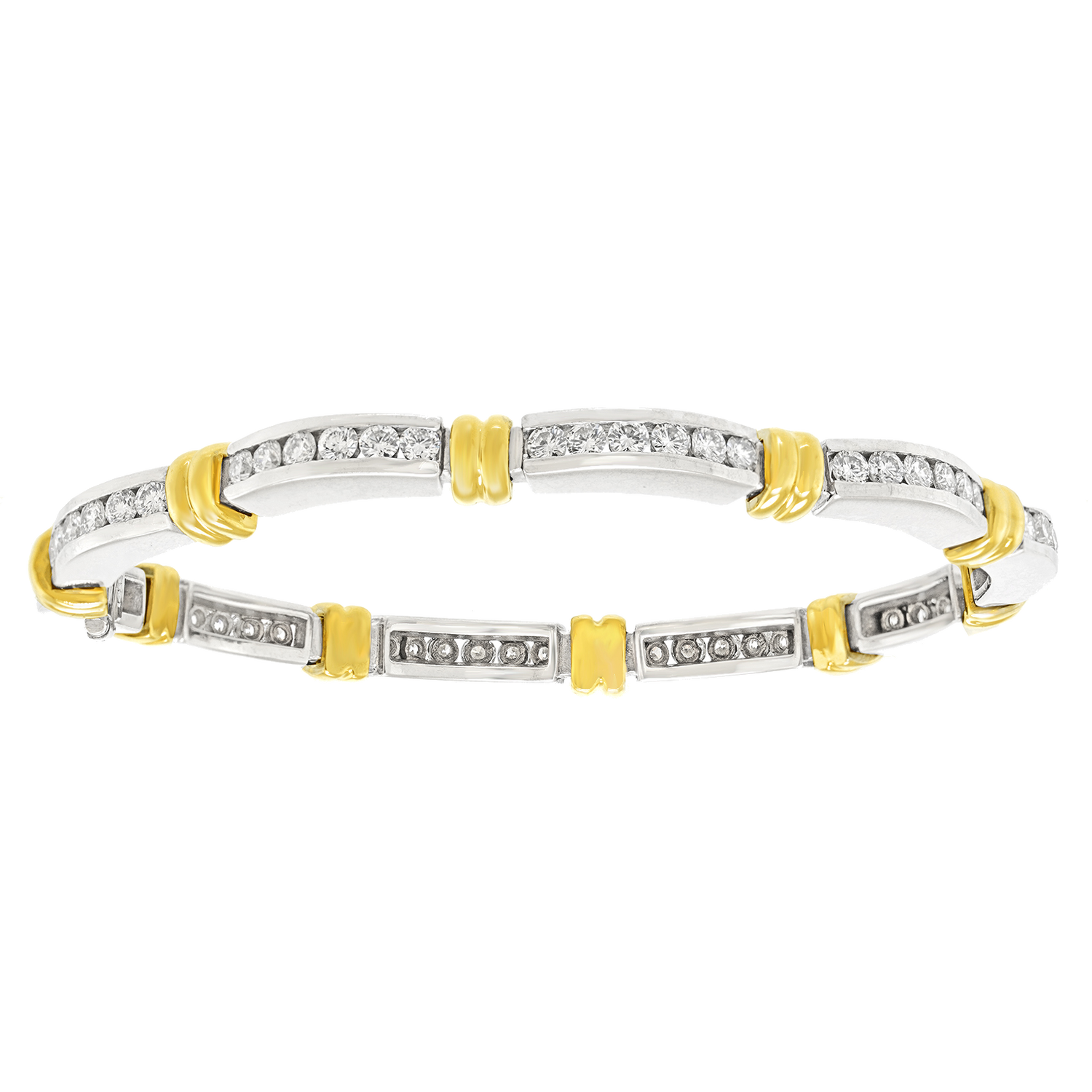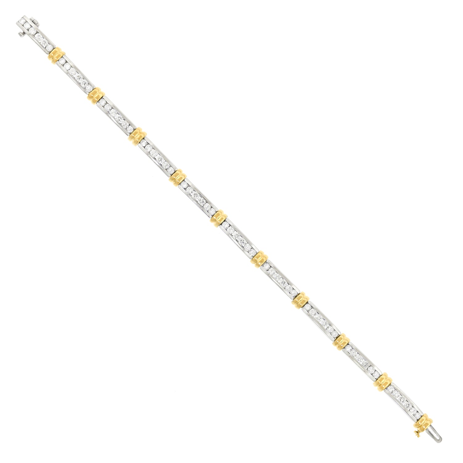 Circa 1970s, 14k, American. Perfect for every day, this bracelet features 4.0-carats of brilliant white diamonds (H-I color, SI1 clarity) set into curved white gold links connected by rich yellow gold elements for a very seventies… very au courant, look. Effortlessly paired with a watch or great on its own, it is perfect with denim or a cocktail dress or a denim cocktail dress! Well-made, it is in excellent condition.
