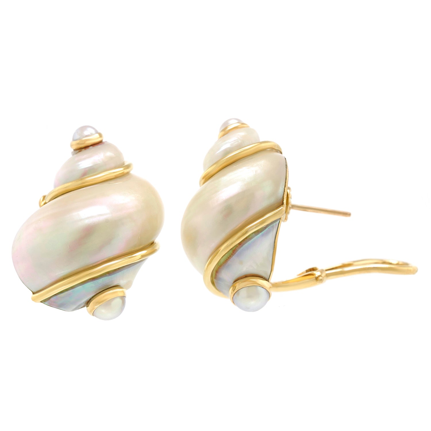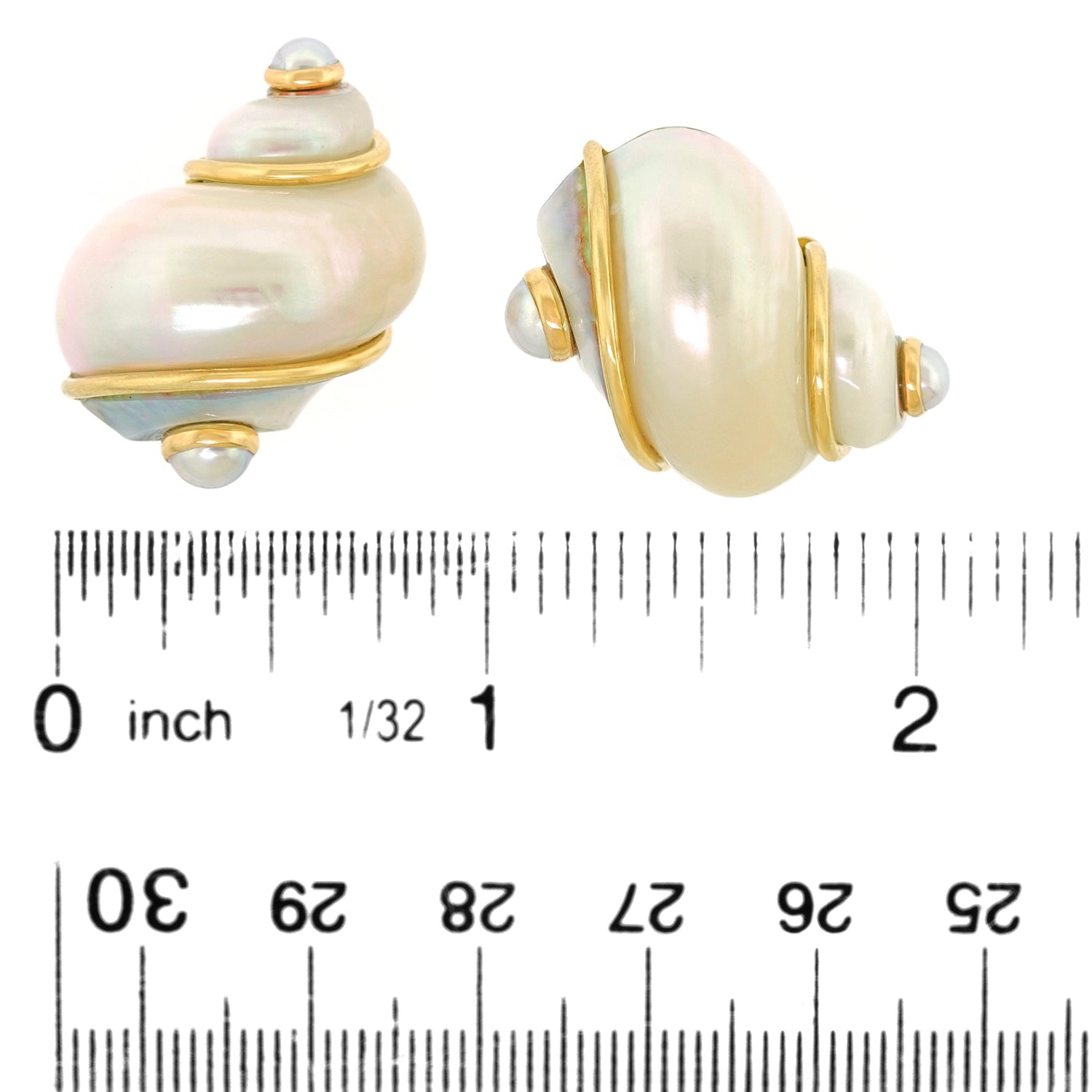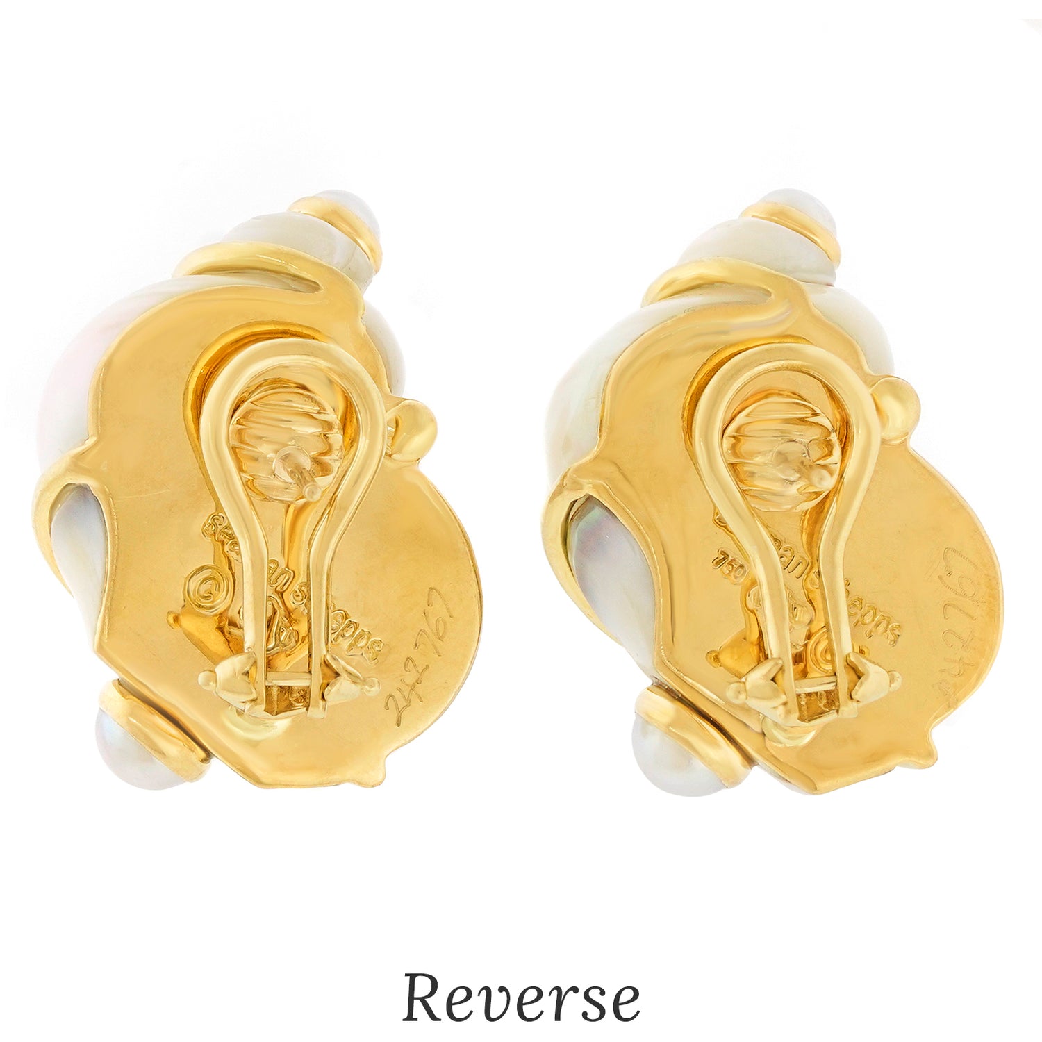 Circa 1990s, 18k, by Seaman Schepps, American.  These earrings are quite possibly the centerpiece of Seaman Schepps style, …organic, fresh, iconic (their hallmark is a turbo shell). Turbo shells set with natural cultured pearls and wrapped with yellow gold create an effortless style. The all-white palette goes with everything!  Excellent condition.