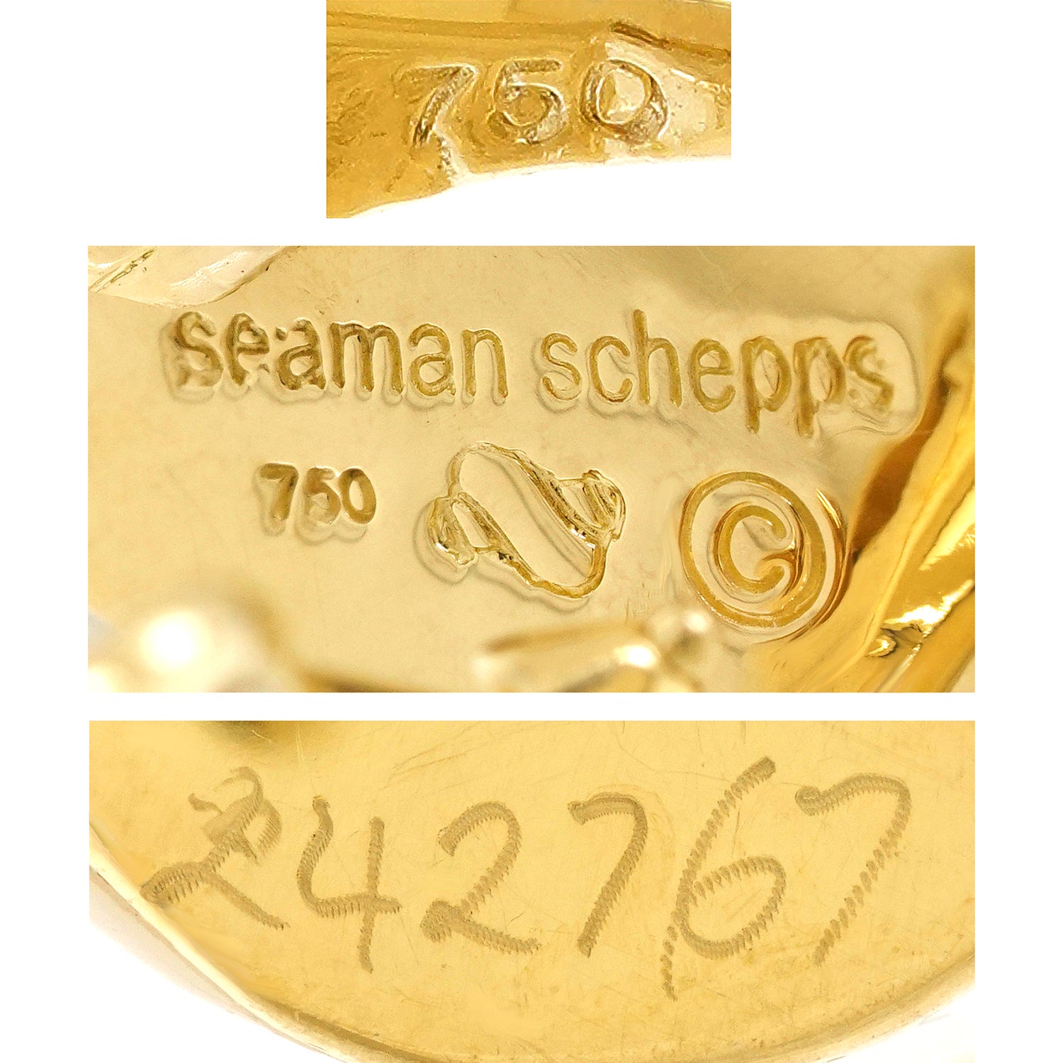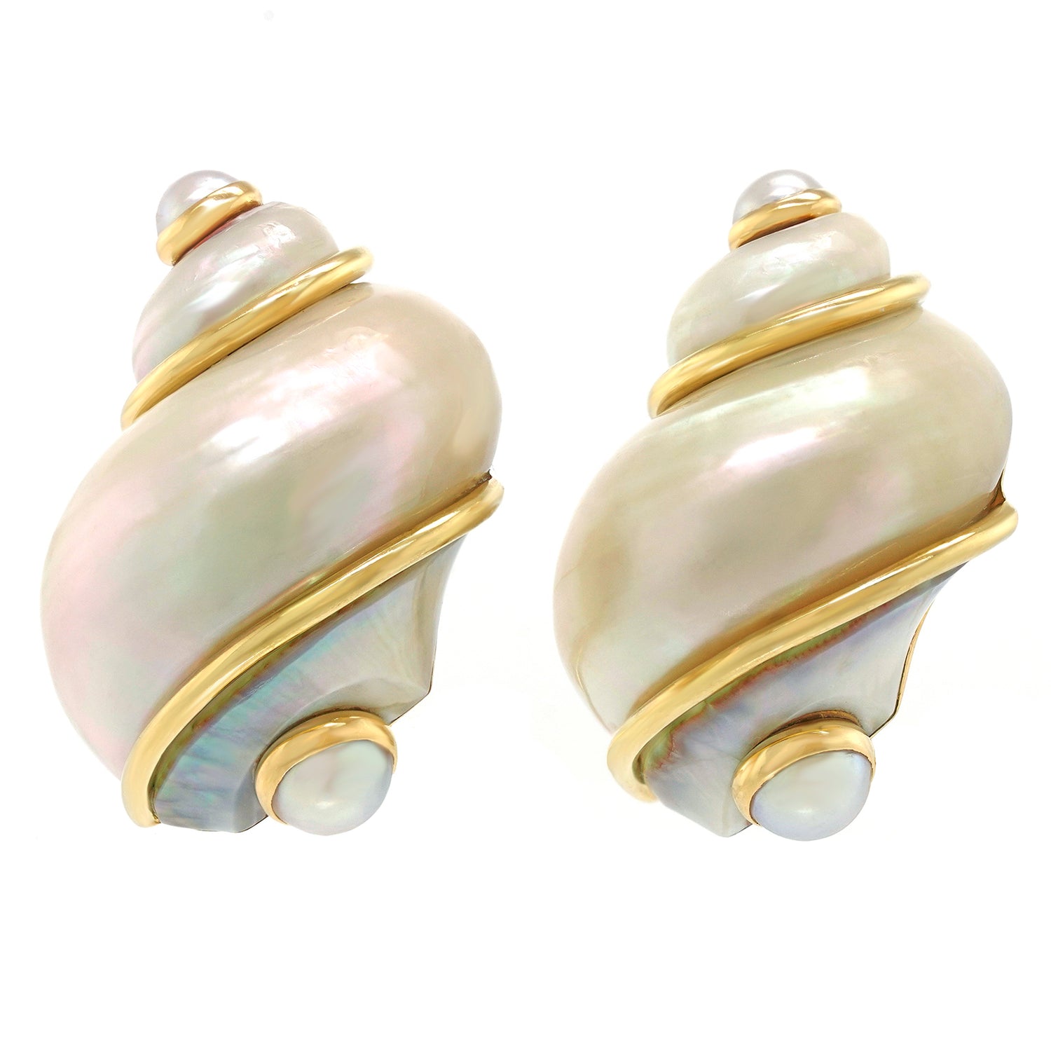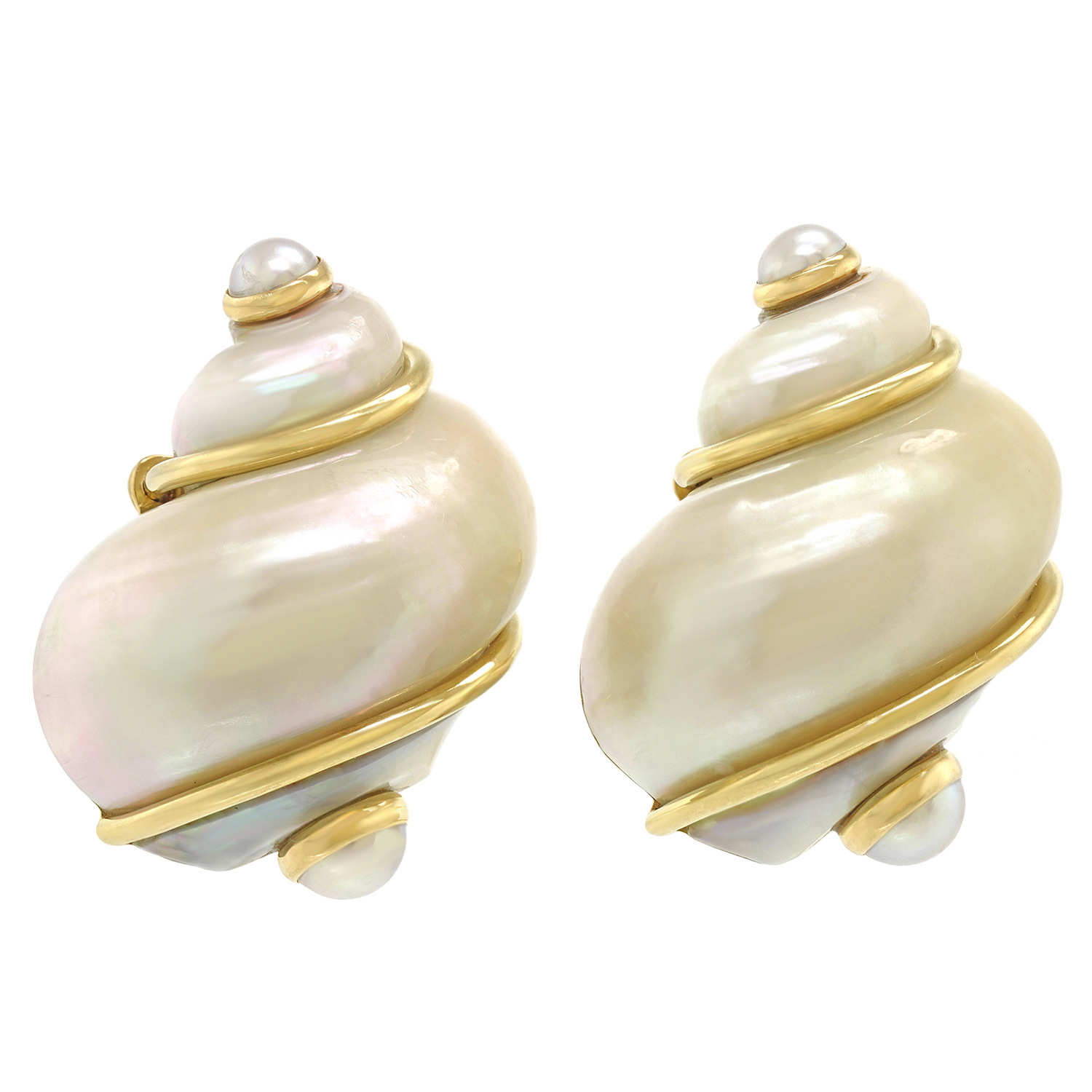 Circa 1990s, 18k, by Seaman Schepps, American.  These earrings are quite possibly the centerpiece of Seaman Schepps style, …organic, fresh, iconic (their hallmark is a turbo shell). Turbo shells set with natural cultured pearls and wrapped with yellow gold create an effortless style. The all-white palette goes with everything!  Excellent condition.