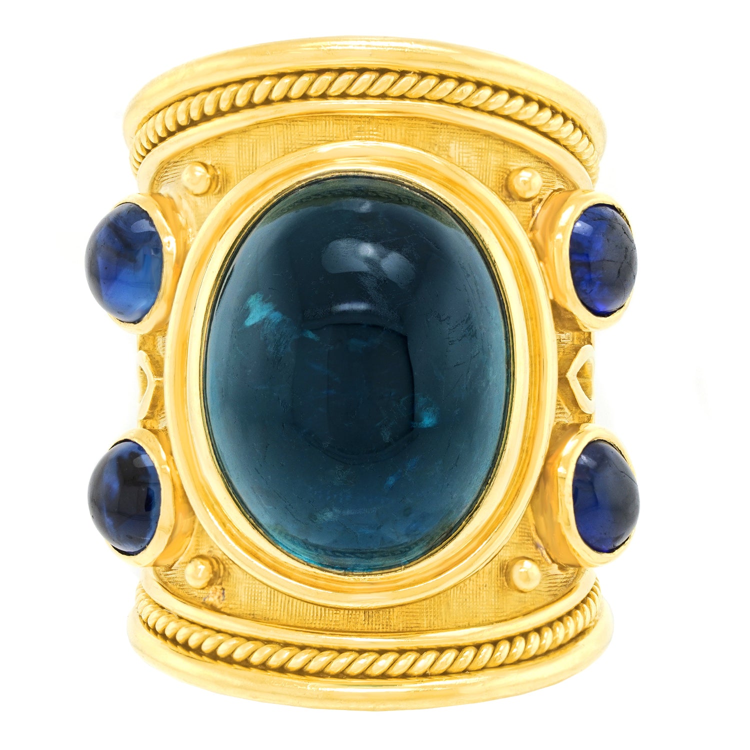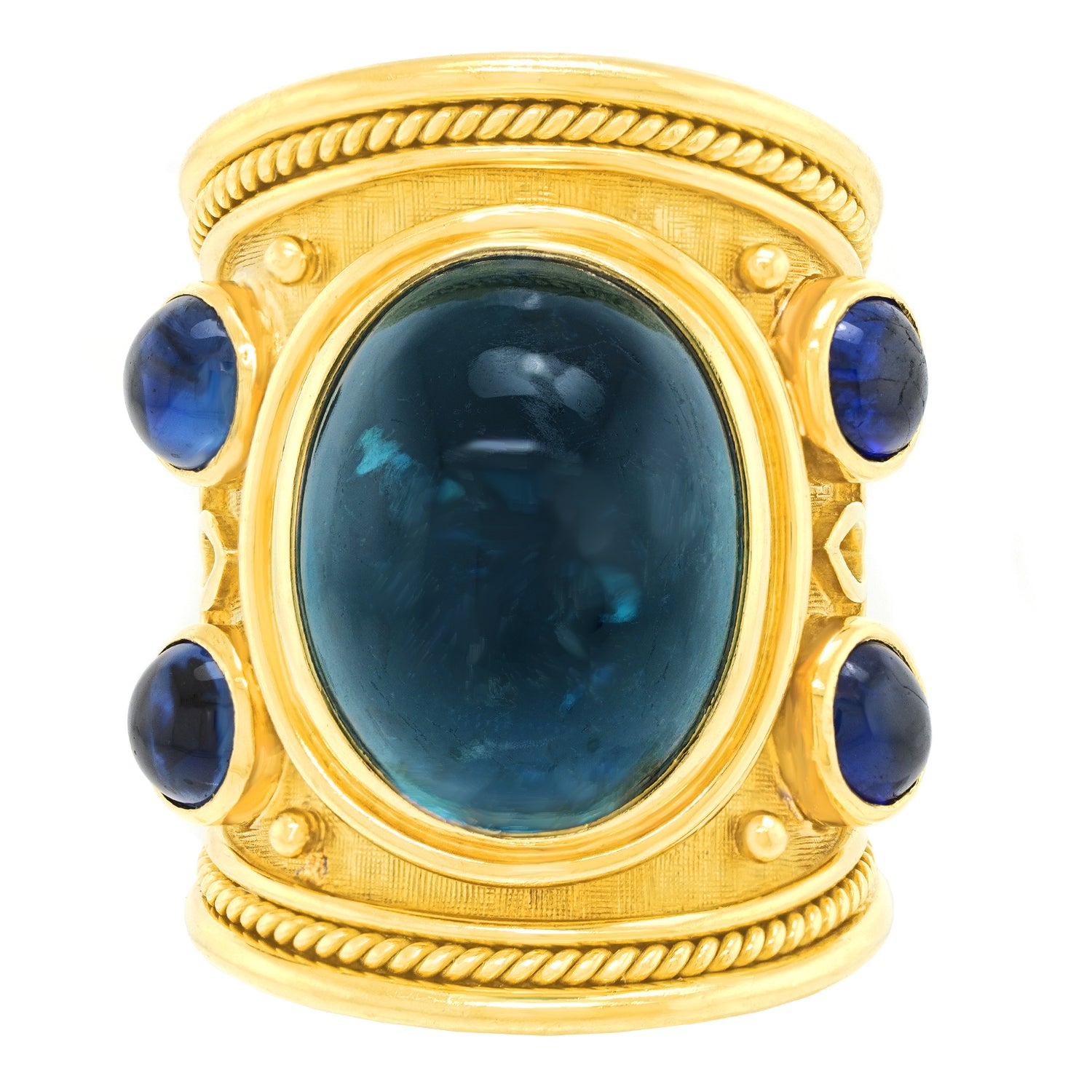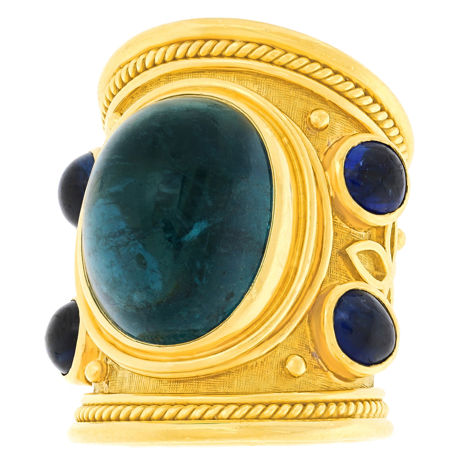 Circa 1985, 18k, by Elizabeth Gage, London, England. Iconically Elizabeth Gage, this Renaissance-Revival ring features a striking 16.0-carat blue tourmaline and 2.0 carats of rich blue sapphire. It features her "linen" textured gold and "wire twist-wire" decoration around the top and bottom of the ring. Every aspect of this jewel draws the eye! Finely made in 18k gold with the distinctive quality that Elizabeth Gage is famous for, it is in excellent condition.