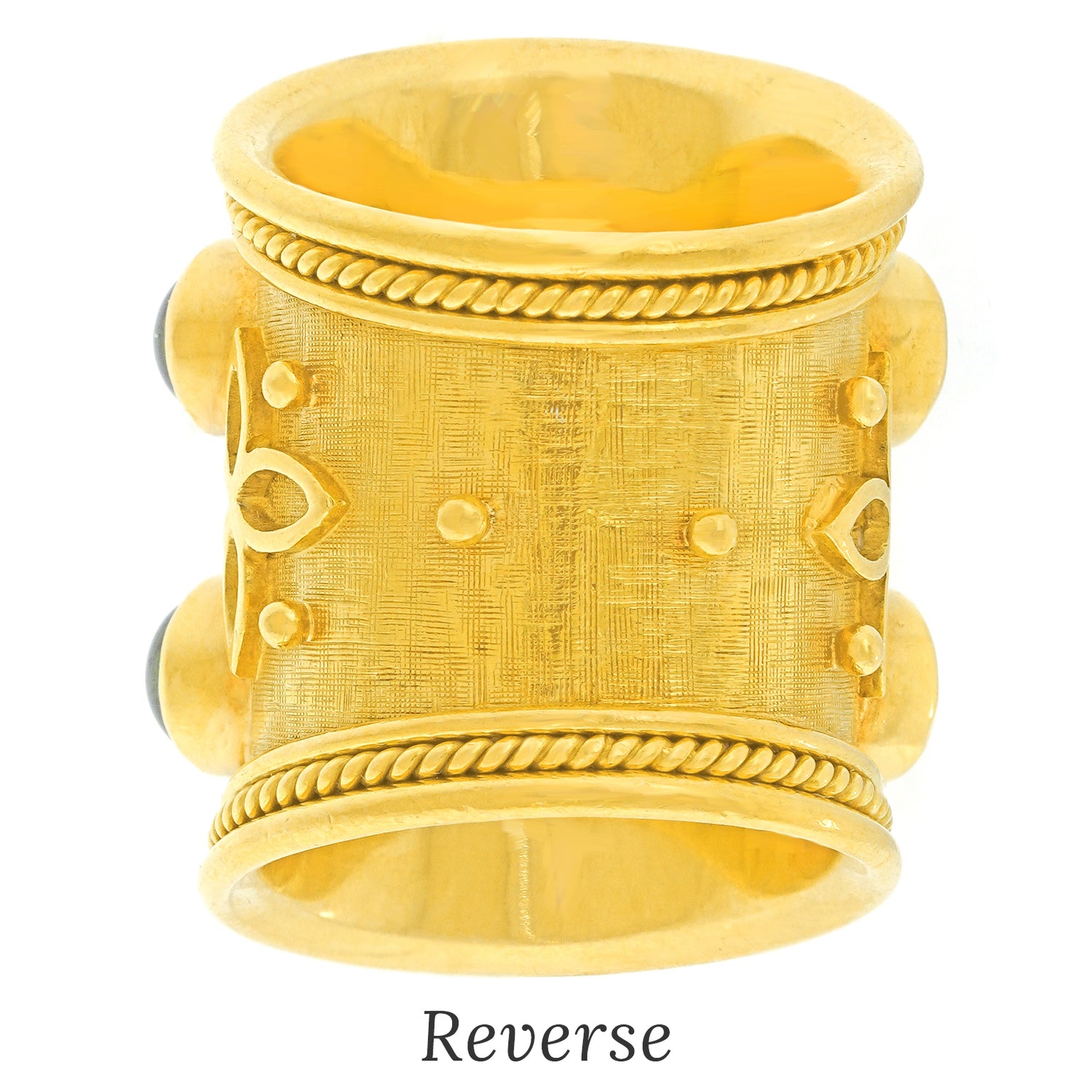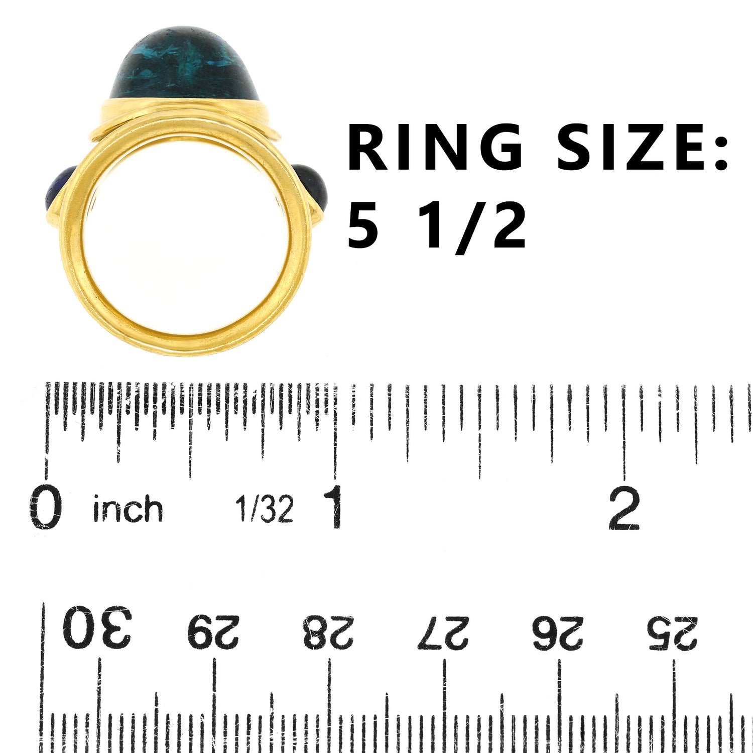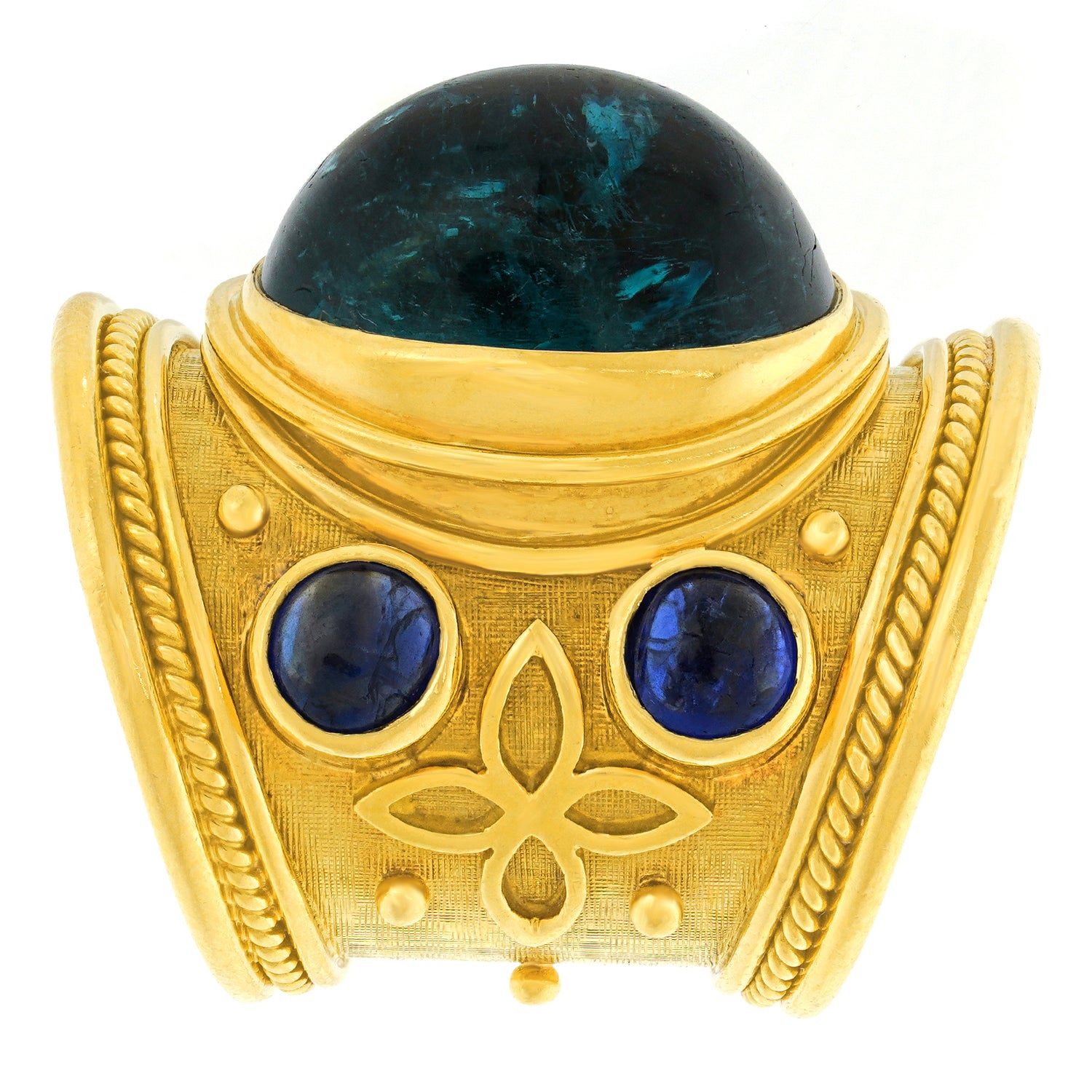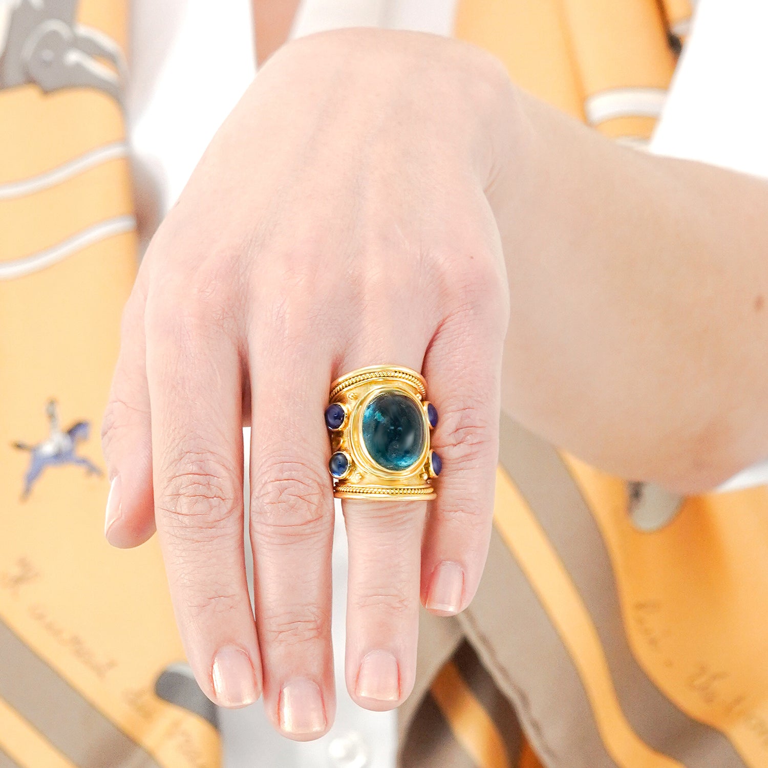 Circa 1985, 18k, by Elizabeth Gage, London, England. Iconically Elizabeth Gage, this Renaissance-Revival ring features a striking 16.0-carat blue tourmaline and 2.0 carats of rich blue sapphire. It features her "linen" textured gold and "wire twist-wire" decoration around the top and bottom of the ring. Every aspect of this jewel draws the eye! Finely made in 18k gold with the distinctive quality that Elizabeth Gage is famous for, it is in excellent condition.